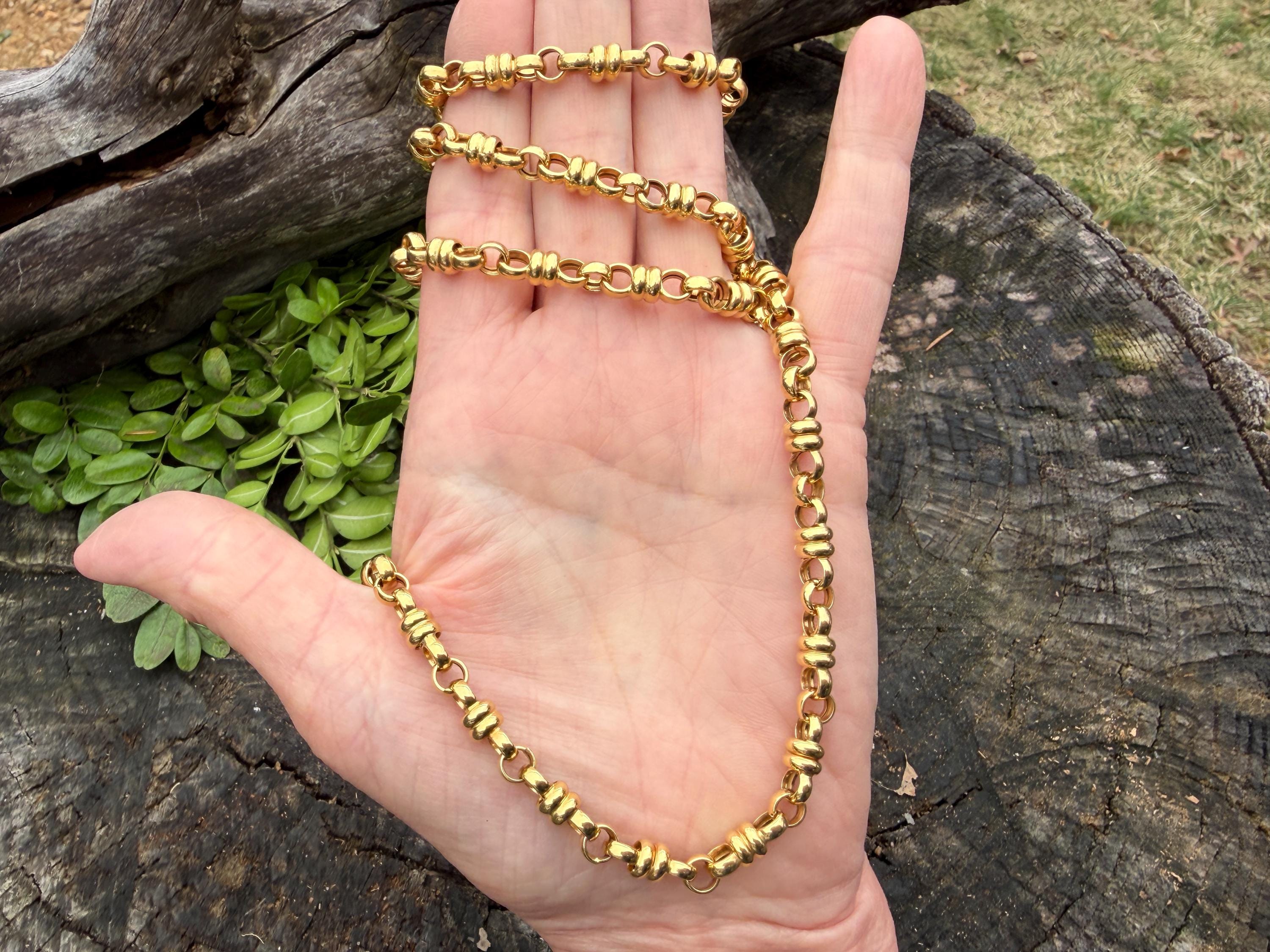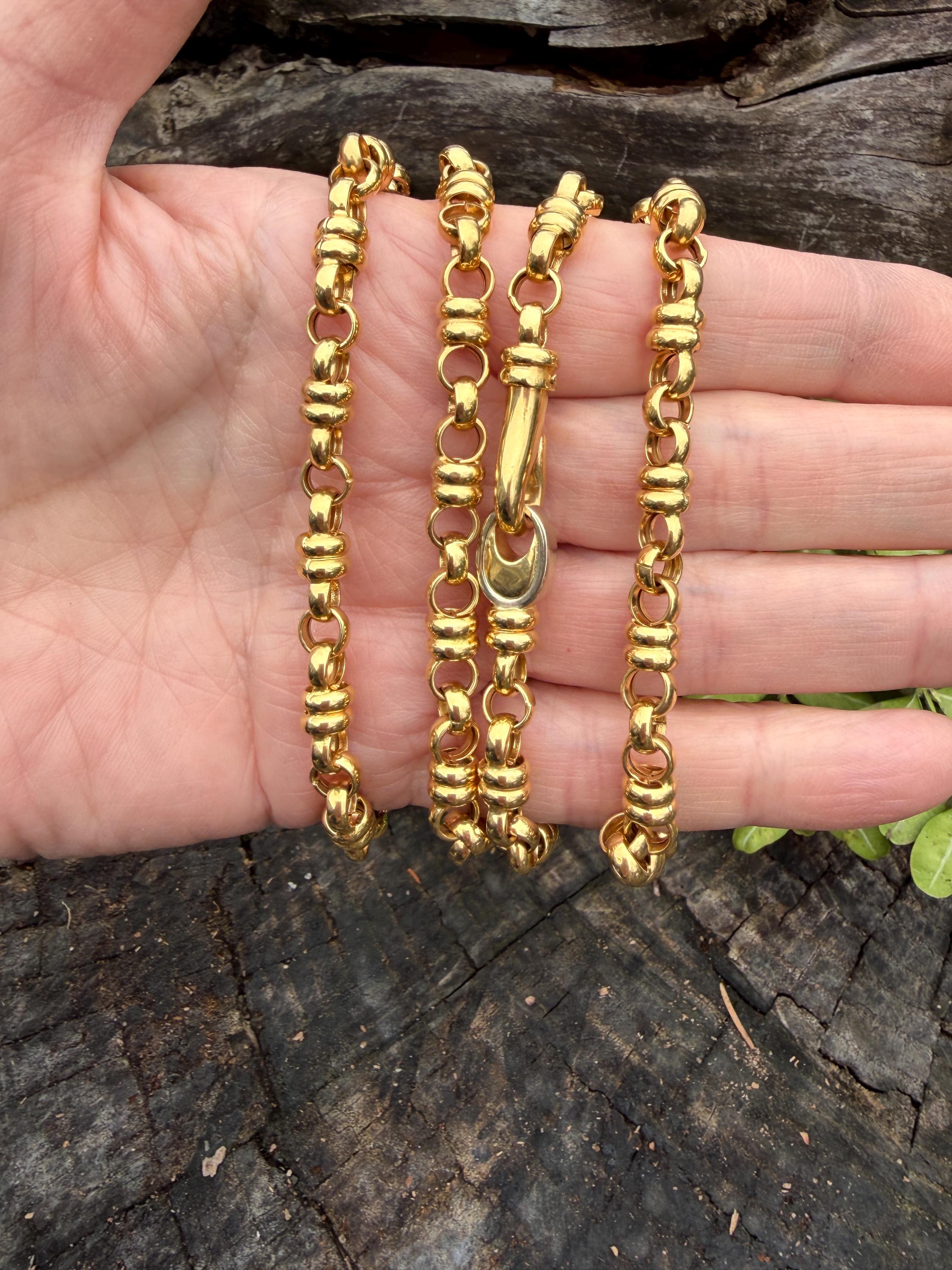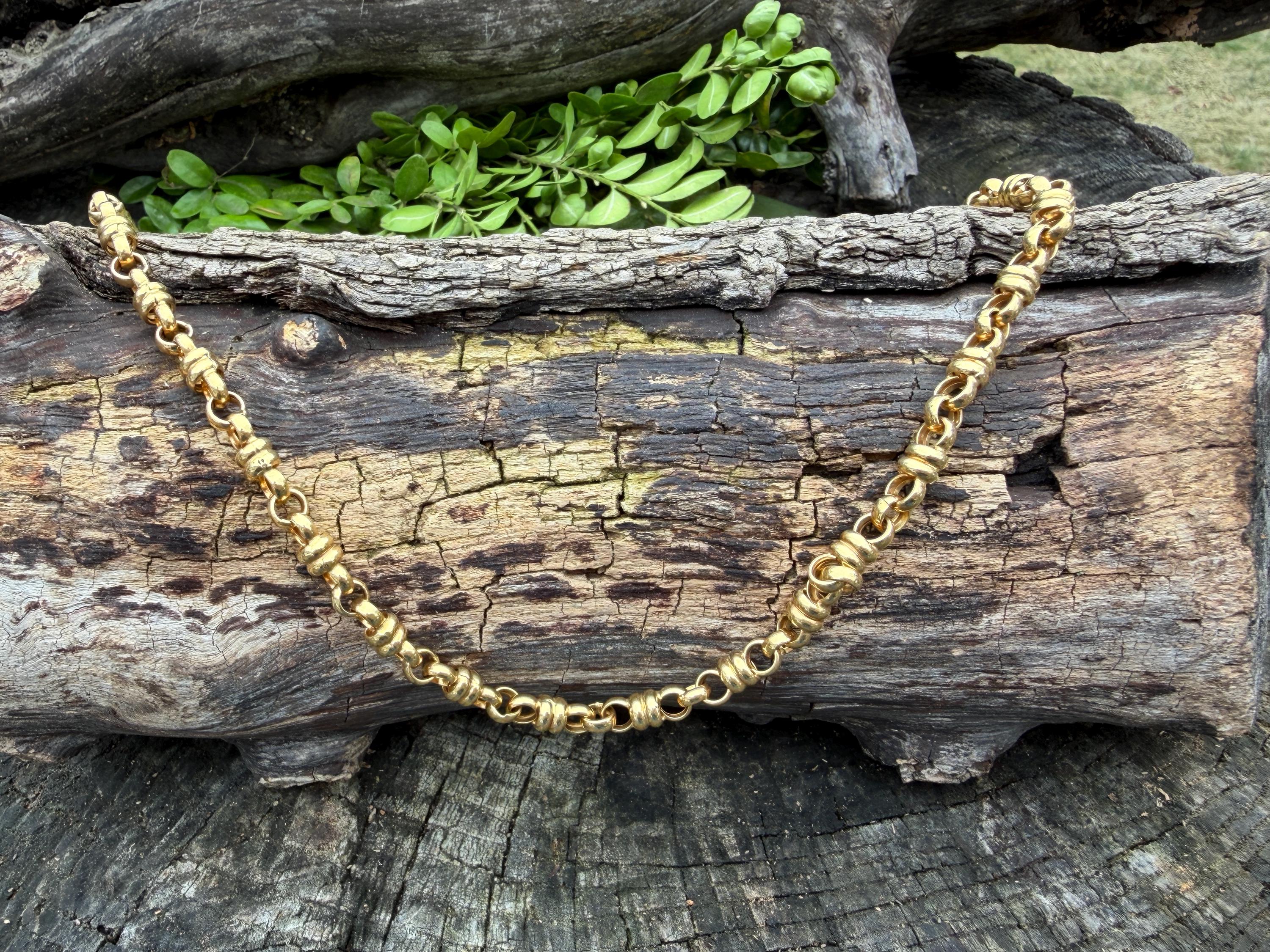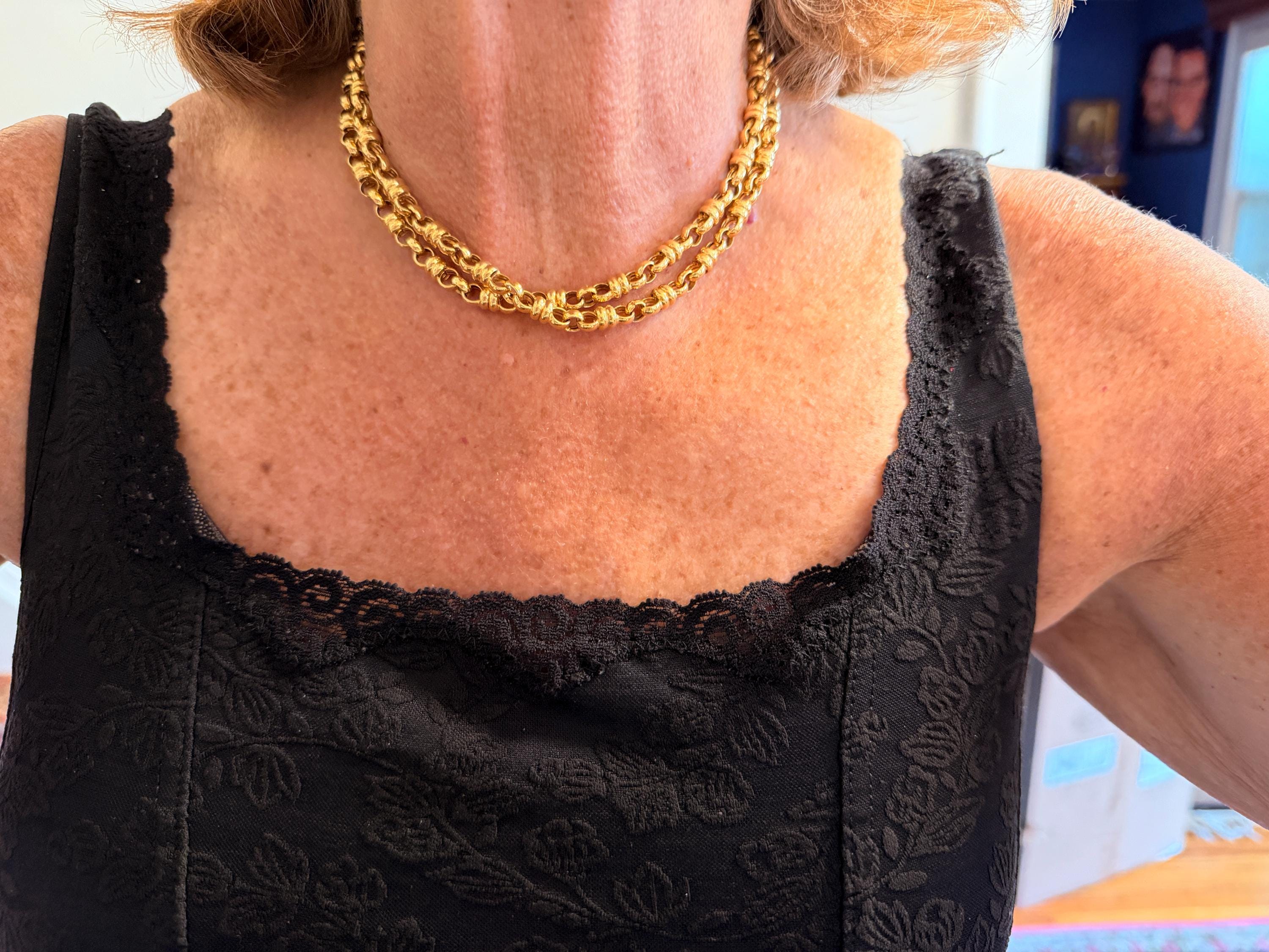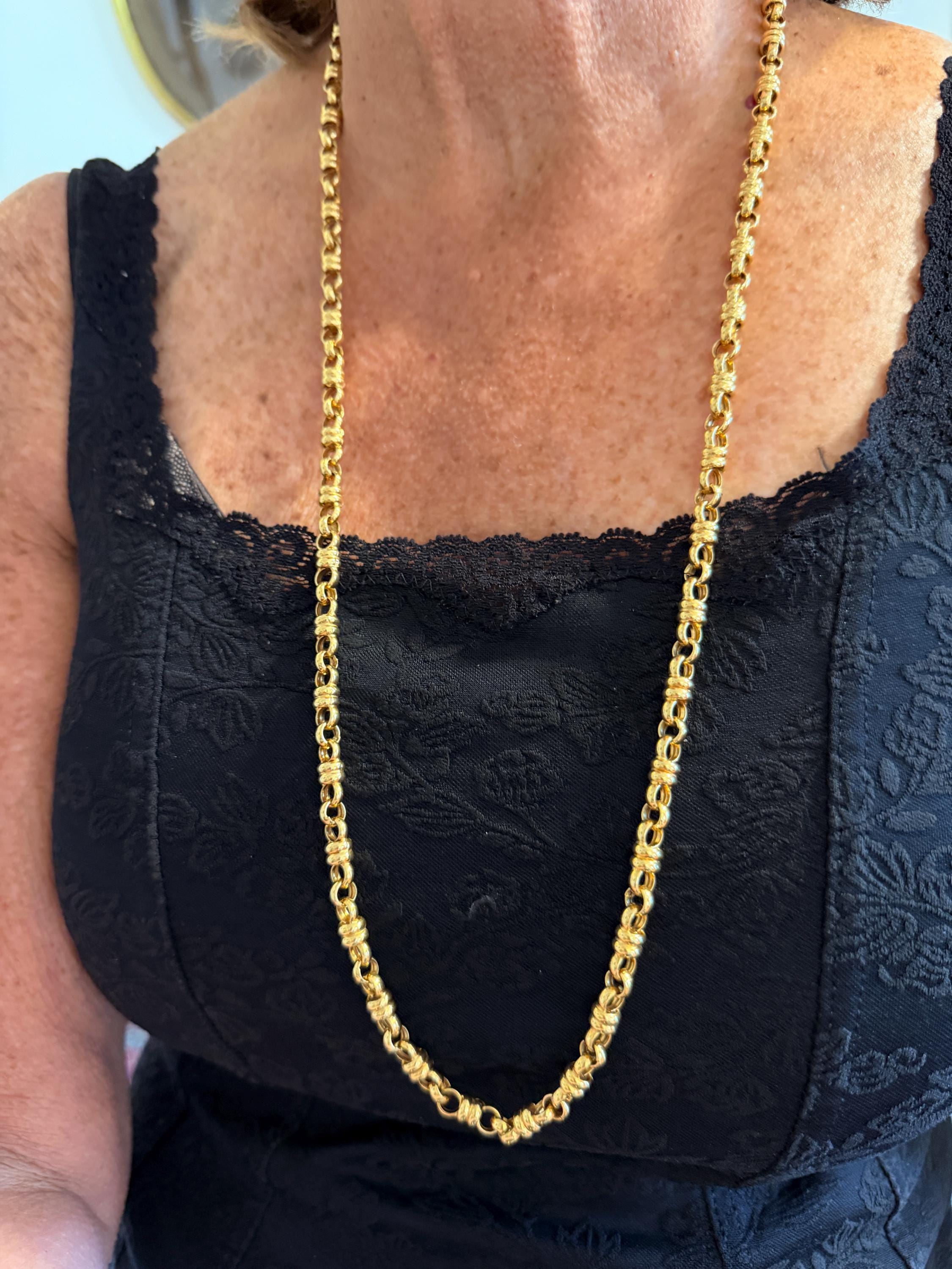 Set in 18k yellow gold this vintage lavishly striking necklace dates from the 1980's. It is an intricately bold chain woven with double circle links in luxurious gold all the way around. In between the links are a series of polished gold single circles going in the opposite direction attaching the links that add loads of character. It weighs 39.06 grams. It measures 32" and 1/4" wide. It is marked 750 (18k).