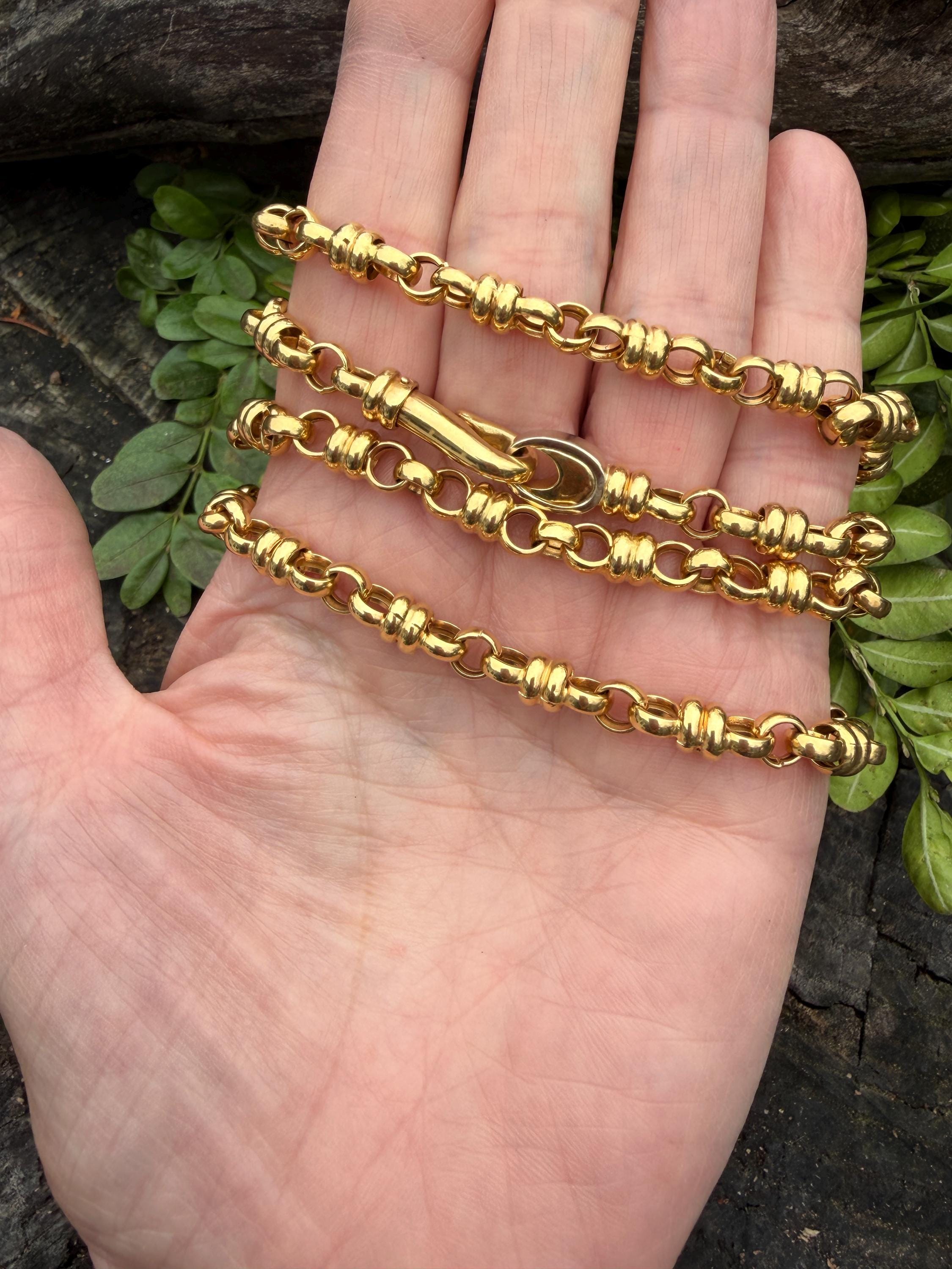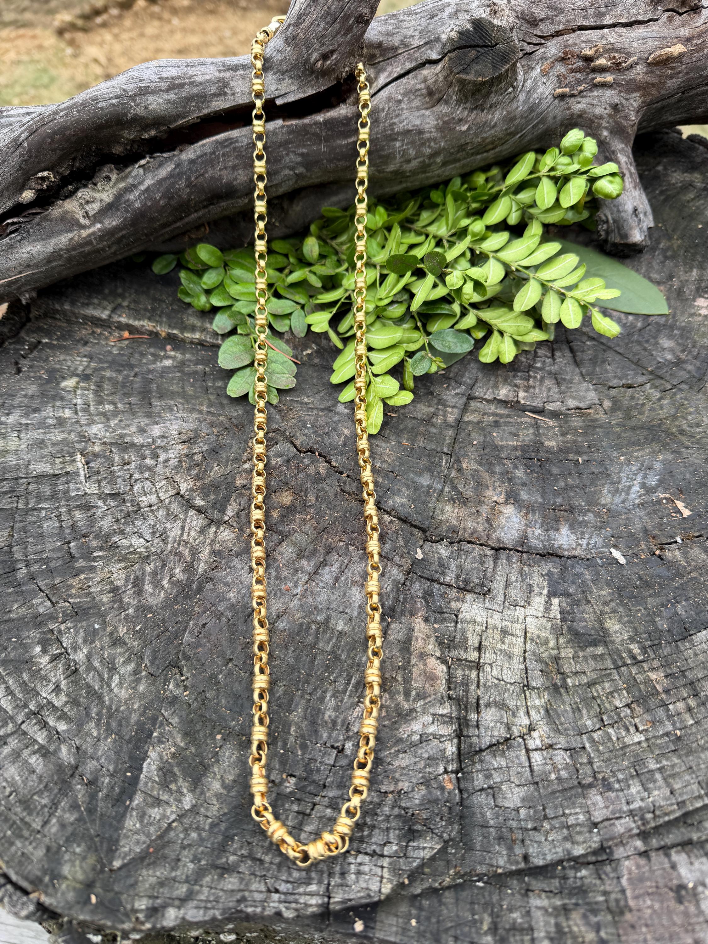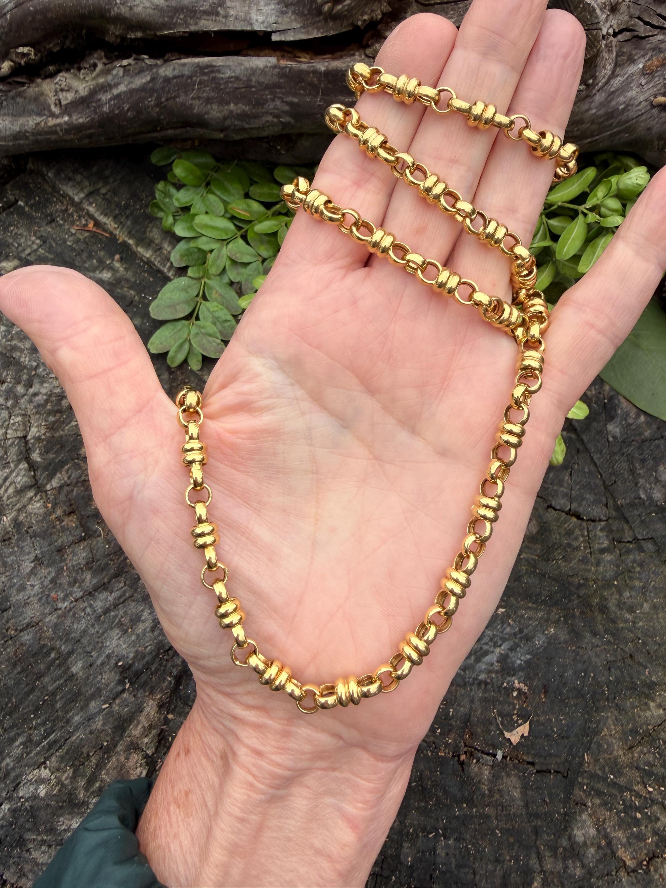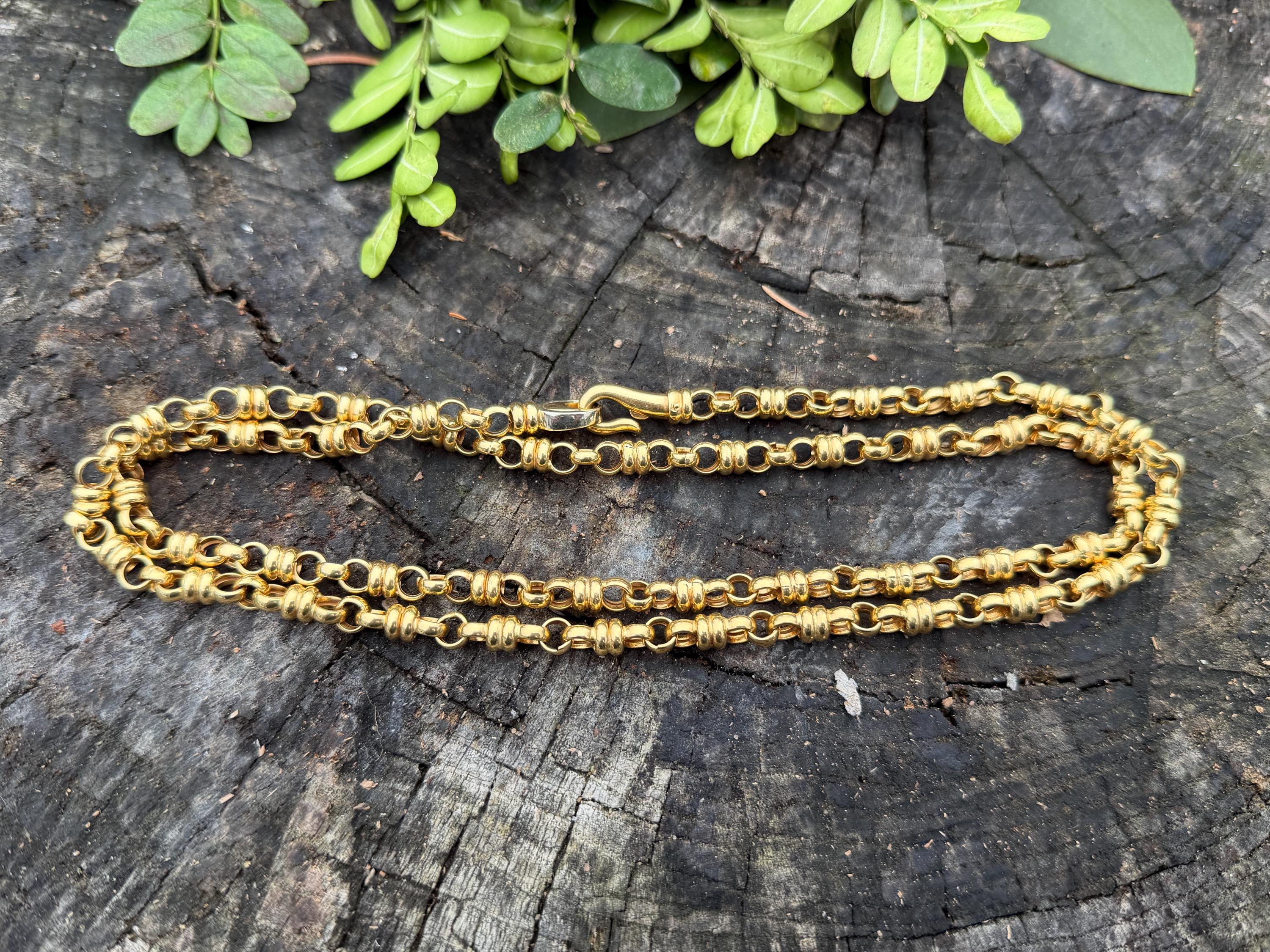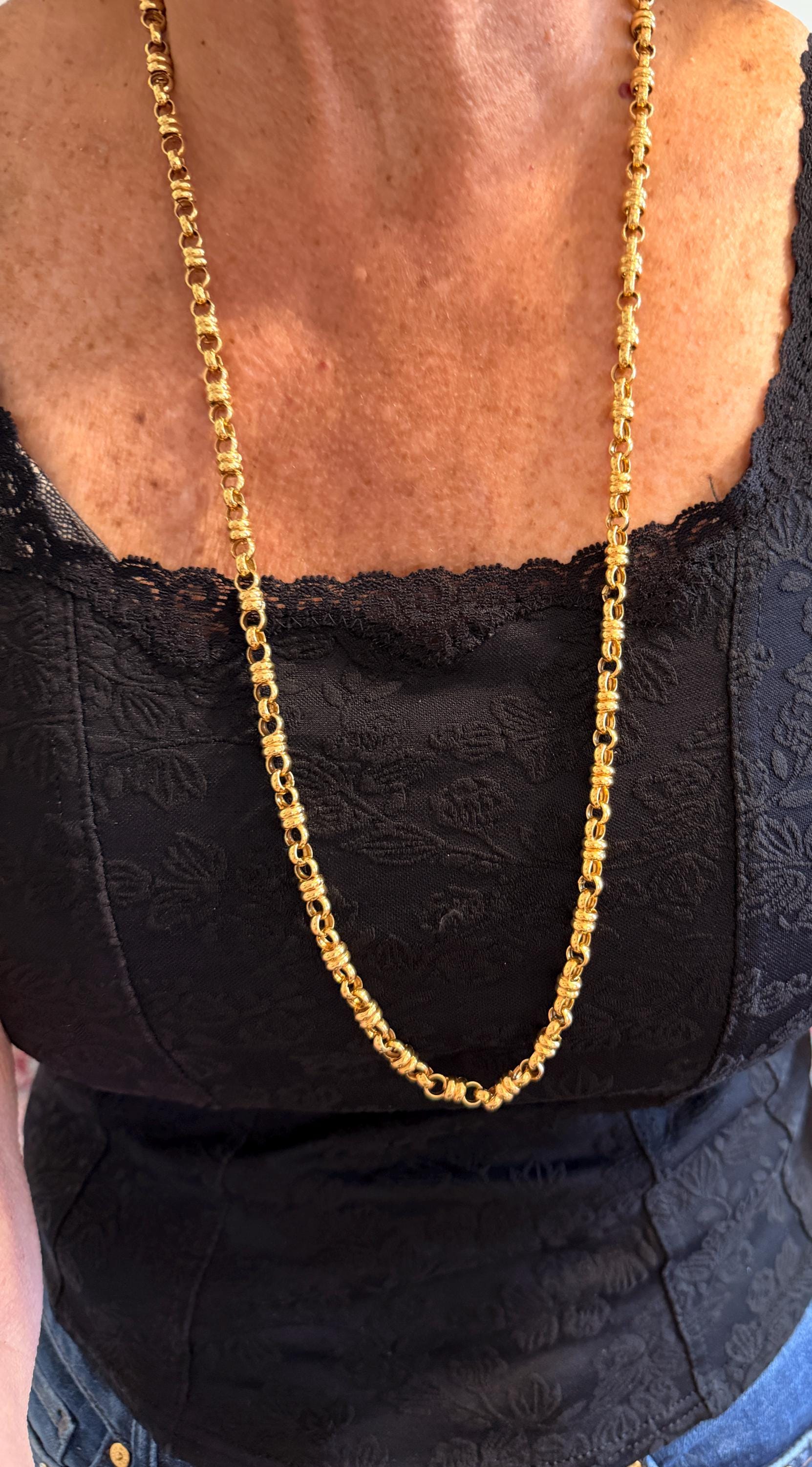 Set in 18k yellow gold this vintage lavishly striking necklace dates from the 1980's. It is an intricately bold chain woven with double circle links in luxurious gold all the way around. In between the links are a series of polished gold single circles going in the opposite direction attaching the links that add loads of character. It weighs 39.06 grams. It measures 32" and 1/4" wide. It is marked 750 (18k).