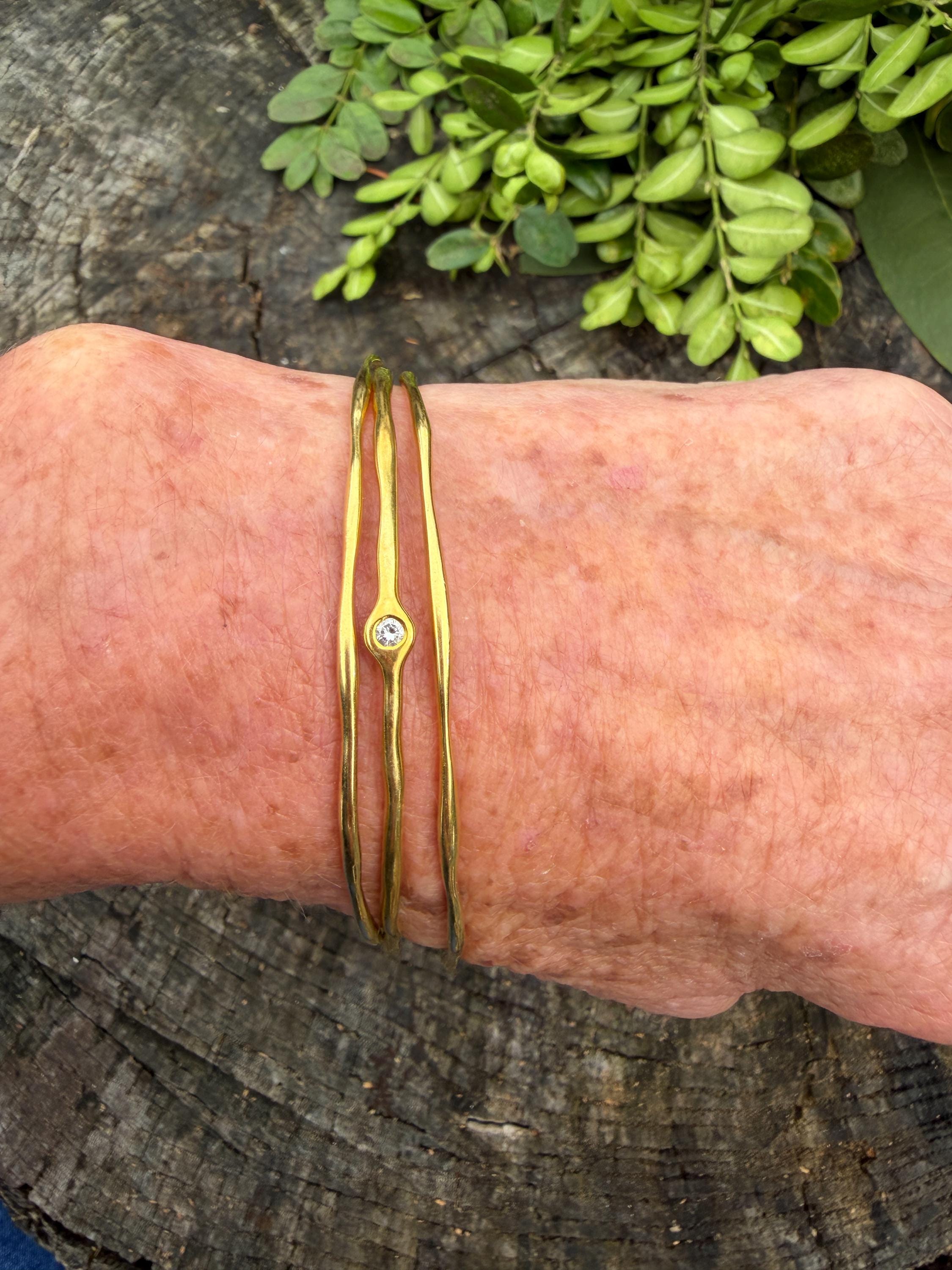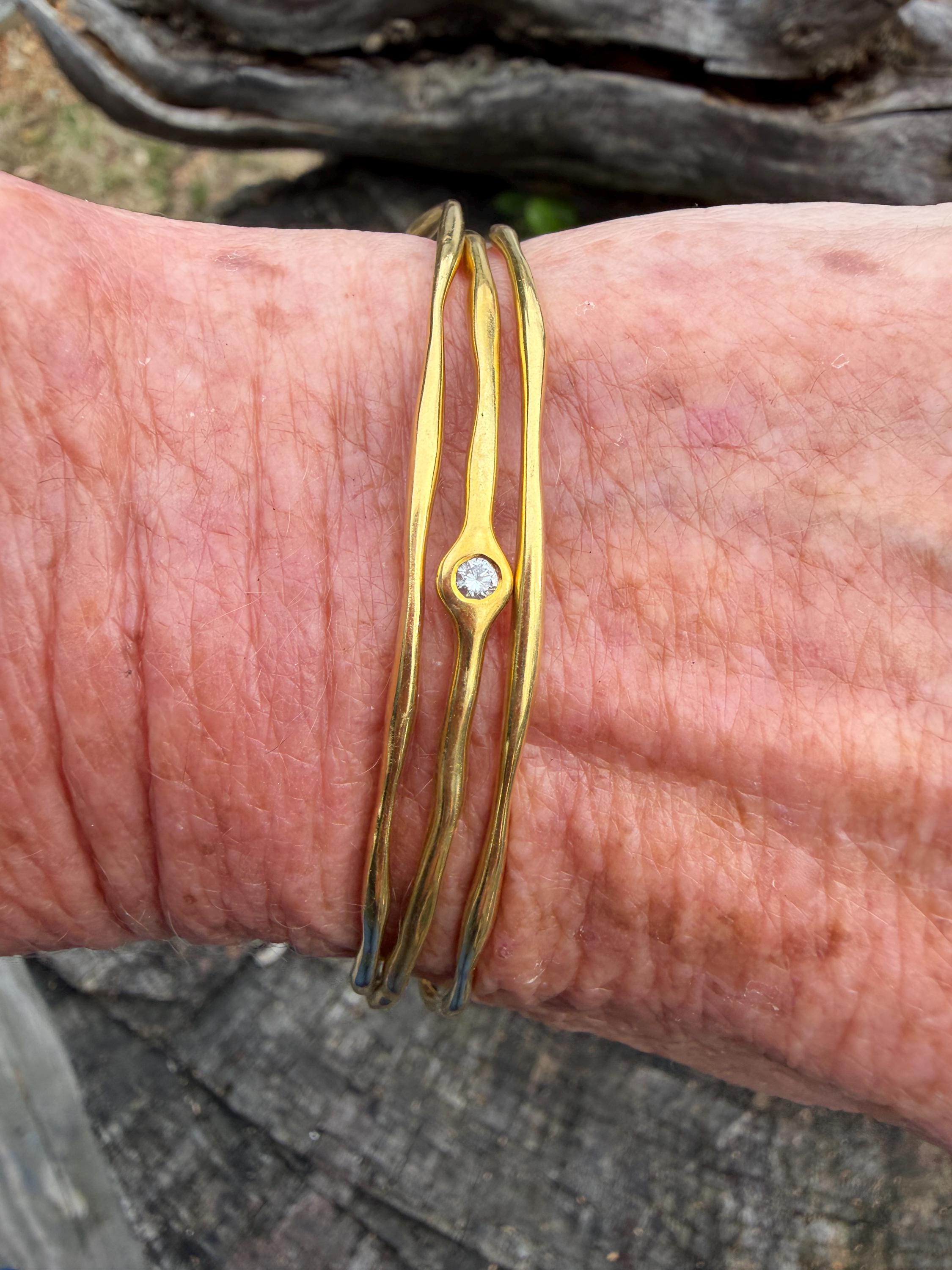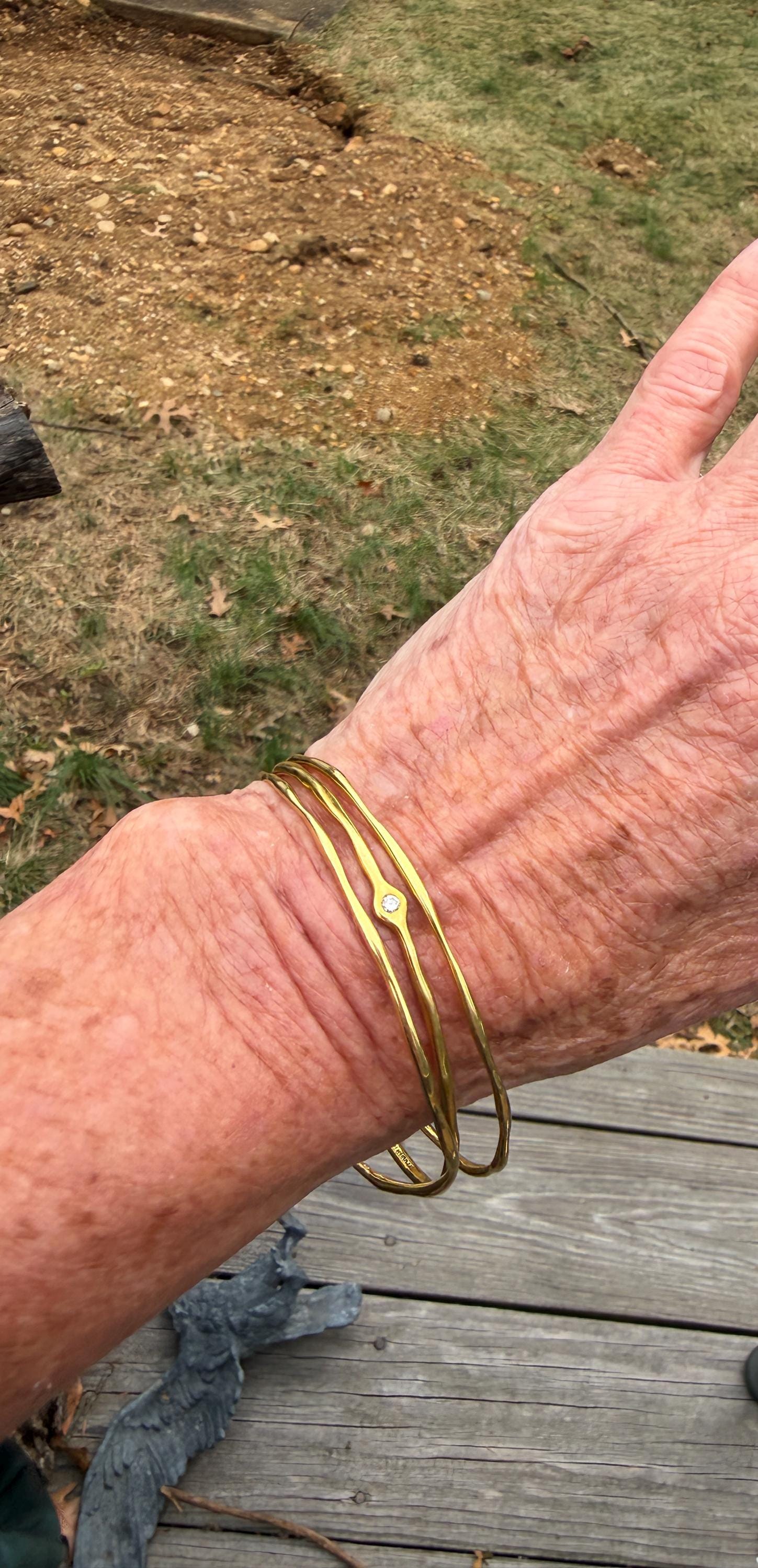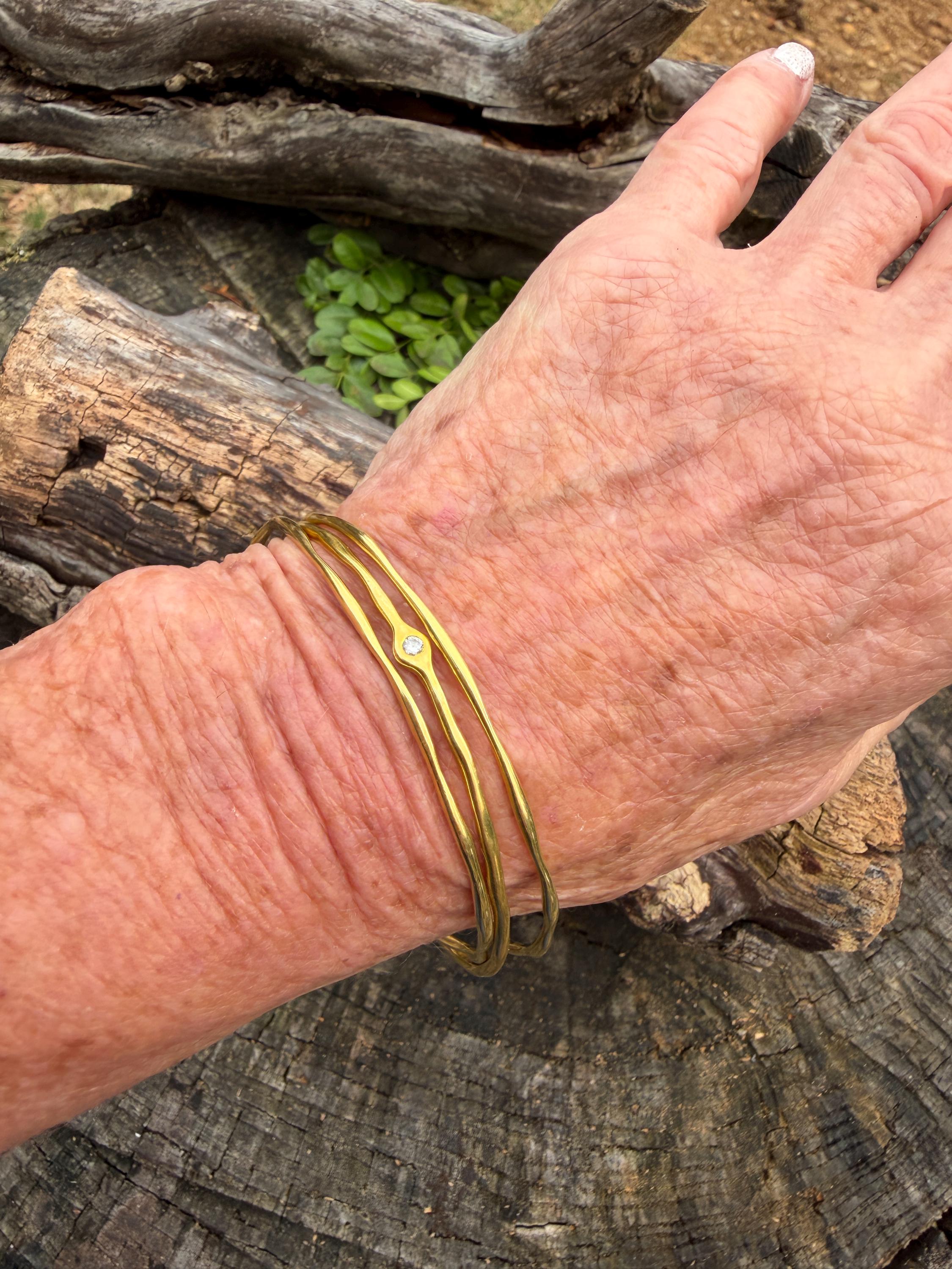This chic triple set of bangles are set in 18k yellow gold. Three polished gold bangles, uniquely shaped, and one with a diamond in the center, create a look intriguing elegance. They are slip on style and would look great together or separately. The diamond has an approx. weight of .20 ct. It is F in color and VS1 in clarity. The bangle’s inside circumference is 7”. The inside diameter is 2 5/8". They will fit a medium size wrist. They weigh 25.12 grams together. Each bangle is 1/16" wide. They are made by designer Ippolita.