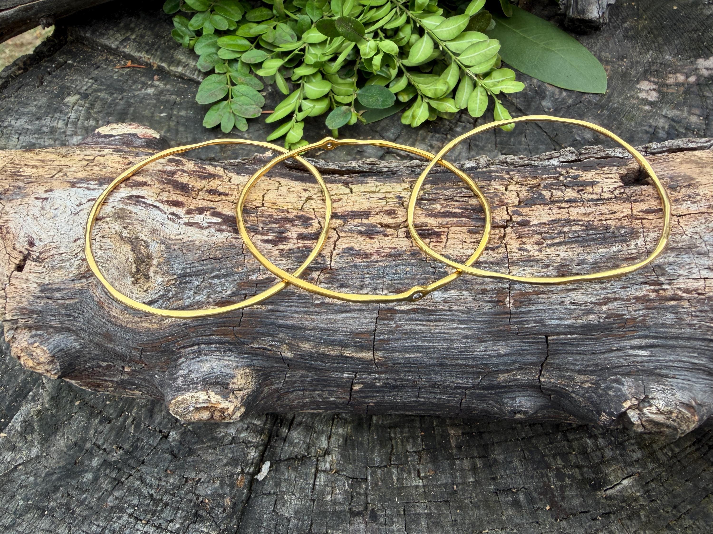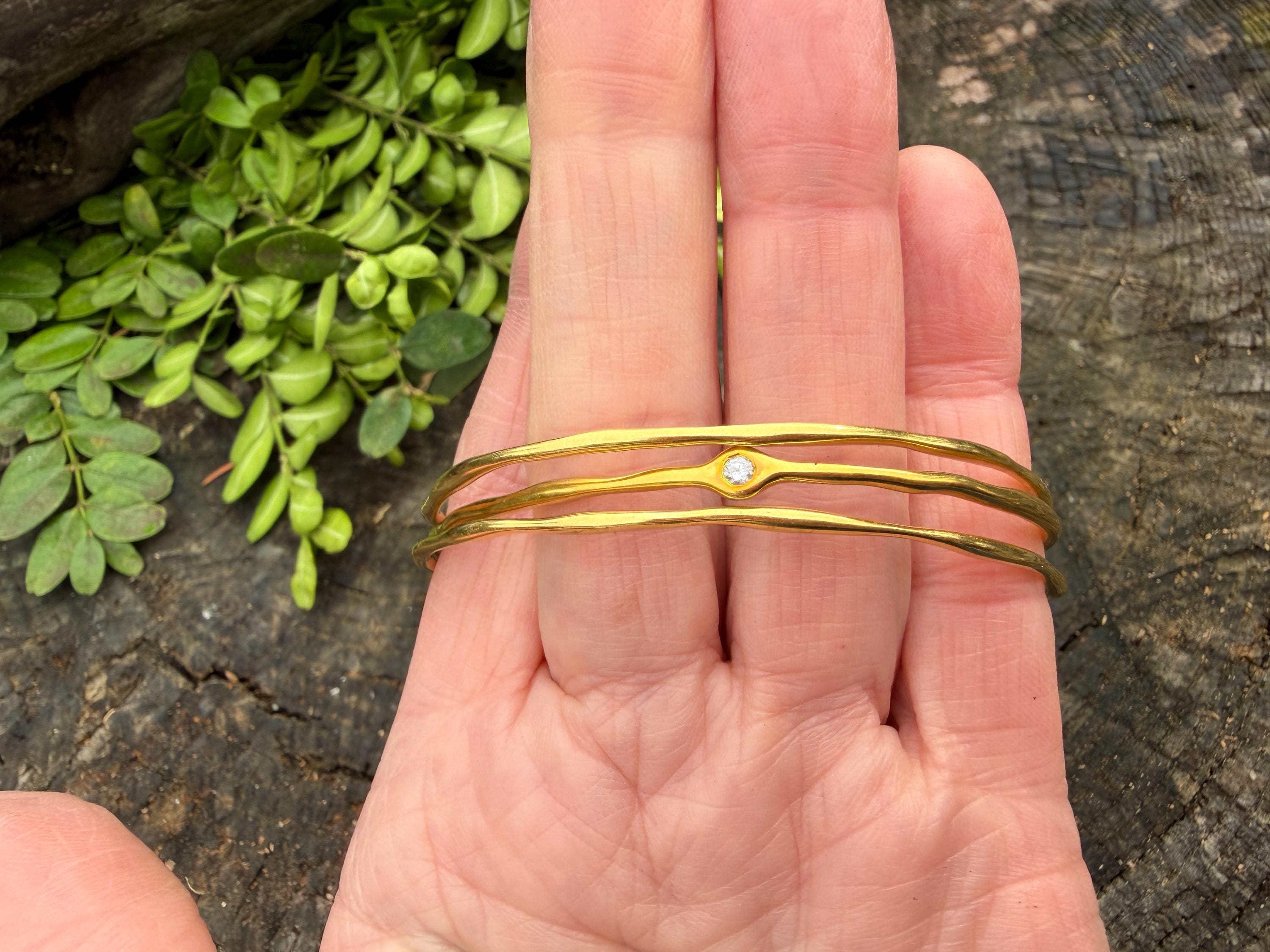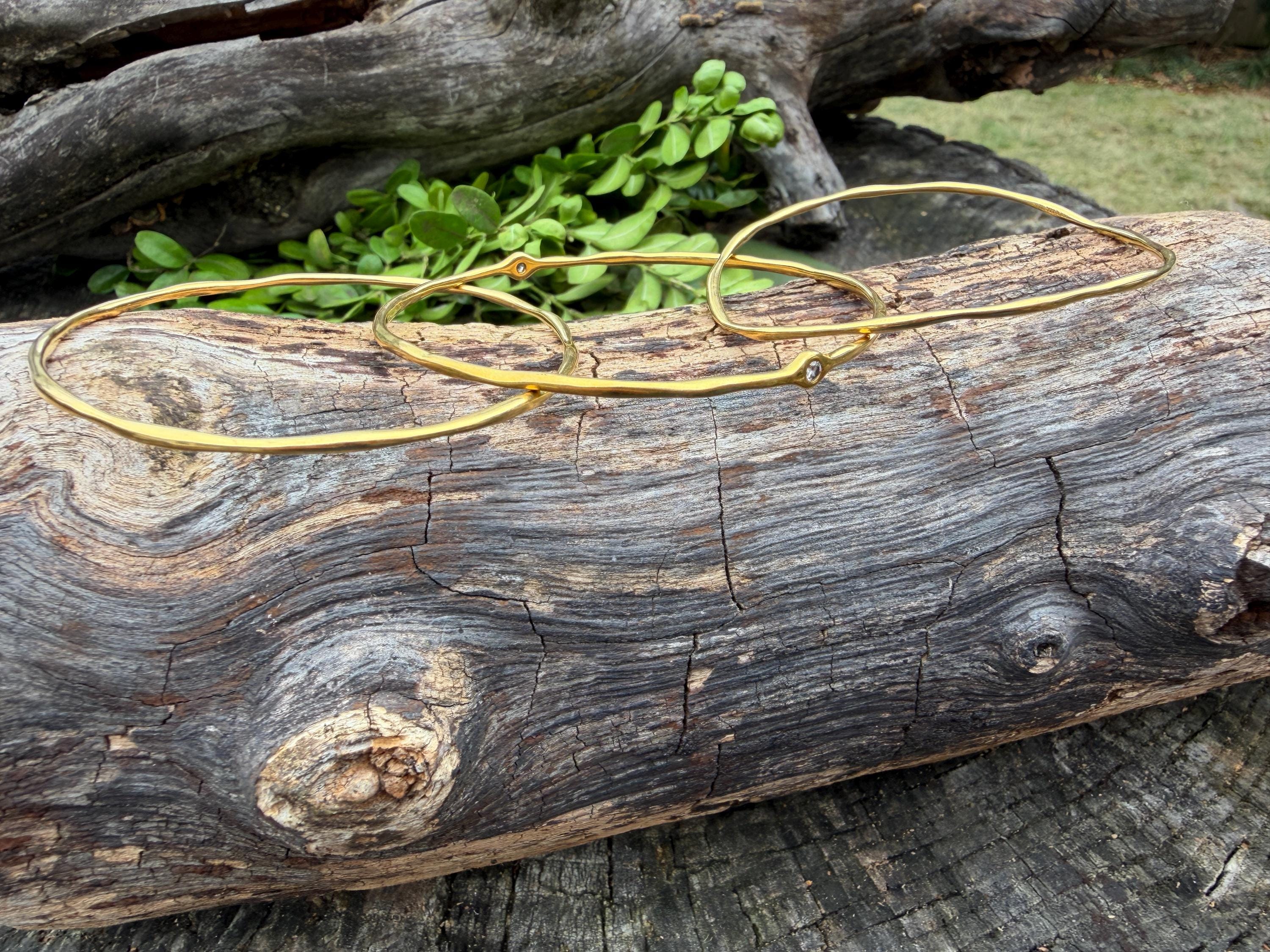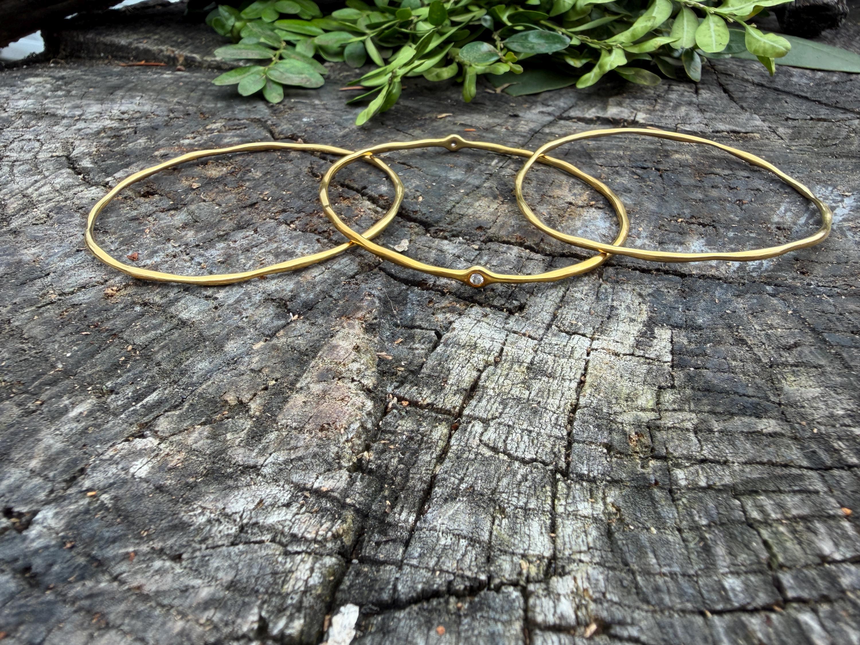 This chic triple set of bangles are set in 18k yellow gold. Three polished gold bangles, uniquely shaped, and one with a diamond in the center, create a look intriguing elegance. They are slip on style and would look great together or separately. The diamond has an approx. weight of .20 ct. It is F in color and VS1 in clarity. The bangle’s inside circumference is 7”. The inside diameter is 2 5/8". They will fit a medium size wrist. They weigh 25.12 grams together. Each bangle is 1/16" wide. They are made by designer Ippolita.