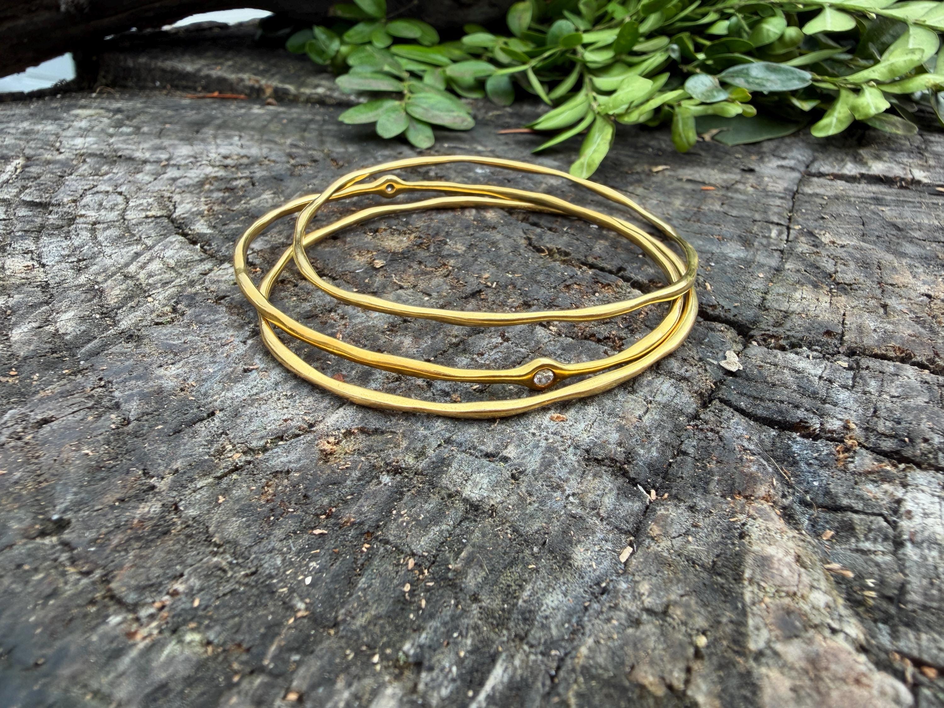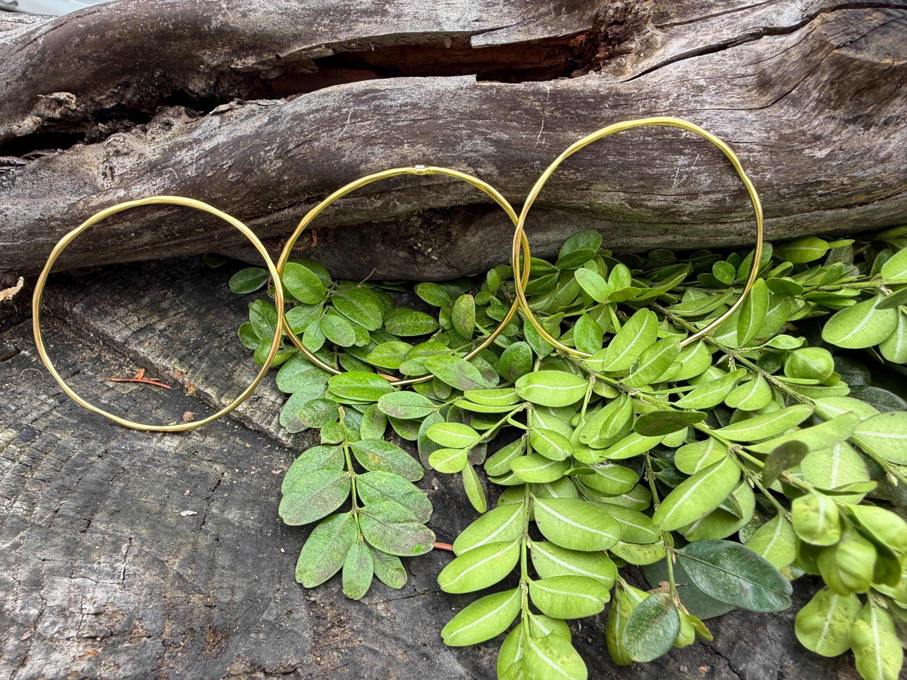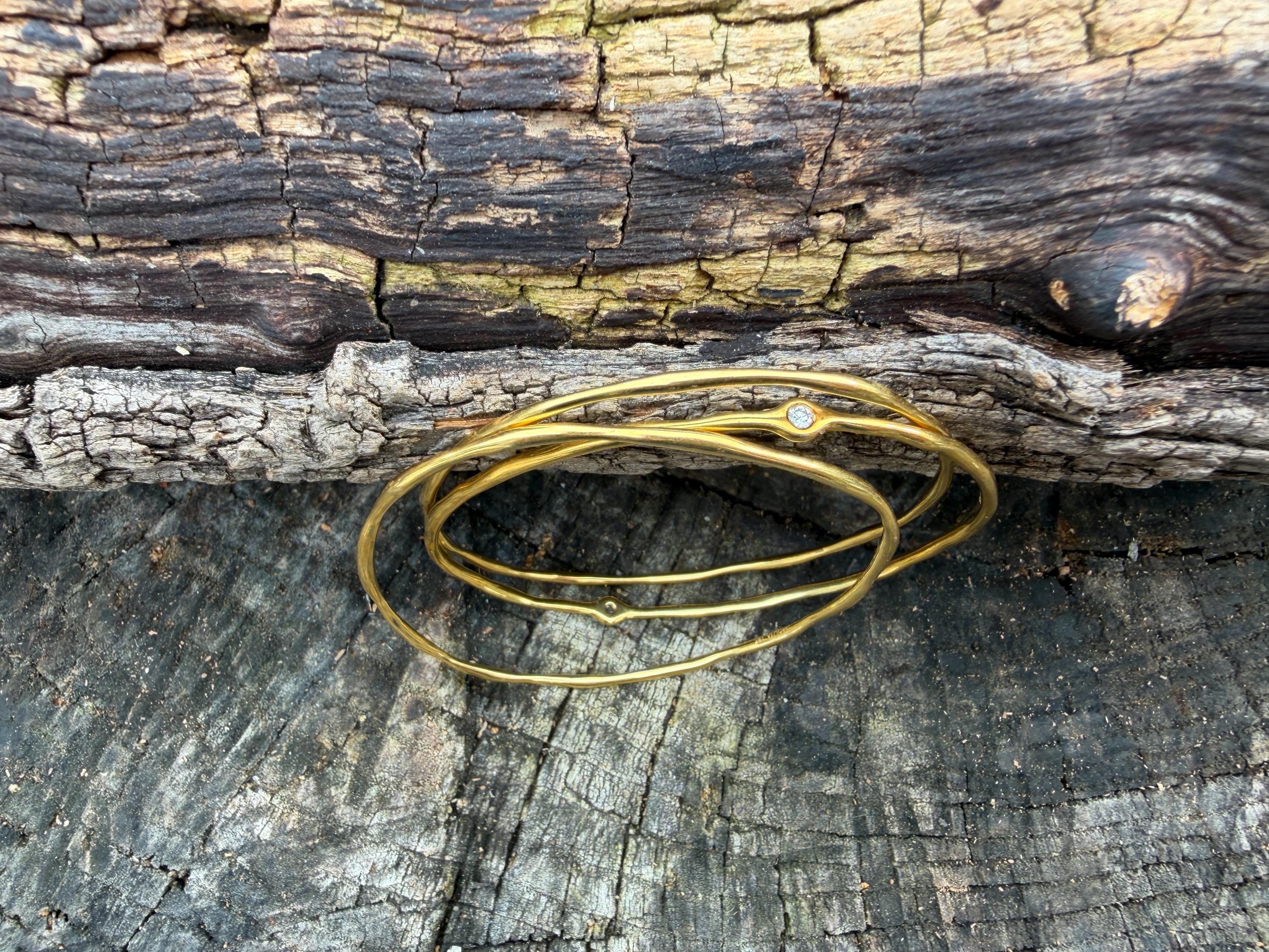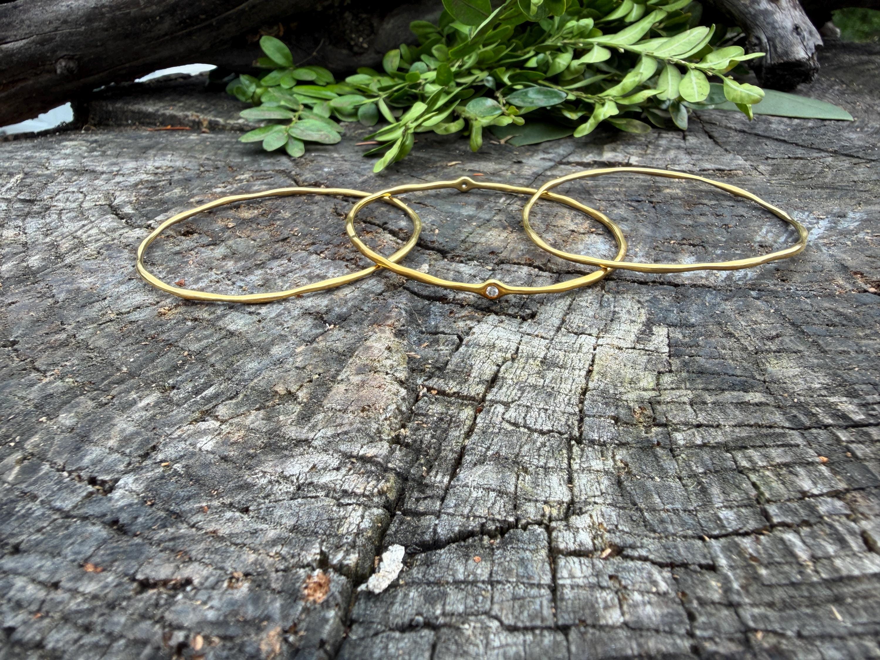 This chic triple set of bangles are set in 18k yellow gold. Three polished gold bangles, uniquely shaped, and one with a diamond in the center, create a look intriguing elegance. They are slip on style and would look great together or separately. The diamond has an approx. weight of .20 ct. It is F in color and VS1 in clarity. The bangle’s inside circumference is 7”. The inside diameter is 2 5/8". They will fit a medium size wrist. They weigh 25.12 grams together. Each bangle is 1/16" wide. They are made by designer Ippolita.