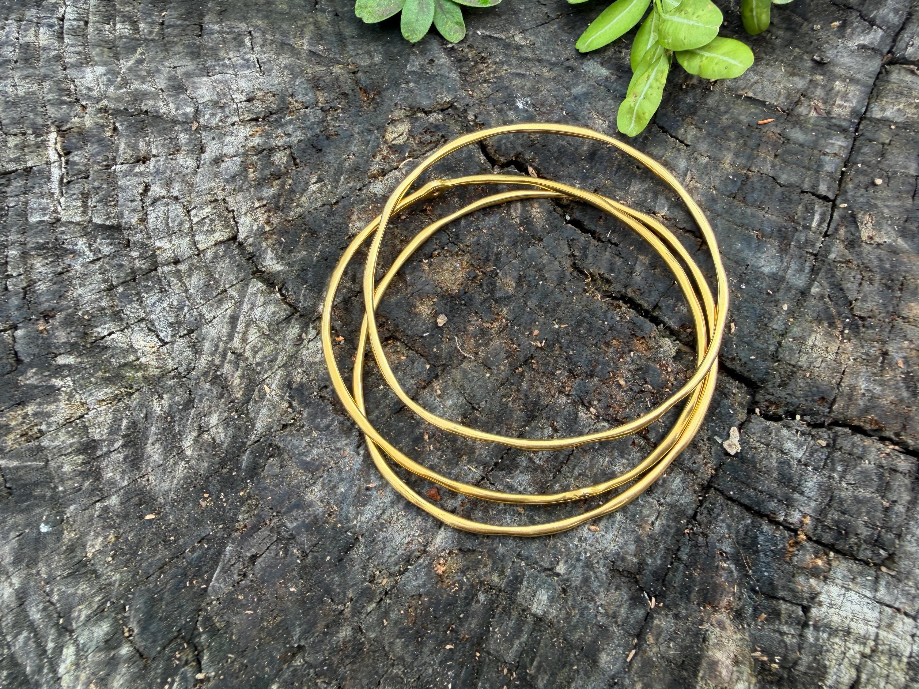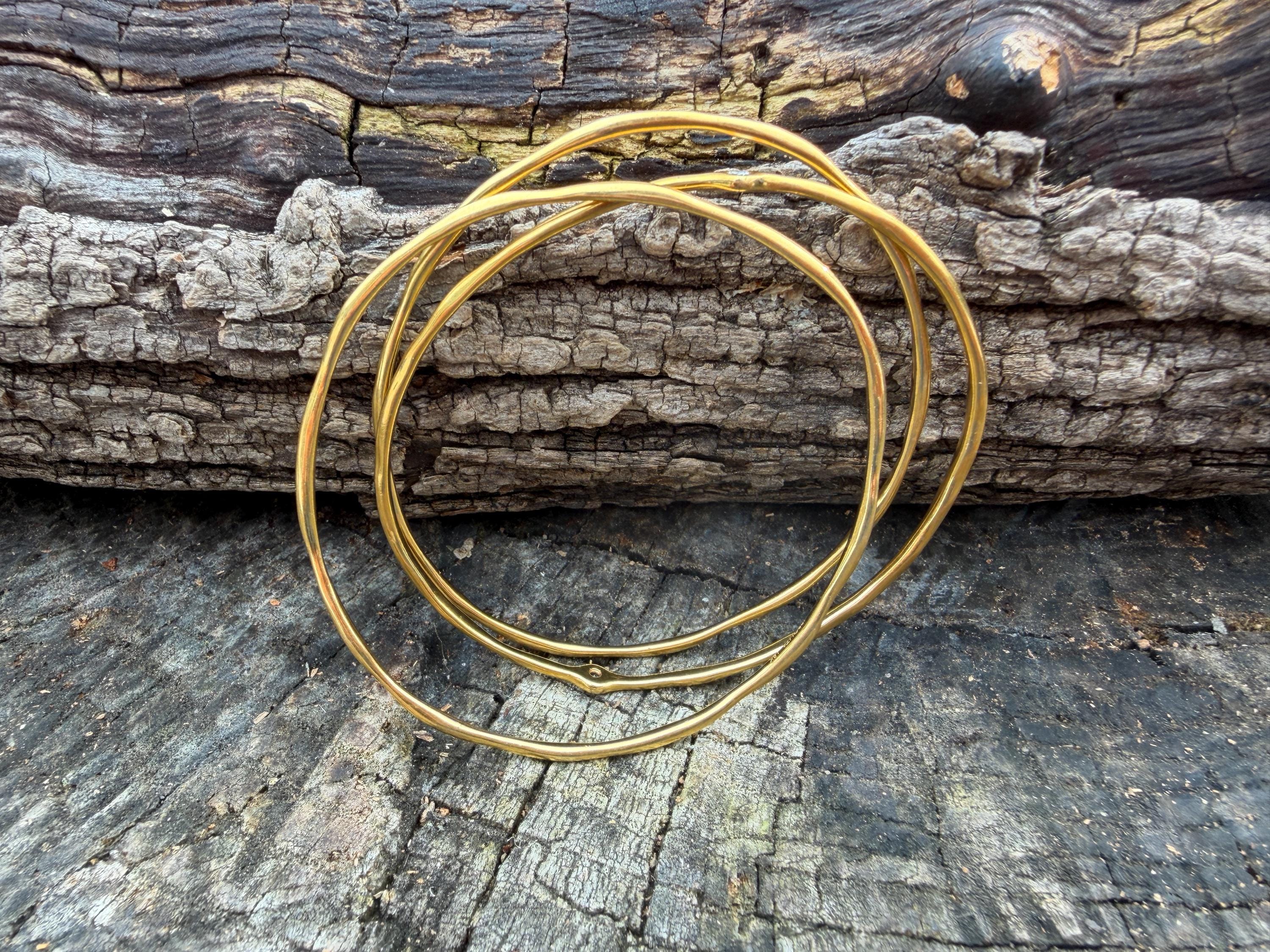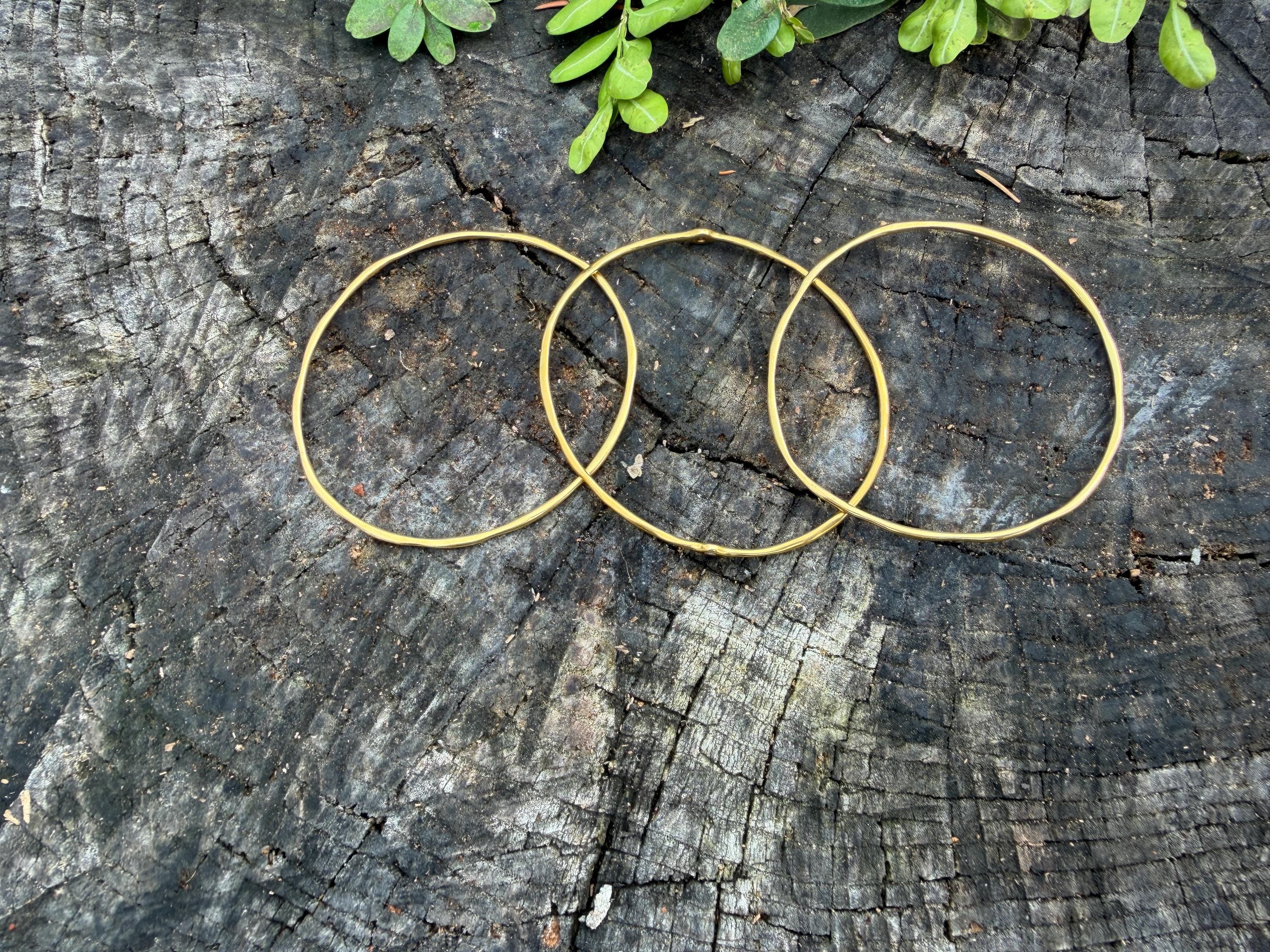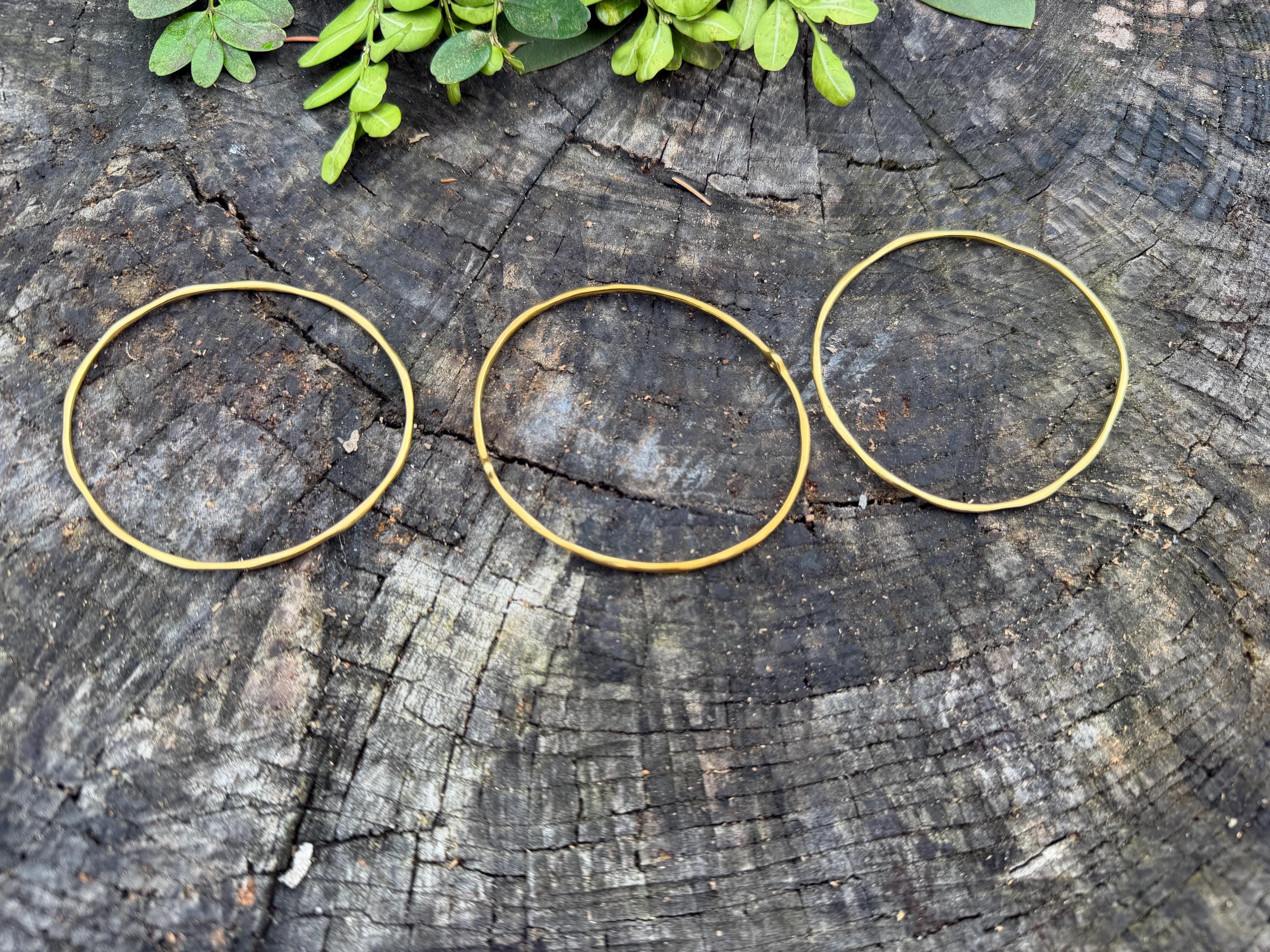 This chic triple set of bangles are set in 18k yellow gold. Three polished gold bangles, uniquely shaped, and one with a diamond in the center, create a look intriguing elegance. They are slip on style and would look great together or separately. The diamond has an approx. weight of .20 ct. It is F in color and VS1 in clarity. The bangle’s inside circumference is 7”. The inside diameter is 2 5/8". They will fit a medium size wrist. They weigh 25.12 grams together. Each bangle is 1/16" wide. They are made by designer Ippolita.
