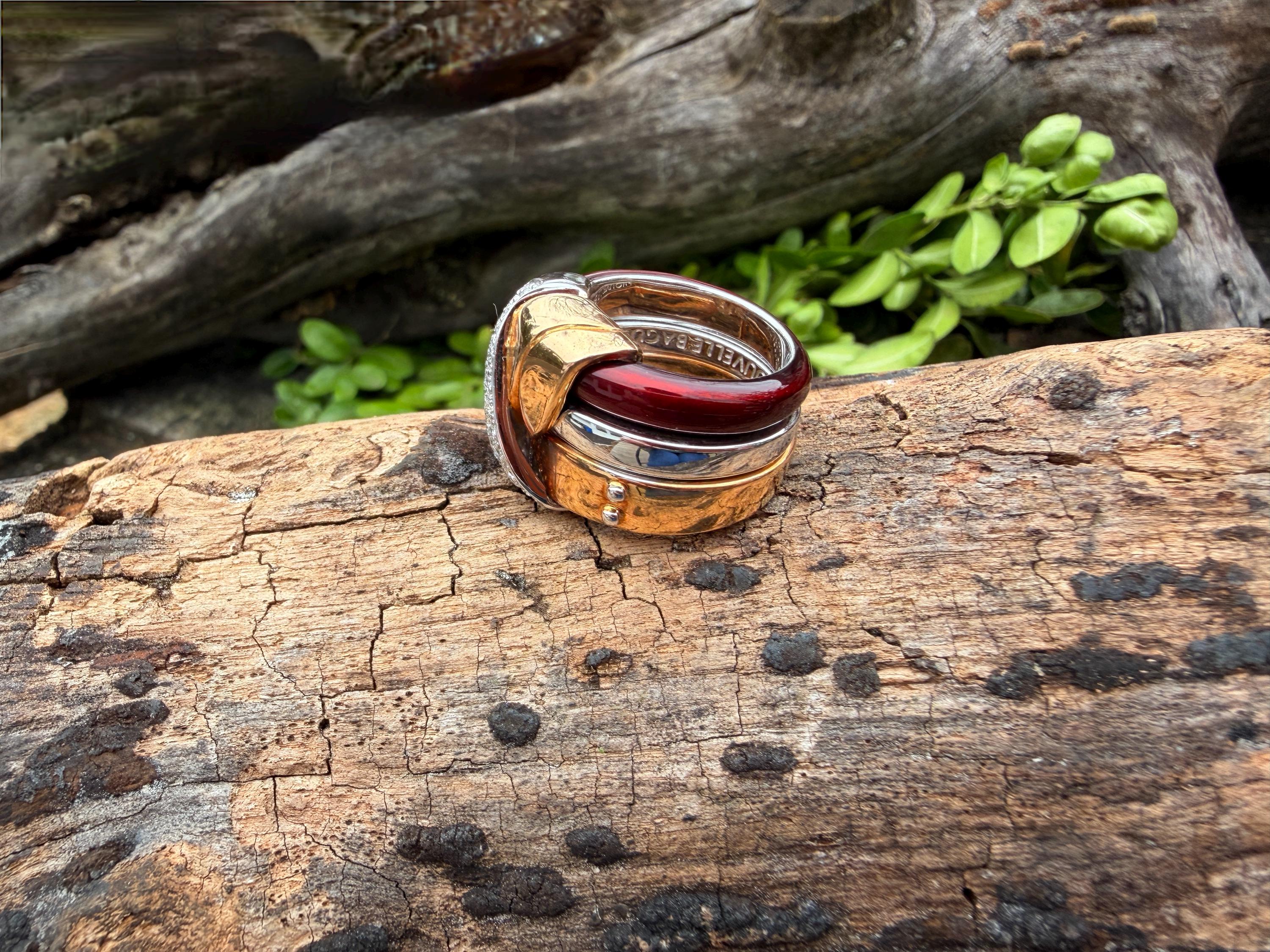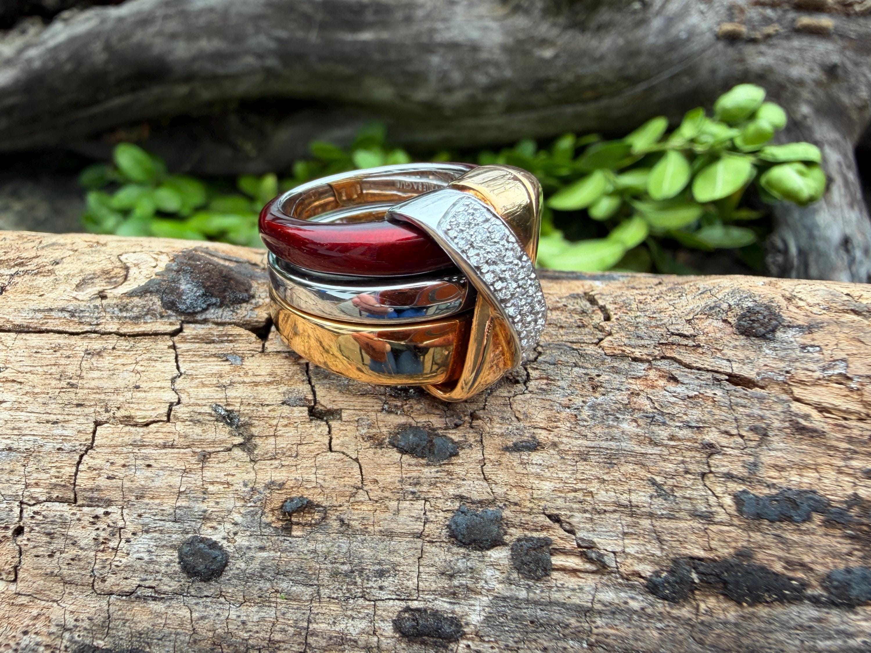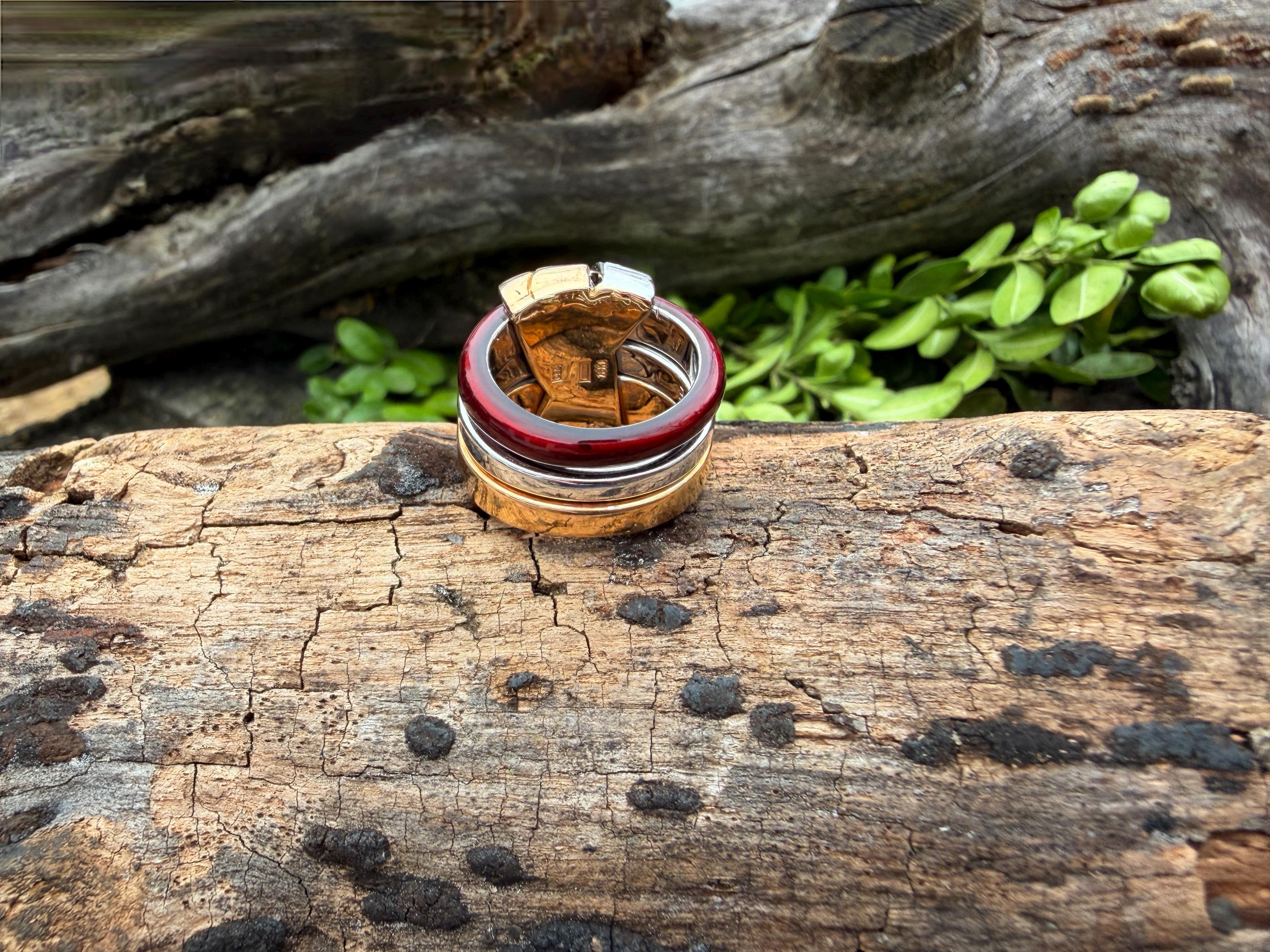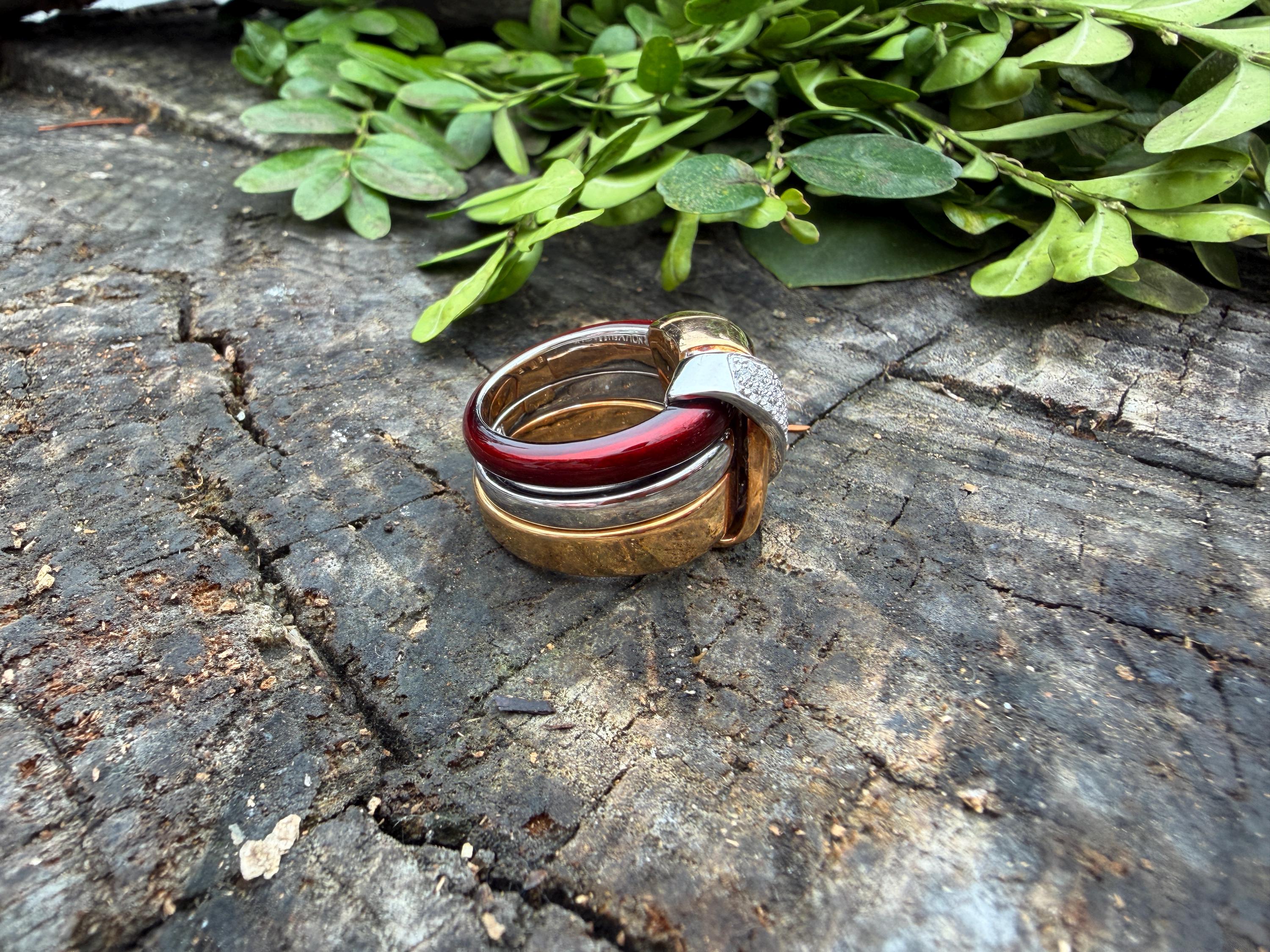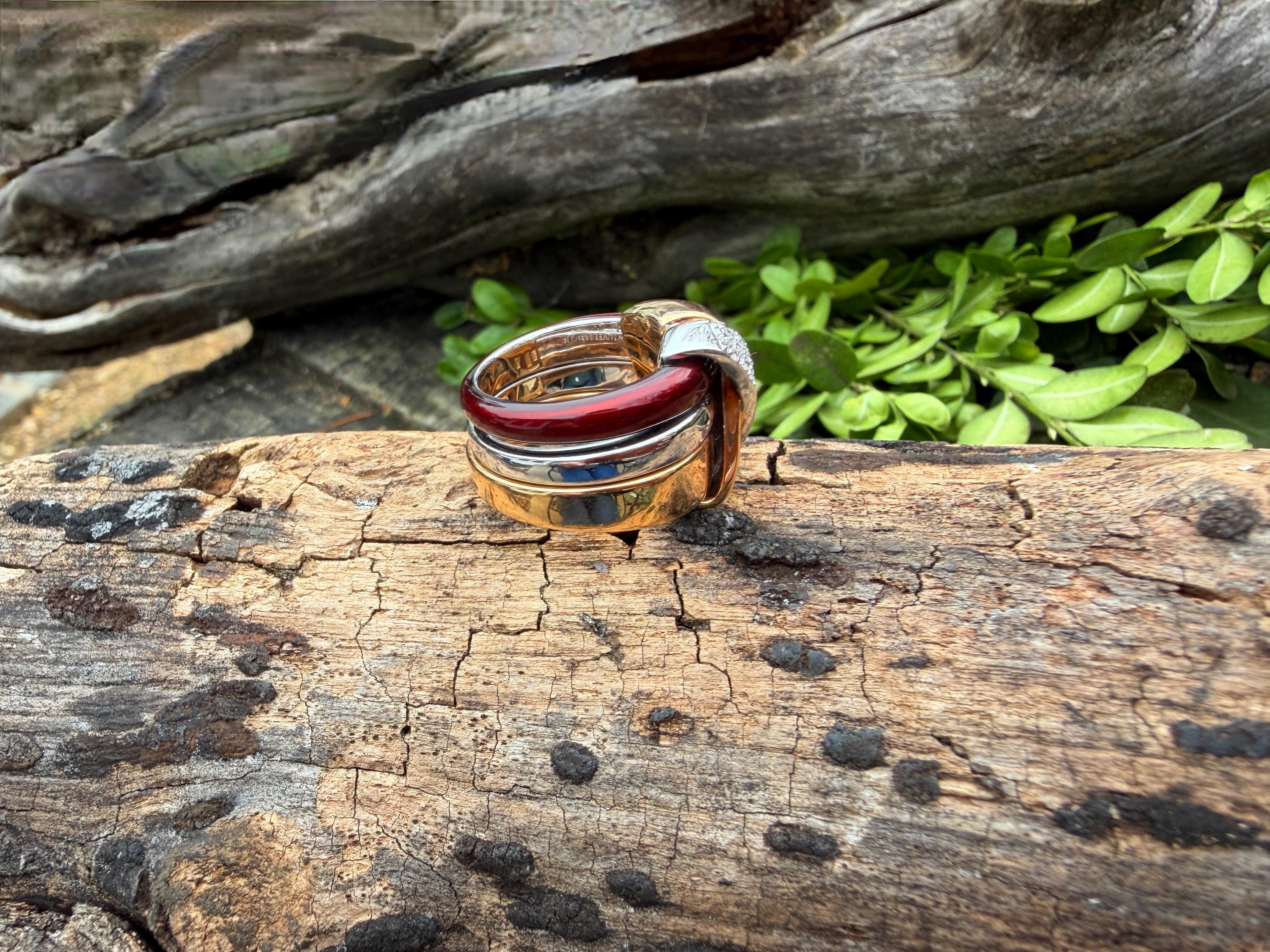 Gold and Bold, this striking cigar band/ring is absolutely captivating. It is set in 18k gold. The ring is composed of three distinct bands - yellow gold, white gold and vivid red enamel, fused together and bound with shimmering diamonds and gold. The diamonds have a total approx. weight of .45 ct. The diamonds are G in color and VS2 in clarity. Its striking aura launches a luxurious feel and look on your finger and gives it that uniquely abstract and artistic allure. It weighs 23.19 grams. It measures 1/2" wide. It sits 1/4" off the finger. It is a size 6. It is marked 750 and La Nouvelle Bague.
