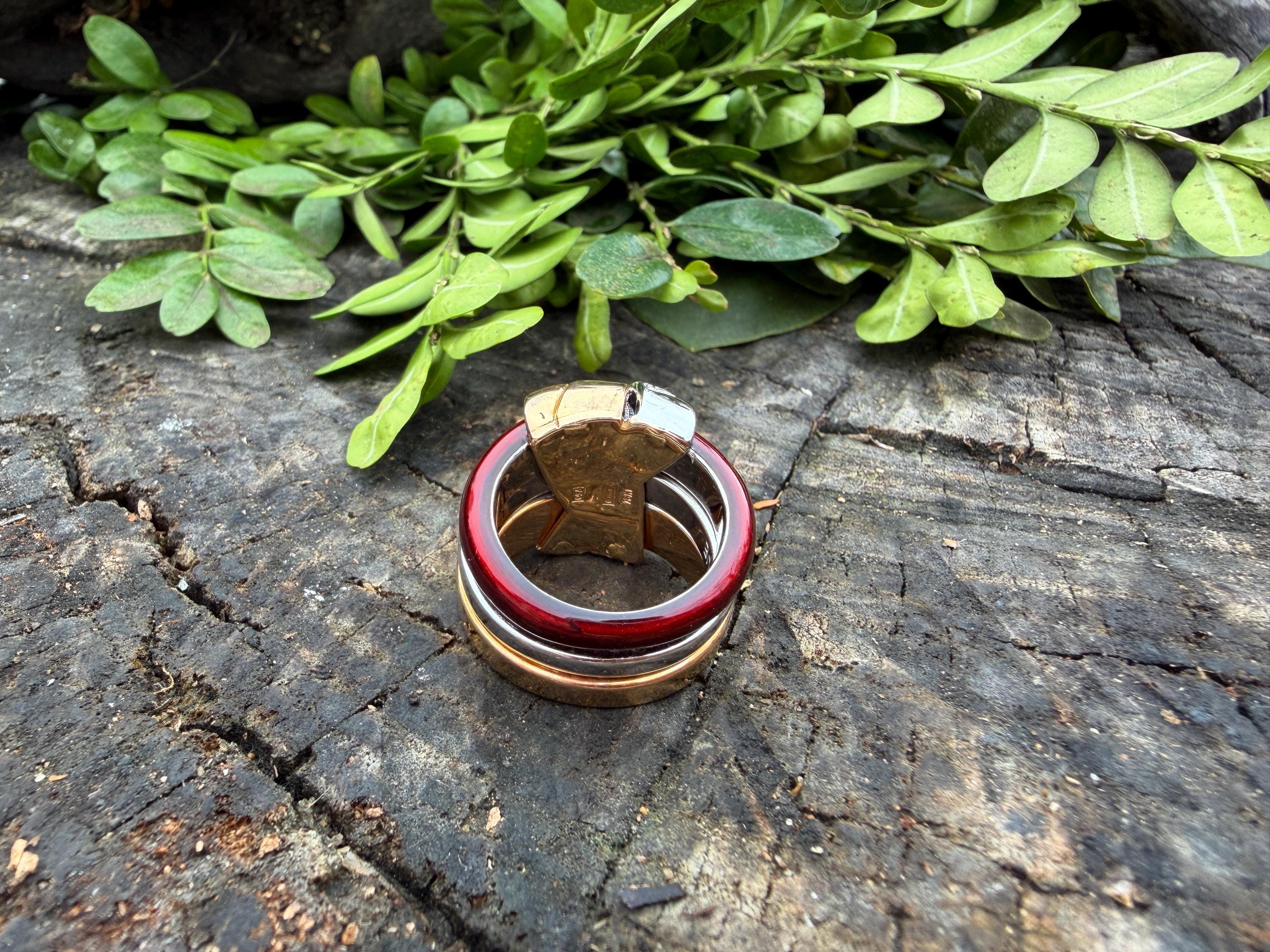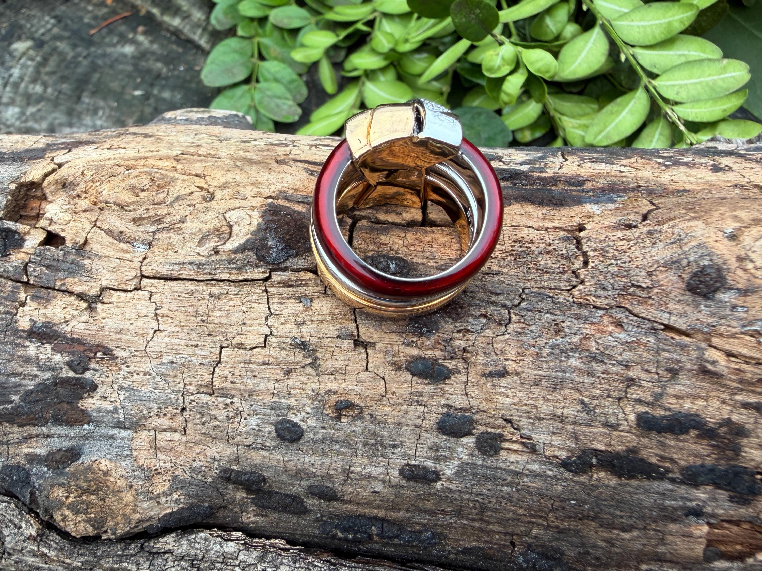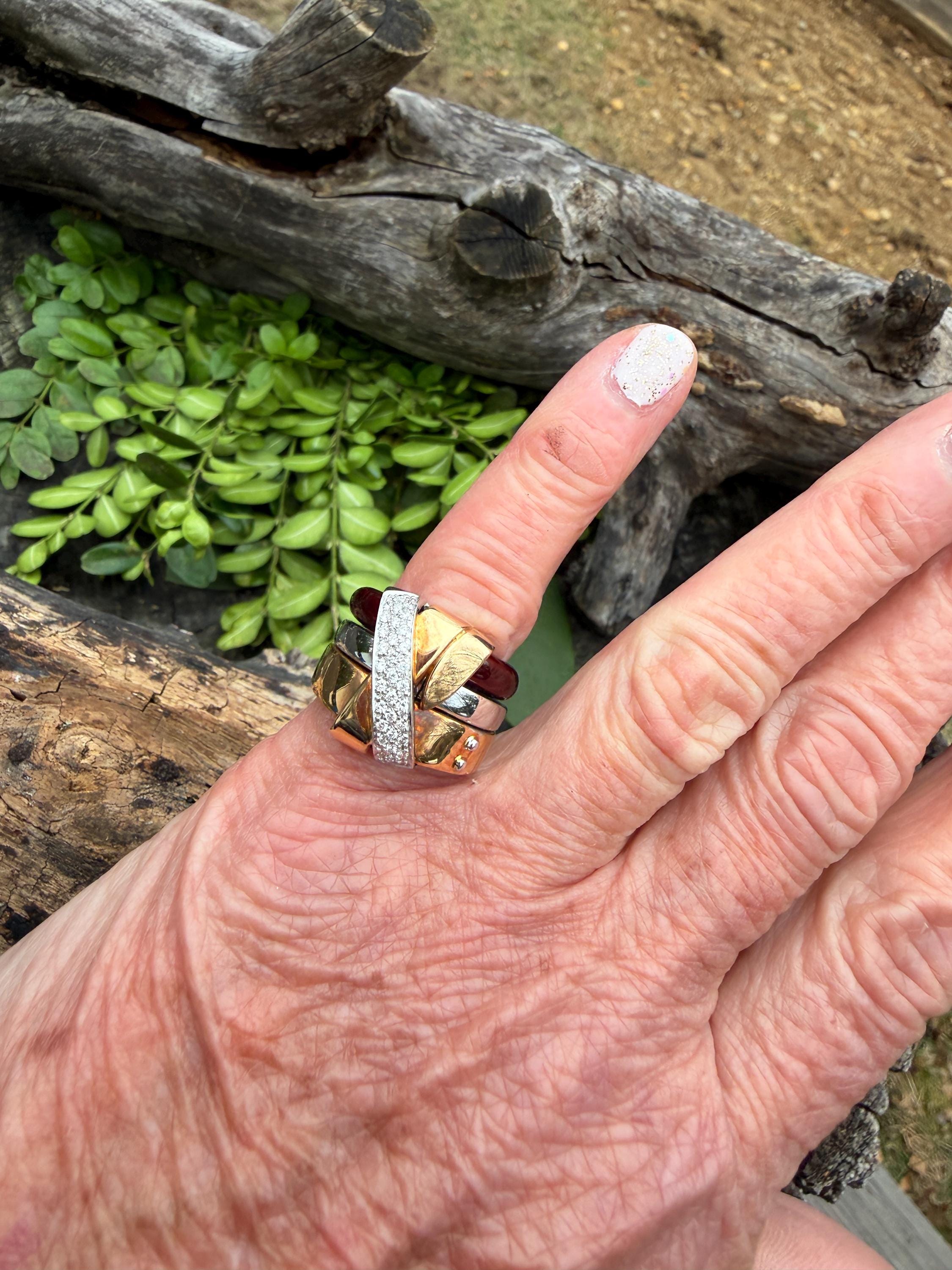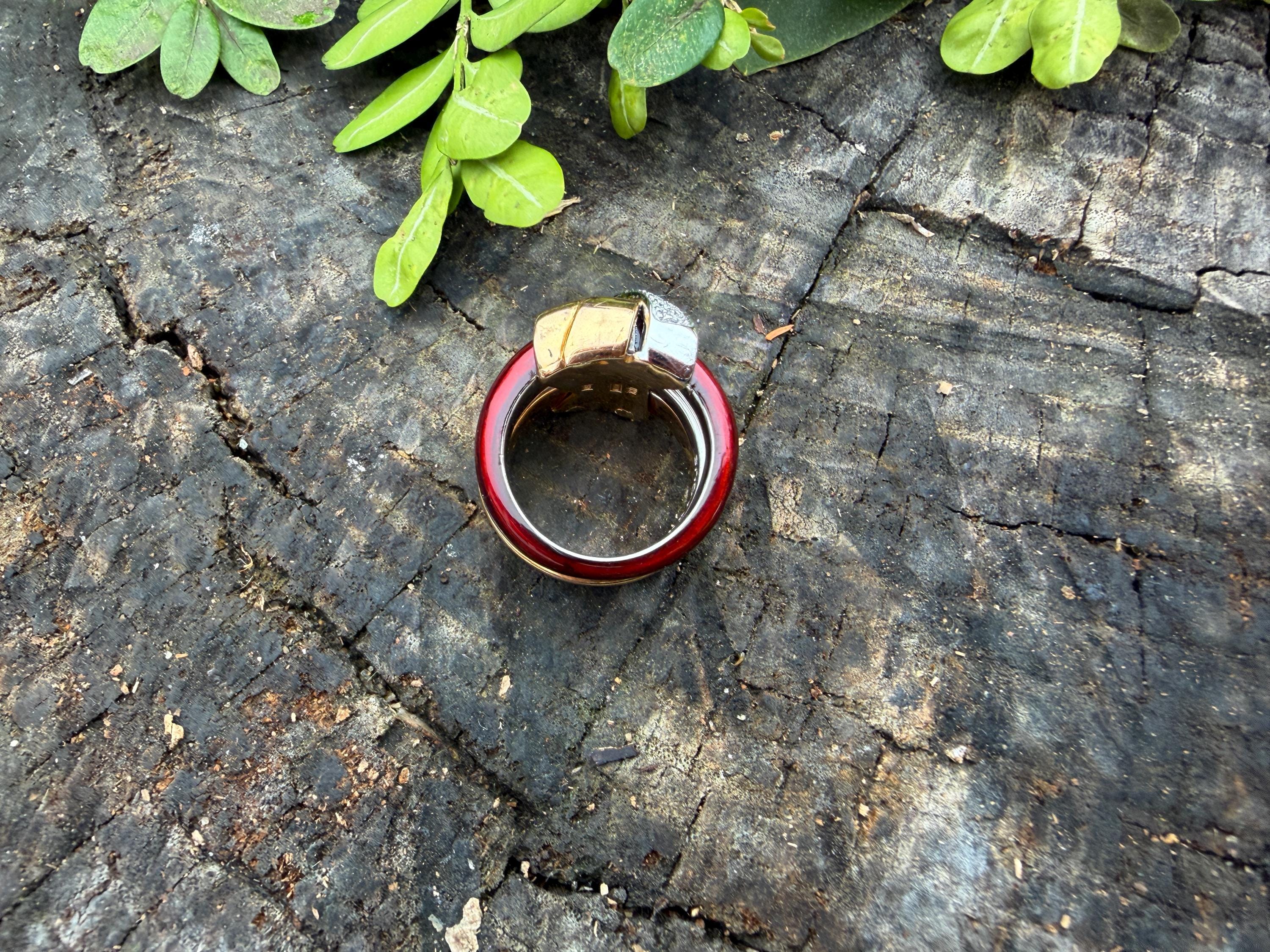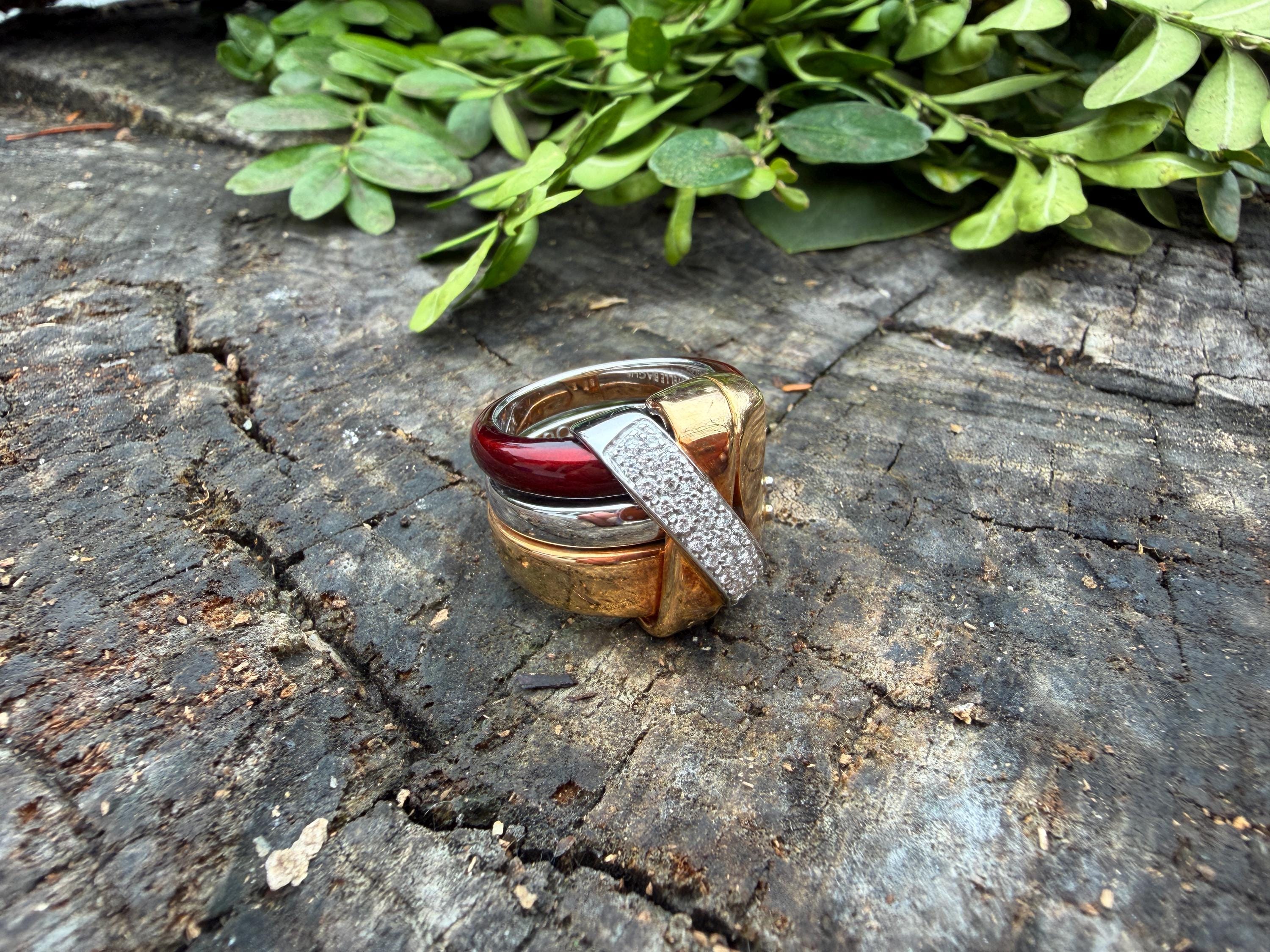 Gold and Bold, this striking cigar band/ring is absolutely captivating. It is set in 18k gold. The ring is composed of three distinct bands - yellow gold, white gold and vivid red enamel, fused together and bound with shimmering diamonds and gold. The diamonds have a total approx. weight of .45 ct. The diamonds are G in color and VS2 in clarity. Its striking aura launches a luxurious feel and look on your finger and gives it that uniquely abstract and artistic allure. It weighs 23.19 grams. It measures 1/2" wide. It sits 1/4" off the finger. It is a size 6. It is marked 750 and La Nouvelle Bague.