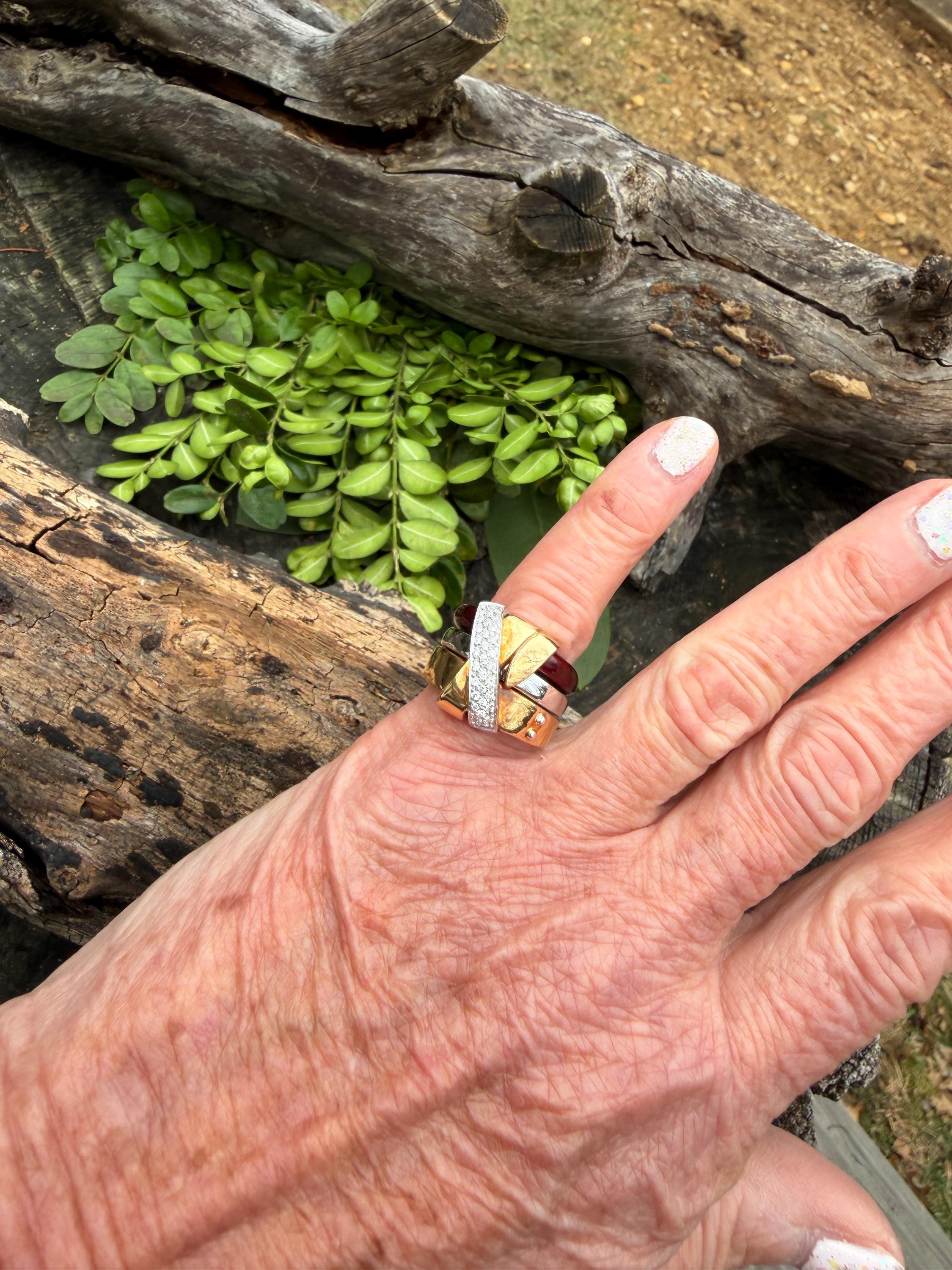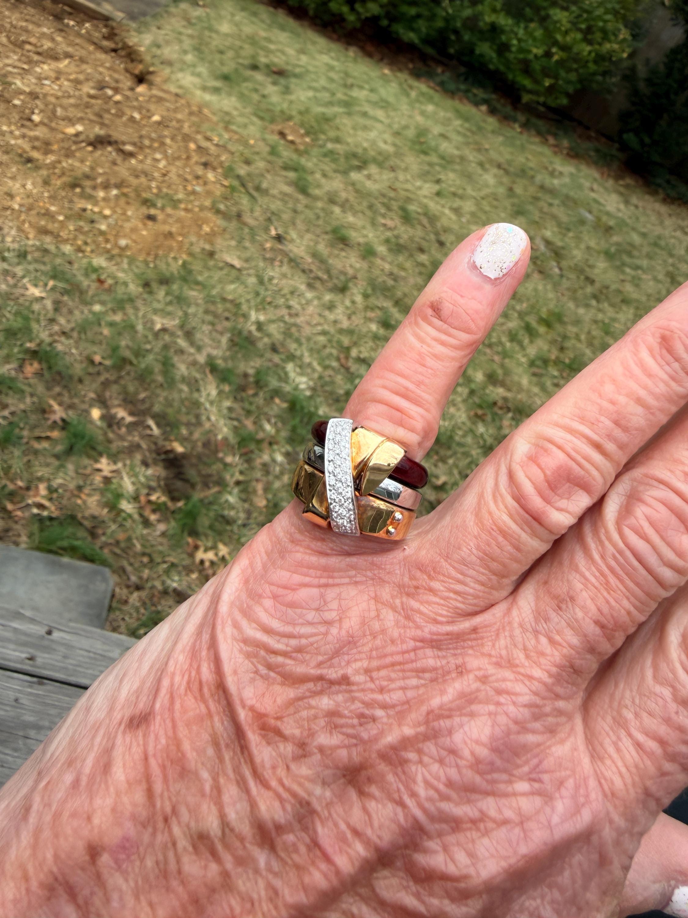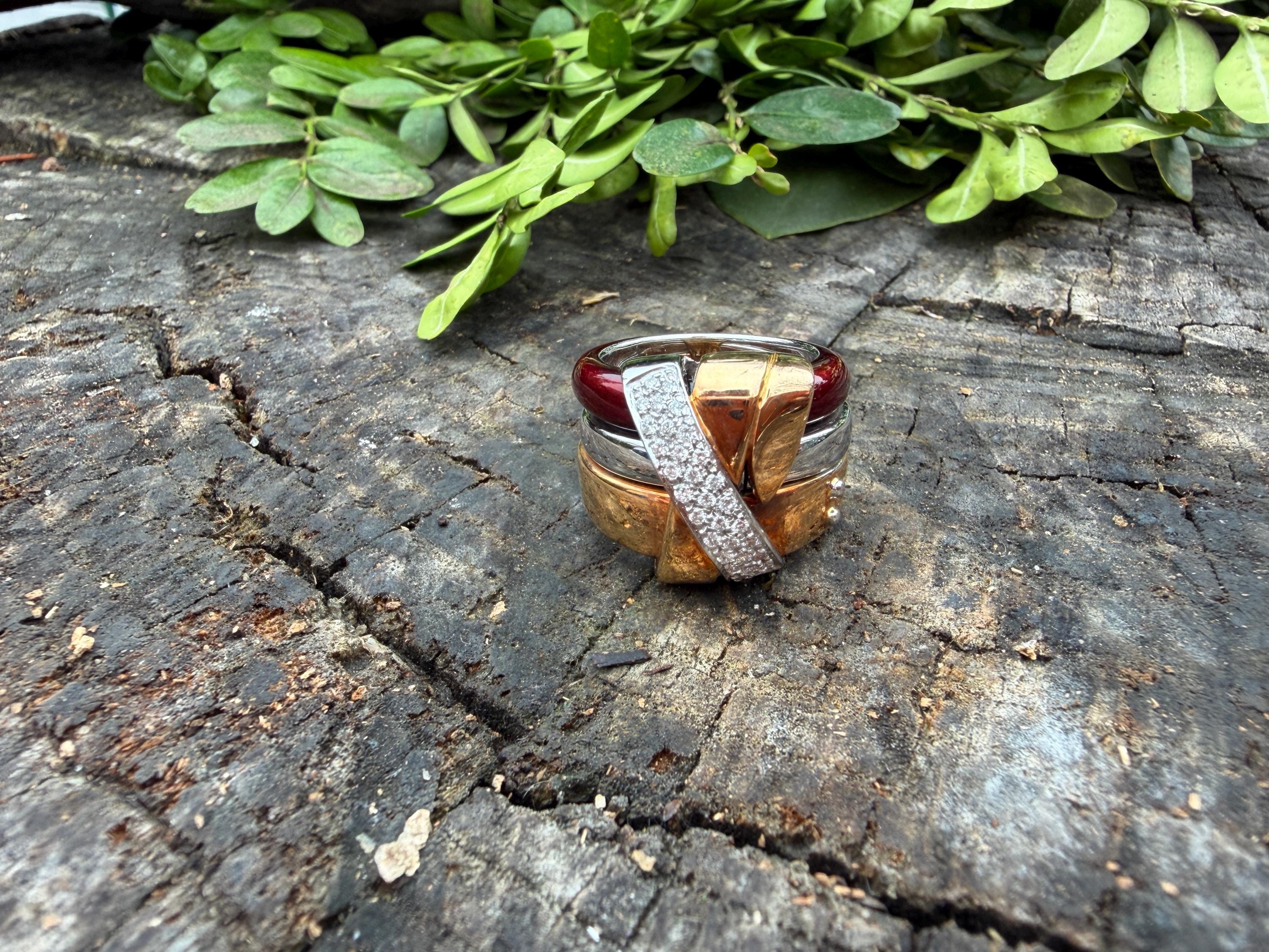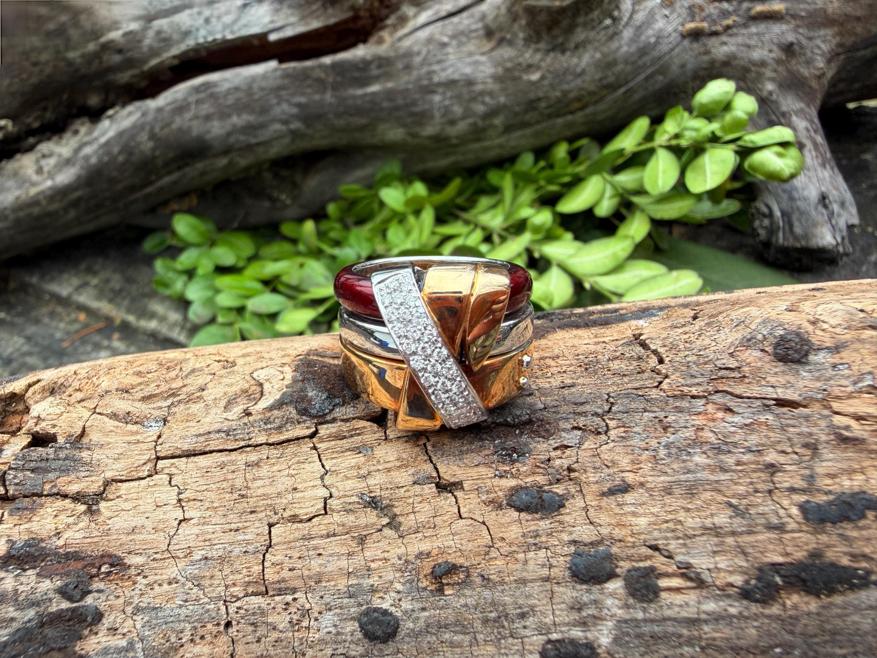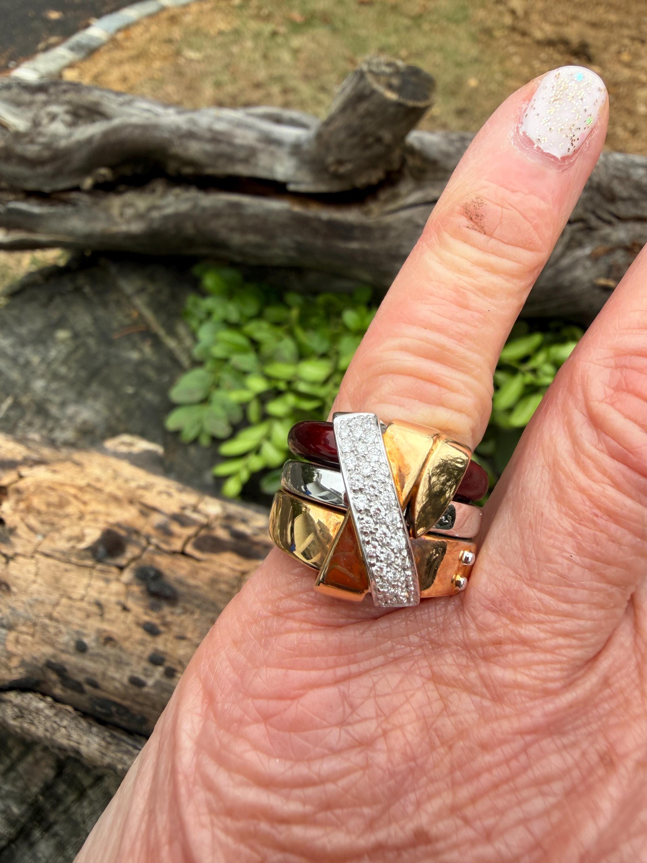 Gold and Bold, this striking cigar band/ring is absolutely captivating. It is set in 18k gold. The ring is composed of three distinct bands - yellow gold, white gold and vivid red enamel, fused together and bound with shimmering diamonds and gold. The diamonds have a total approx. weight of .45 ct. The diamonds are G in color and VS2 in clarity. Its striking aura launches a luxurious feel and look on your finger and gives it that uniquely abstract and artistic allure. It weighs 23.19 grams. It measures 1/2" wide. It sits 1/4" off the finger. It is a size 6. It is marked 750 and La Nouvelle Bague.