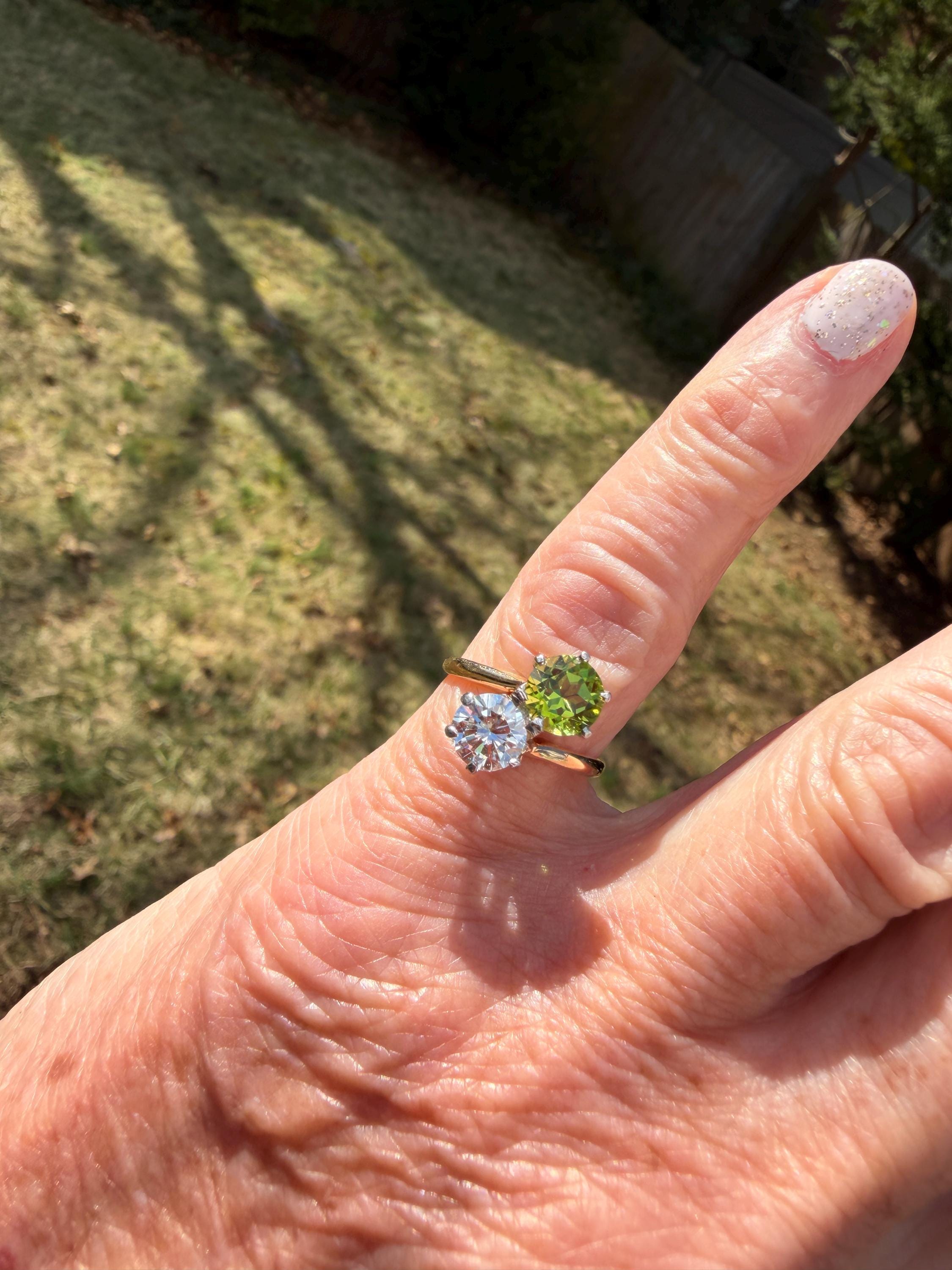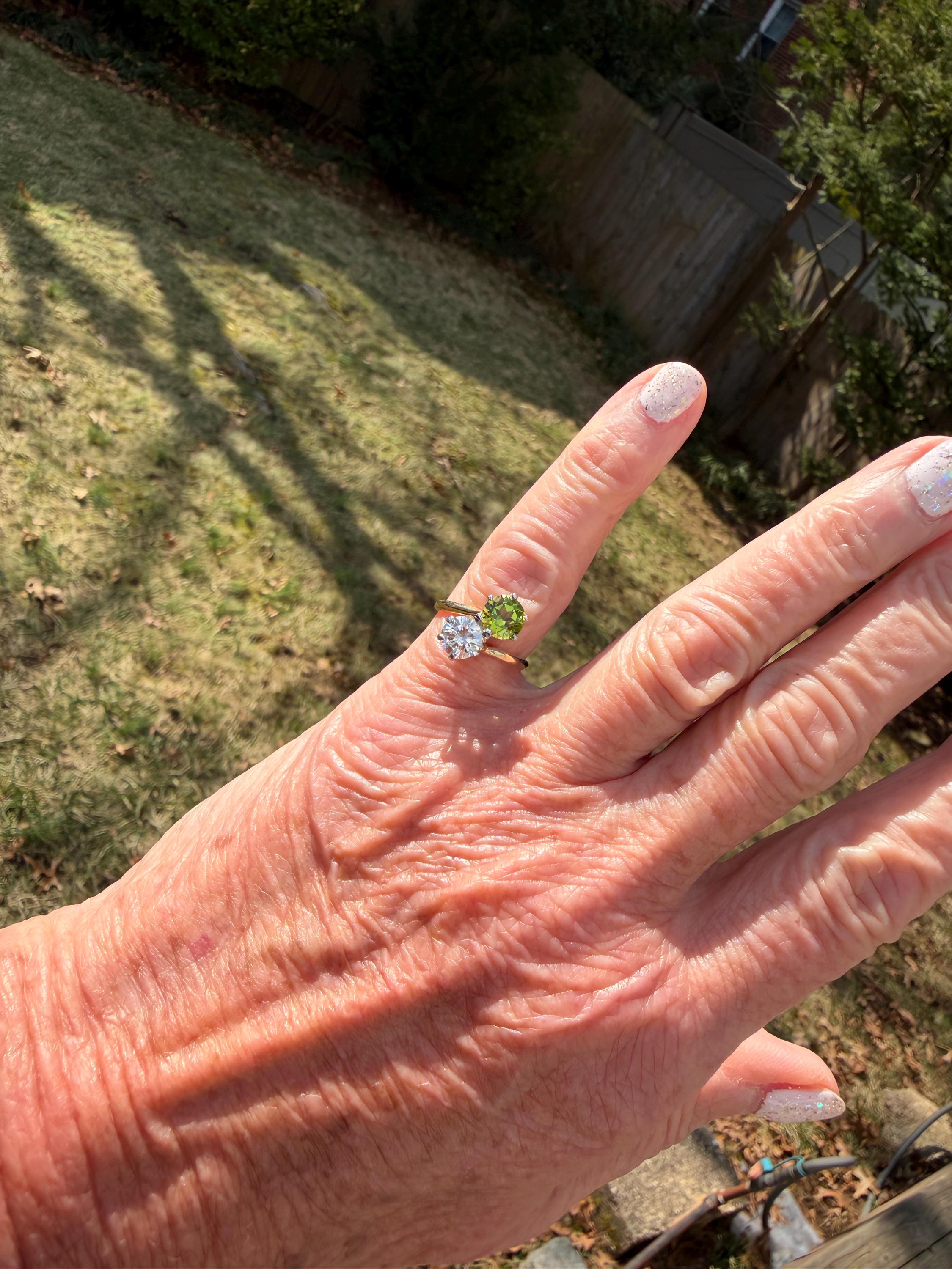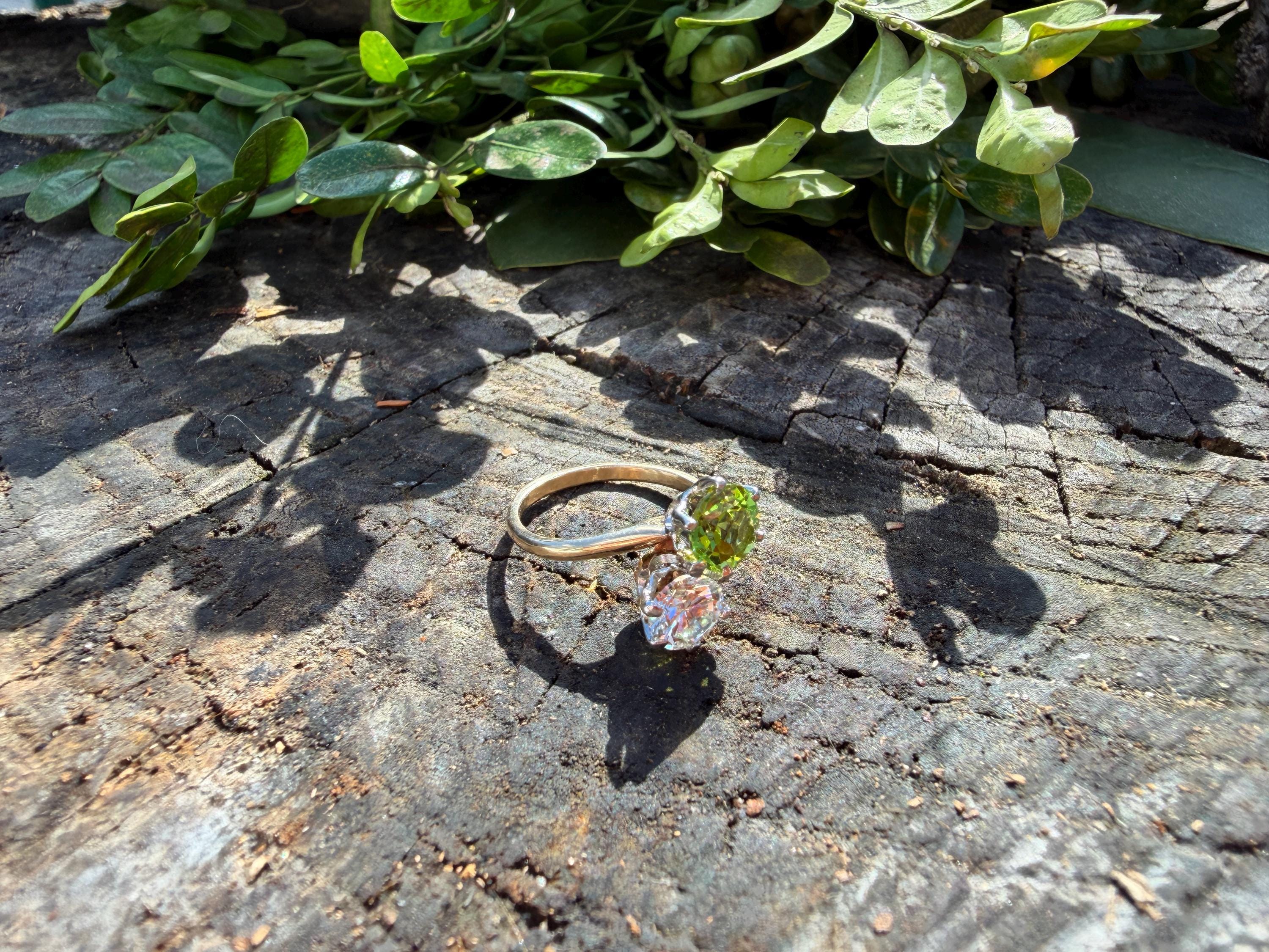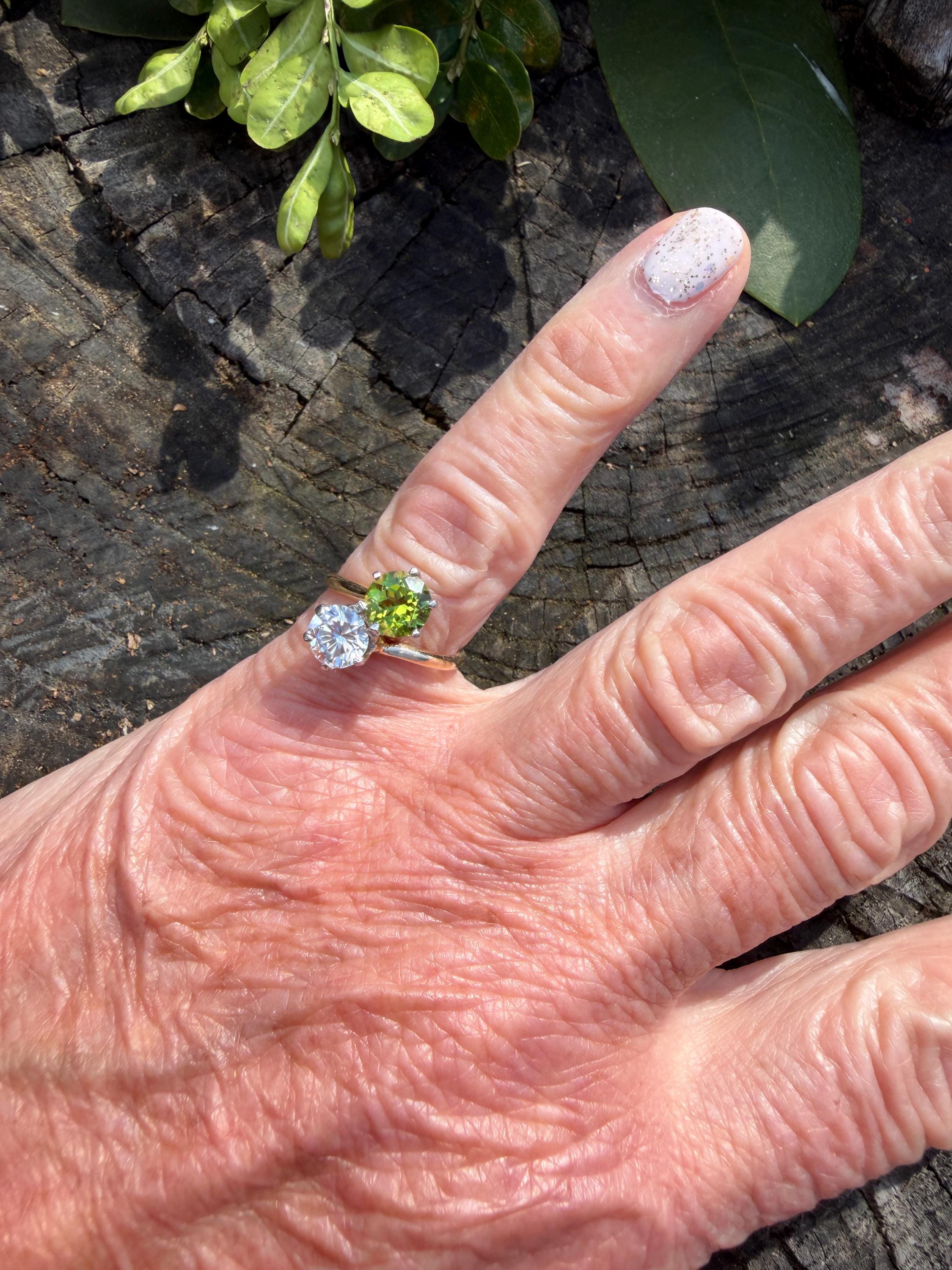 Enchanting with its style and flair, this 1940s diamond and peridot moi et toi ring dates from the late 1940’s. Set in 14k yellow gold, the design features a diagonally set round cut diamond paired with a vibrant lime colored round peridot. The diamond weighs approx. 1.00 ct. The diamond is F in color and VS1 in clarity. The peridot weighs approximately. .85 ct. Wear it as an alternative engagement ring or an every day ring. This ring makes a statement with quite elegance.. The ring will fit a size 5 1/2 finger. It sits 1/4" off the finger. It weighs 2.97 grams. It is marked 14k.