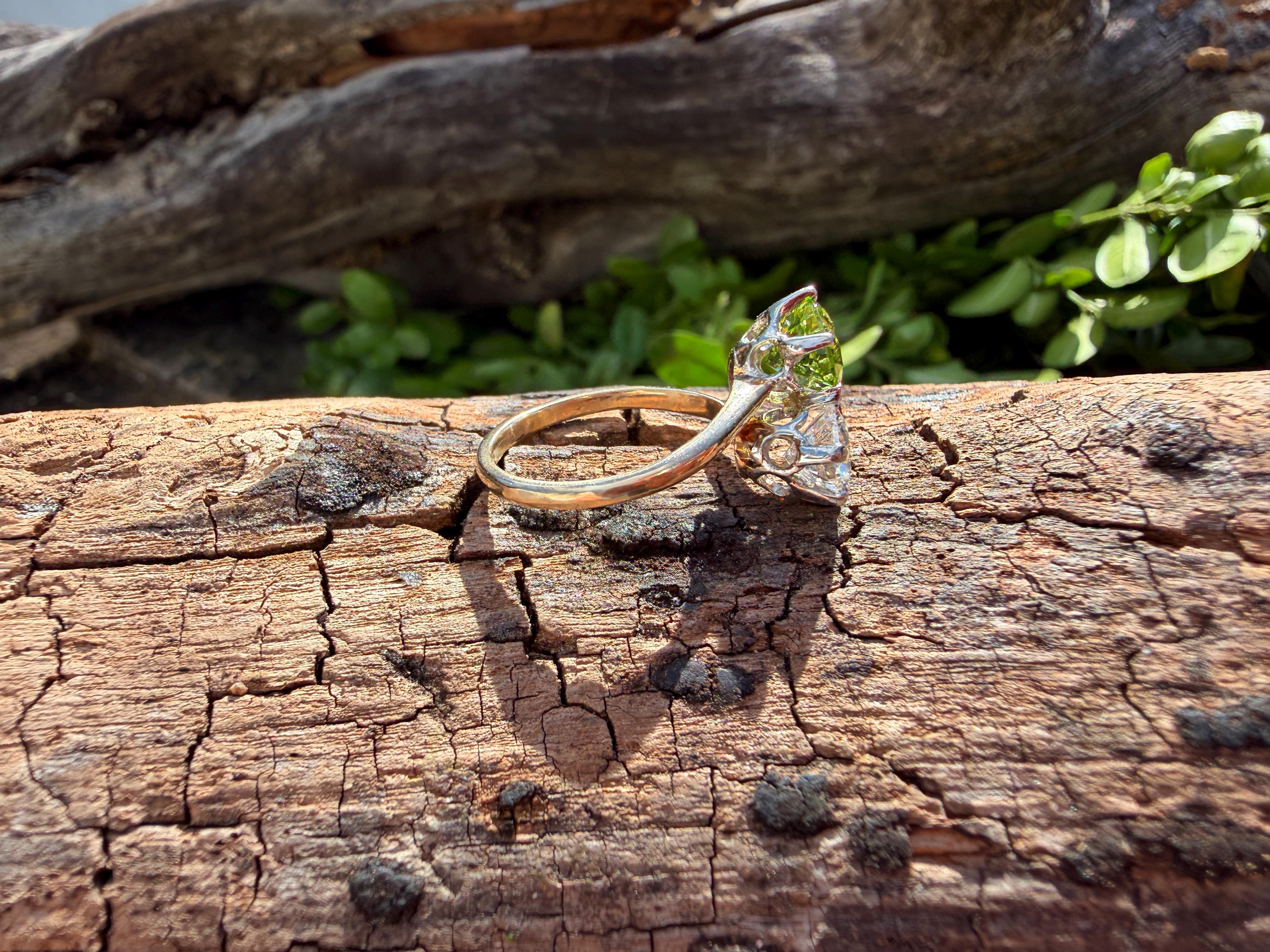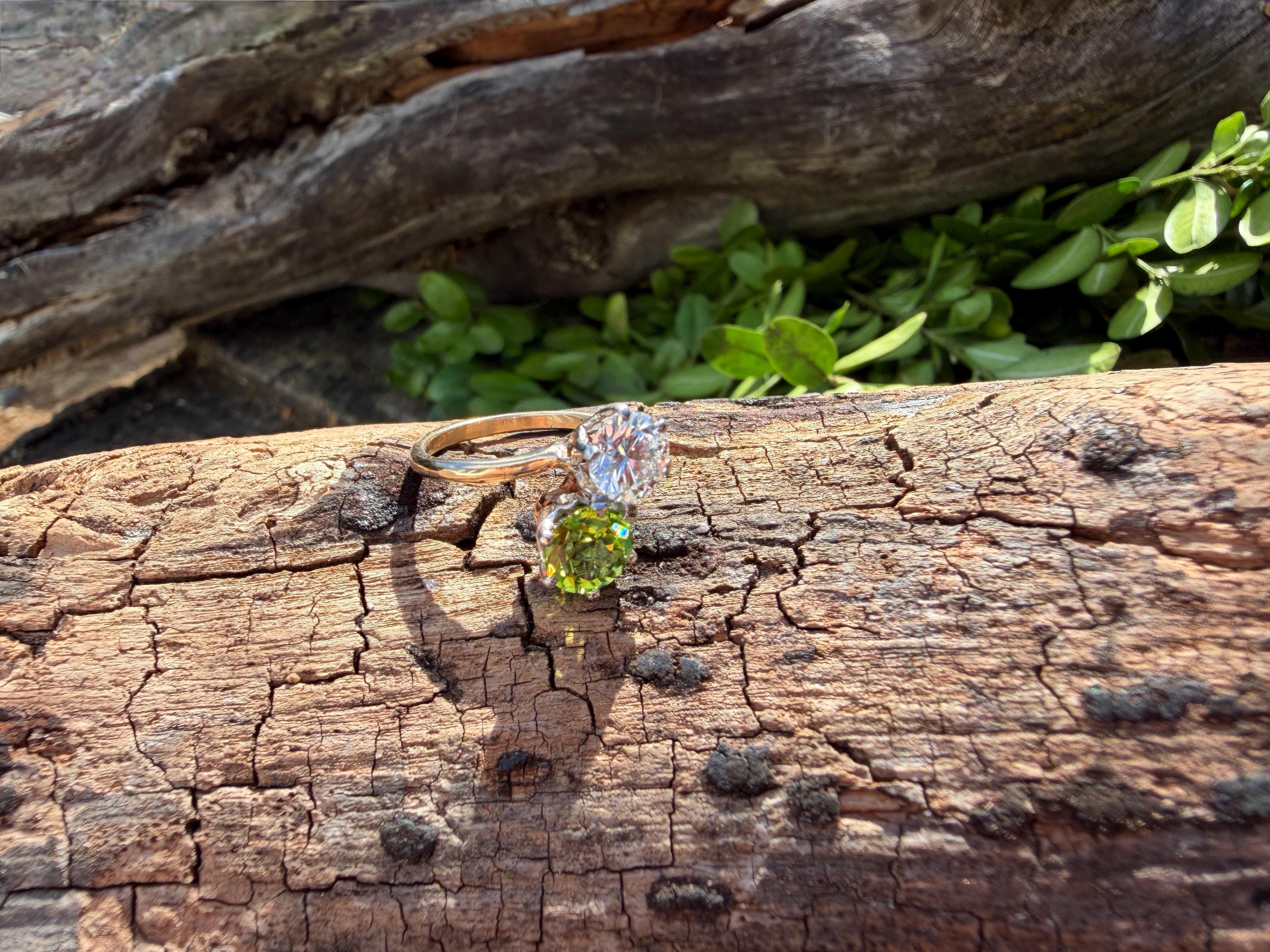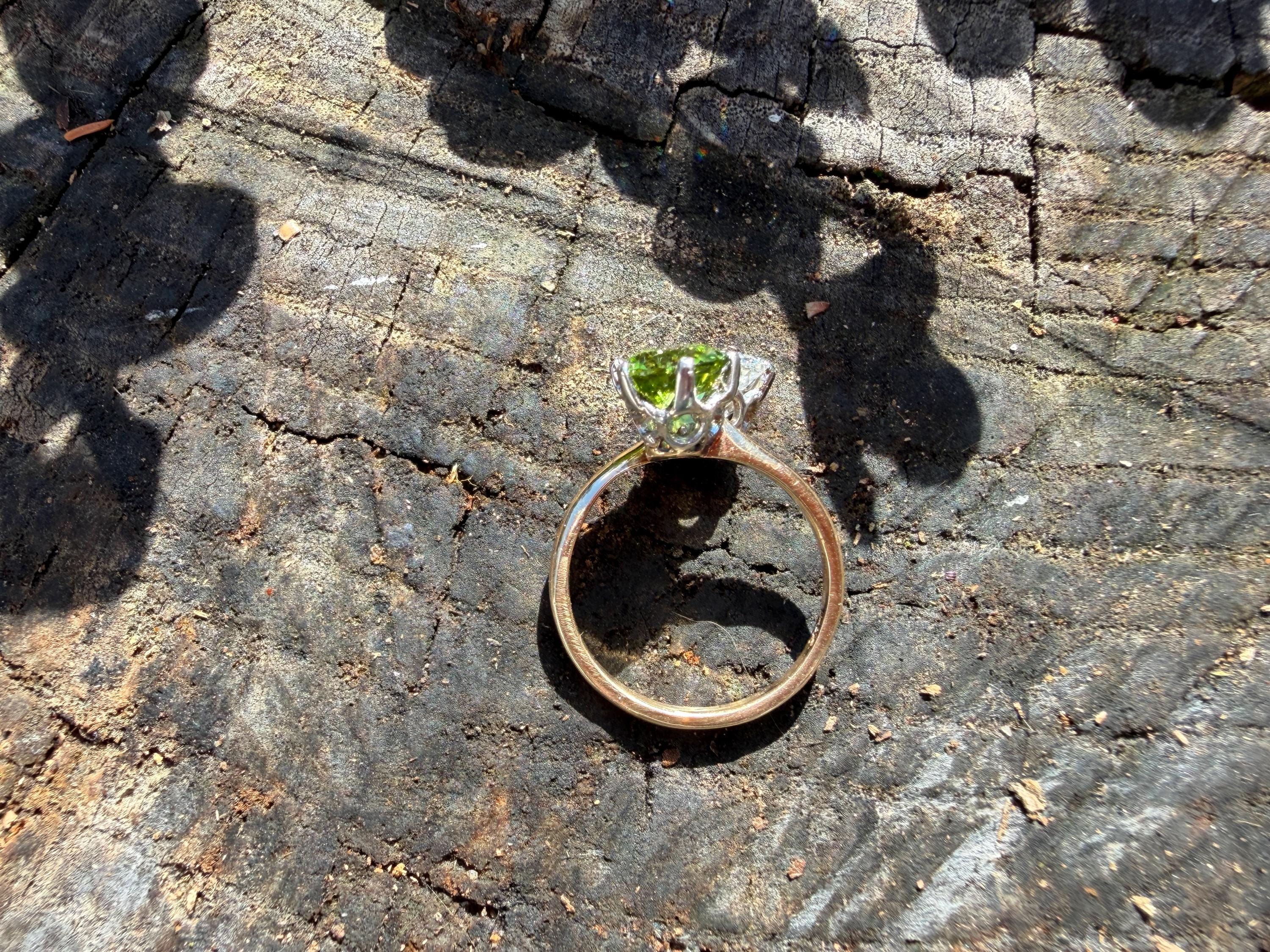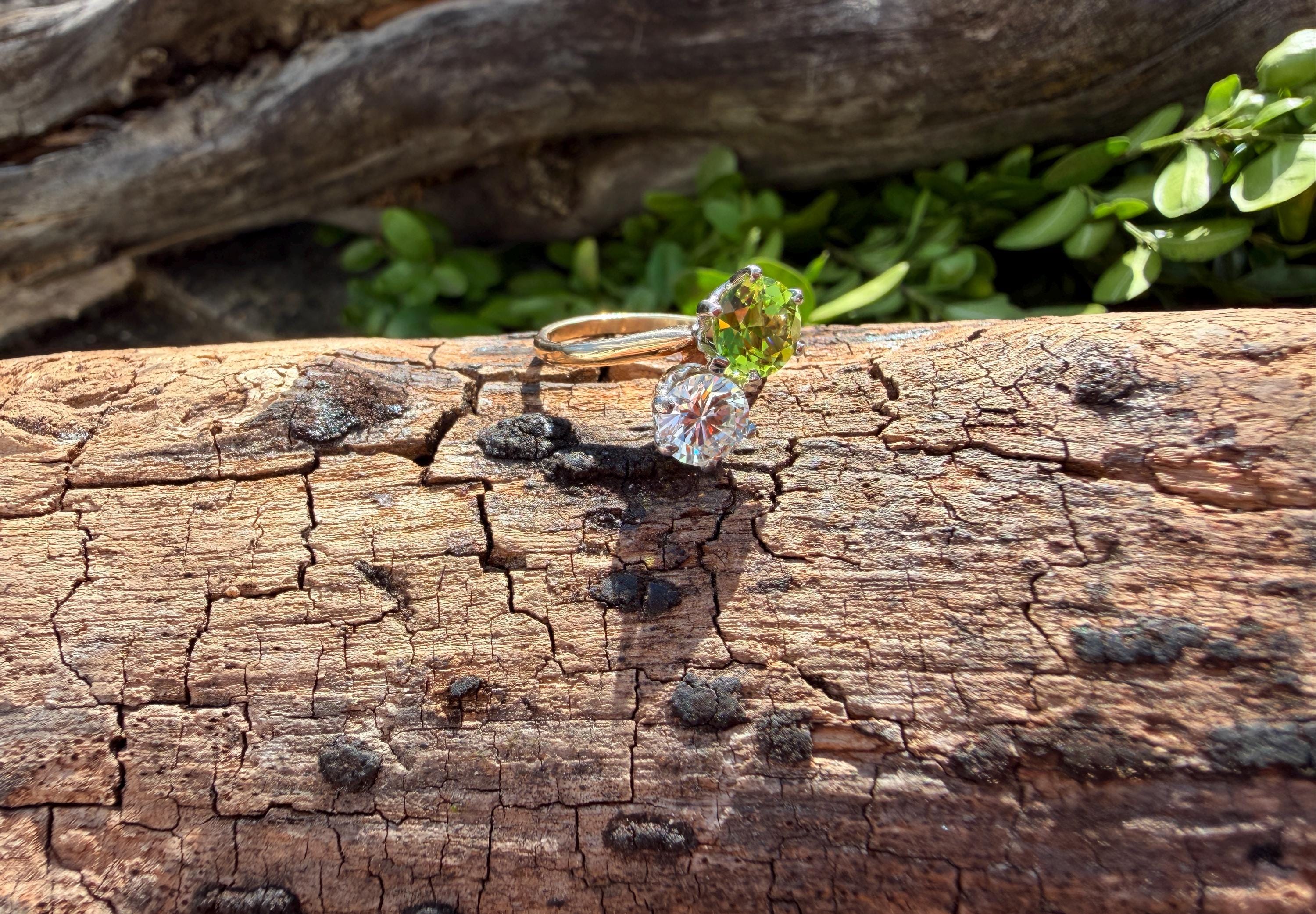 Enchanting with its style and flair, this 1940s diamond and peridot moi et toi ring dates from the late 1940’s. Set in 14k yellow gold, the design features a diagonally set round cut diamond paired with a vibrant lime colored round peridot. The diamond weighs approx. 1.00 ct. The diamond is F in color and VS1 in clarity. The peridot weighs approximately. .85 ct. Wear it as an alternative engagement ring or an every day ring. This ring makes a statement with quite elegance.. The ring will fit a size 5 1/2 finger. It sits 1/4" off the finger. It weighs 2.97 grams. It is marked 14k.