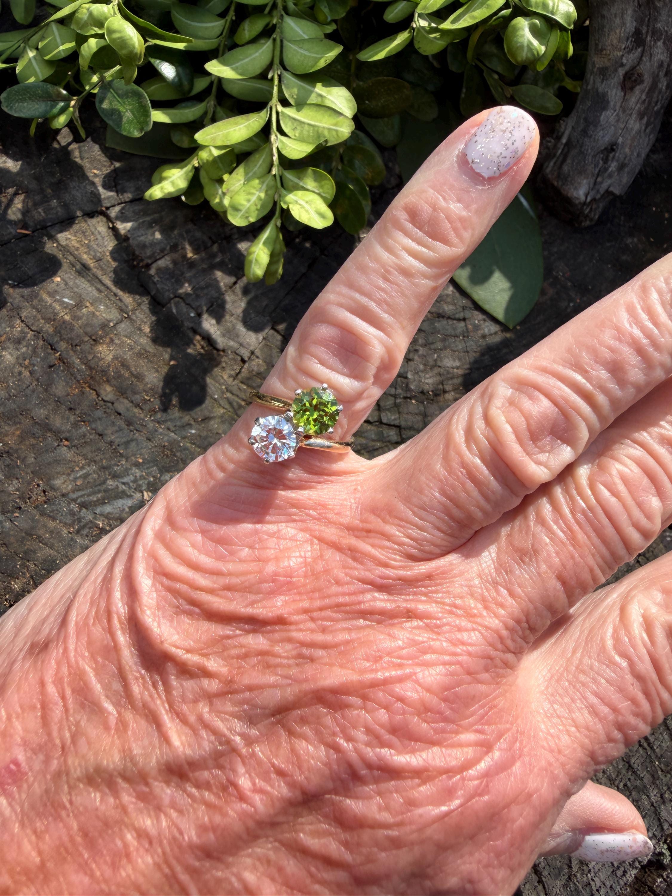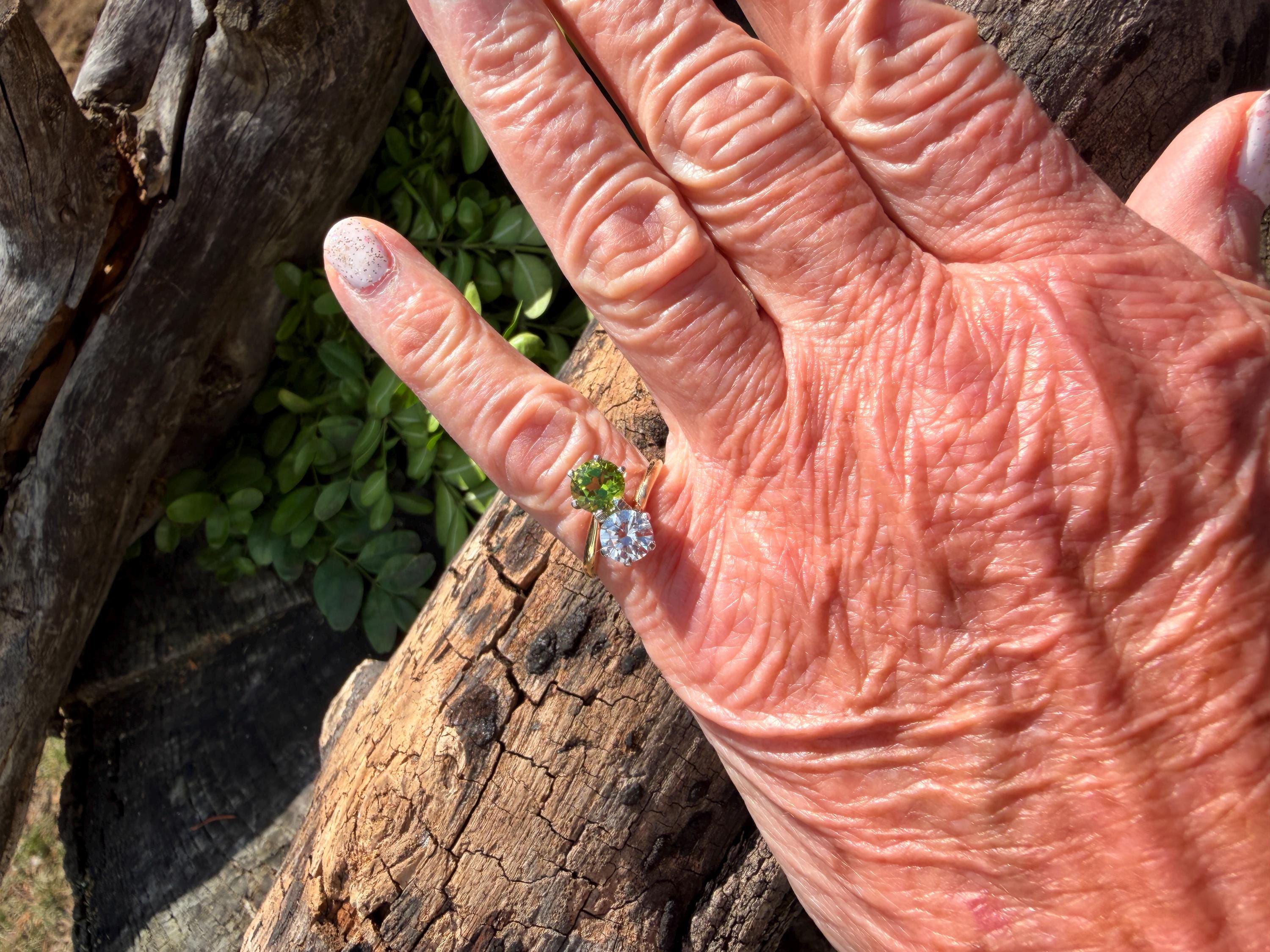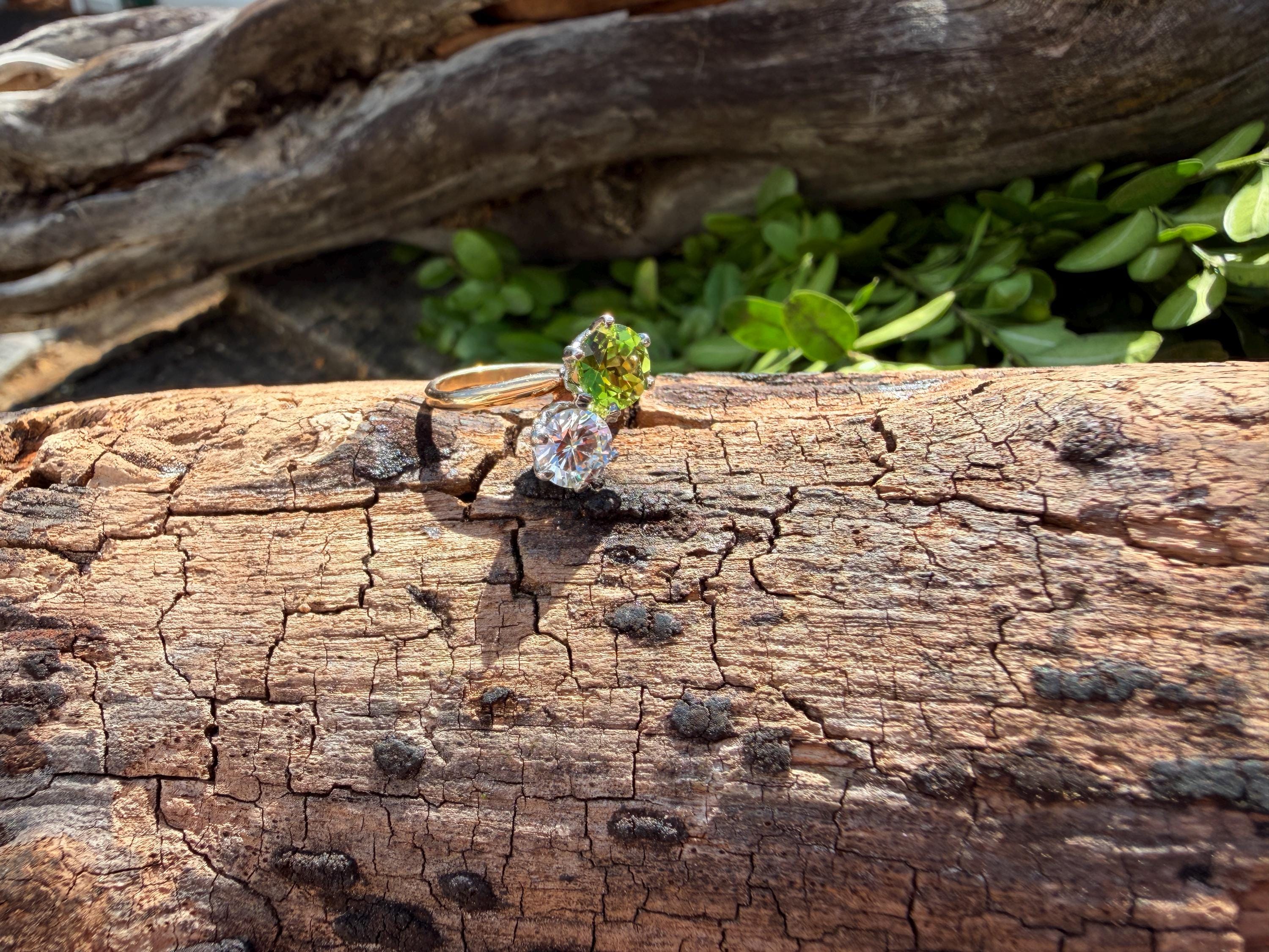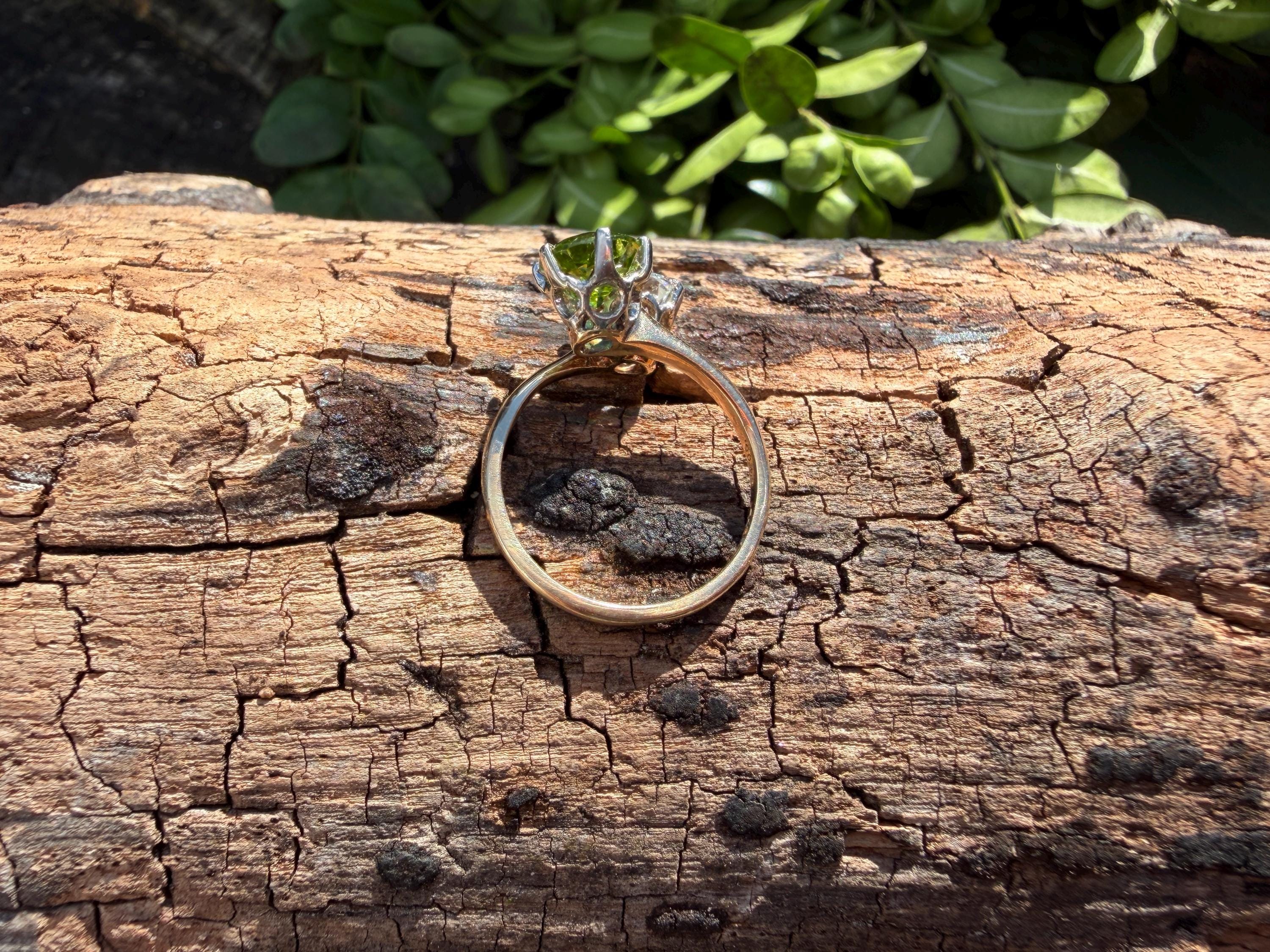 Enchanting with its style and flair, this 1940s diamond and peridot moi et toi ring dates from the late 1940’s. Set in 14k yellow gold, the design features a diagonally set round cut diamond paired with a vibrant lime colored round peridot. The diamond weighs approx. 1.00 ct. The diamond is F in color and VS1 in clarity. The peridot weighs approximately. .85 ct. Wear it as an alternative engagement ring or an every day ring. This ring makes a statement with quite elegance.. The ring will fit a size 5 1/2 finger. It sits 1/4" off the finger. It weighs 2.97 grams. It is marked 14k.