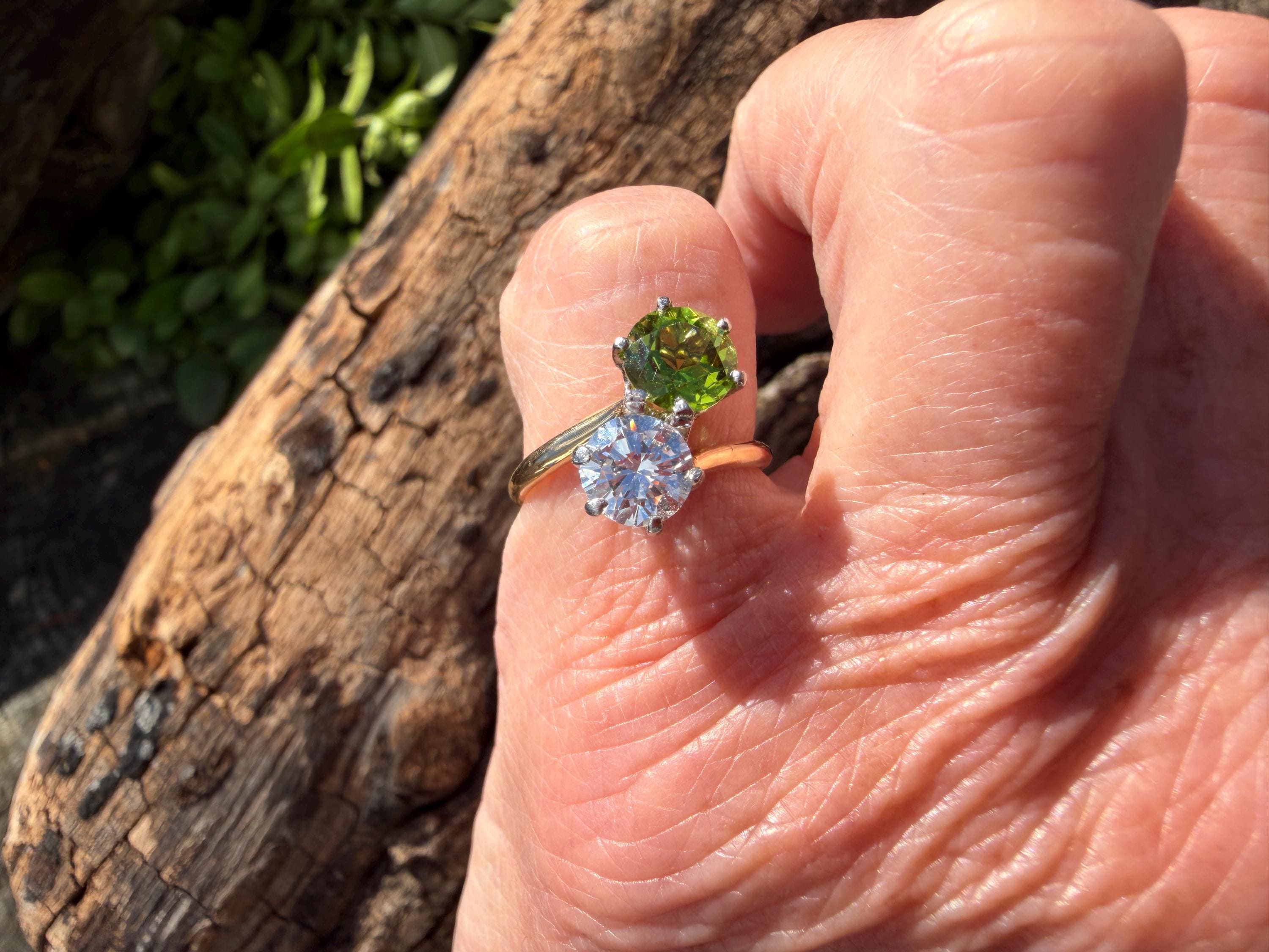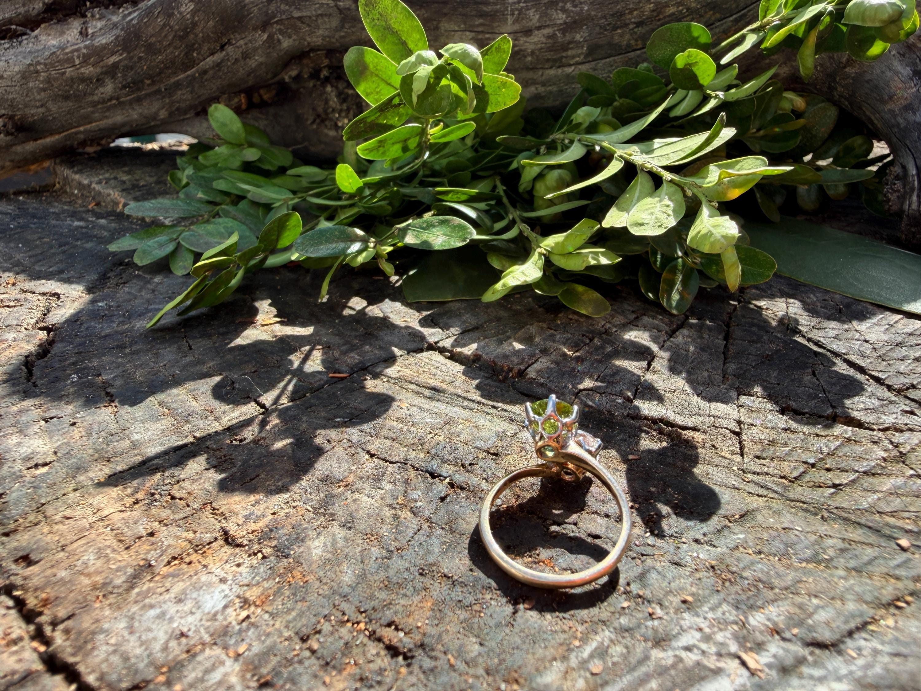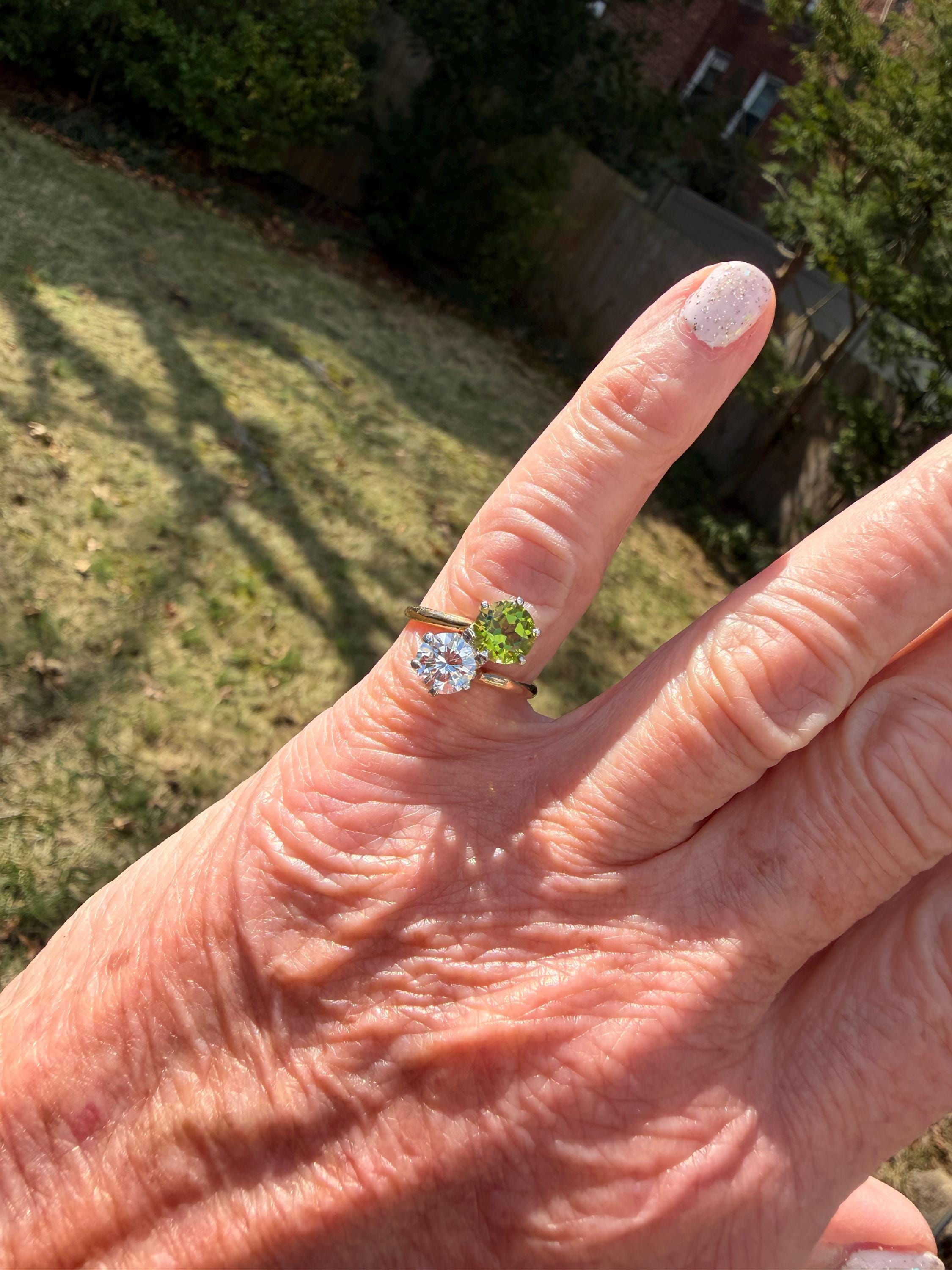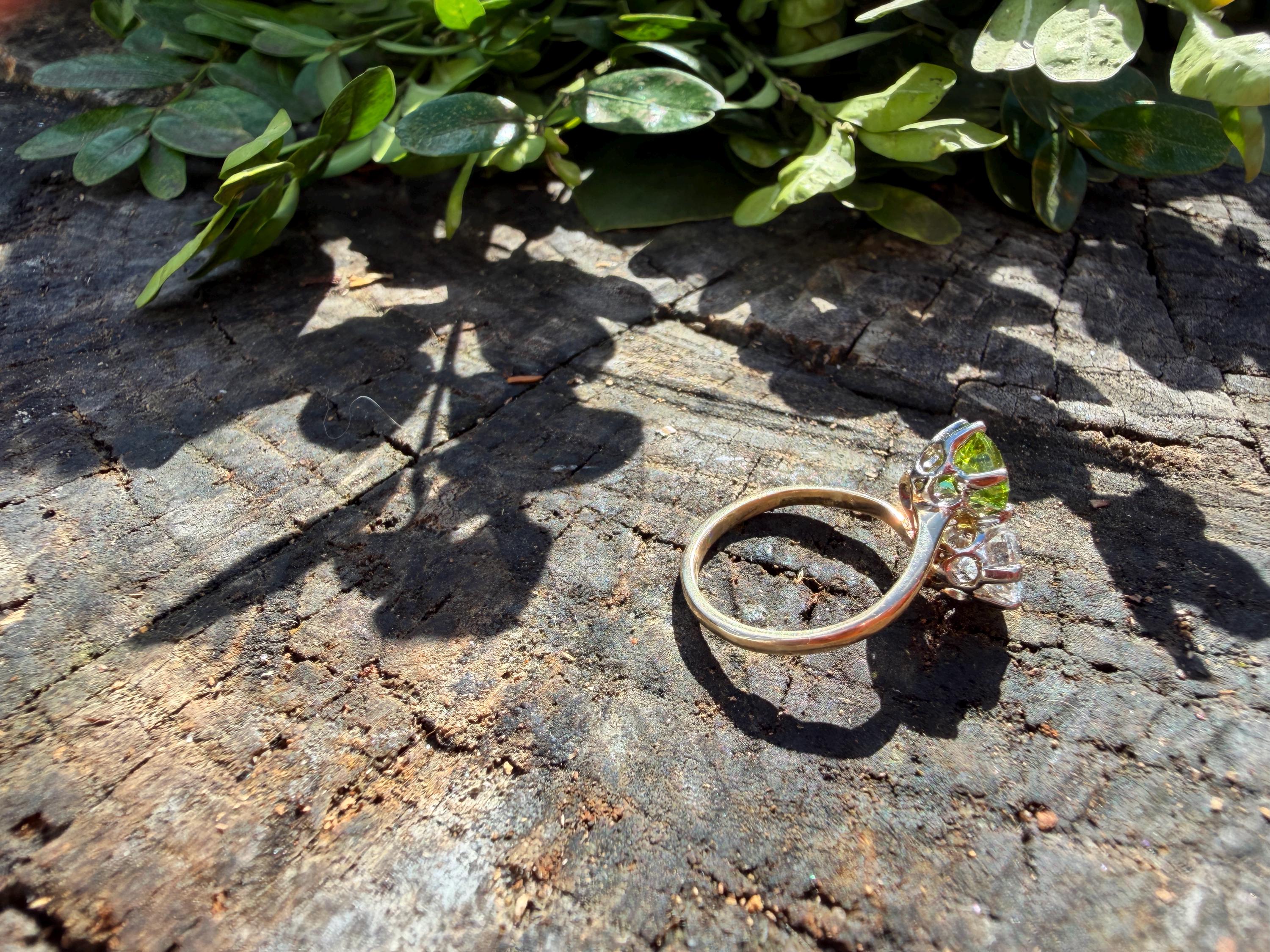 Enchanting with its style and flair, this 1940s diamond and peridot moi et toi ring dates from the late 1940’s. Set in 14k yellow gold, the design features a diagonally set round cut diamond paired with a vibrant lime colored round peridot. The diamond weighs approx. 1.00 ct. The diamond is F in color and VS1 in clarity. The peridot weighs approximately. .85 ct. Wear it as an alternative engagement ring or an every day ring. This ring makes a statement with quite elegance.. The ring will fit a size 5 1/2 finger. It sits 1/4" off the finger. It weighs 2.97 grams. It is marked 14k.