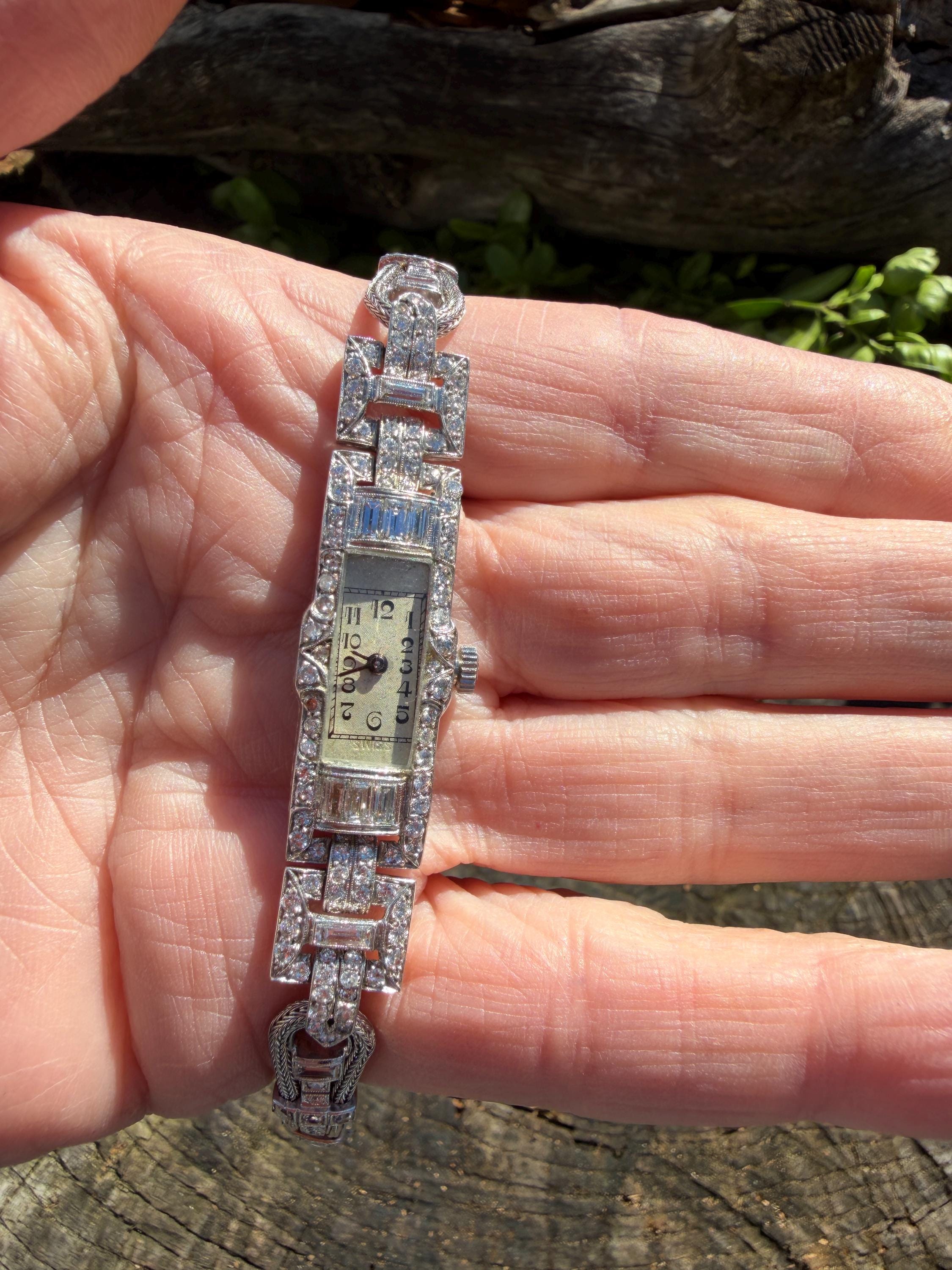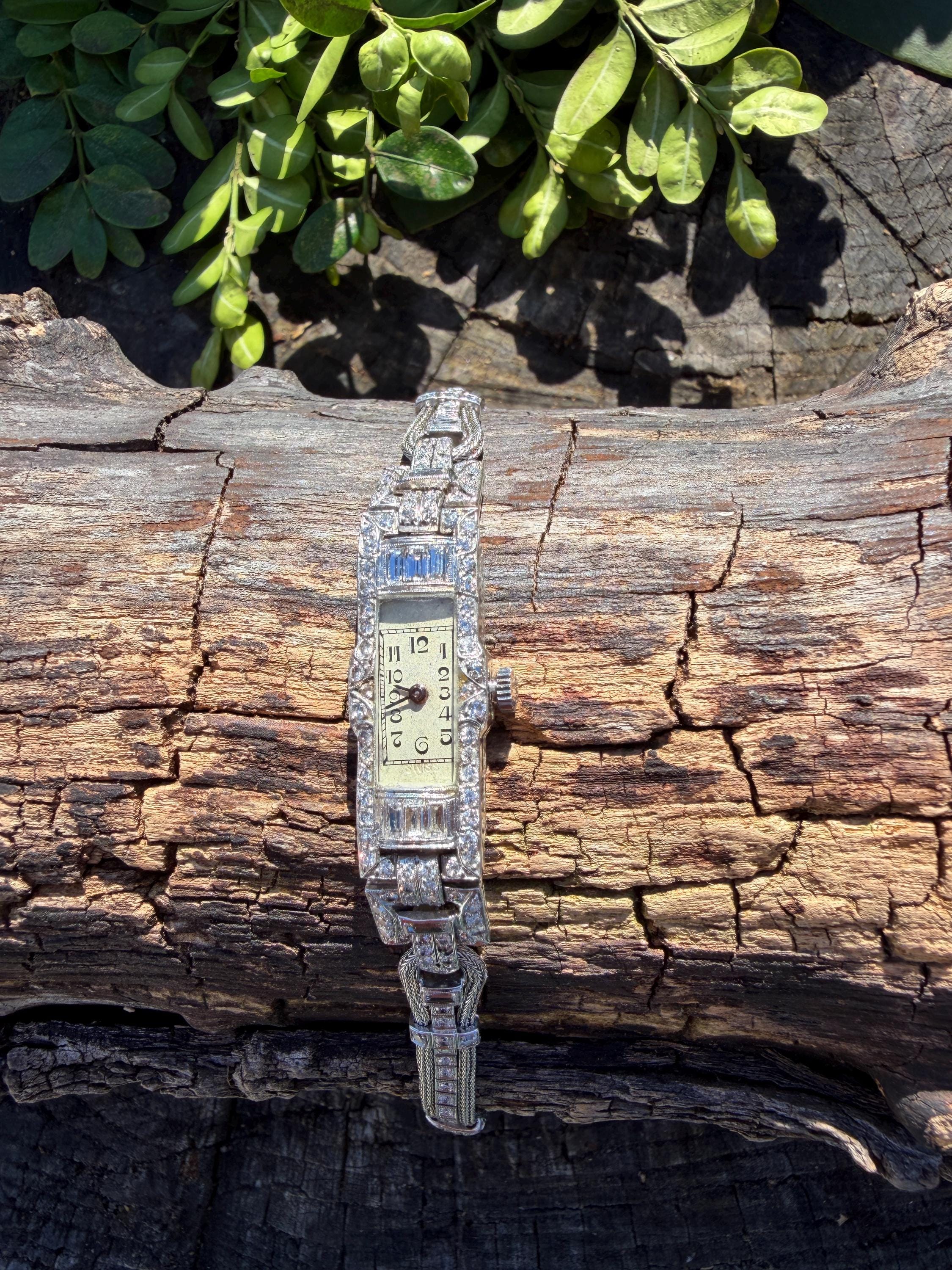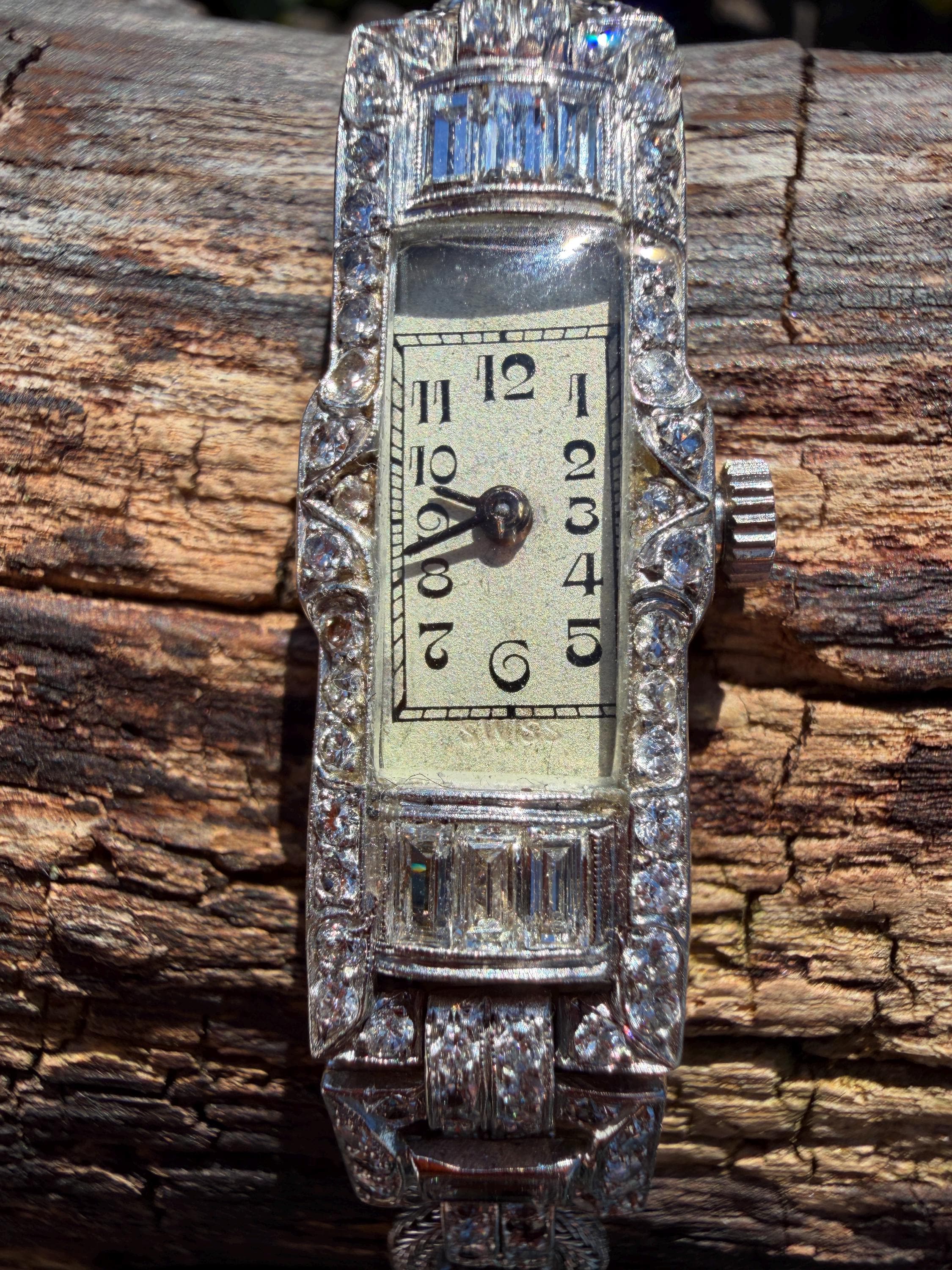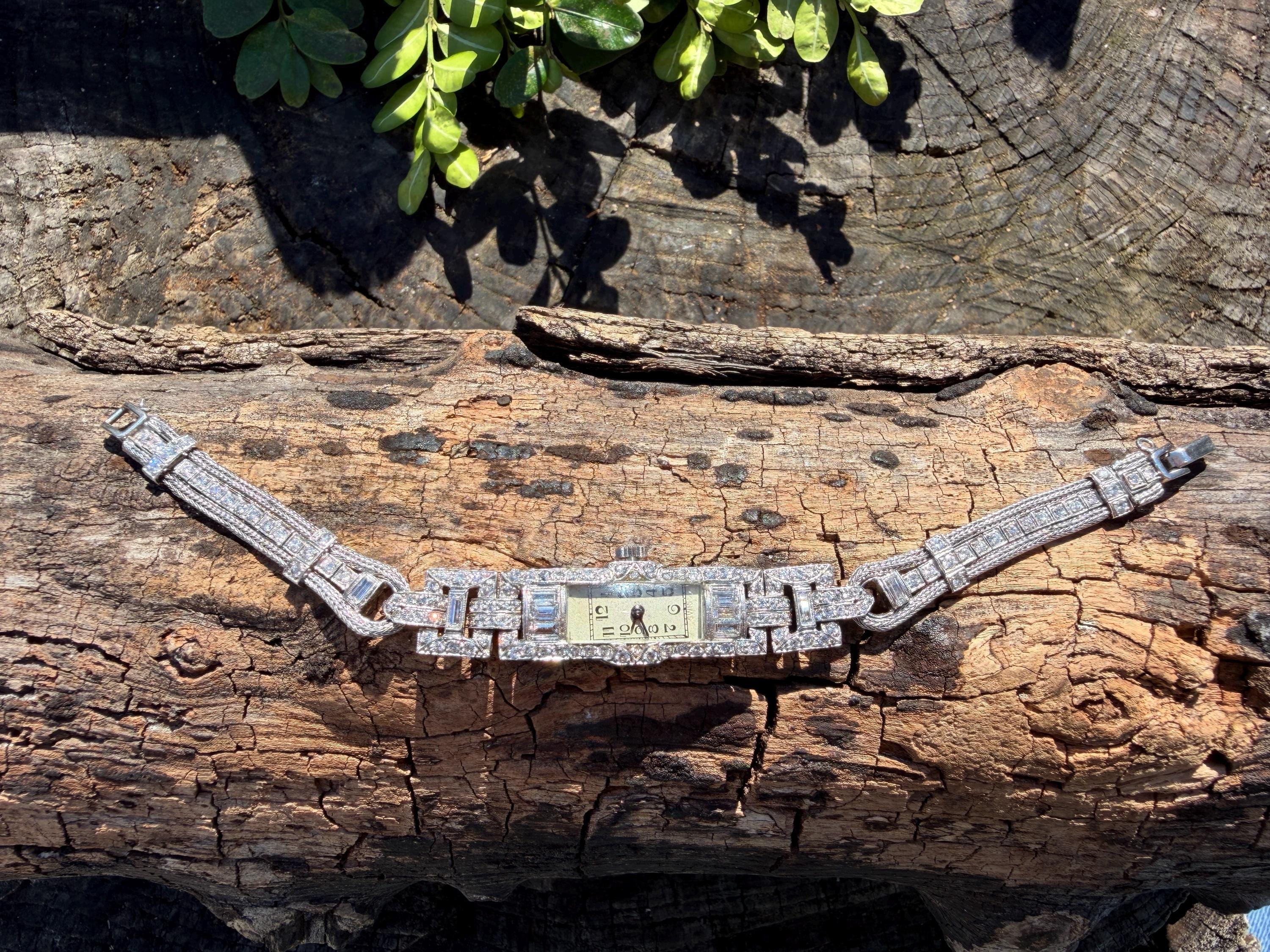 This impassioned art deco diamond watch is set in platinum. It dates from the 1920’s. Its alluring glamorous appeal is generously decorated with approx. 2.75 ct of lively round and baguette diamonds adding to its magnetism. The rectangular face is attached to a diamond studded band for maximum bling. The color of the diamonds are all H and the clarity is VS2. The allure is that it is much more than a timepiece. The watch measures 6 1/2 ". The face measures 2" x 1/2" (including the attached diamond pieces). The bracelet width is 1/4". It weighs 27.33 grams. The watch is in excellent working order. The back of the case has a couple of small dings.