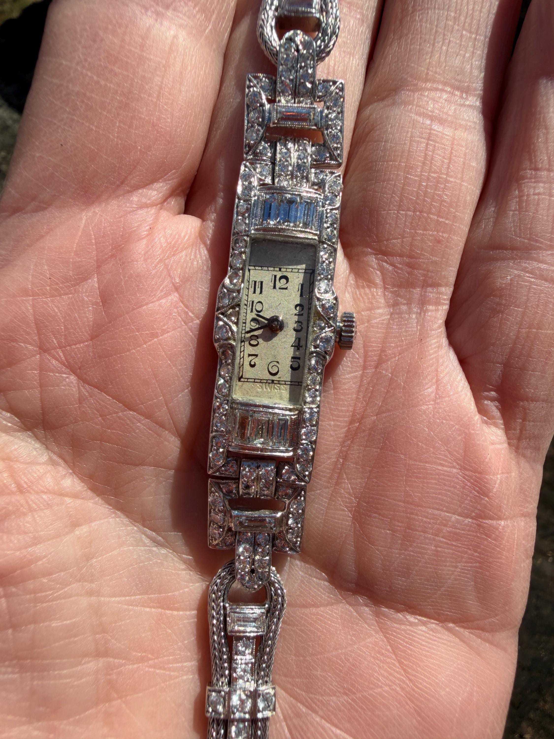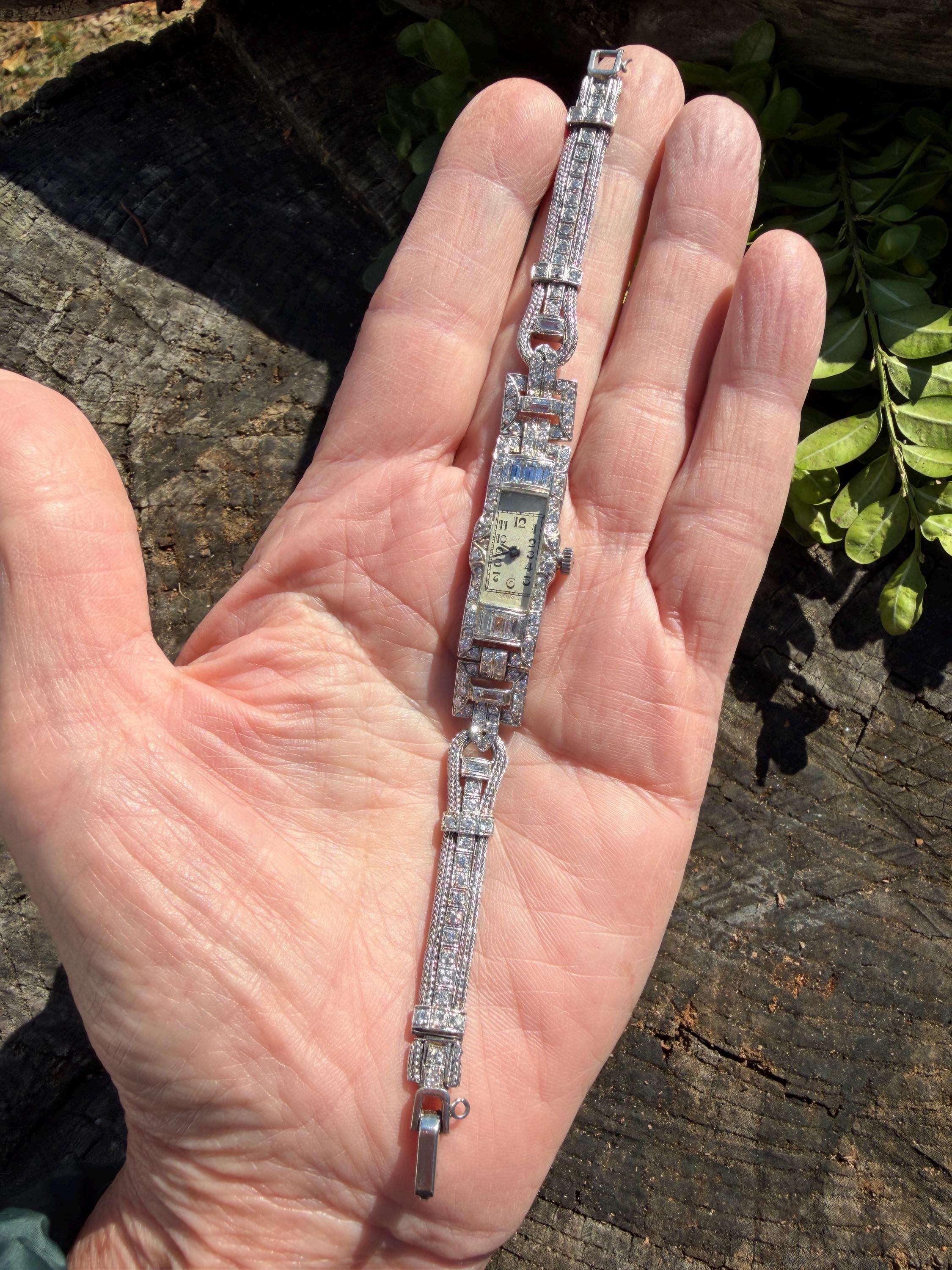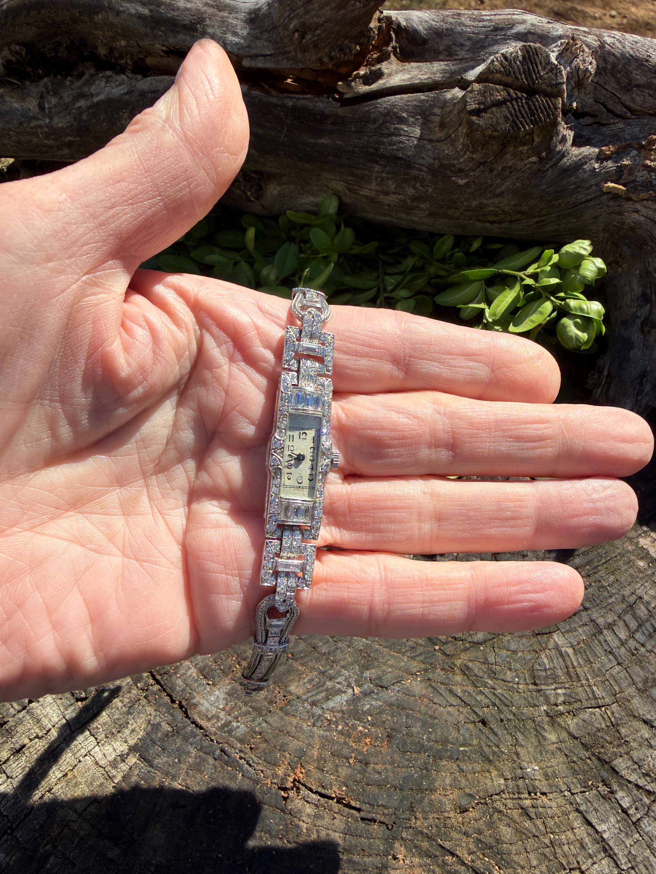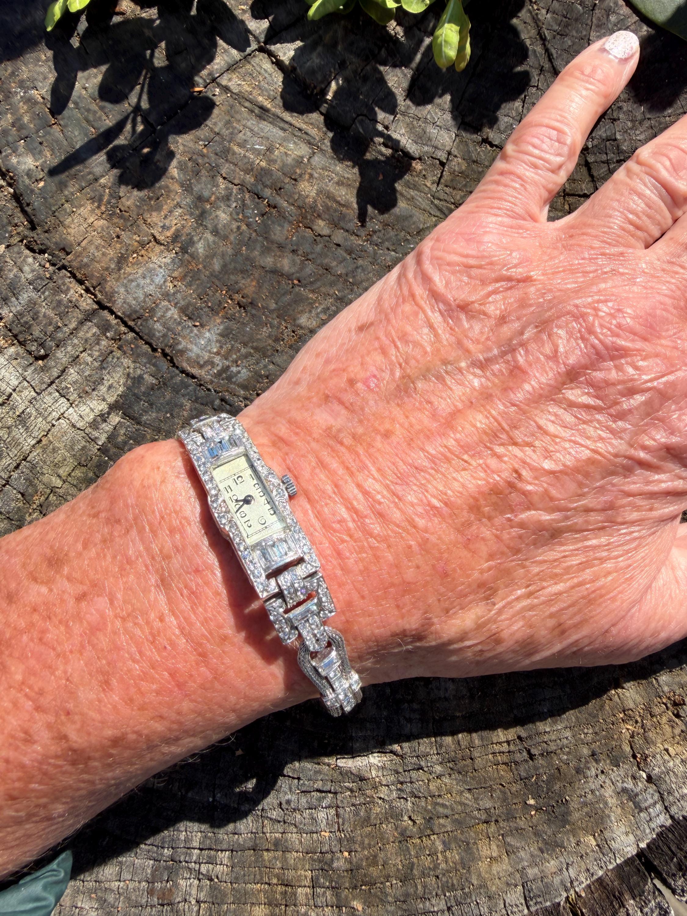 This impassioned art deco diamond watch is set in platinum. It dates from the 1920’s. Its alluring glamorous appeal is generously decorated with approx. 2.75 ct of lively round and baguette diamonds adding to its magnetism. The rectangular face is attached to a diamond studded band for maximum bling. The color of the diamonds are all H and the clarity is VS2. The allure is that it is much more than a timepiece. The watch measures 6 1/2 ". The face measures 2" x 1/2" (including the attached diamond pieces). The bracelet width is 1/4". It weighs 27.33 grams. The watch is in excellent working order. The back of the case has a couple of small dings.