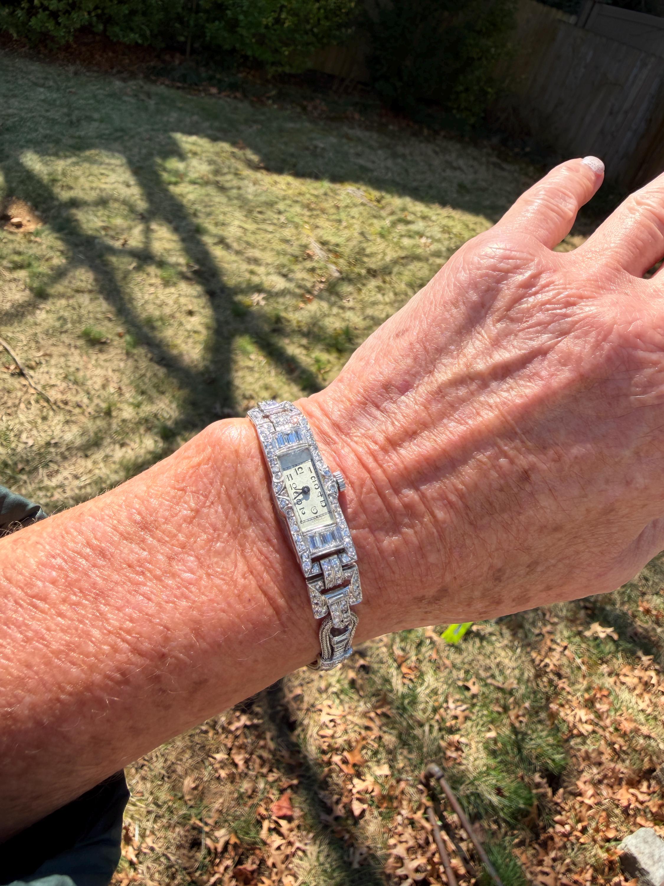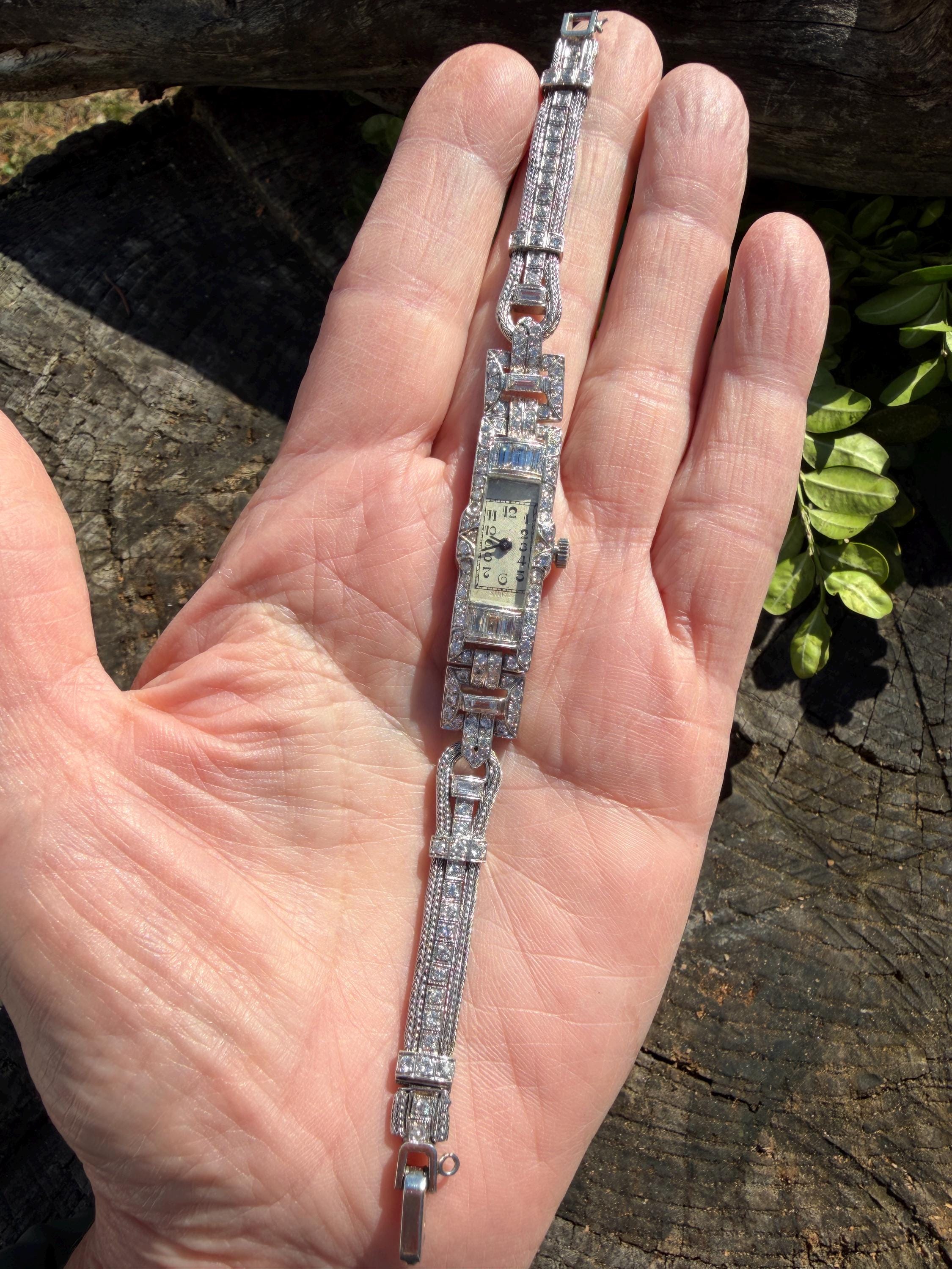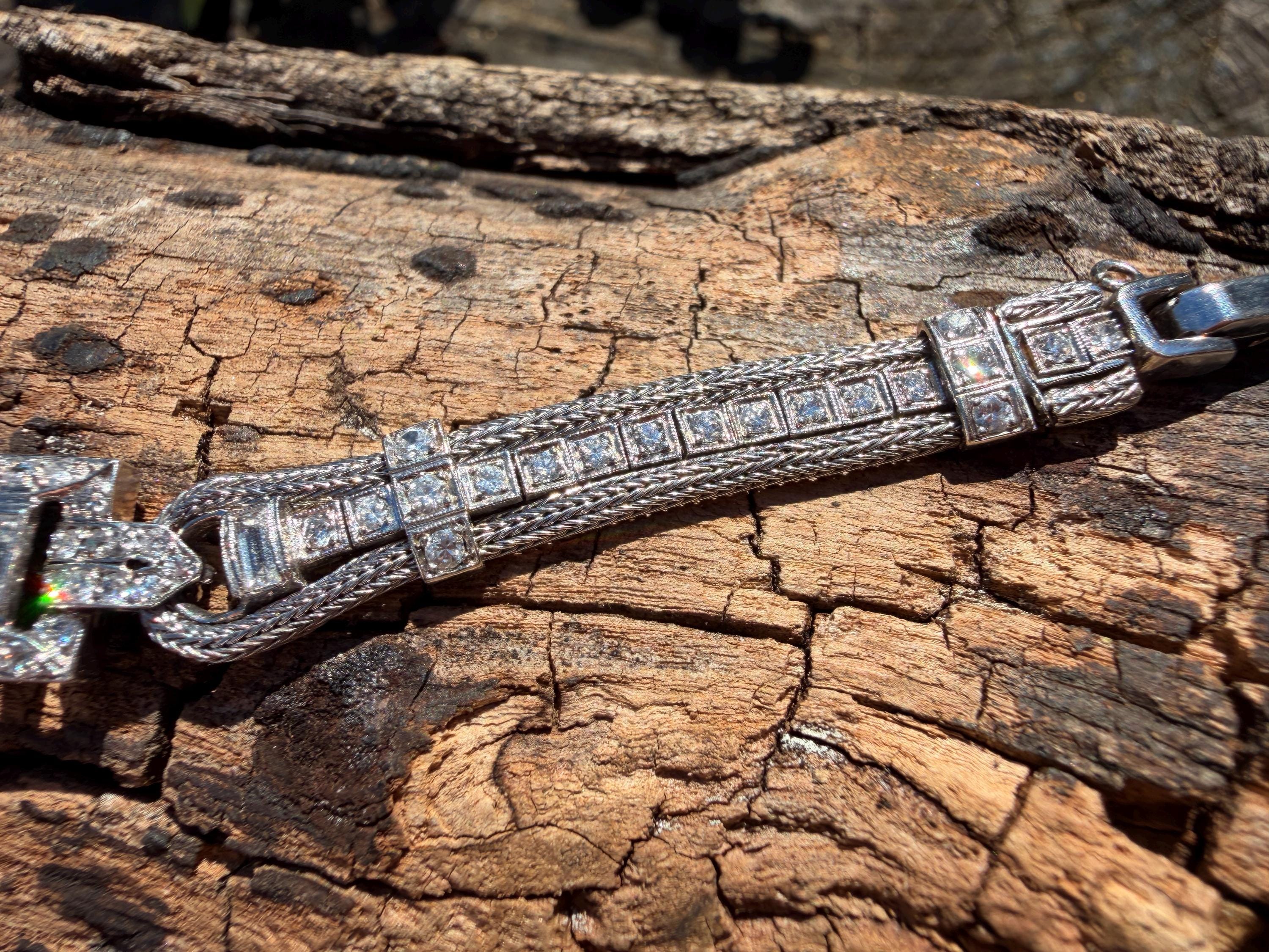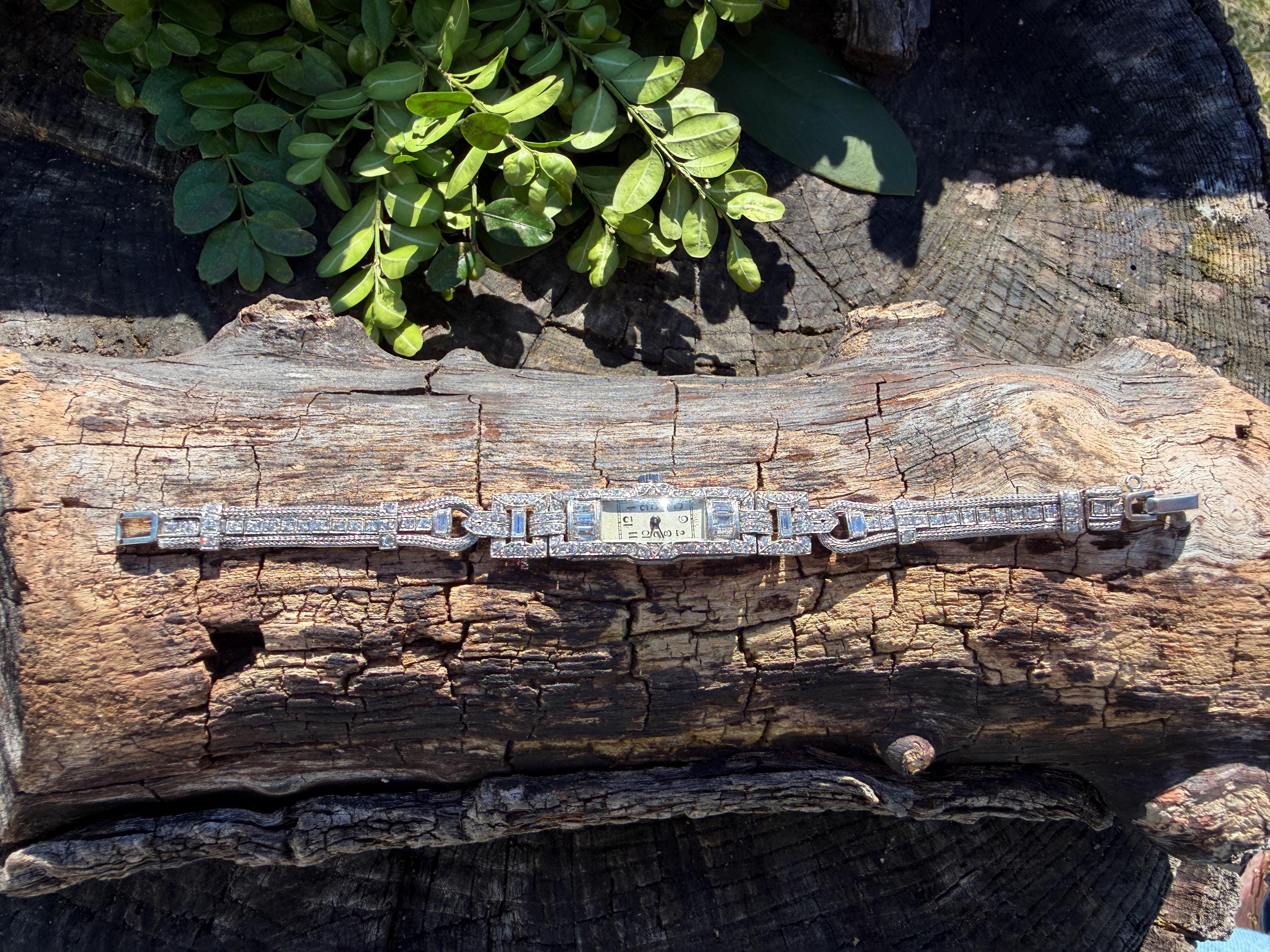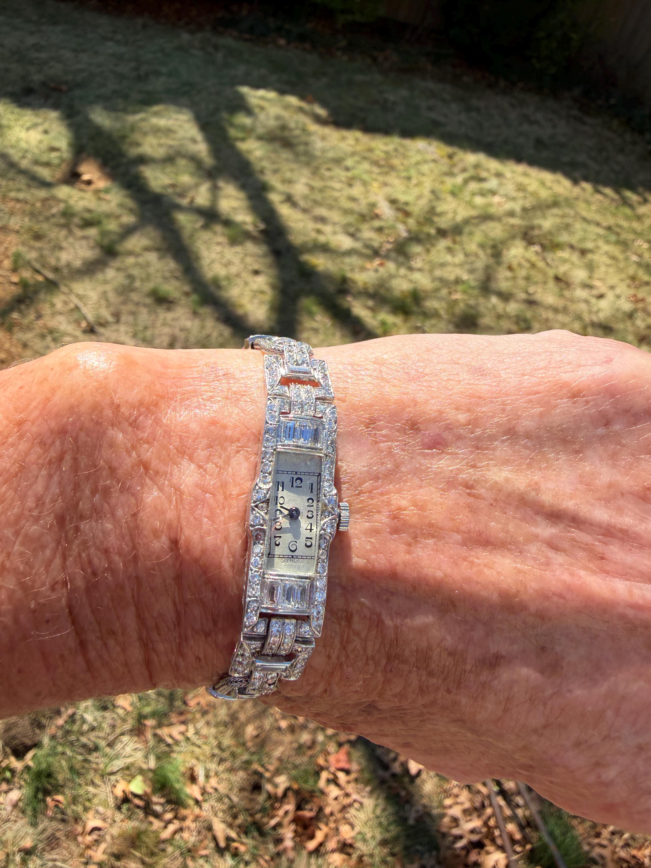 This impassioned art deco diamond watch is set in platinum. It dates from the 1920’s. Its alluring glamorous appeal is generously decorated with approx. 2.75 ct of lively round and baguette diamonds adding to its magnetism. The rectangular face is attached to a diamond studded band for maximum bling. The color of the diamonds are all H and the clarity is VS2. The allure is that it is much more than a timepiece. The watch measures 6 1/2 ". The face measures 2" x 1/2" (including the attached diamond pieces). The bracelet width is 1/4". It weighs 27.33 grams. The watch is in excellent working order. The back of the case has a couple of small dings.