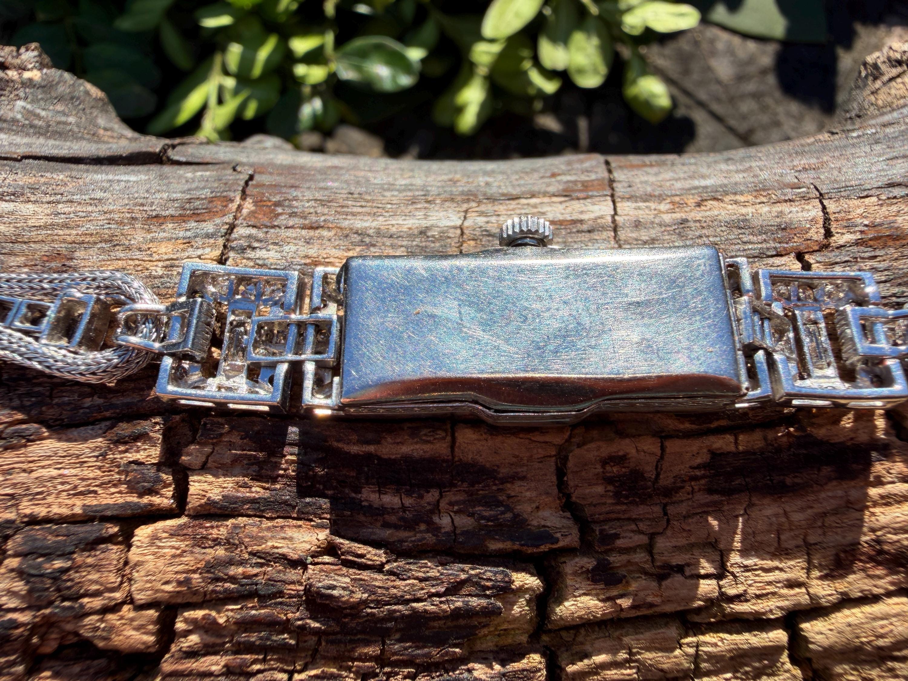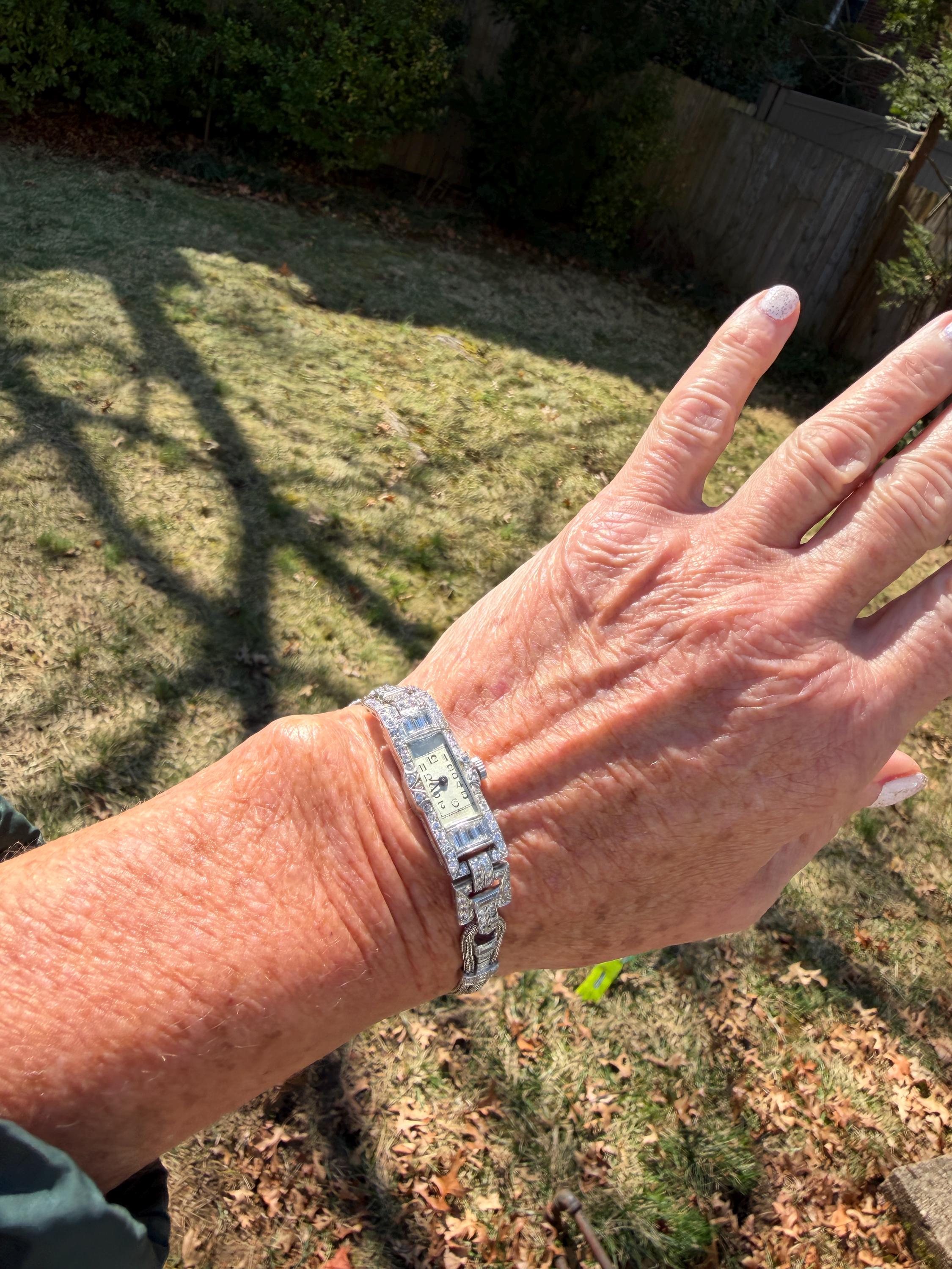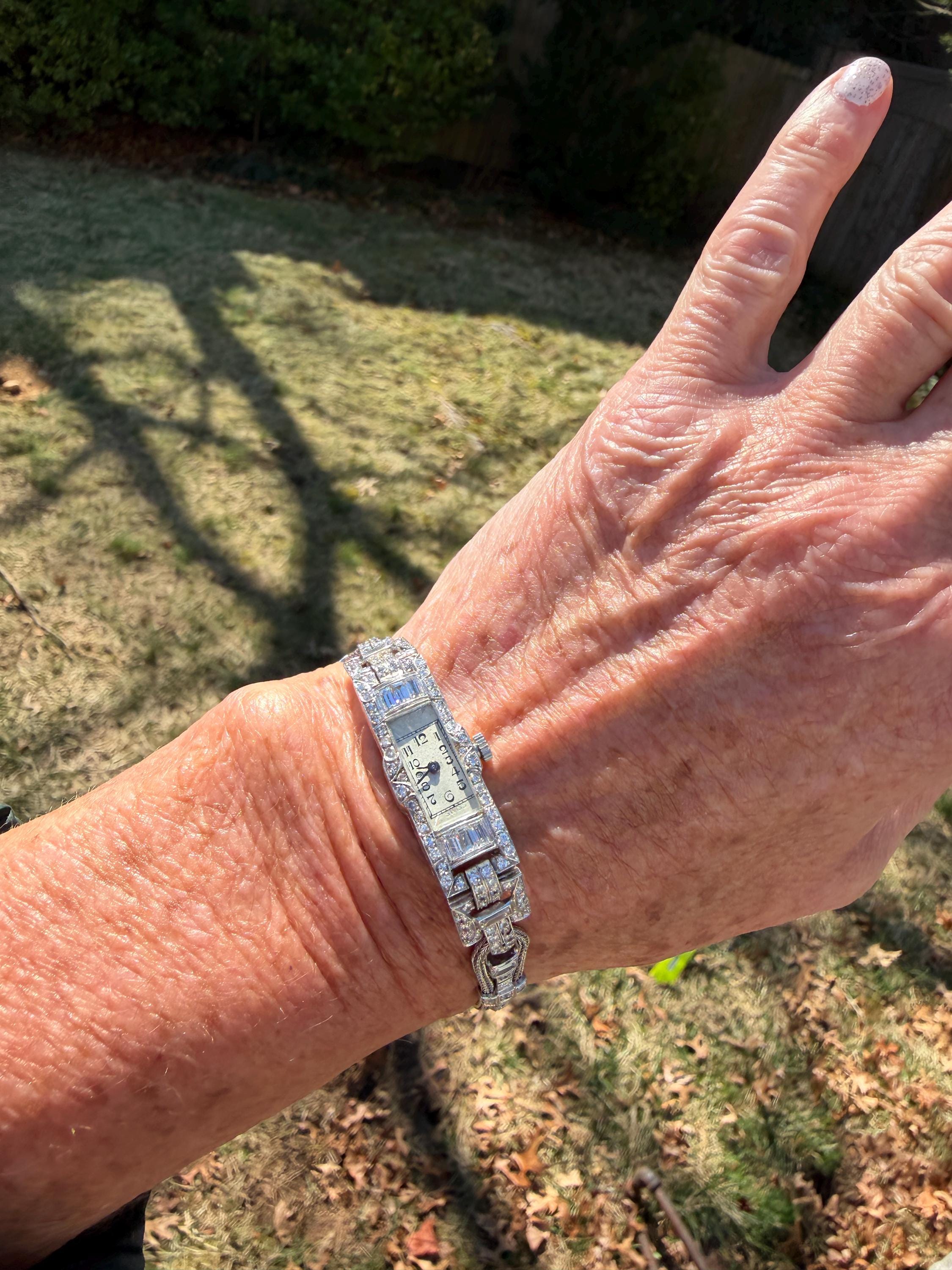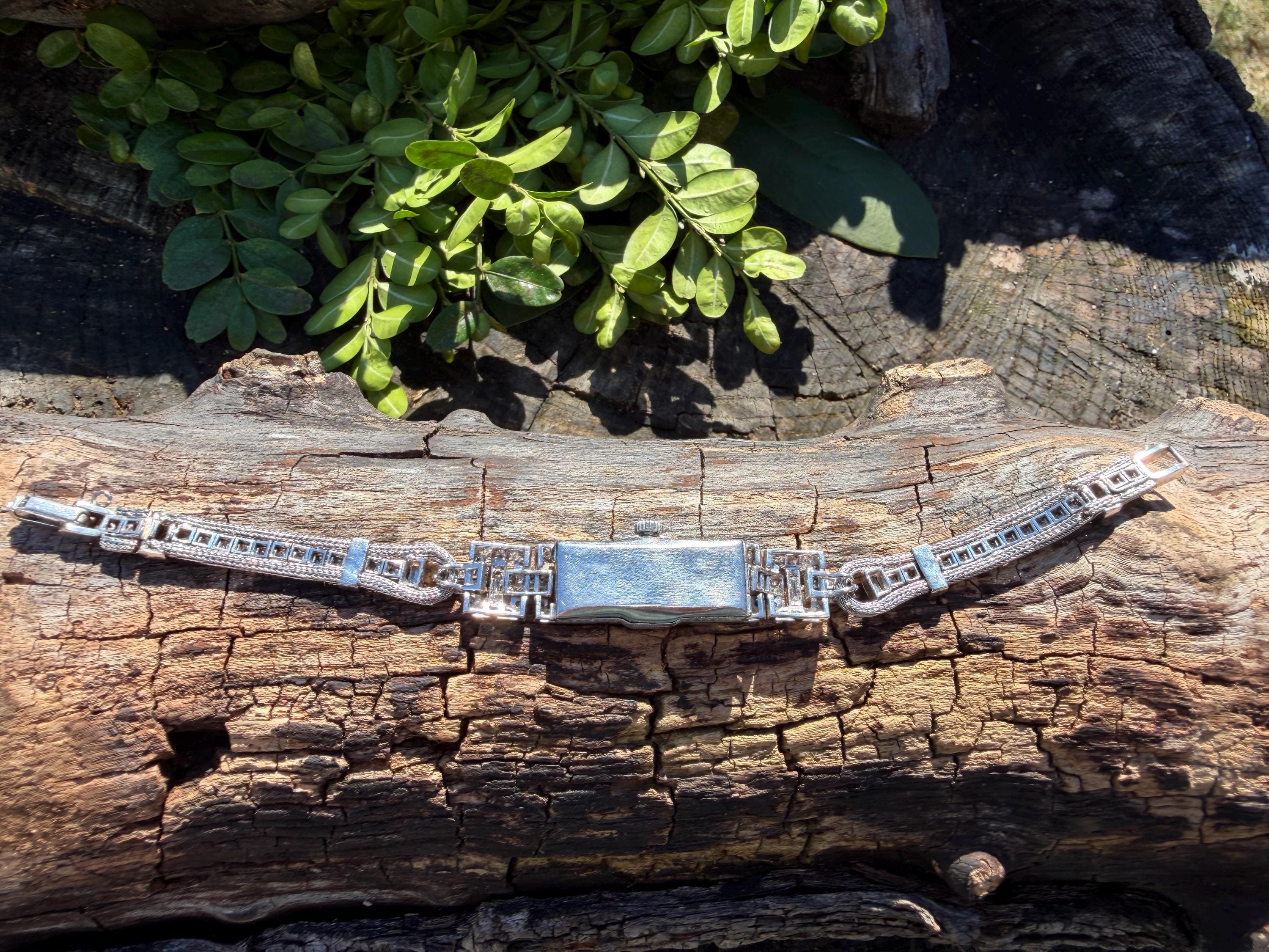 This impassioned art deco diamond watch is set in platinum. It dates from the 1920’s. Its alluring glamorous appeal is generously decorated with approx. 2.75 ct of lively round and baguette diamonds adding to its magnetism. The rectangular face is attached to a diamond studded band for maximum bling. The color of the diamonds are all H and the clarity is VS2. The allure is that it is much more than a timepiece. The watch measures 6 1/2 ". The face measures 2" x 1/2" (including the attached diamond pieces). The bracelet width is 1/4". It weighs 27.33 grams. The watch is in excellent working order. The back of the case has a couple of small dings.