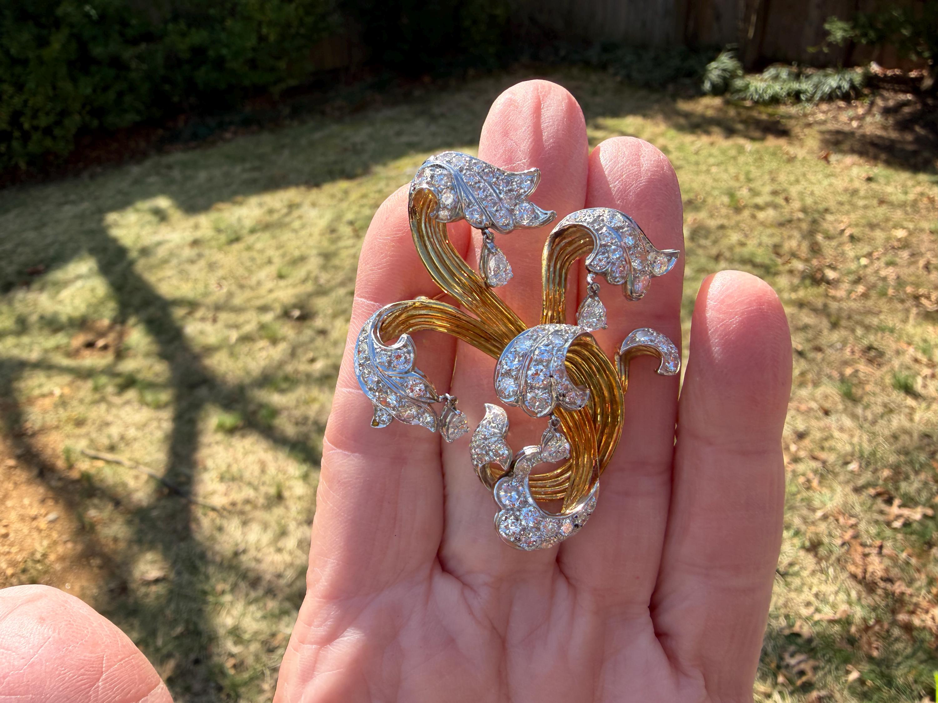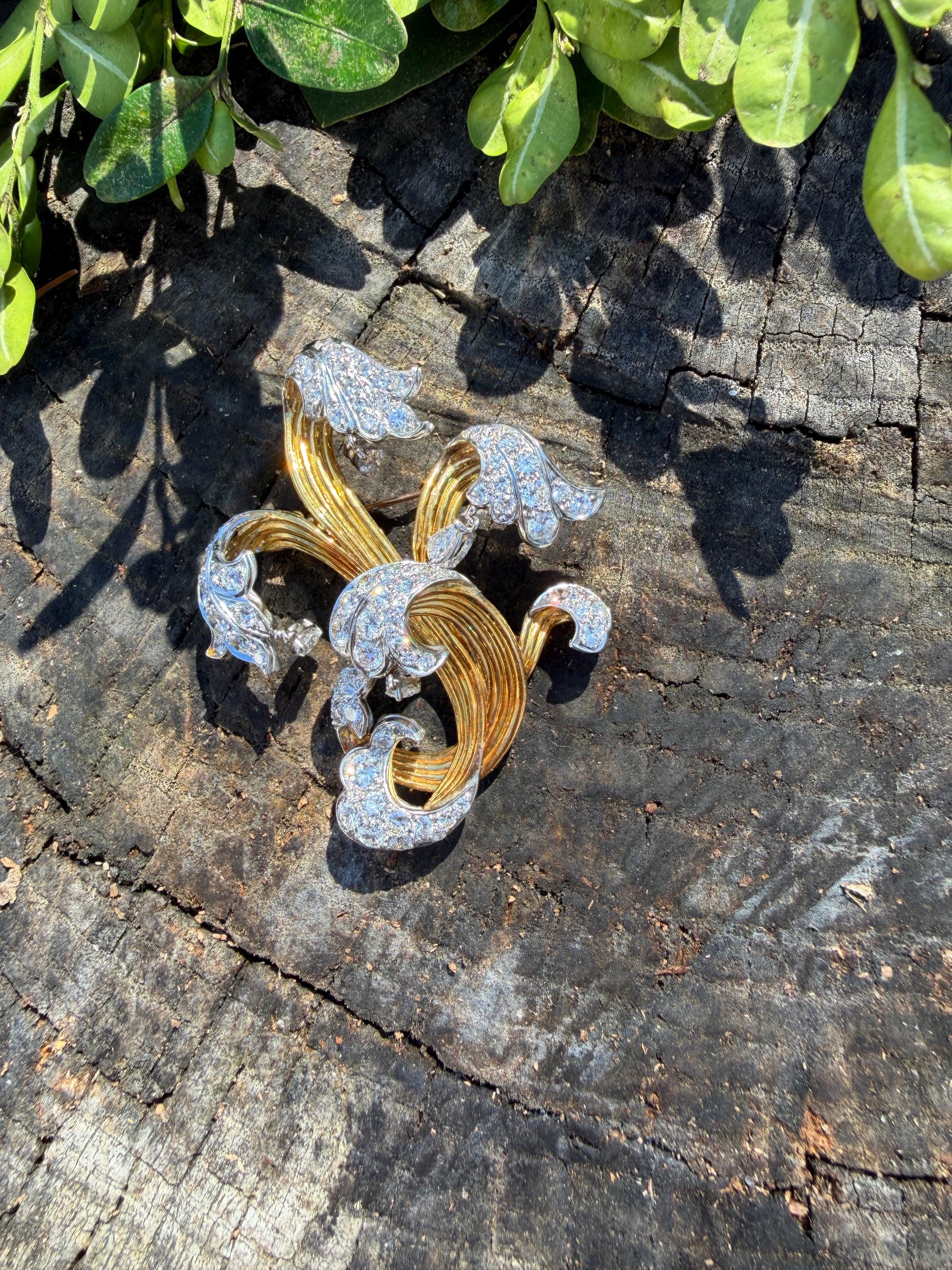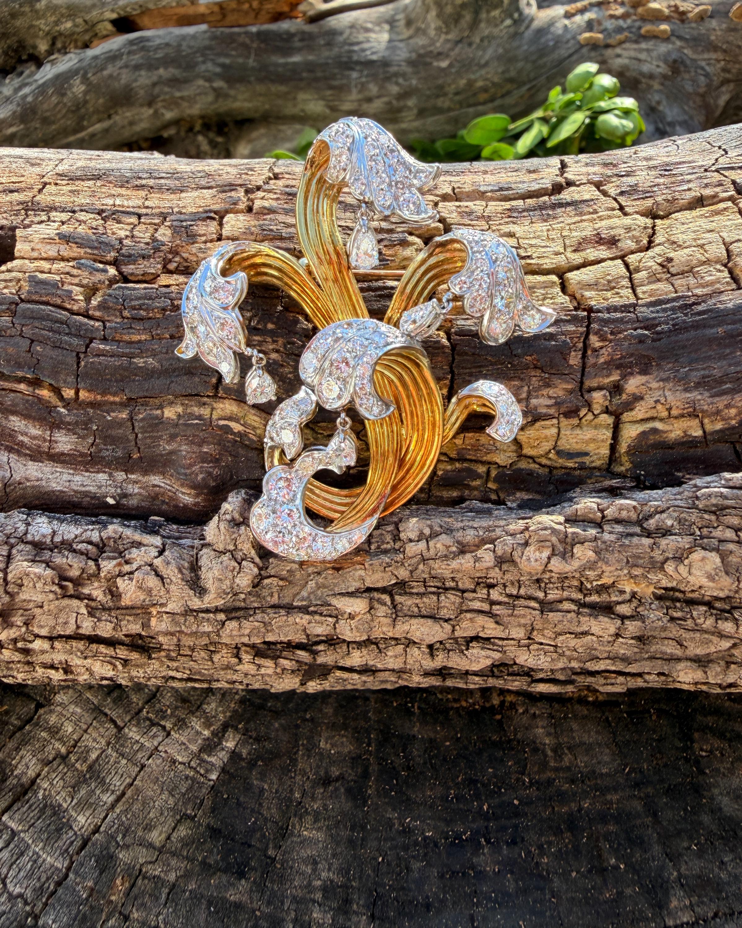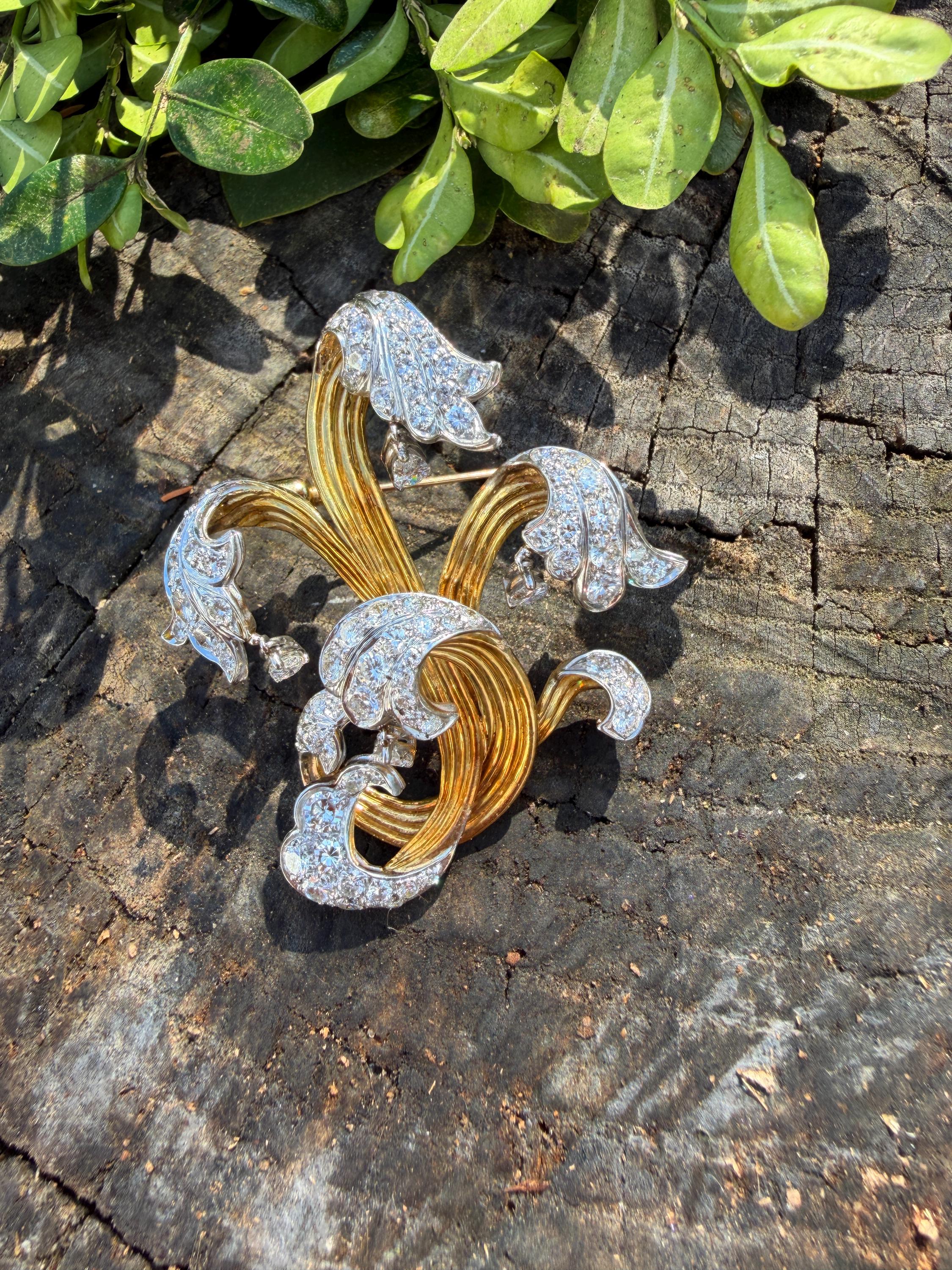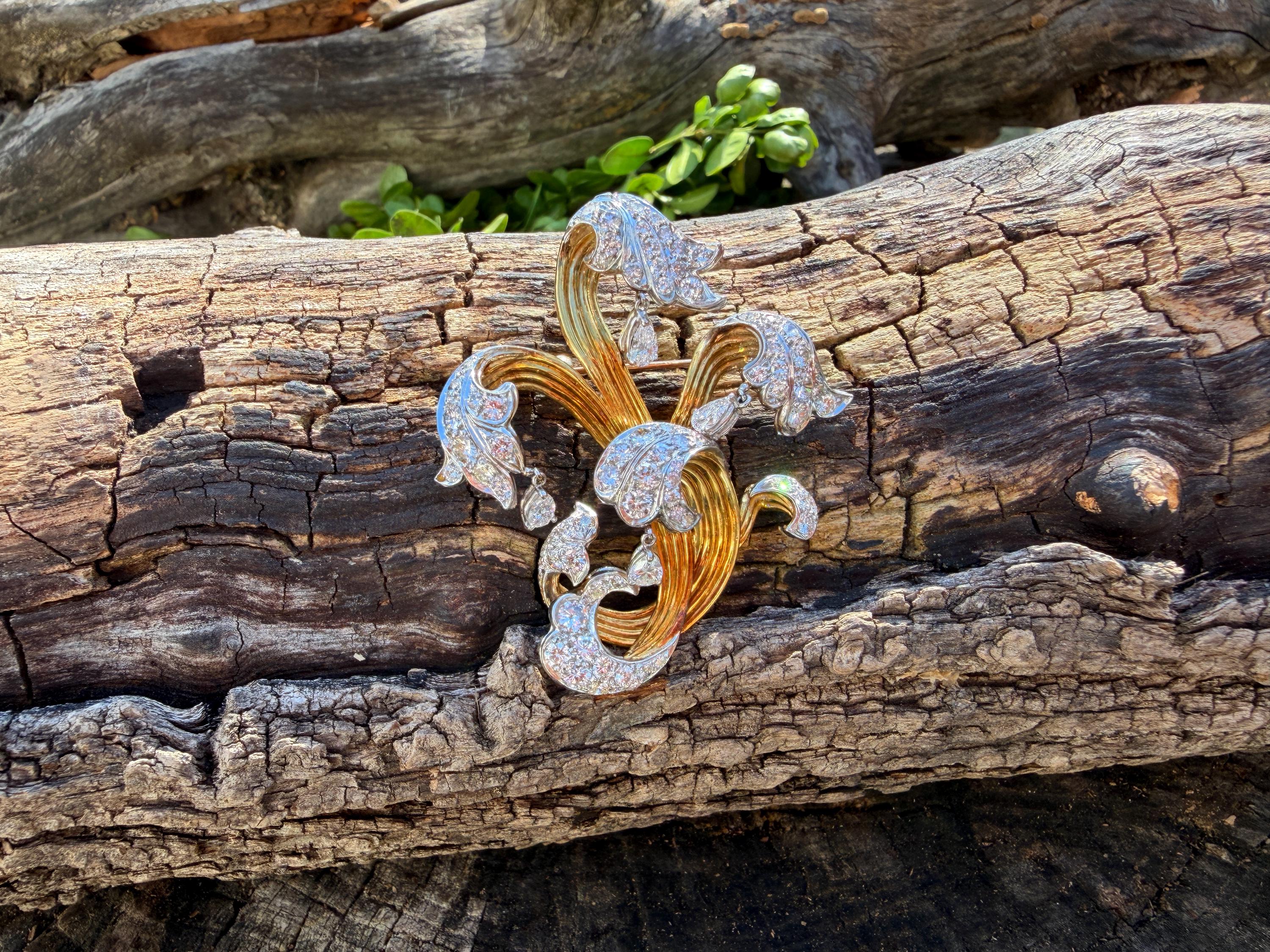 Impressively exquisite, this 1970’s abstract floral spray pin is set in 18k yellow gold. It holds an incandescent dazzle of 5.00 ct of intensely fiery round diamonds. All diamonds are G color and VS1 in clarity. Bearing the weight of the diamonds is a framework of radiant golden strands fused together finishing this look of arresting luxury. It measures 2 1/4" x 1 1/2". It weighs 22 grams. It is marked E Pearl and 18k.