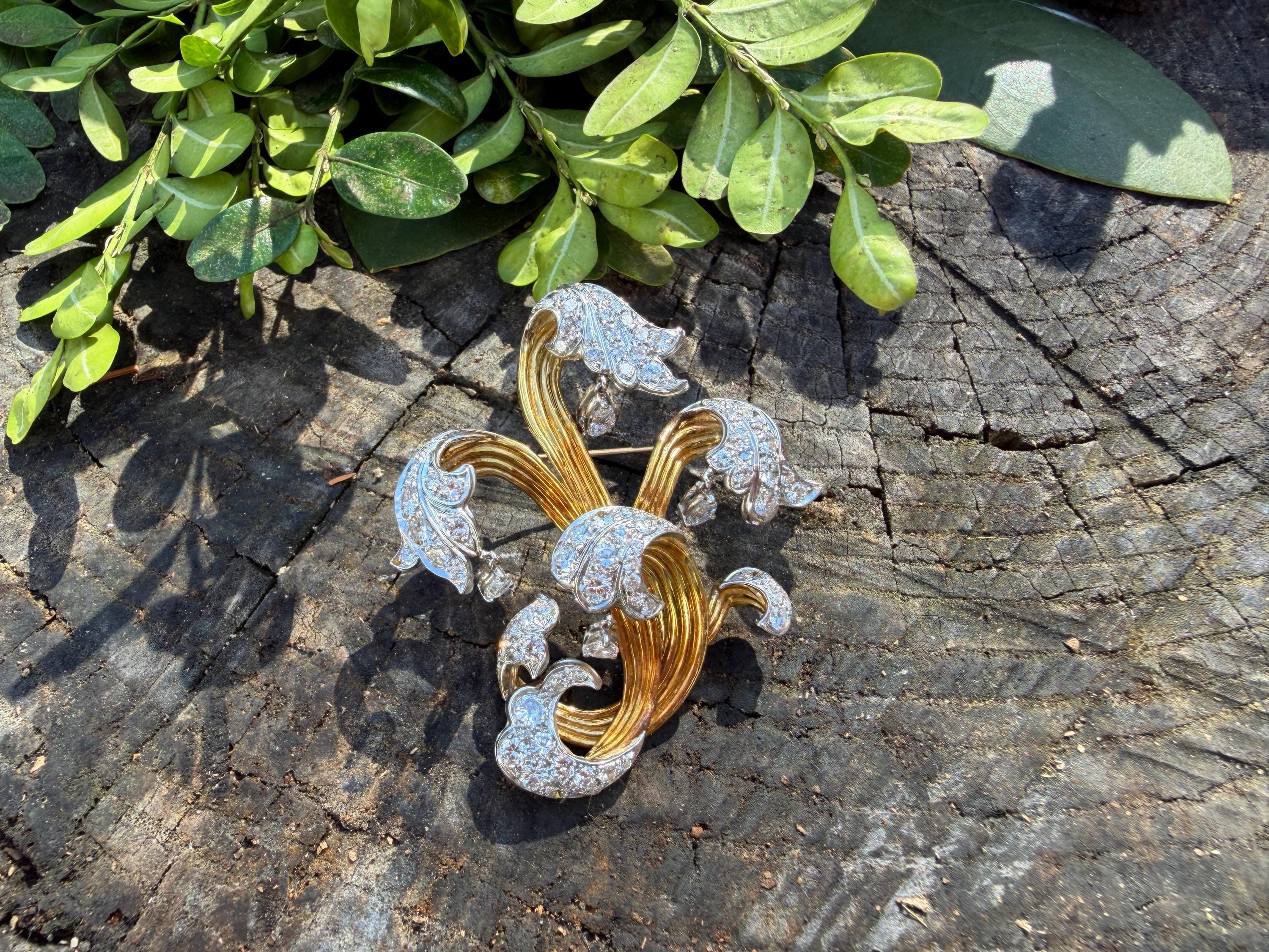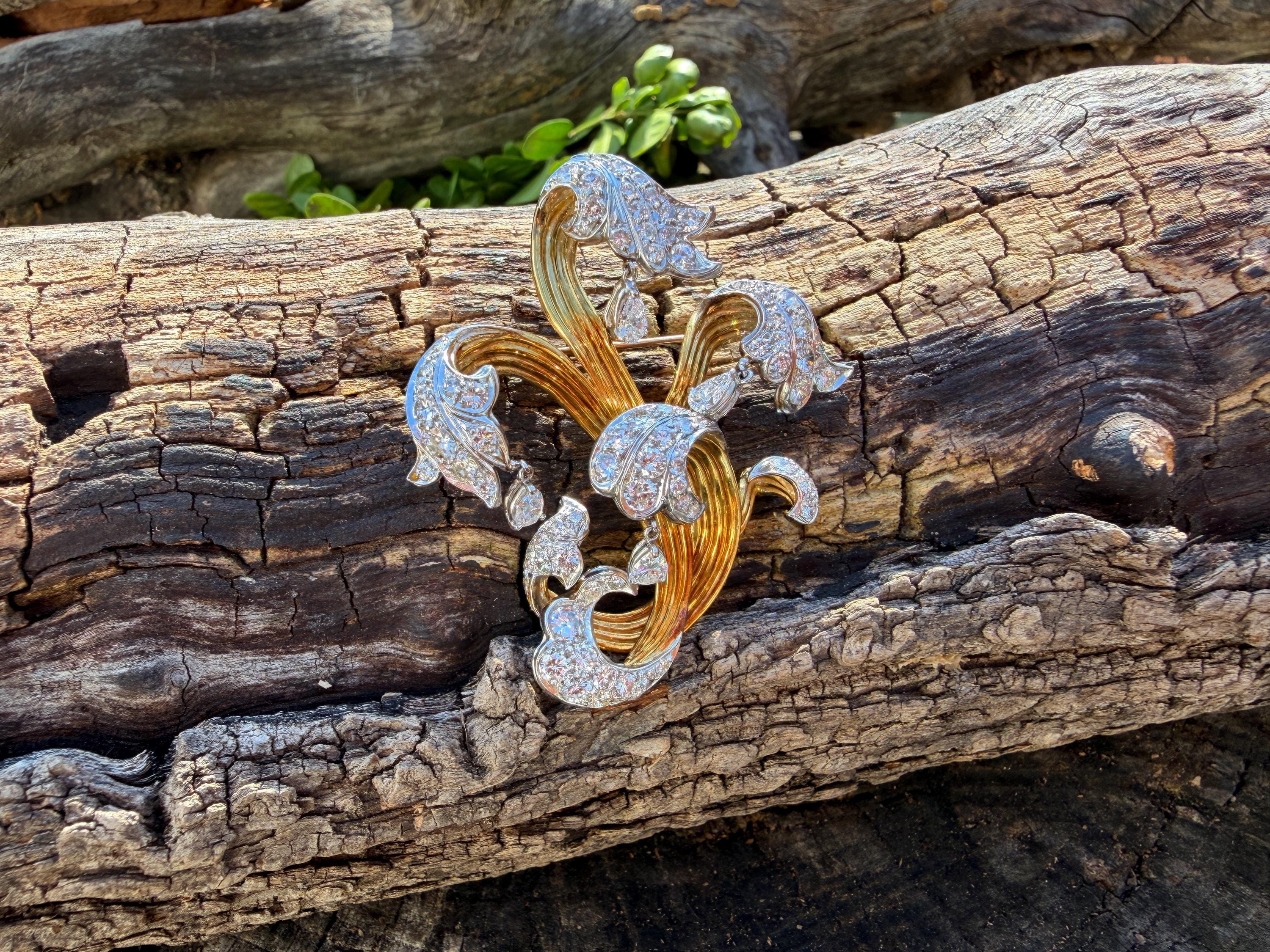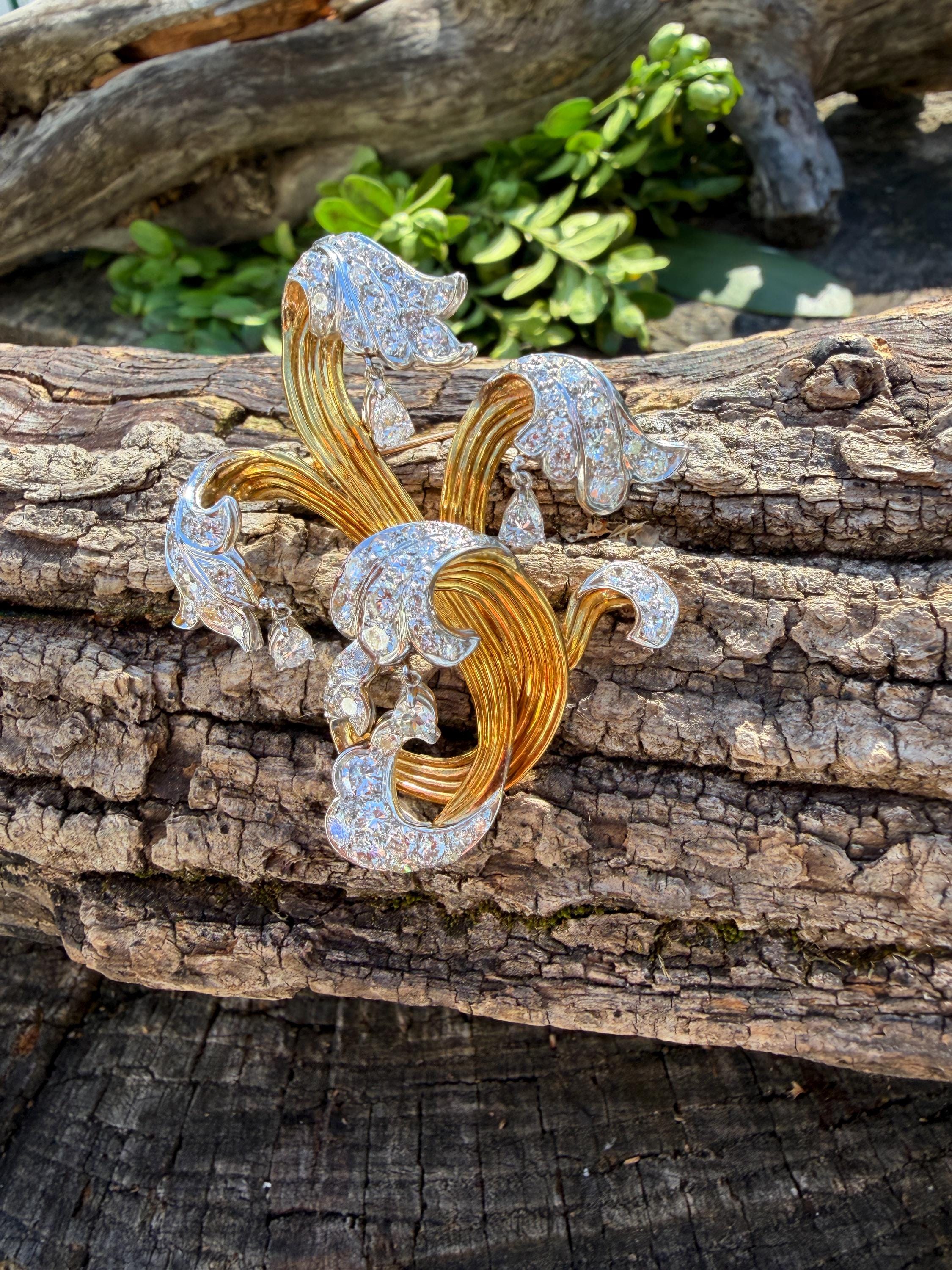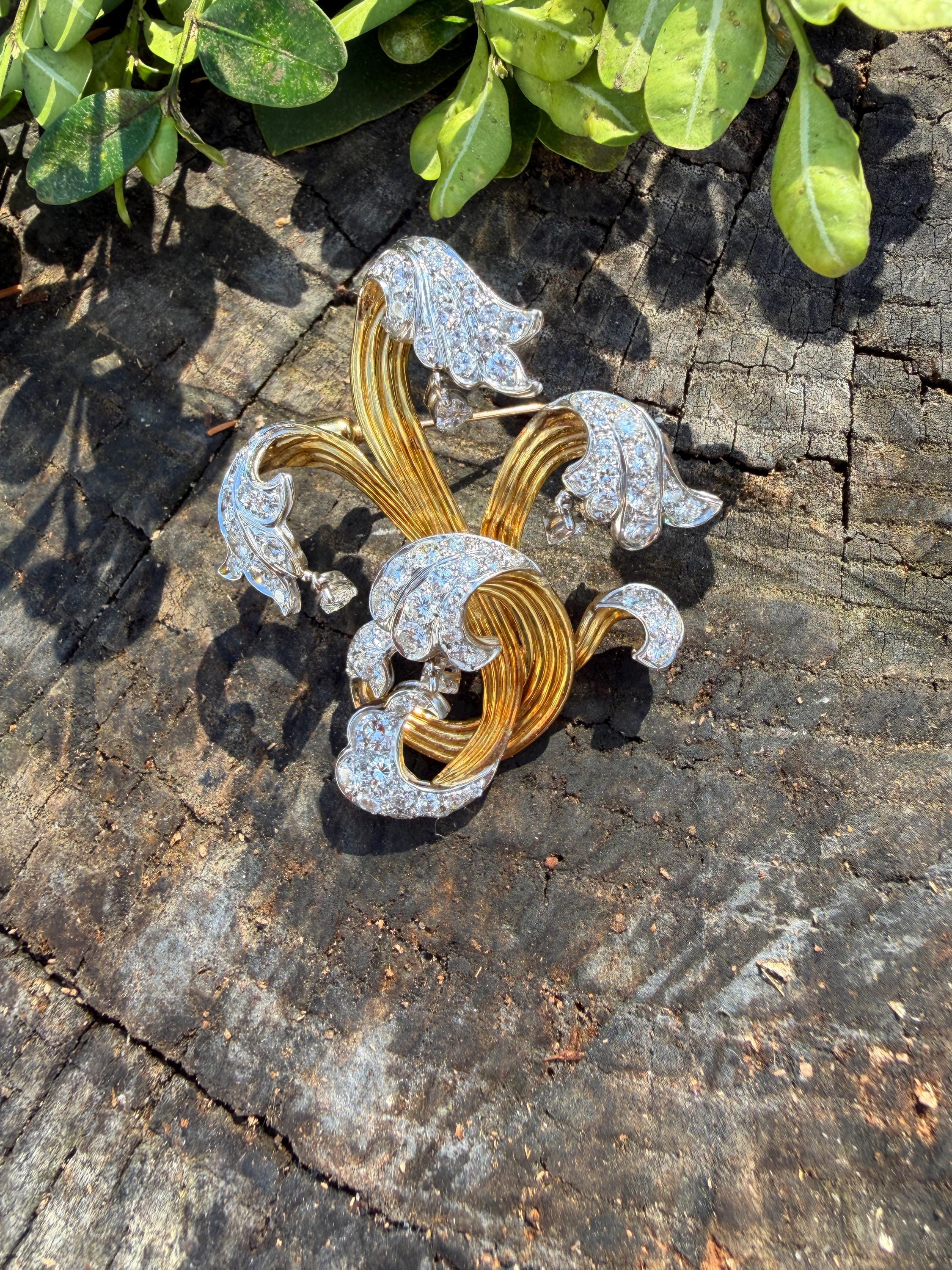 Impressively exquisite, this 1970’s abstract floral spray pin is set in 18k yellow gold. It holds an incandescent dazzle of 5.00 ct of intensely fiery round diamonds. All diamonds are G color and VS1 in clarity. Bearing the weight of the diamonds is a framework of radiant golden strands fused together finishing this look of arresting luxury. It measures 2 1/4" x 1 1/2". It weighs 22 grams. It is marked E Pearl and 18k.