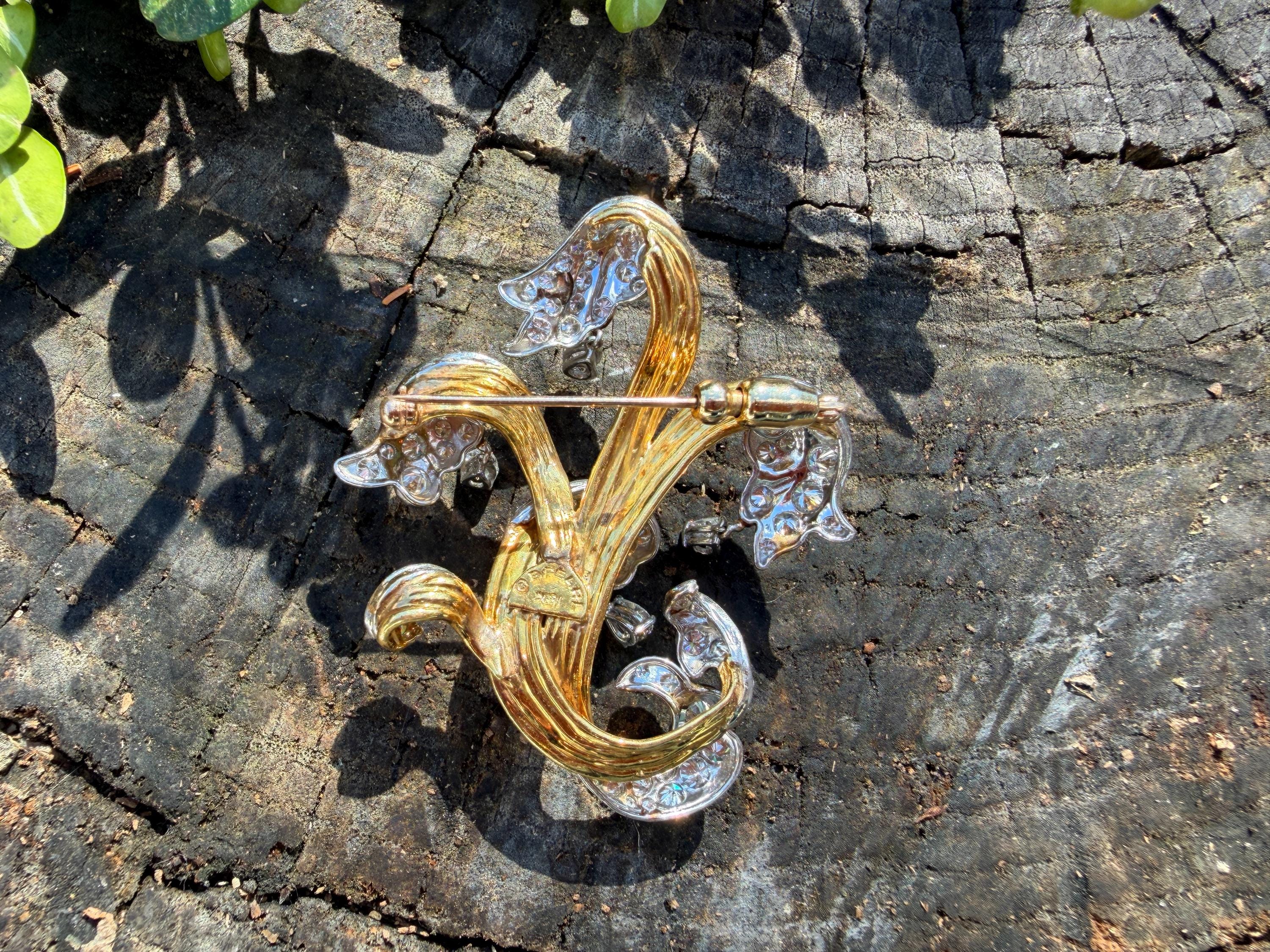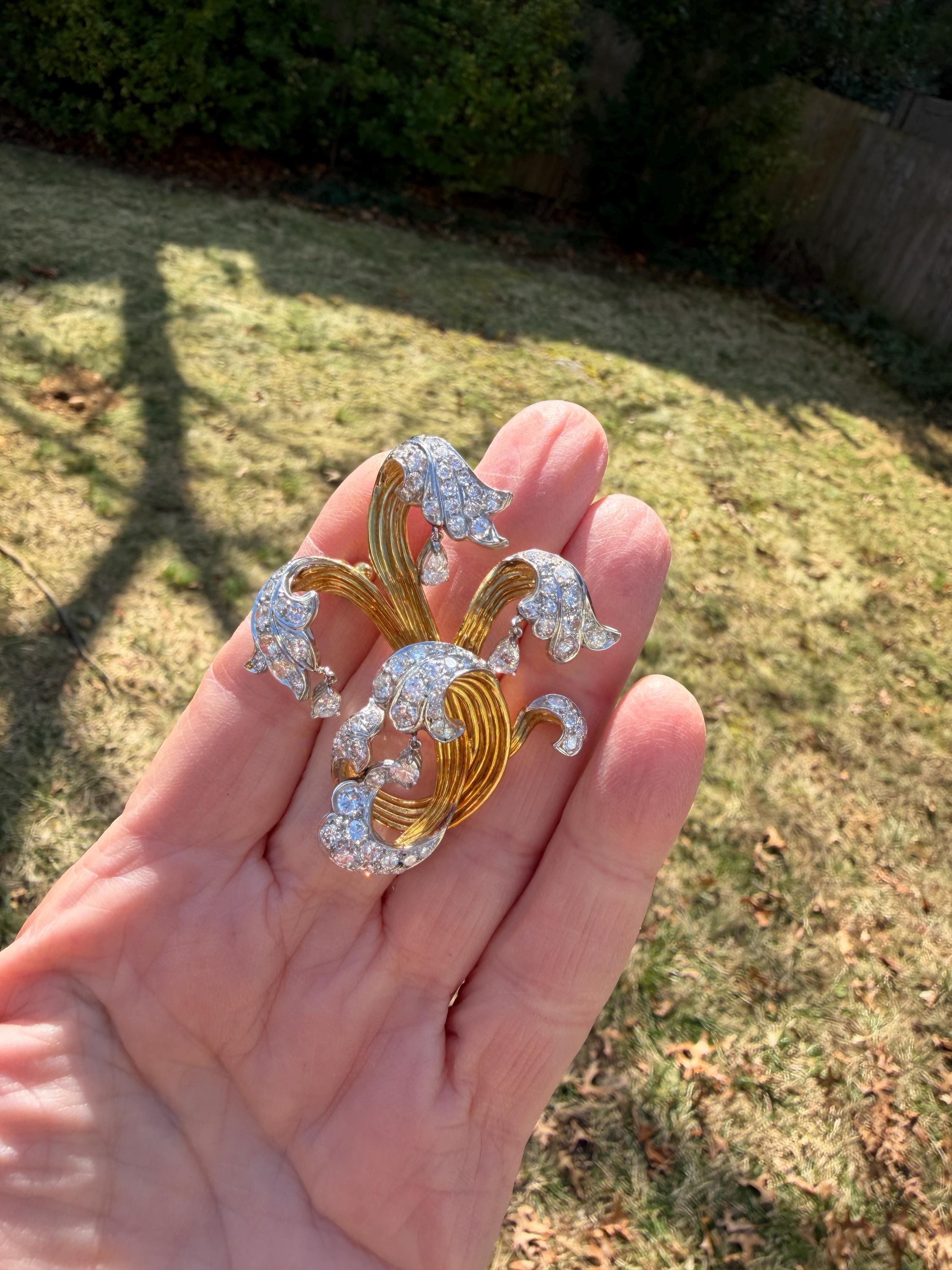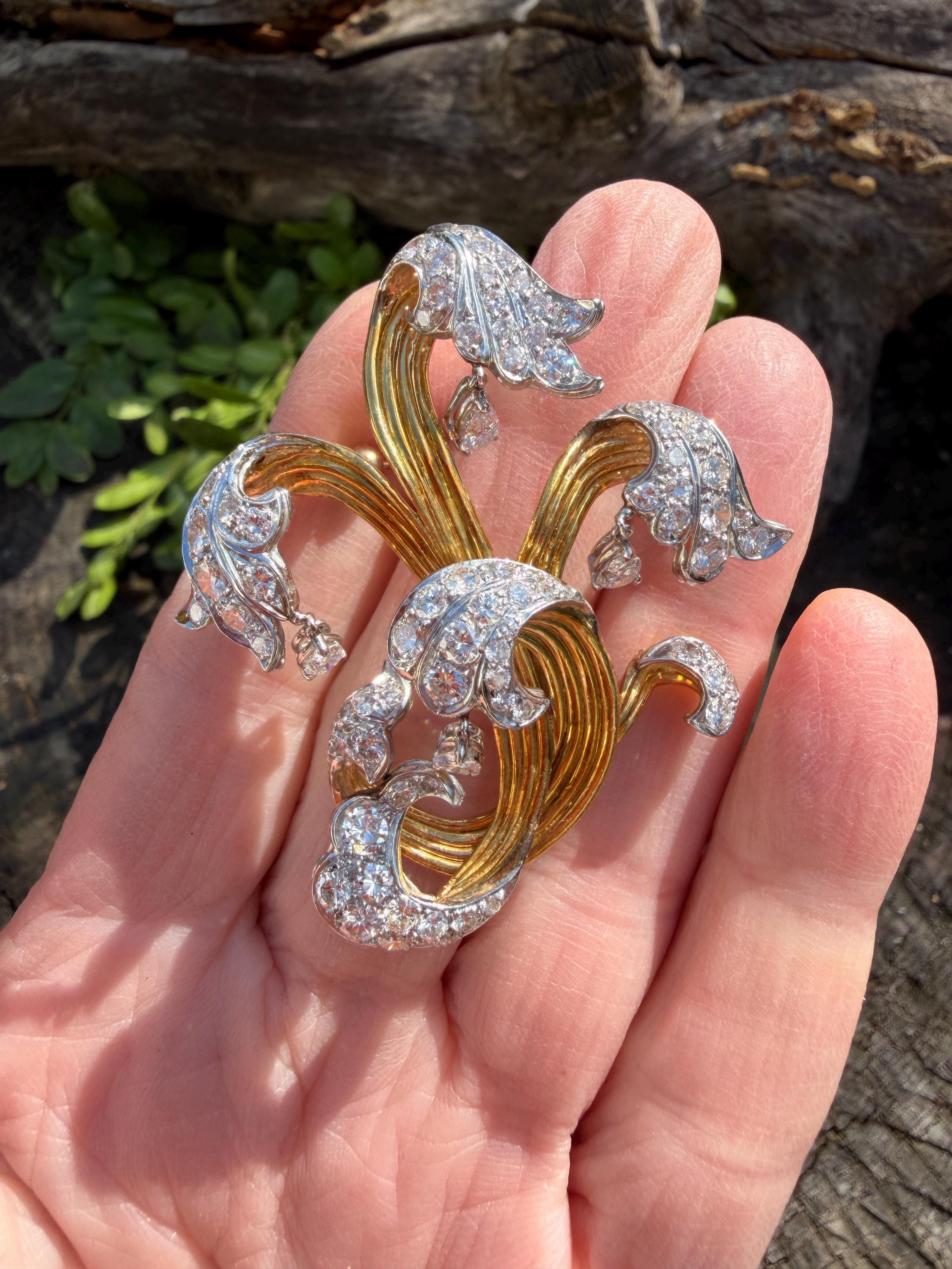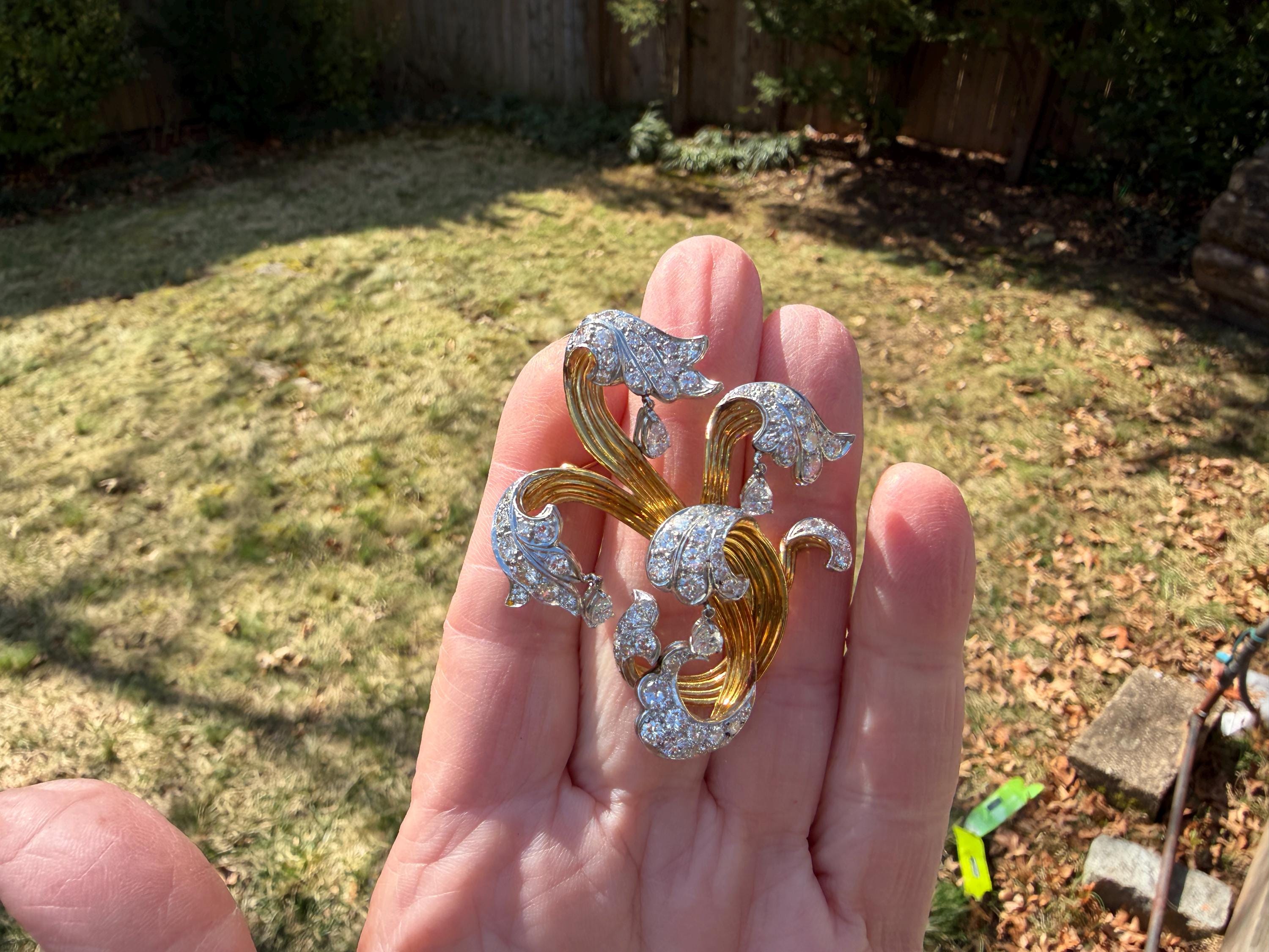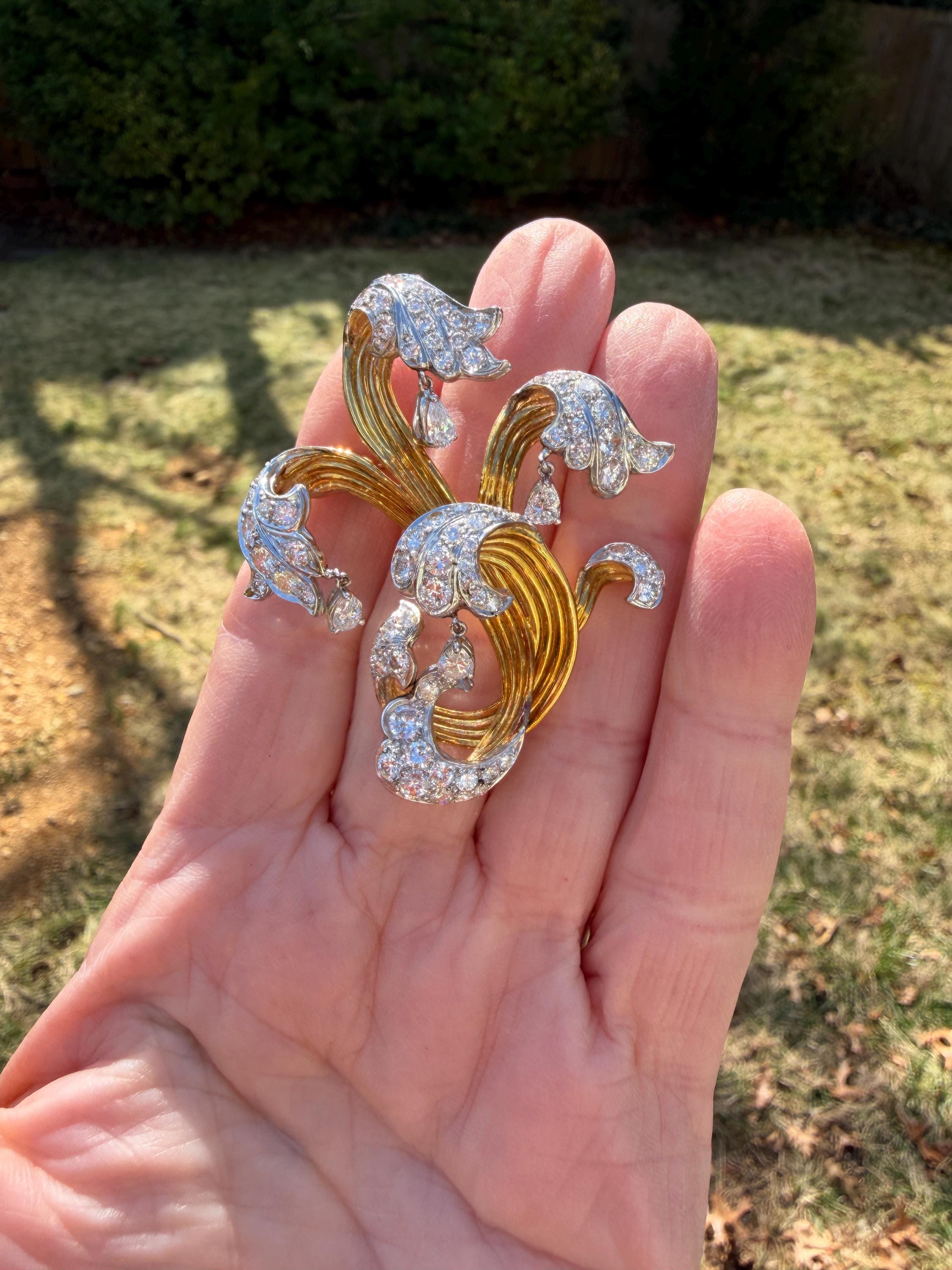 Impressively exquisite, this 1970’s abstract floral spray pin is set in 18k yellow gold. It holds an incandescent dazzle of 5.00 ct of intensely fiery round diamonds. All diamonds are G color and VS1 in clarity. Bearing the weight of the diamonds is a framework of radiant golden strands fused together finishing this look of arresting luxury. It measures 2 1/4" x 1 1/2". It weighs 22 grams. It is marked E Pearl and 18k.