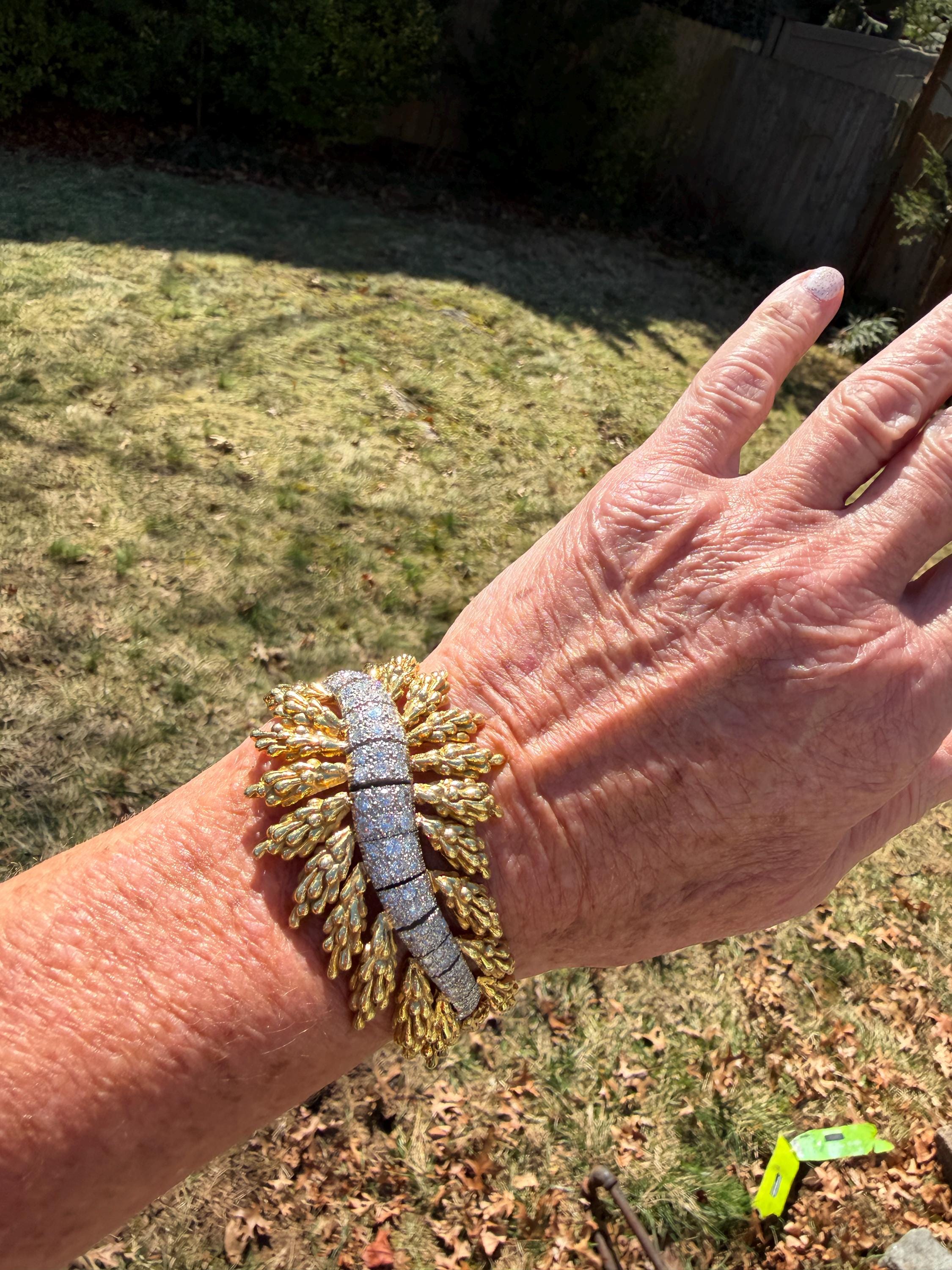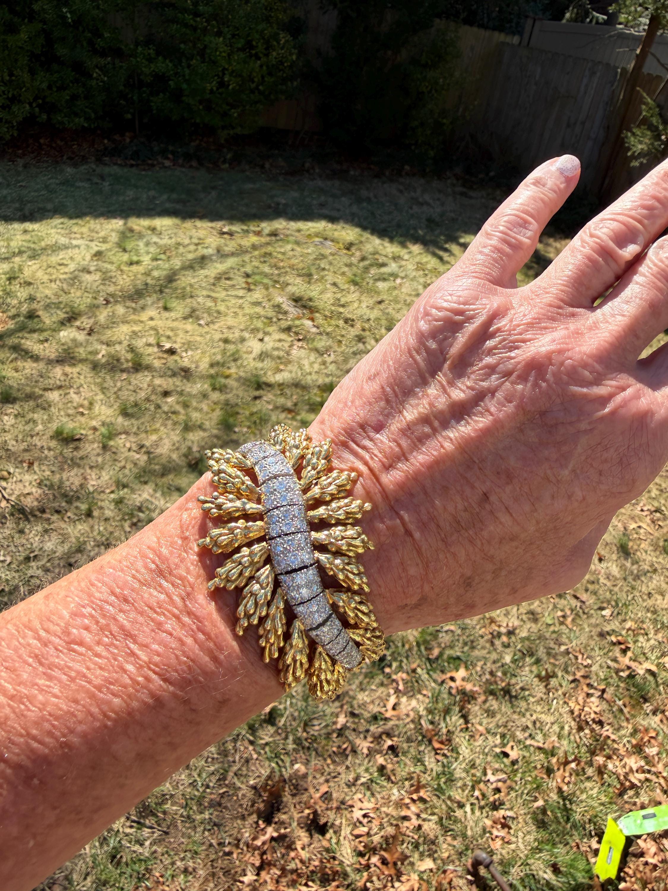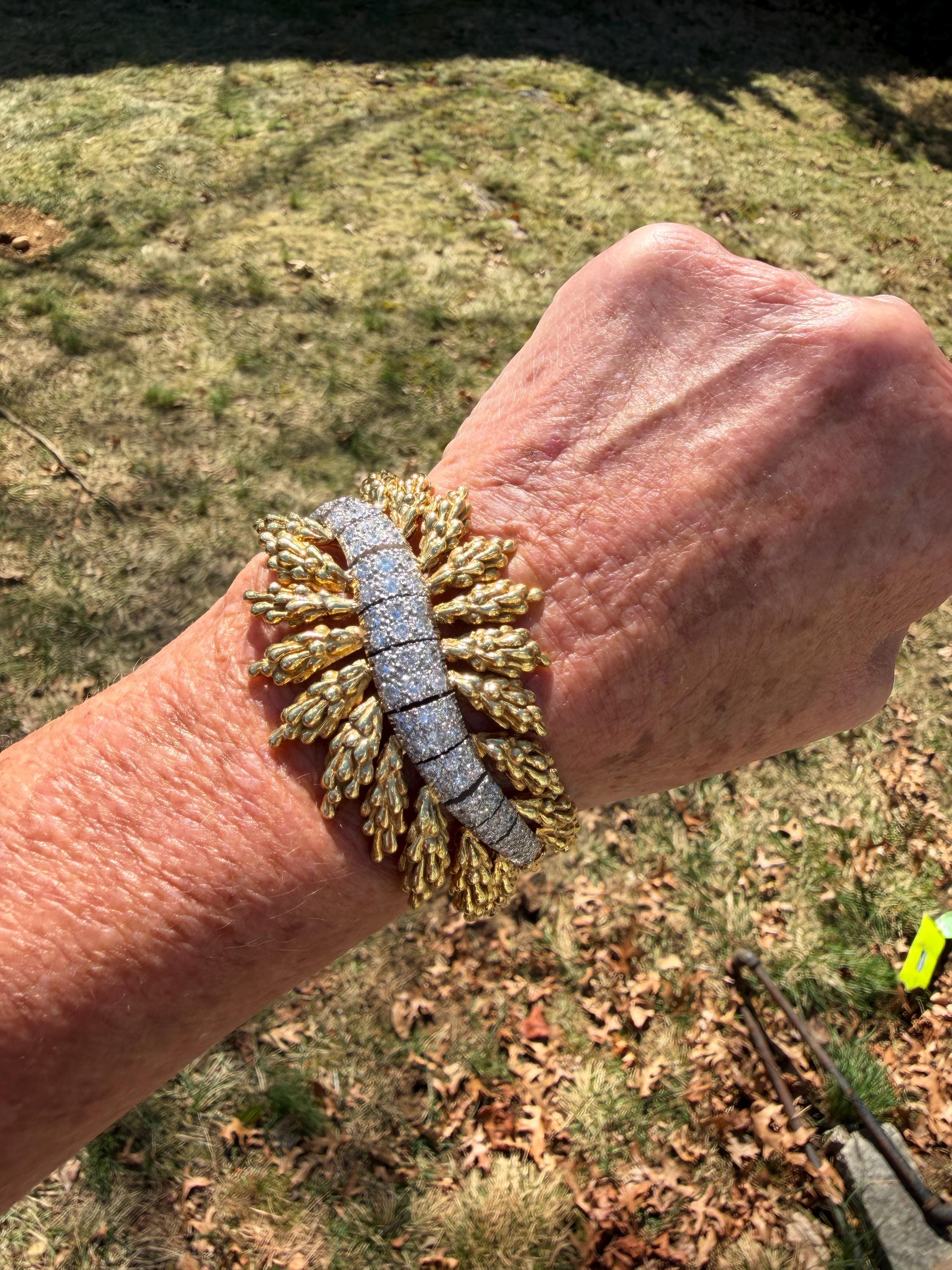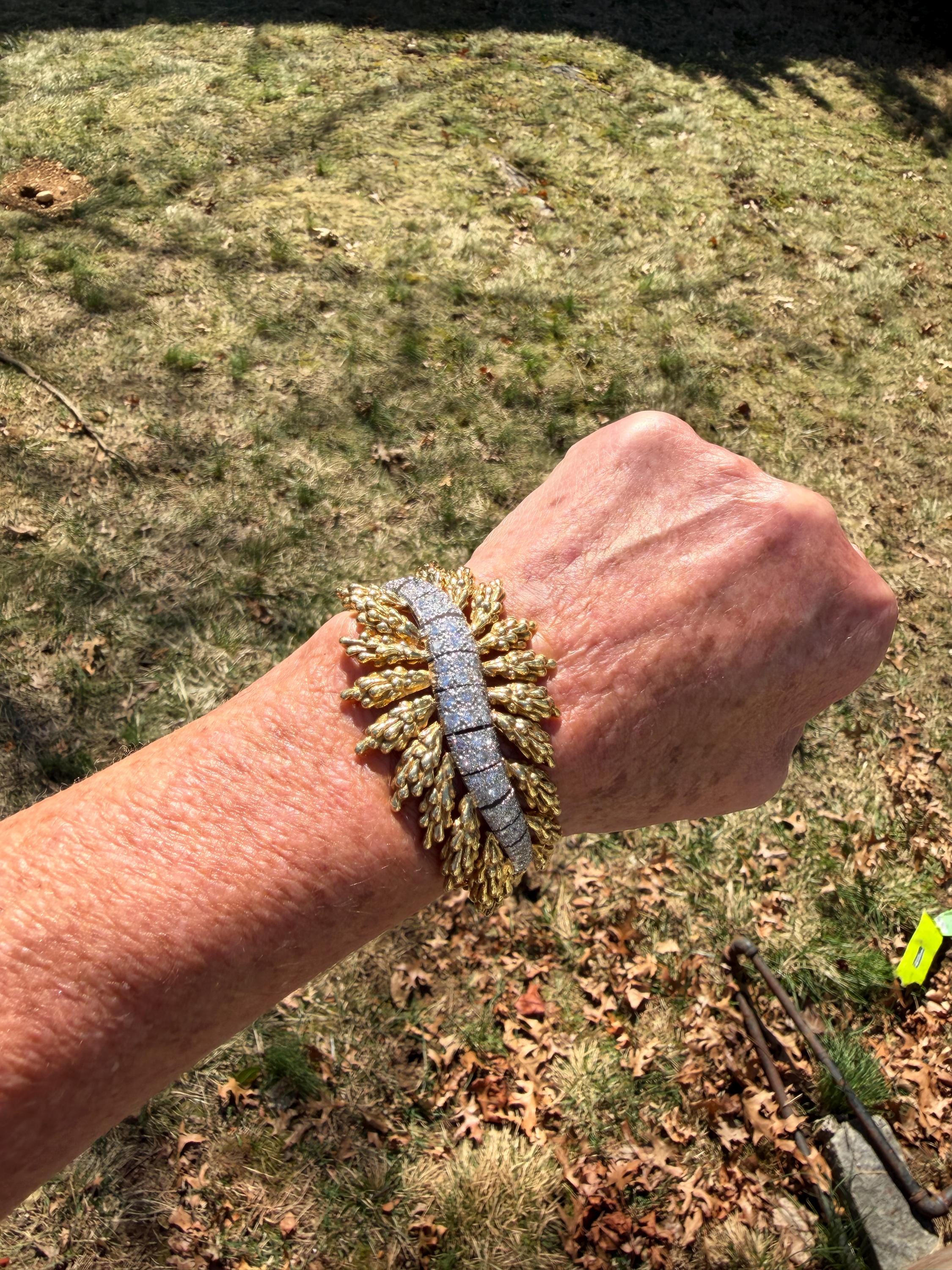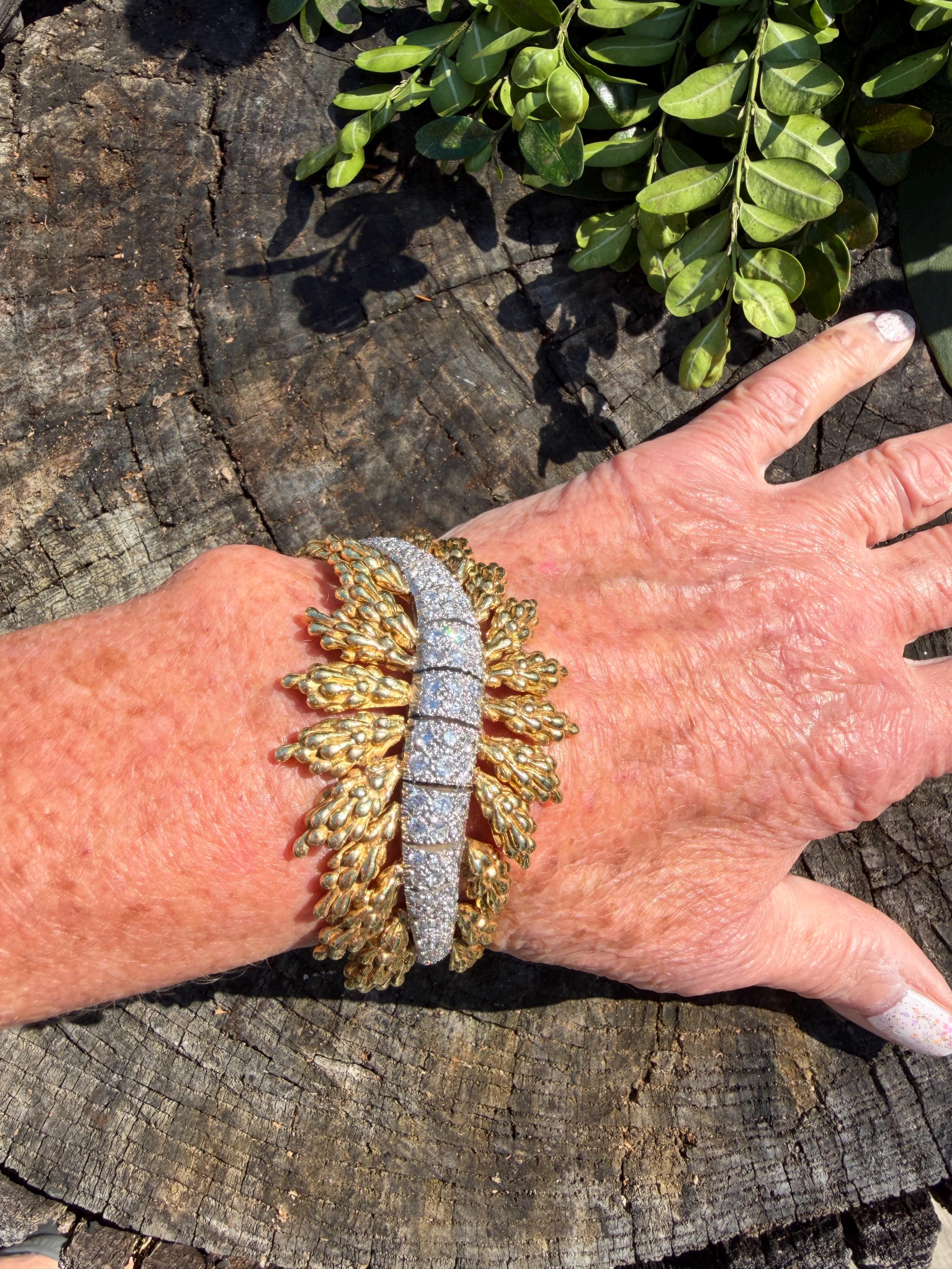Set in 18k yellow gold this magnificent gold and diamond bracelet is sultry, sculptural and unmistakably glamourous. It dates from the 1970's. In a procession of shimmer, set in between a dramatic fan of textured gold, is the parade of round sparkling diamonds in a curved pattern entwined in the bold gold. The diamonds have a total approx. weight of 5.00 ct. The diamonds are G in color and VS2 in clarity. The diamonds are set in the gold bracelet in a way that almost floats a top your wrist. The icy sparkle of the diamonds give the piece extraordinary depth and movement, catching light from every angle. A true testimonial for sizzling style. The bracelet weighs 71.57 grams. The bracelet measures 6 3/4". The bracelet is 1 1/2" wide in the center and 7/8" at its least widest. It is marked 18k and E. Pearl. Sultry, luxurious and powerful.