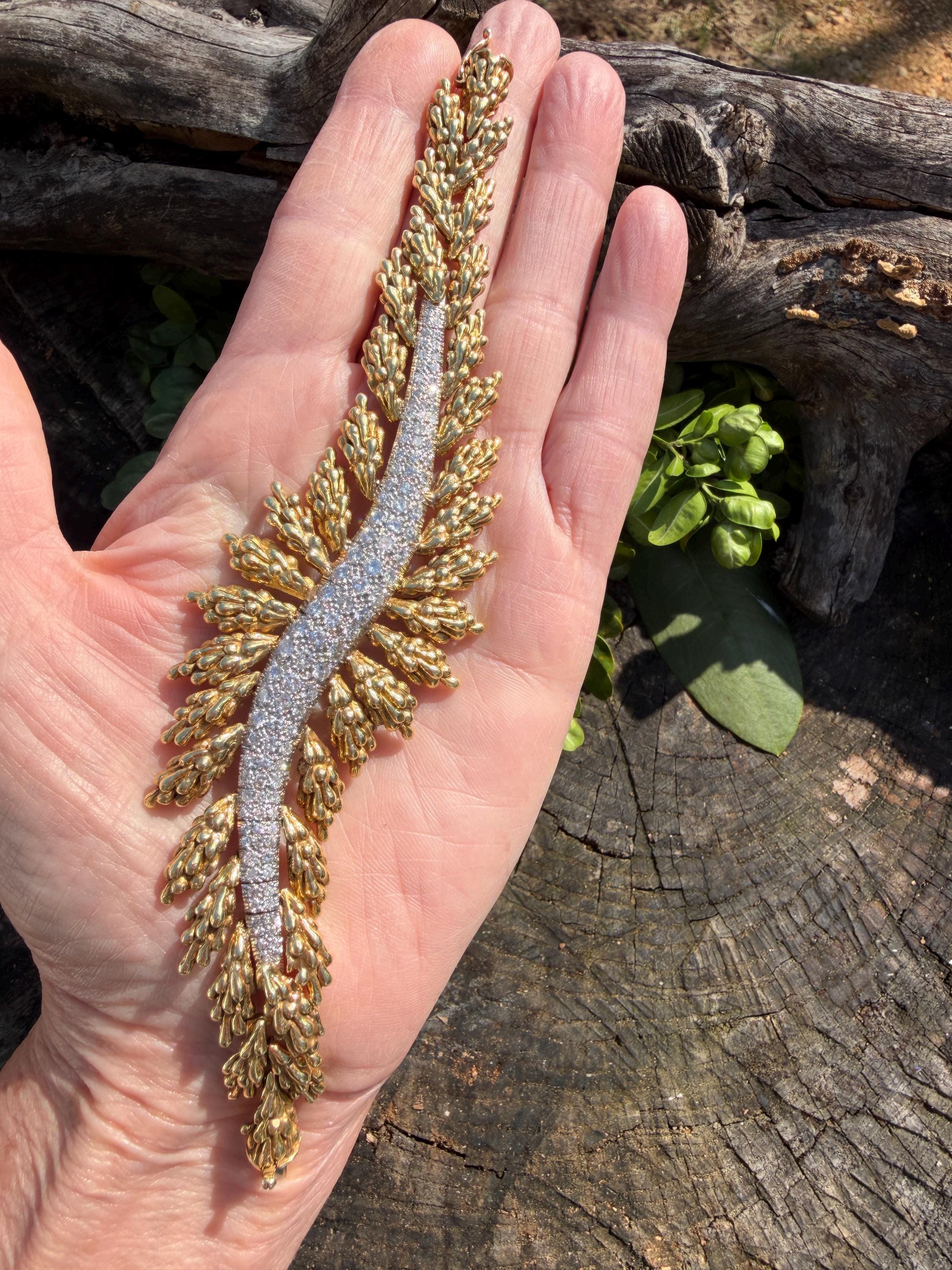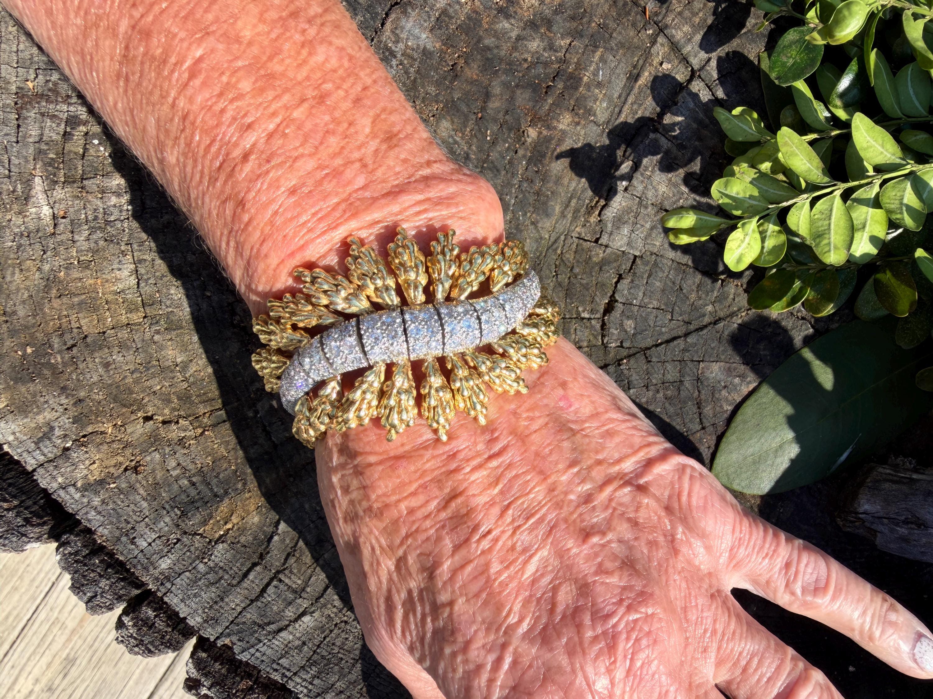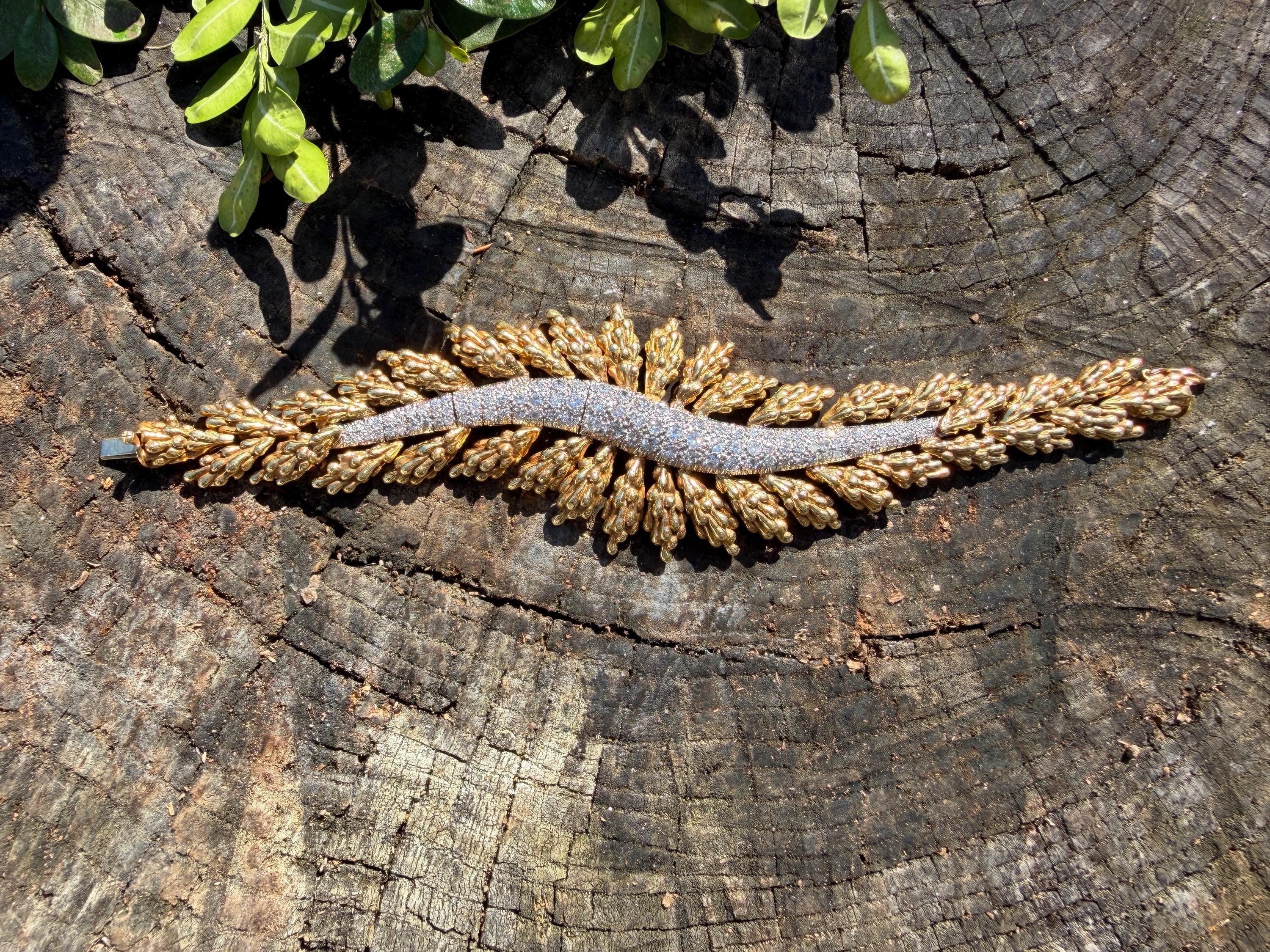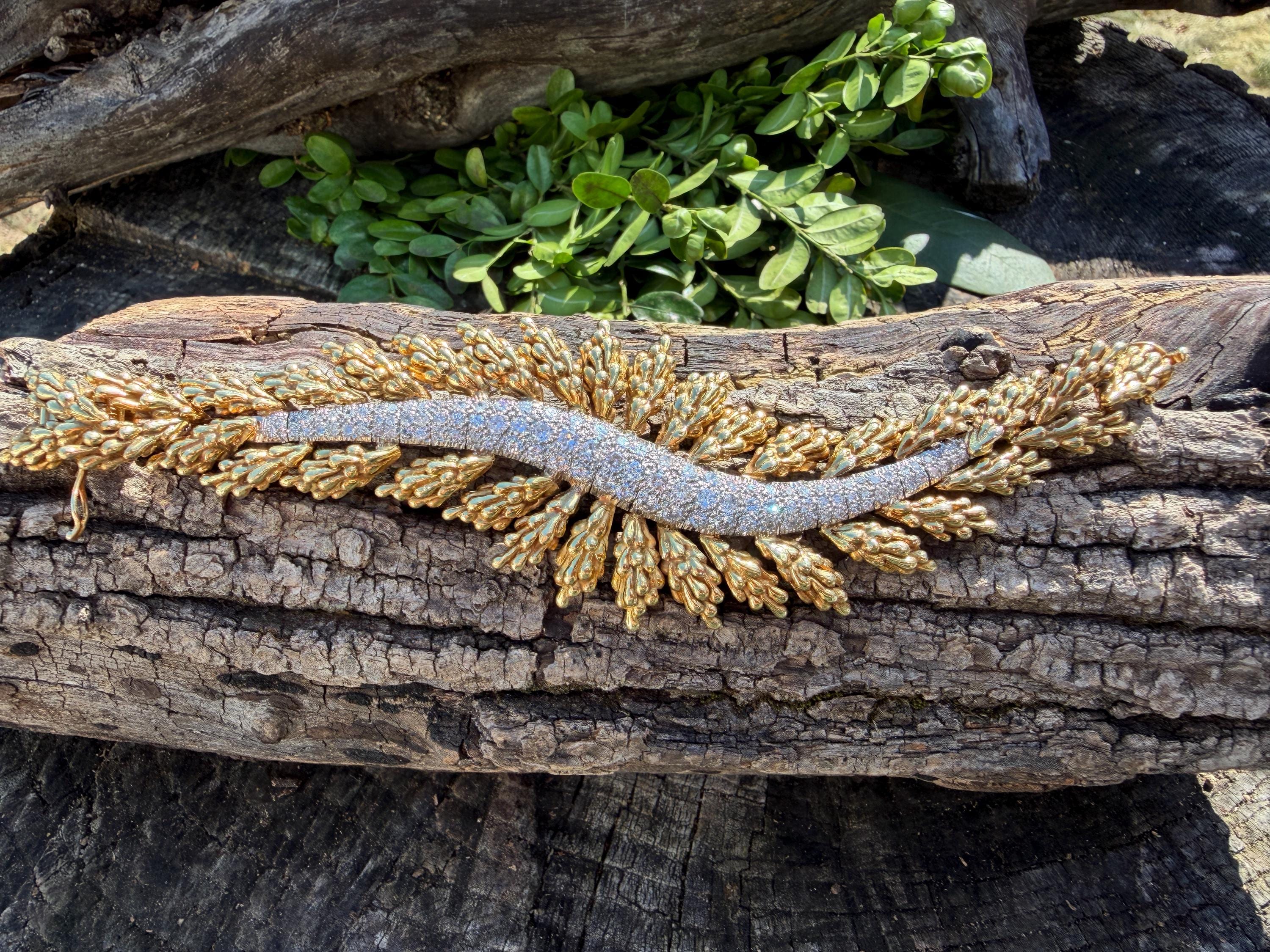Set in 18k yellow gold this magnificent gold and diamond bracelet is sultry, sculptural and unmistakably glamourous. It dates from the 1970's. In a procession of shimmer, set in between a dramatic fan of textured gold, is the parade of round sparkling diamonds in a curved pattern entwined in the bold gold. The diamonds have a total approx. weight of 5.00 ct. The diamonds are G in color and VS2 in clarity. The diamonds are set in the gold bracelet in a way that almost floats a top your wrist. The icy sparkle of the diamonds give the piece extraordinary depth and movement, catching light from every angle. A true testimonial for sizzling style. The bracelet weighs 71.57 grams. The bracelet measures 6 3/4". The bracelet is 1 1/2" wide in the center and 7/8" at its least widest. It is marked 18k and E. Pearl. Sultry, luxurious and powerful.