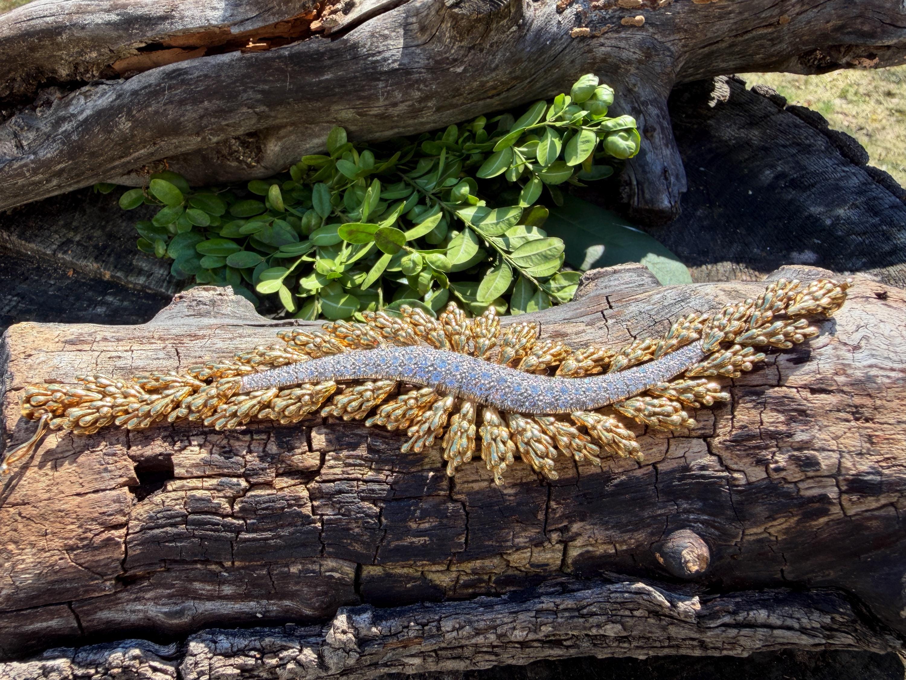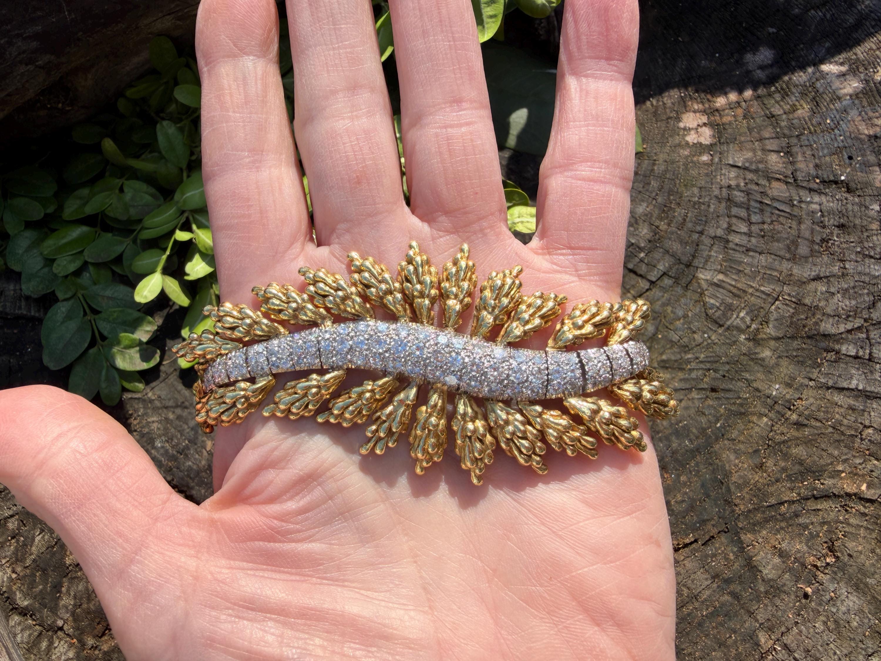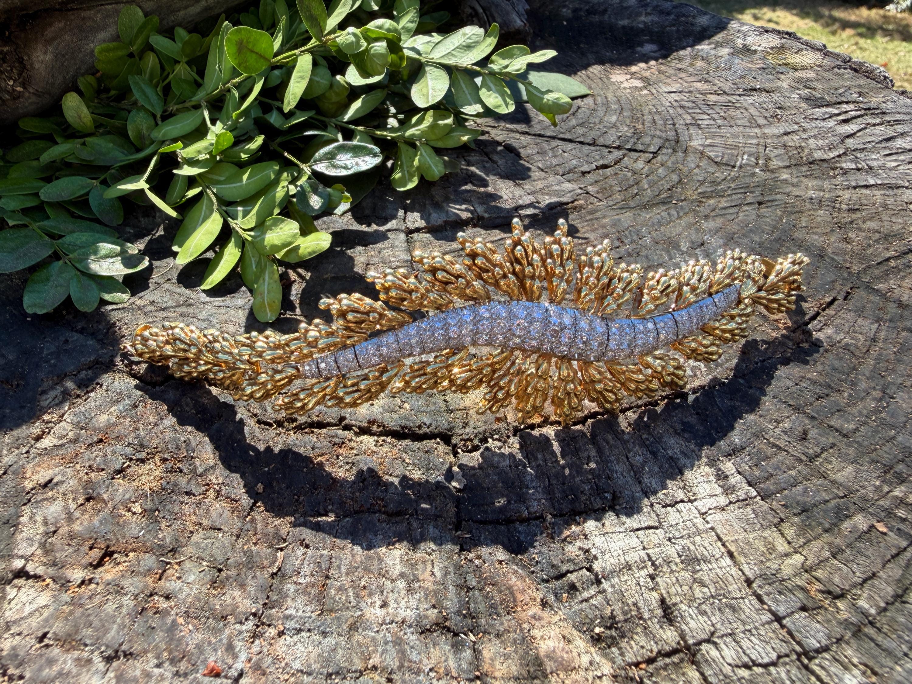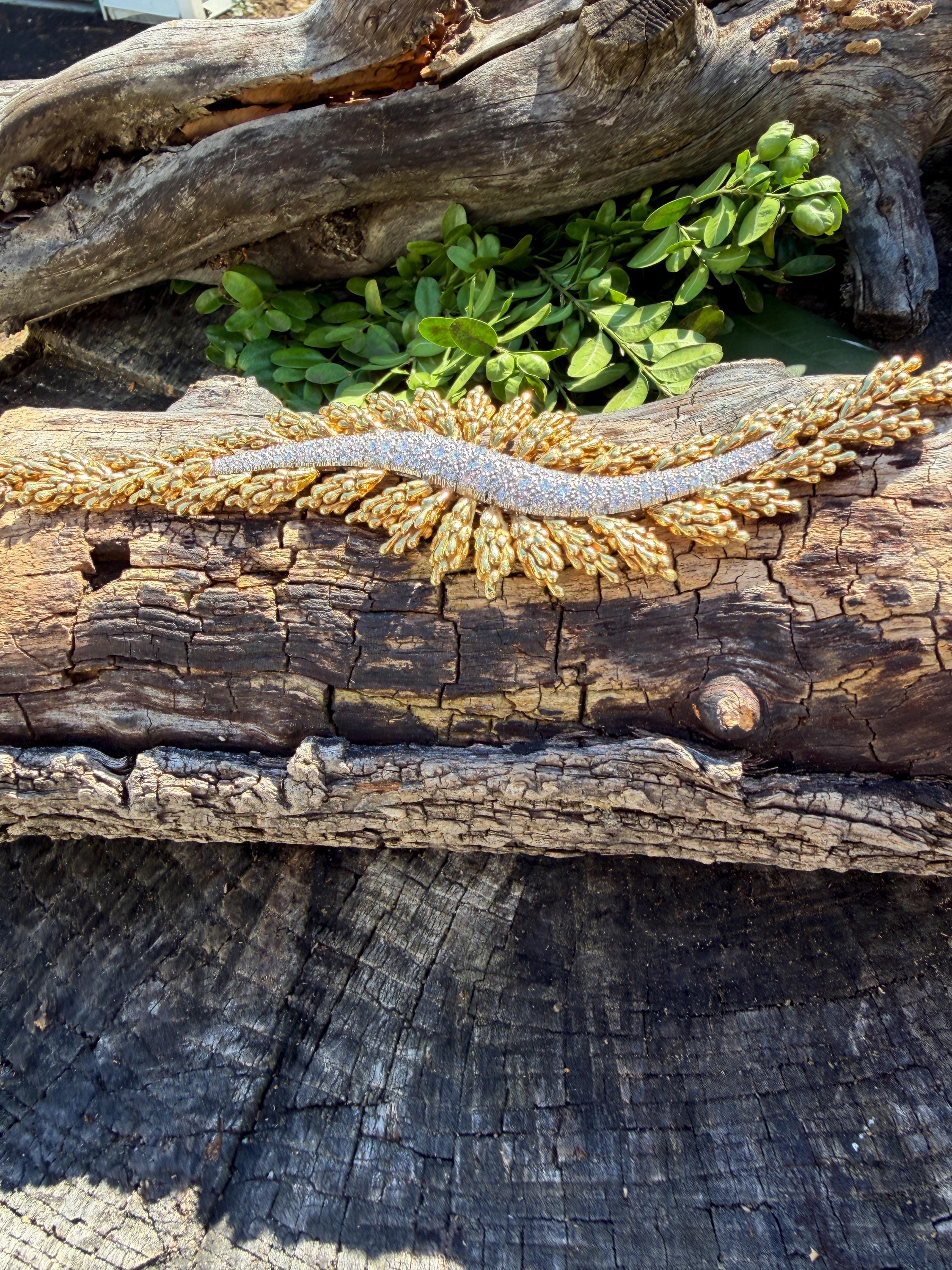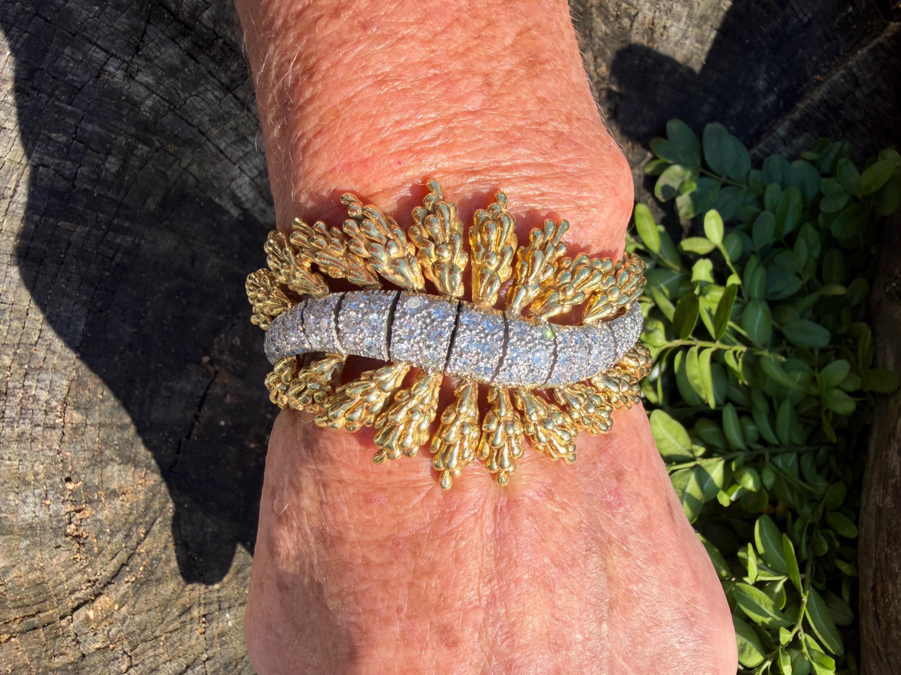Set in 18k yellow gold this magnificent gold and diamond bracelet is sultry, sculptural and unmistakably glamourous. It dates from the 1970's. In a procession of shimmer, set in between a dramatic fan of textured gold, is the parade of round sparkling diamonds in a curved pattern entwined in the bold gold. The diamonds have a total approx. weight of 5.00 ct. The diamonds are G in color and VS2 in clarity. The diamonds are set in the gold bracelet in a way that almost floats a top your wrist. The icy sparkle of the diamonds give the piece extraordinary depth and movement, catching light from every angle. A true testimonial for sizzling style. The bracelet weighs 71.57 grams. The bracelet measures 6 3/4". The bracelet is 1 1/2" wide in the center and 7/8" at its least widest. It is marked 18k and E. Pearl. Sultry, luxurious and powerful.