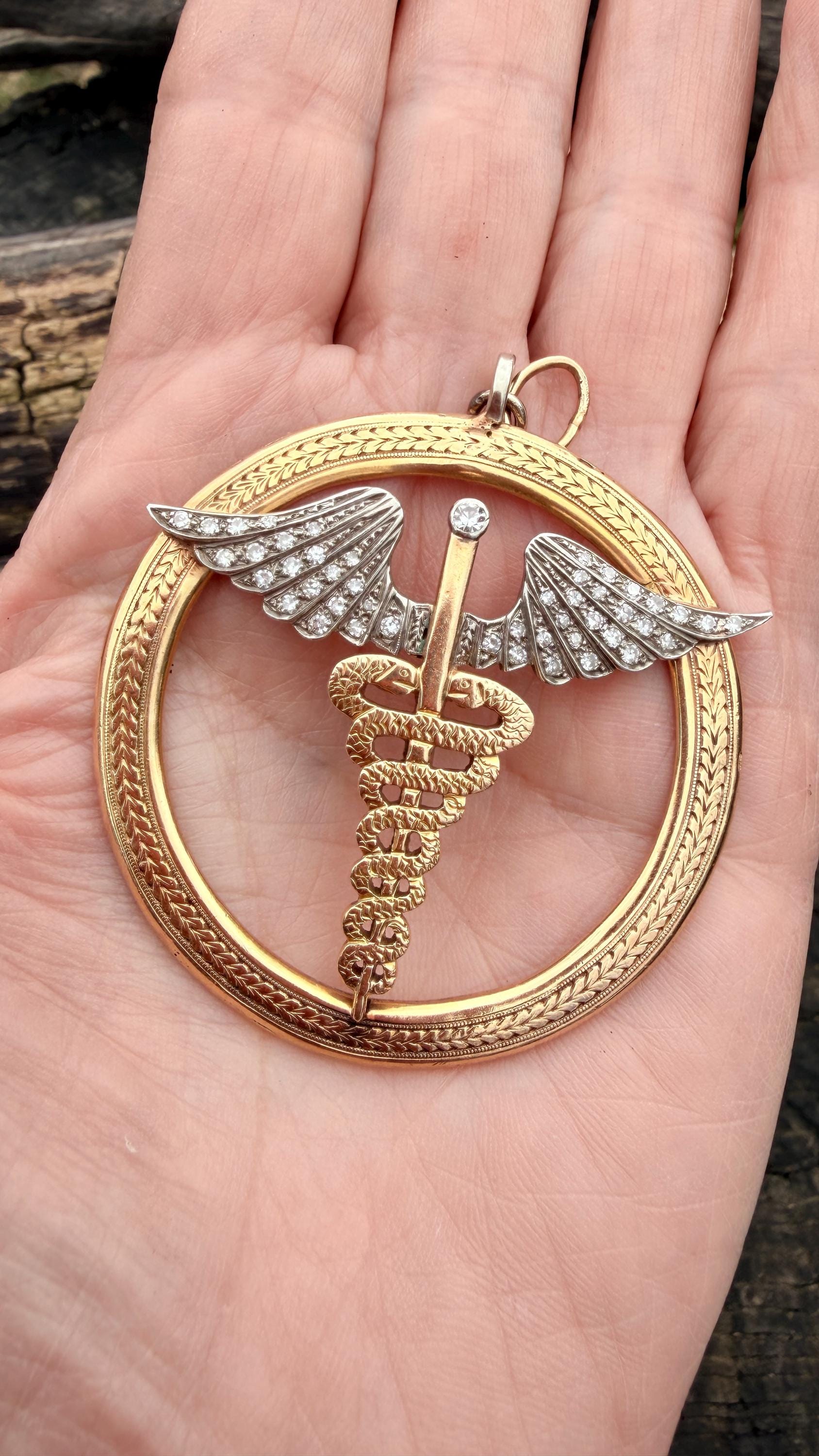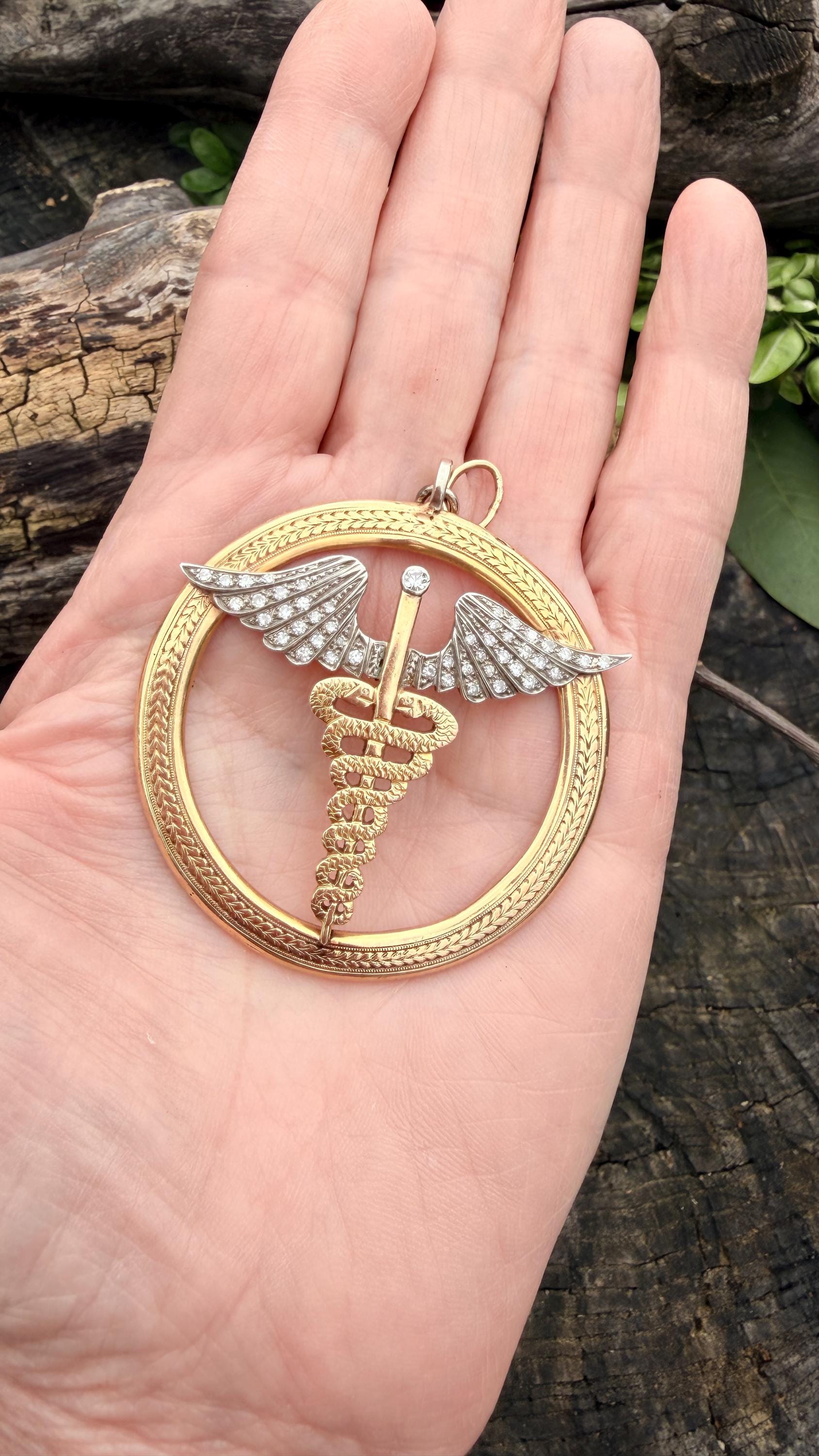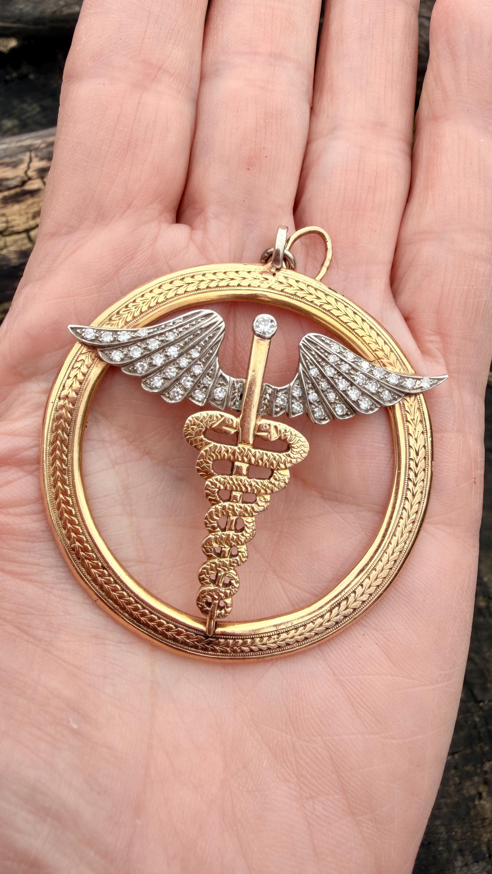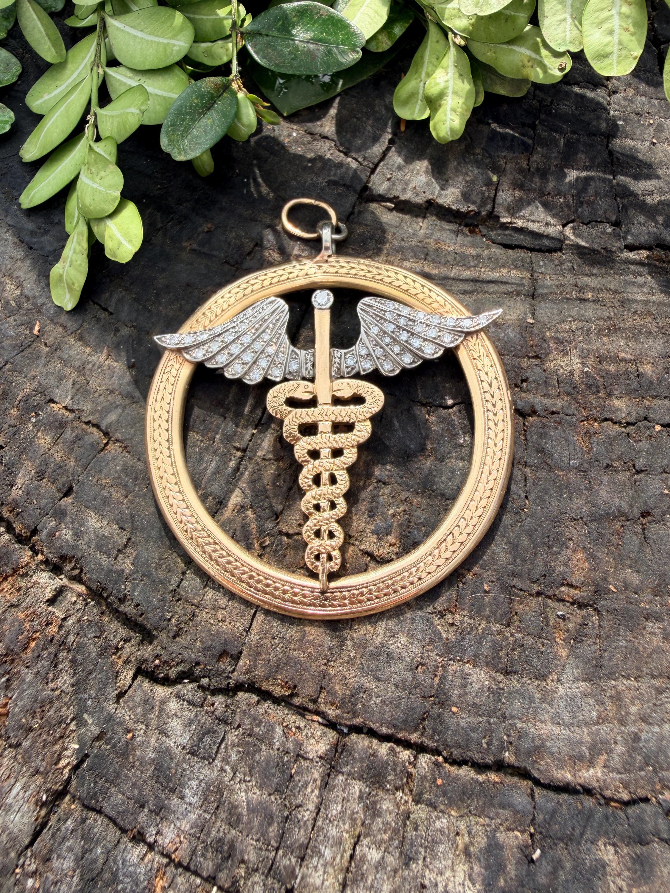 Whats up doc? This sensational large caduceus charm Is crafted in 14k yellow gold. The caduceus, a staff with two snakes coiled around it with 2 wings, is the official insignia of the United States Medical Corps, Navy Pharmacy Division, and the Public Health Service. The caduceus is also the magic wand carried by Hermes (the Romans knew him as Mercury), the messenger of the gods. This charm is intricately structured with attention to details. The wings are blanketed in diamonds bringing this piece to another level of stunning. The diamonds have a total approx weight of .65 ct. They are H in color and VS2 in clarity. The symbol sits in a large textured gold circular frame. It weighs 25.79 grams. It measures 2"x 2".