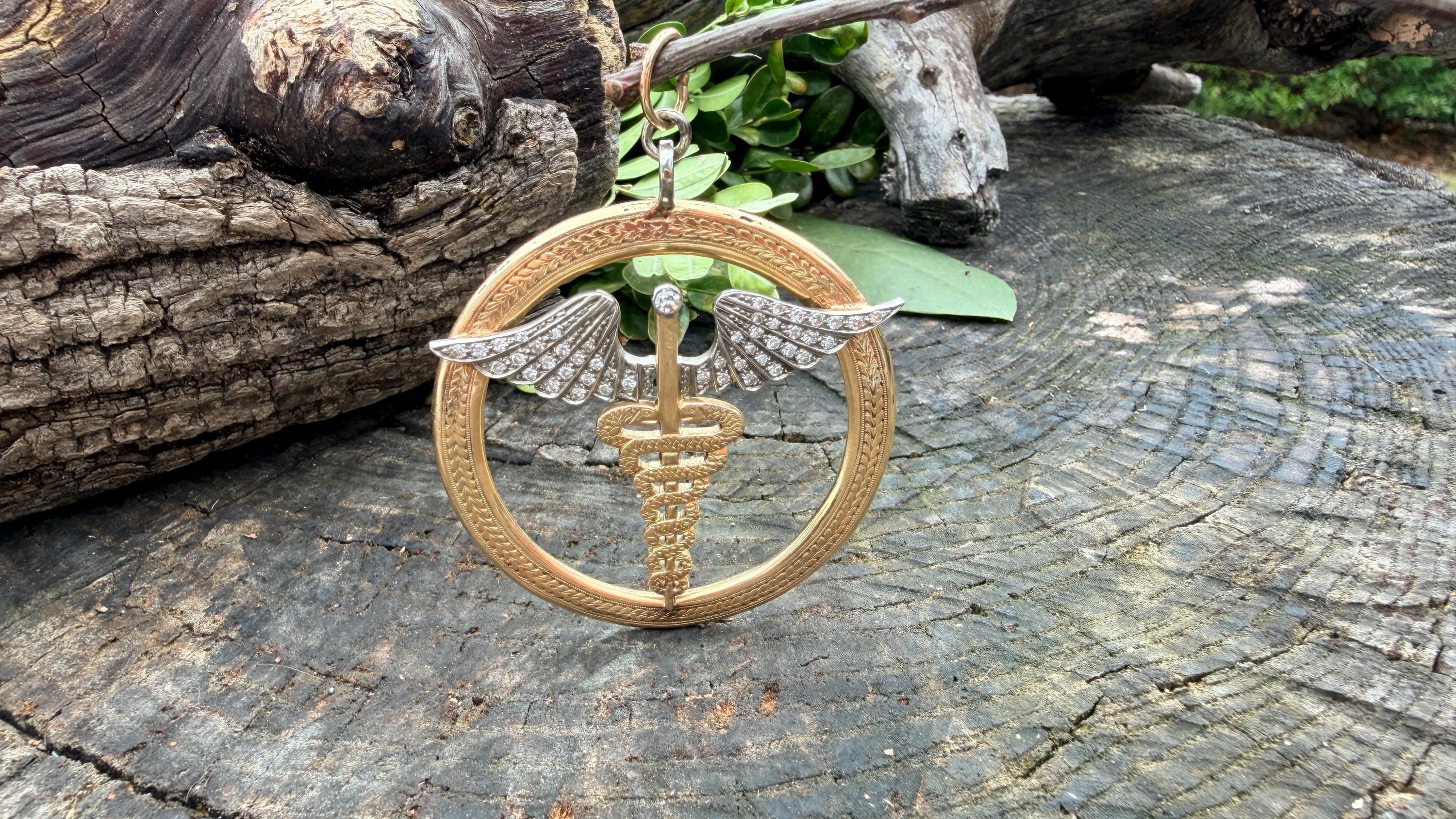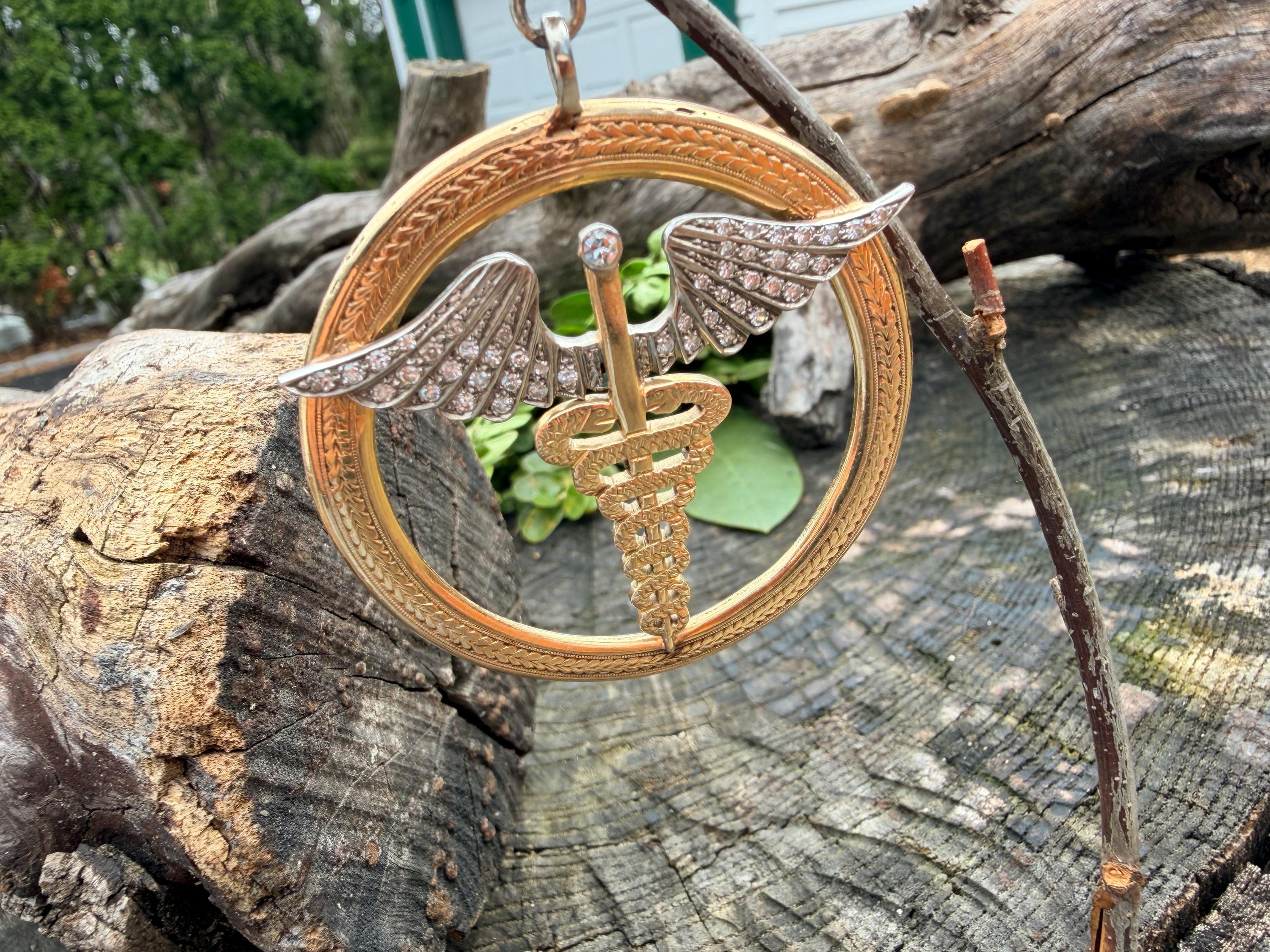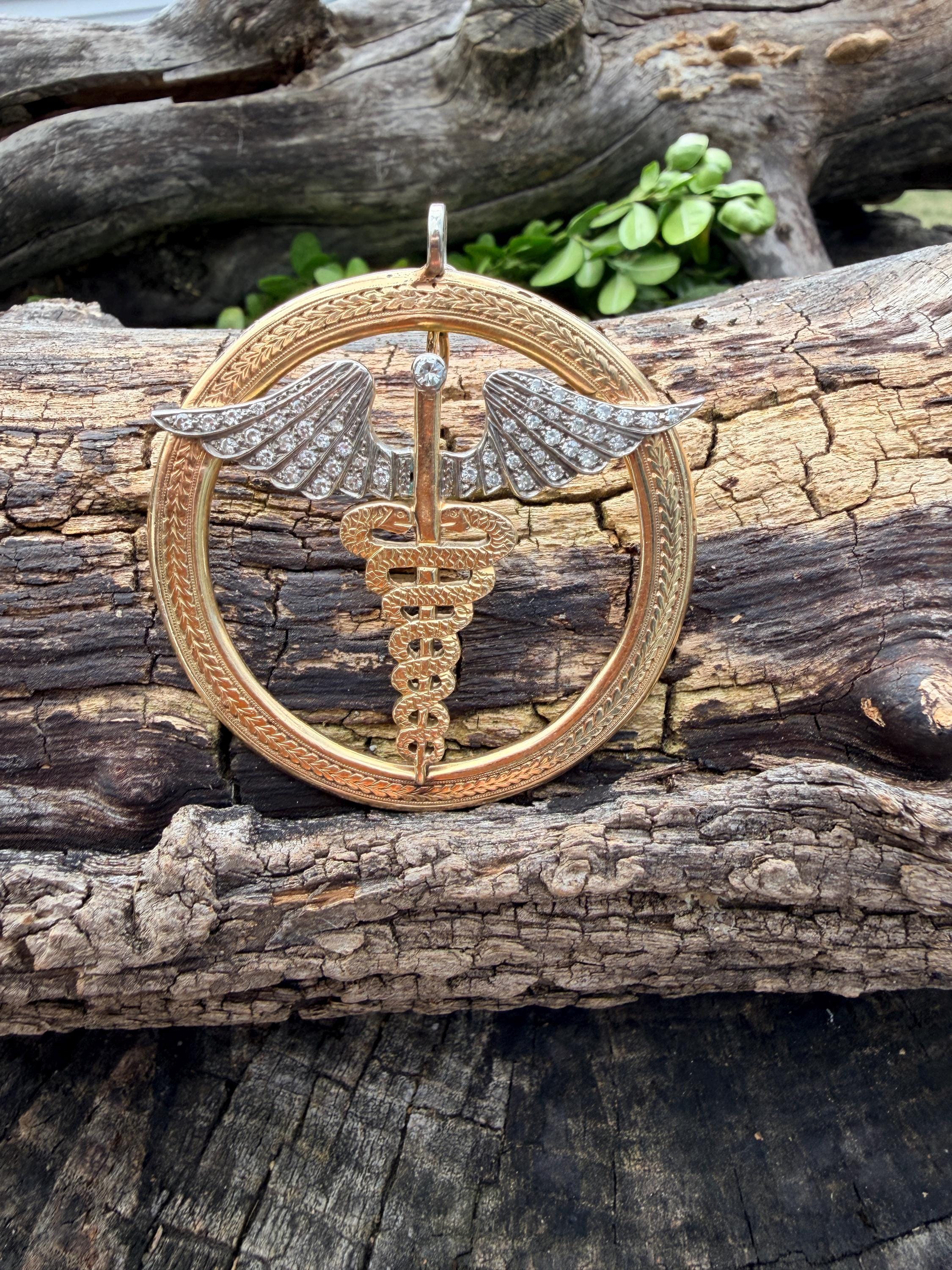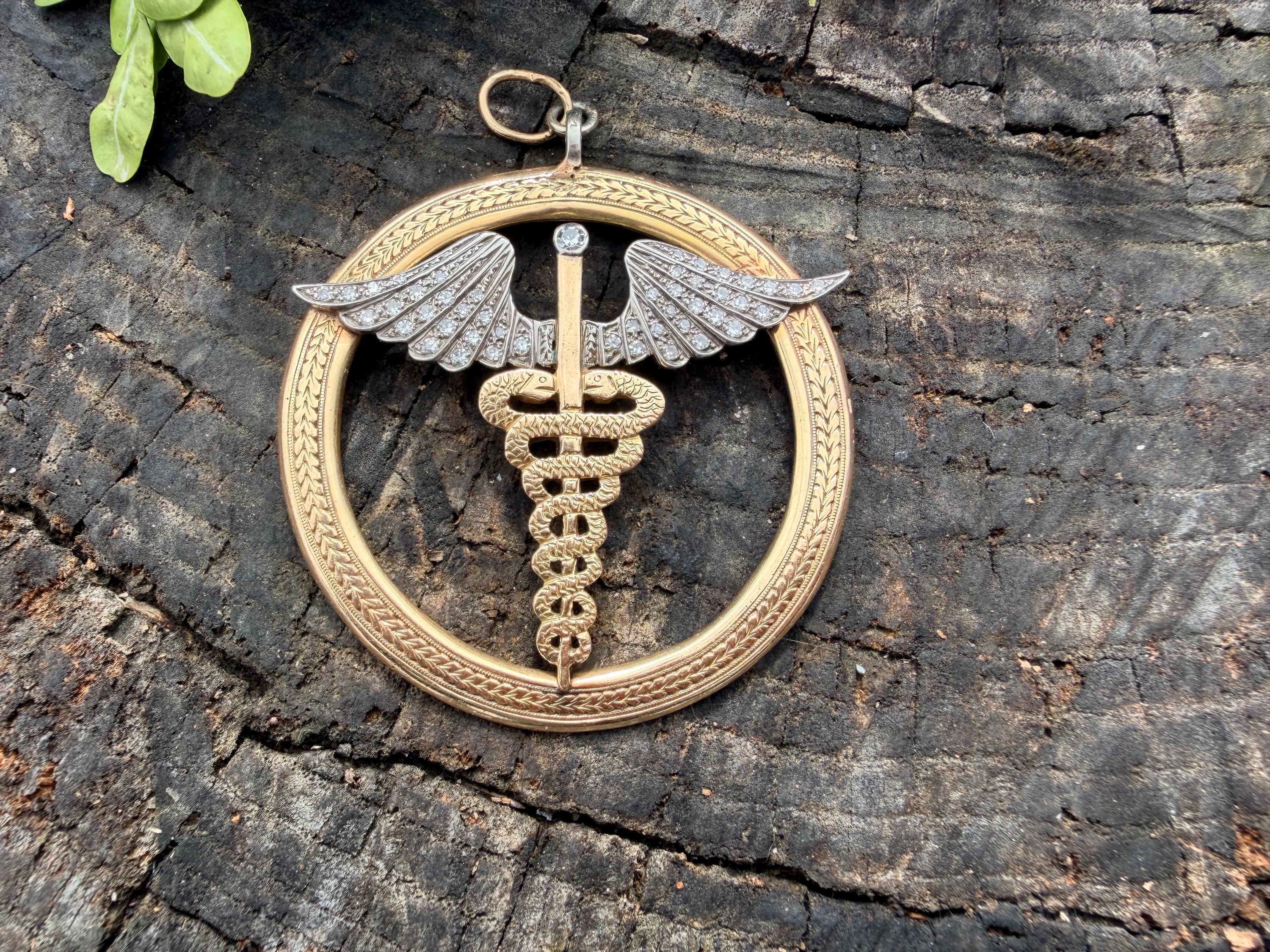 Whats up doc? This sensational large caduceus charm Is crafted in 14k yellow gold. The caduceus, a staff with two snakes coiled around it with 2 wings, is the official insignia of the United States Medical Corps, Navy Pharmacy Division, and the Public Health Service. The caduceus is also the magic wand carried by Hermes (the Romans knew him as Mercury), the messenger of the gods. This charm is intricately structured with attention to details. The wings are blanketed in diamonds bringing this piece to another level of stunning. The diamonds have a total approx weight of .65 ct. They are H in color and VS2 in clarity. The symbol sits in a large textured gold circular frame. It weighs 25.79 grams. It measures 2"x 2".