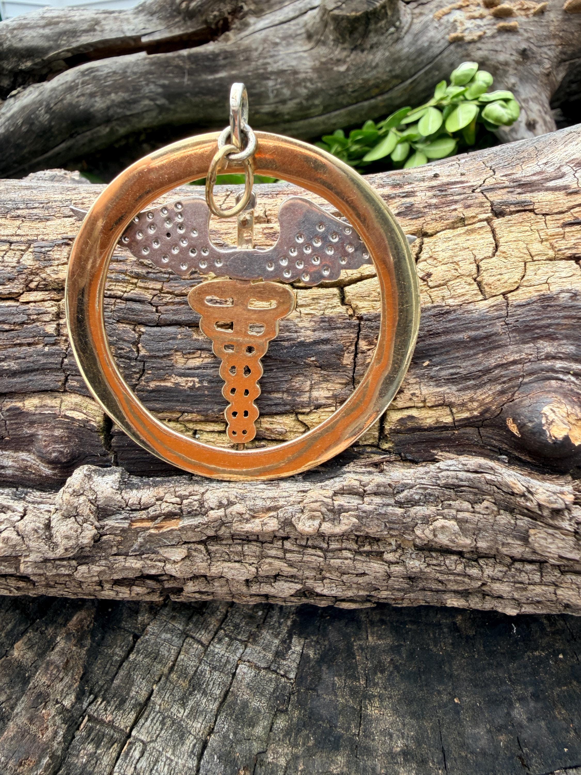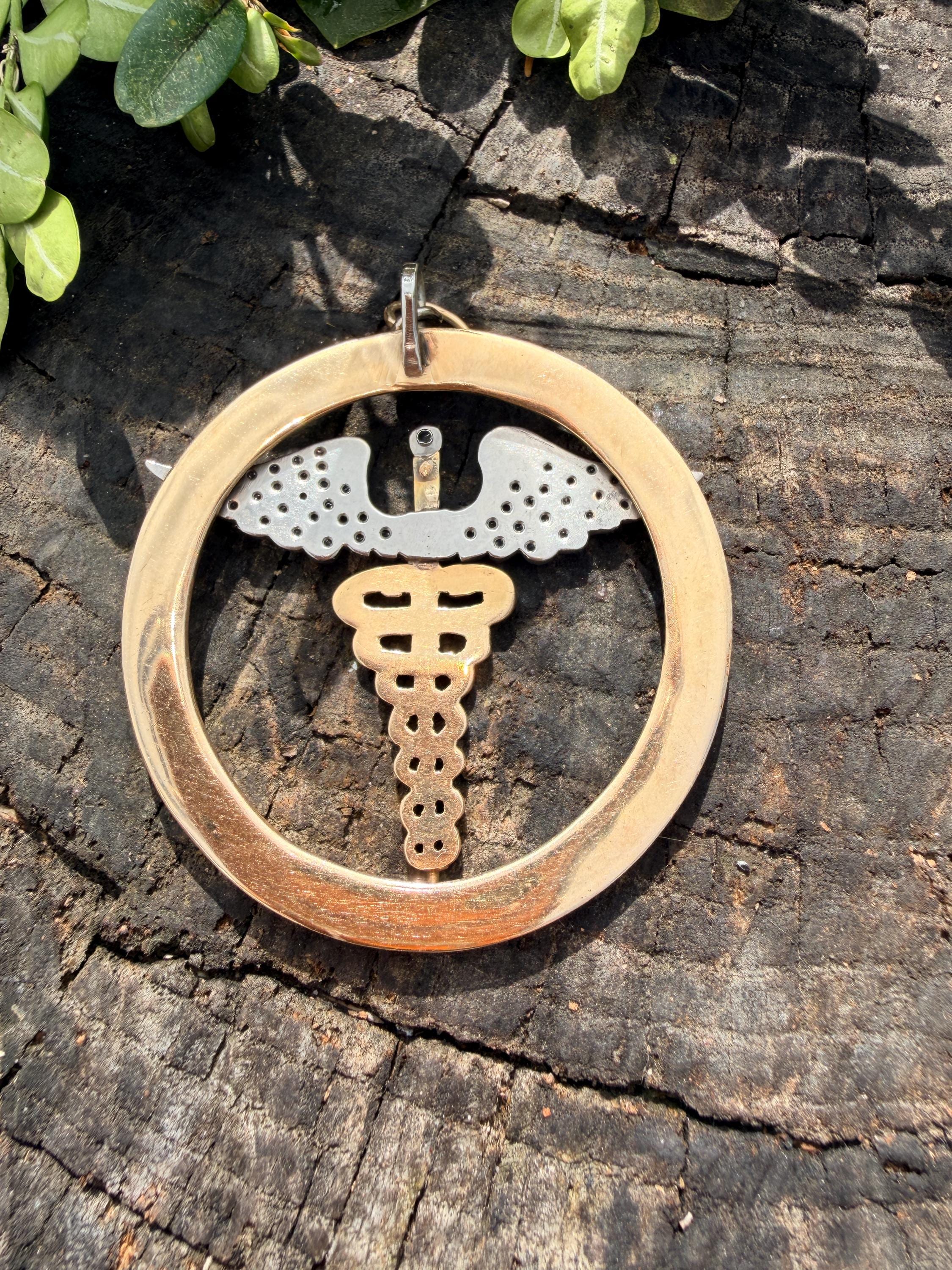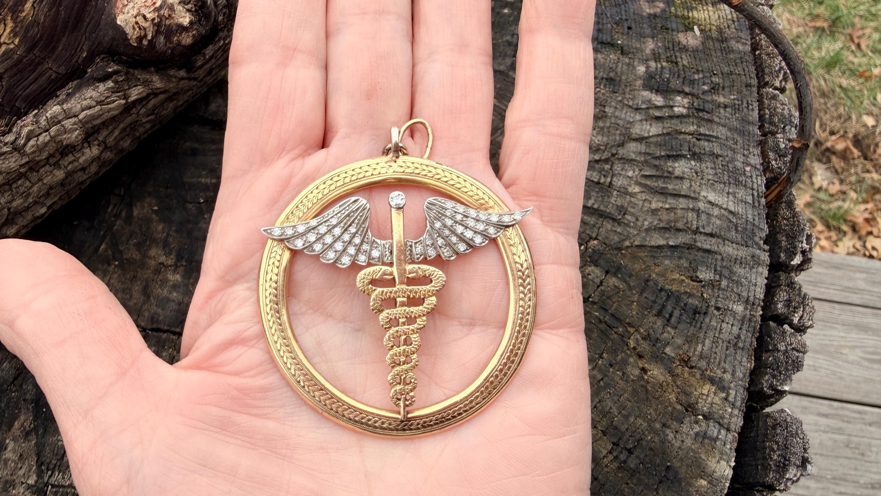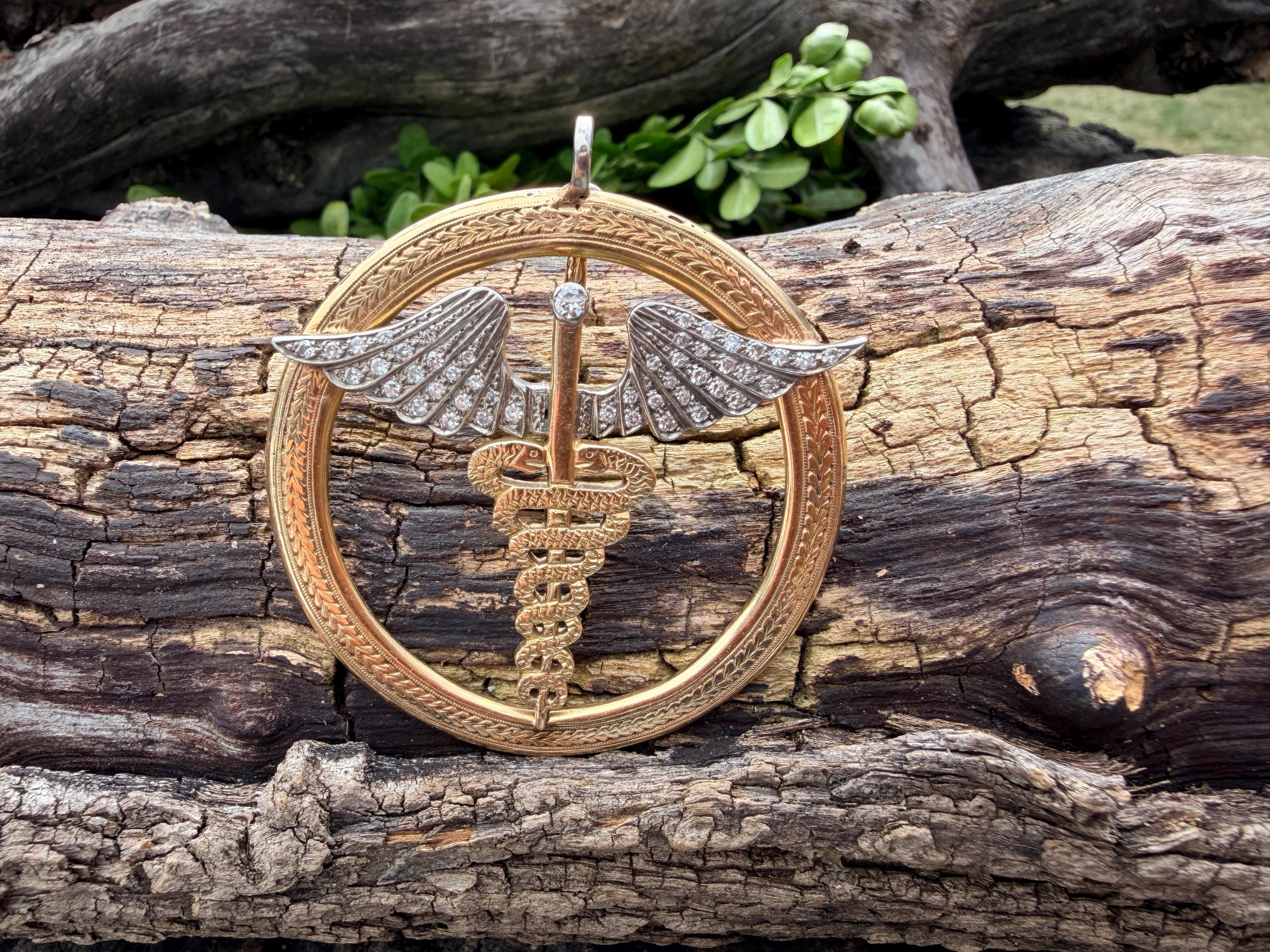 Whats up doc? This sensational large caduceus charm Is crafted in 14k yellow gold. The caduceus, a staff with two snakes coiled around it with 2 wings, is the official insignia of the United States Medical Corps, Navy Pharmacy Division, and the Public Health Service. The caduceus is also the magic wand carried by Hermes (the Romans knew him as Mercury), the messenger of the gods. This charm is intricately structured with attention to details. The wings are blanketed in diamonds bringing this piece to another level of stunning. The diamonds have a total approx weight of .65 ct. They are H in color and VS2 in clarity. The symbol sits in a large textured gold circular frame. It weighs 25.79 grams. It measures 2"x 2".