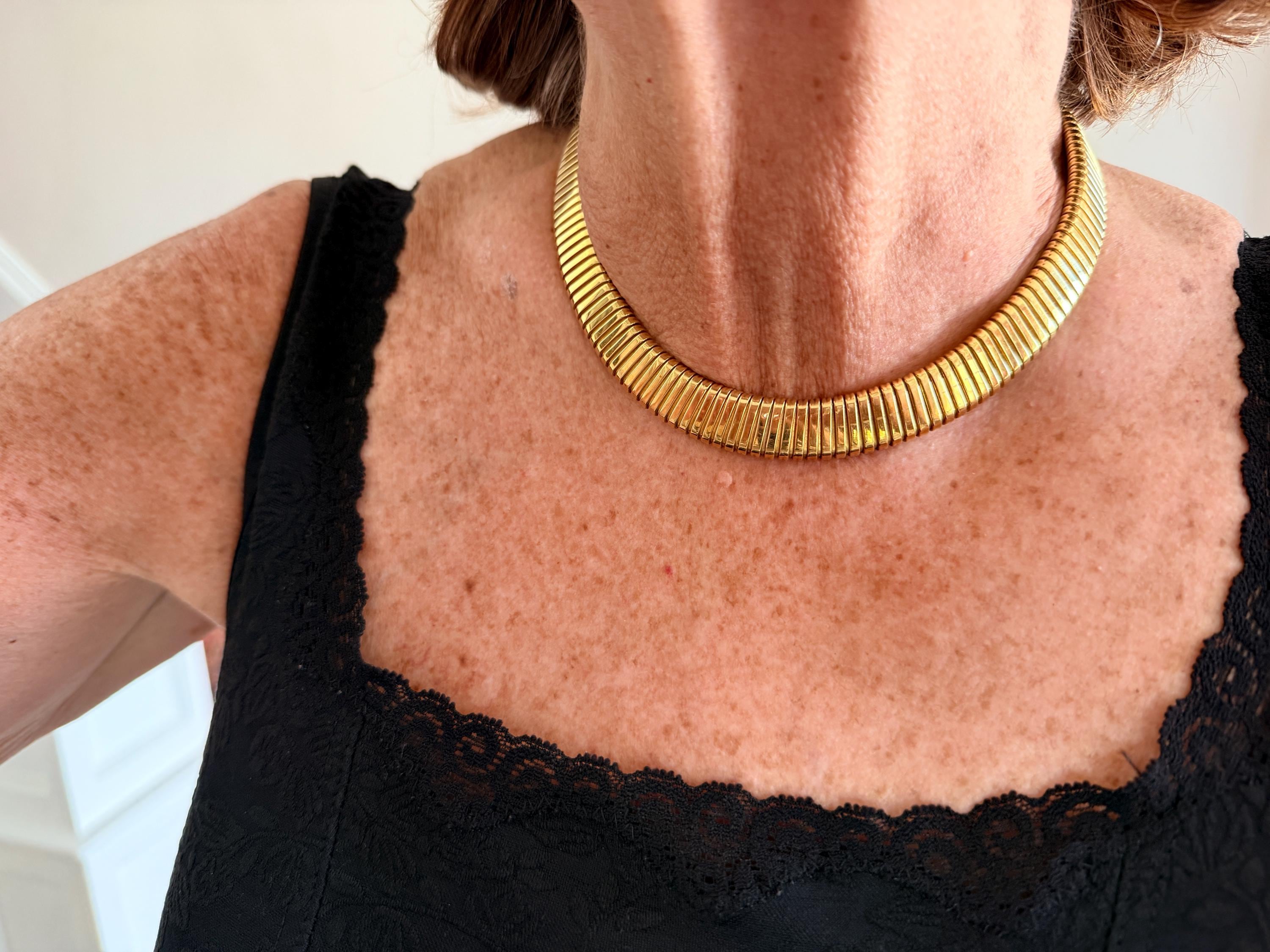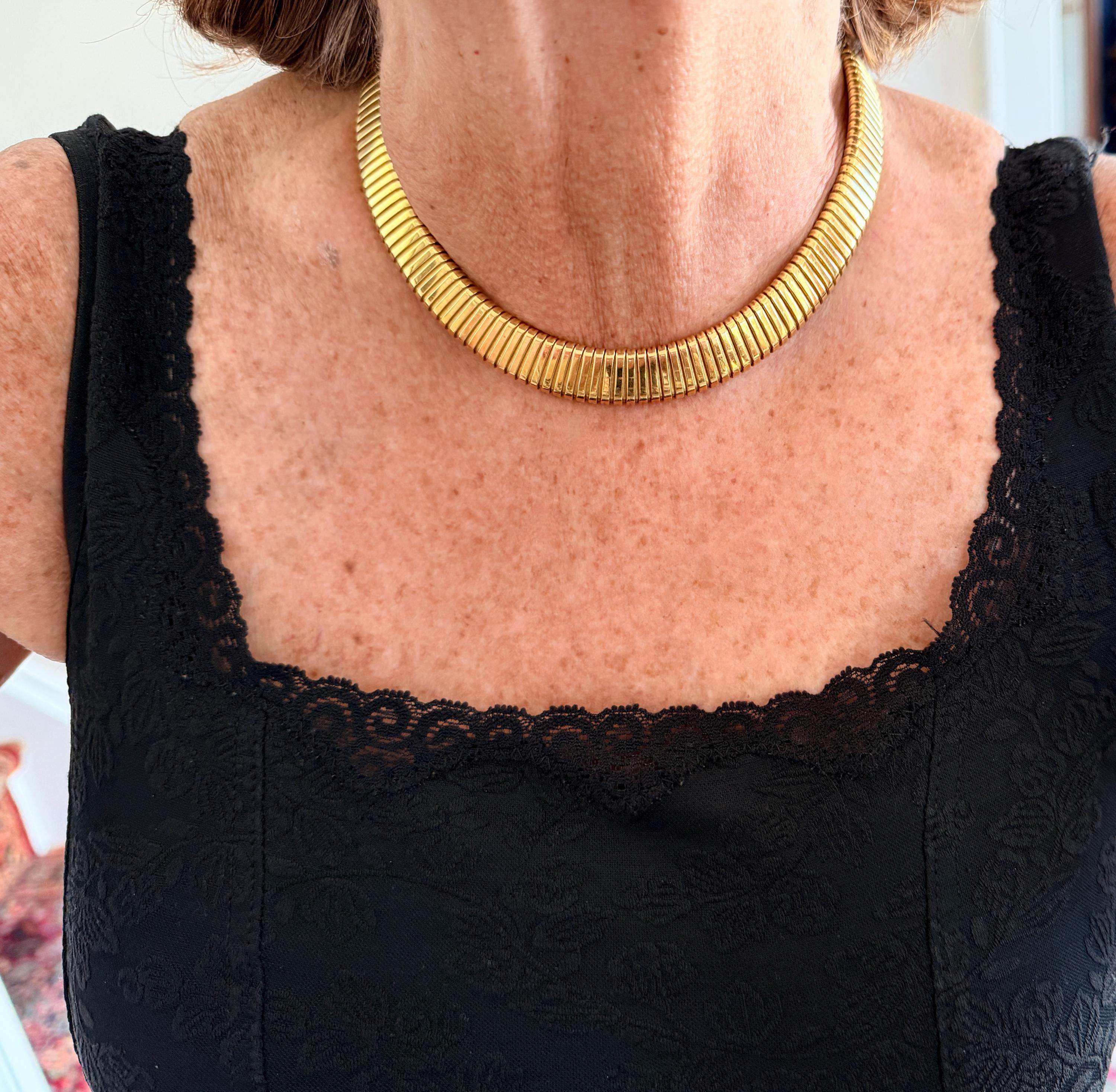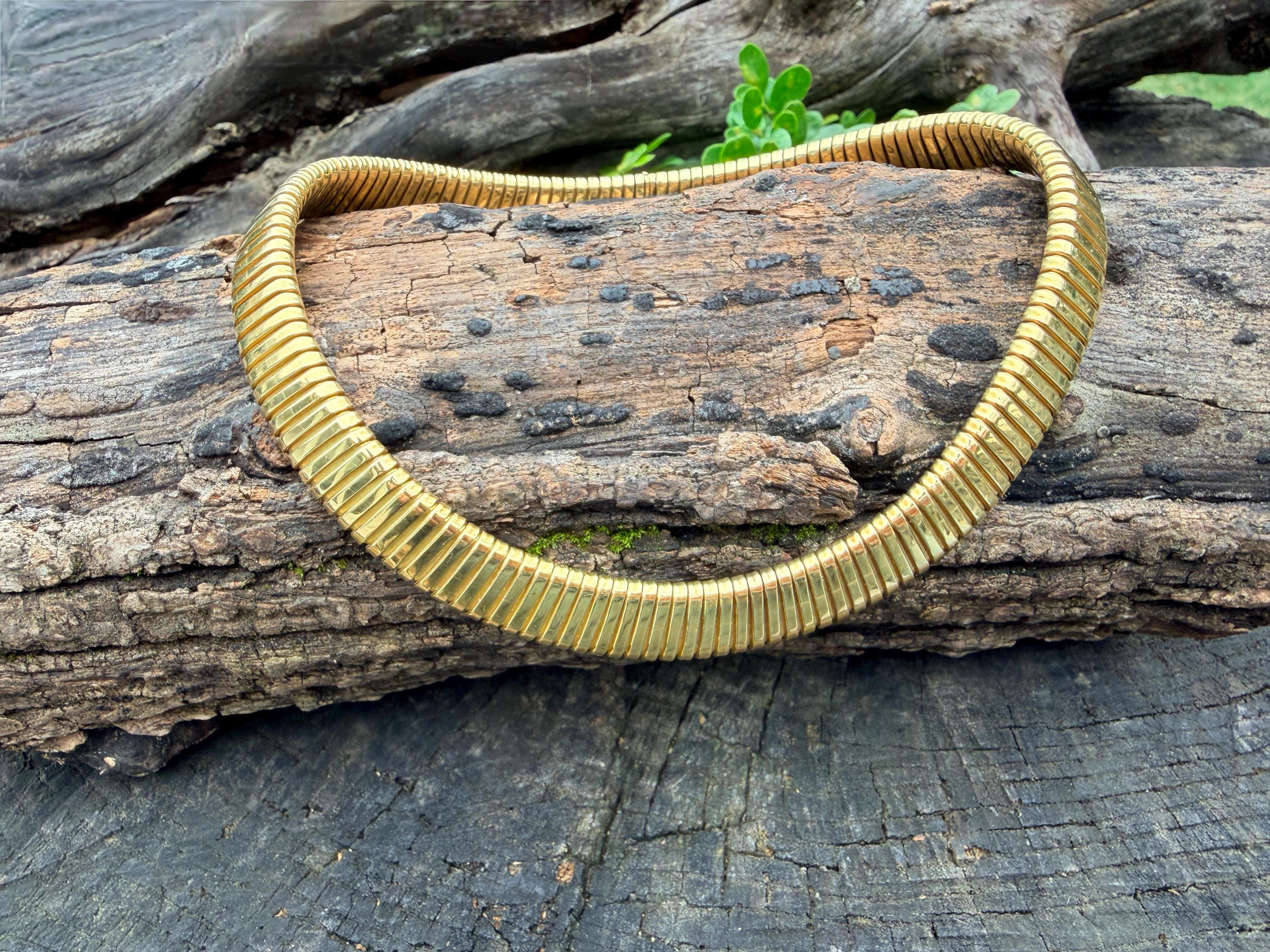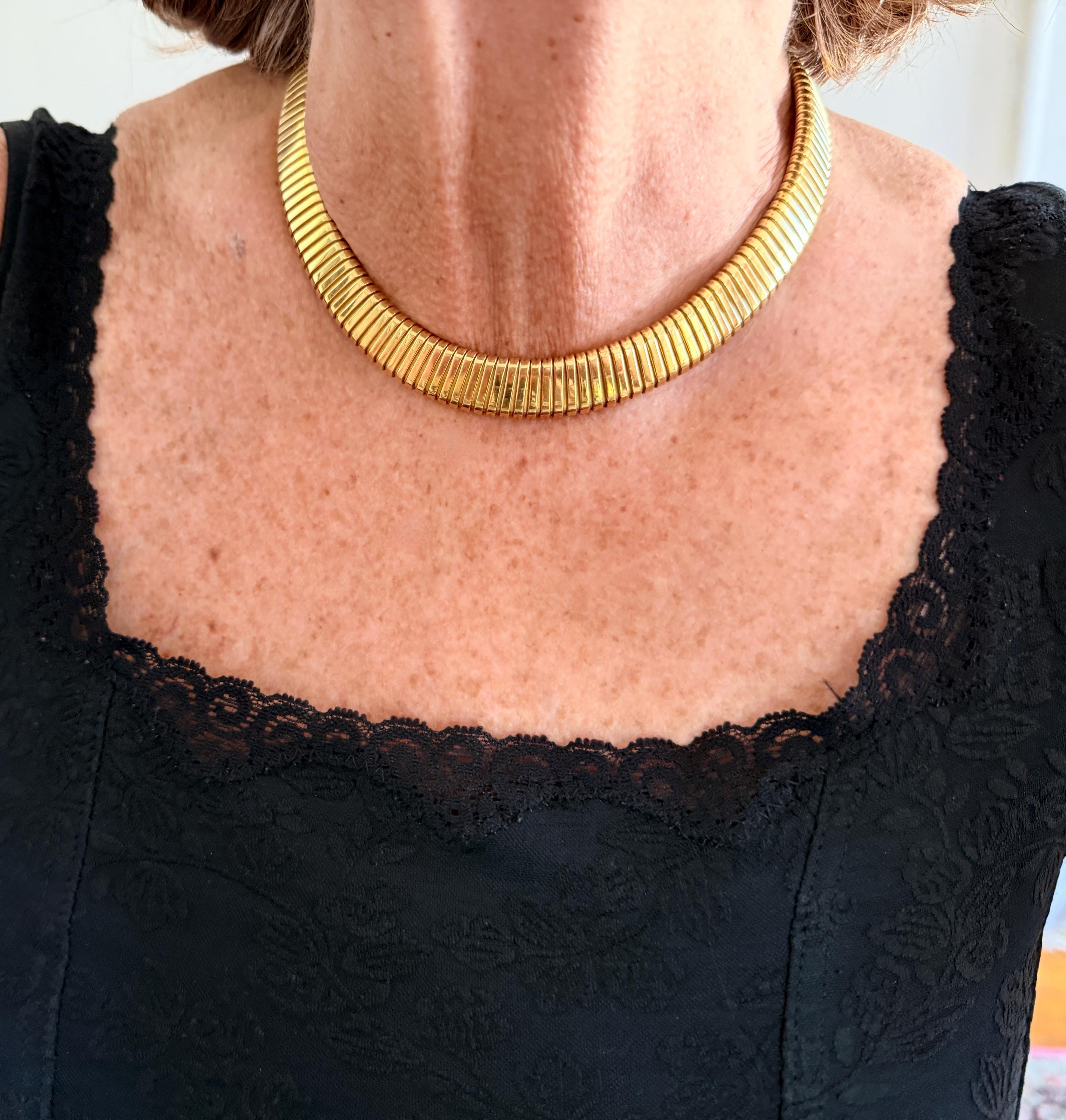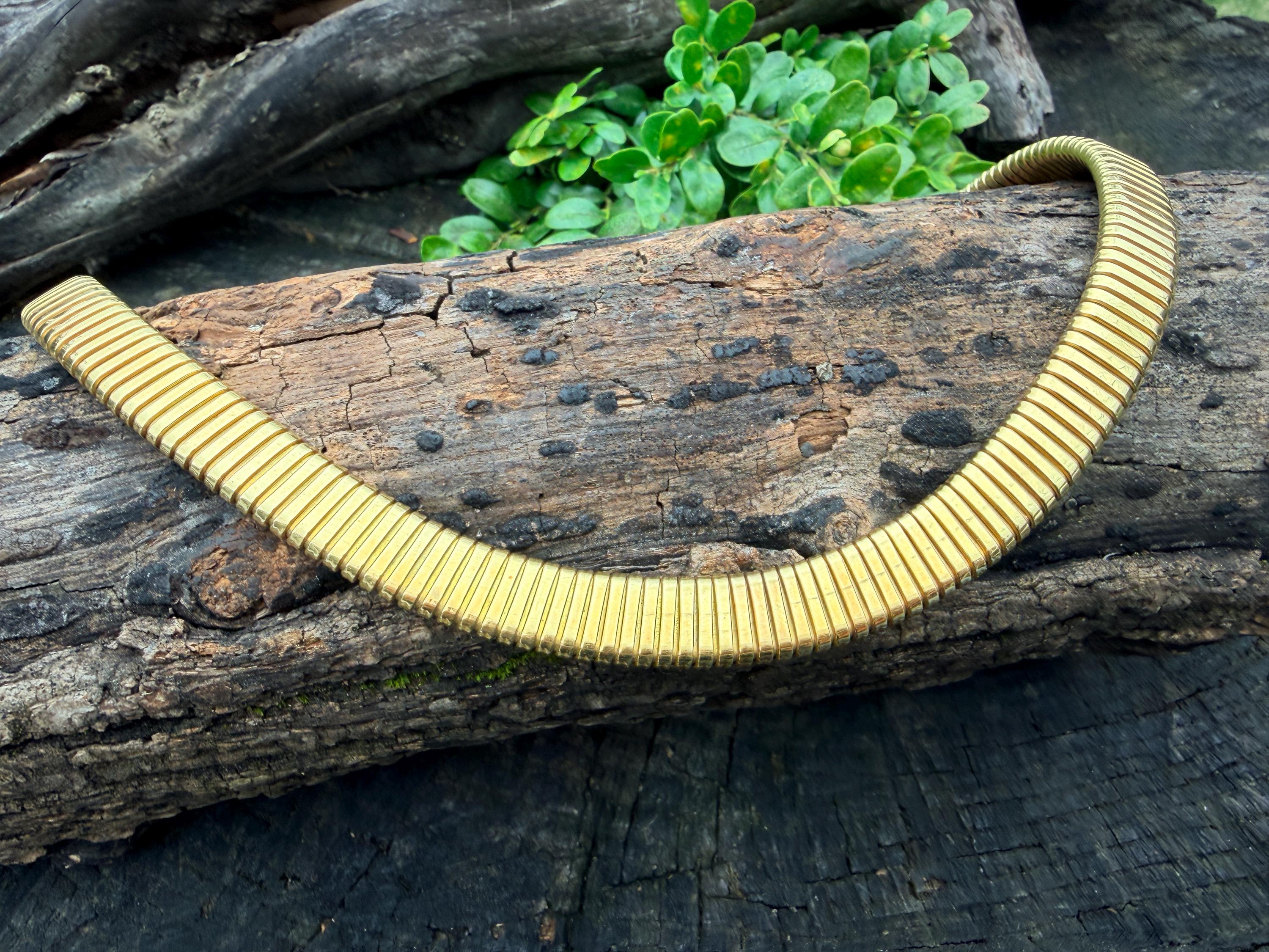 Slinky and swanky, this vintage gold wide snake chain choker is set in 18k yellow gold. This dramatic piece dates from the 1960’s. The luxuriously textured ribbed gold choker is a provocative beauty . The choker measures 16" long and 1/2" wide. It weighs 50.50 grams. It is marked 18k. Boldly Beautiful