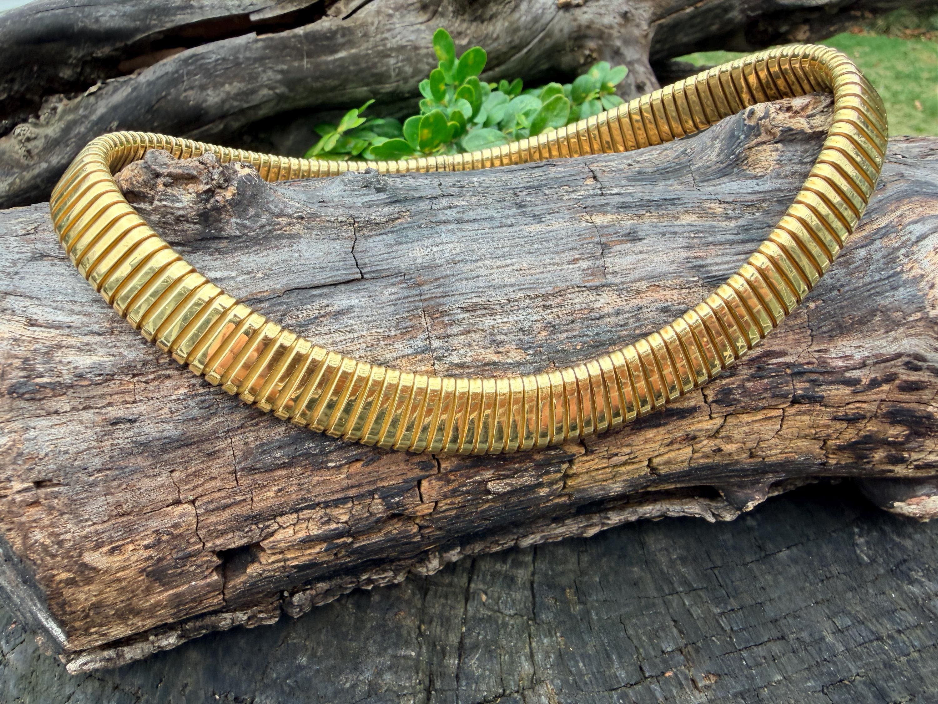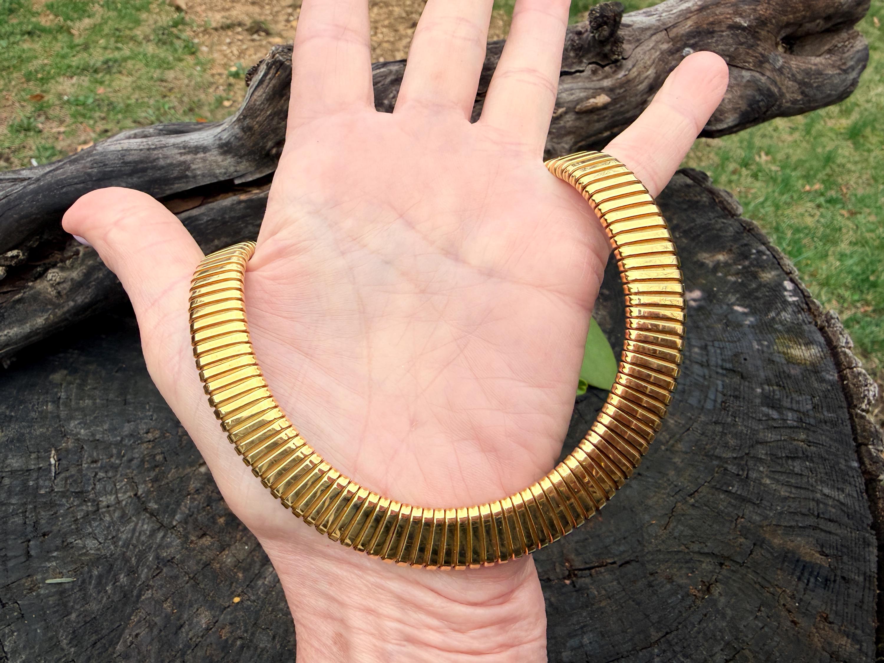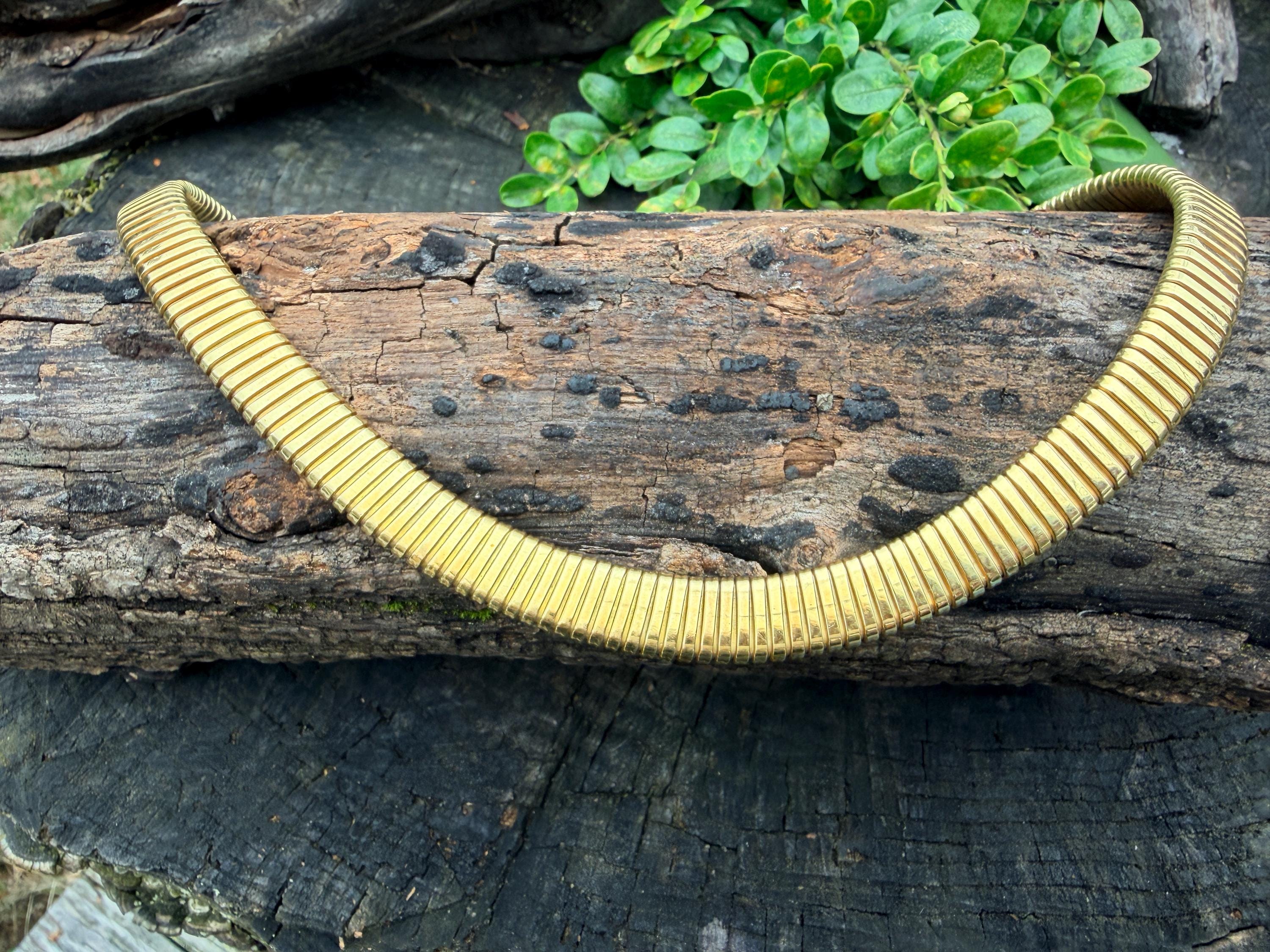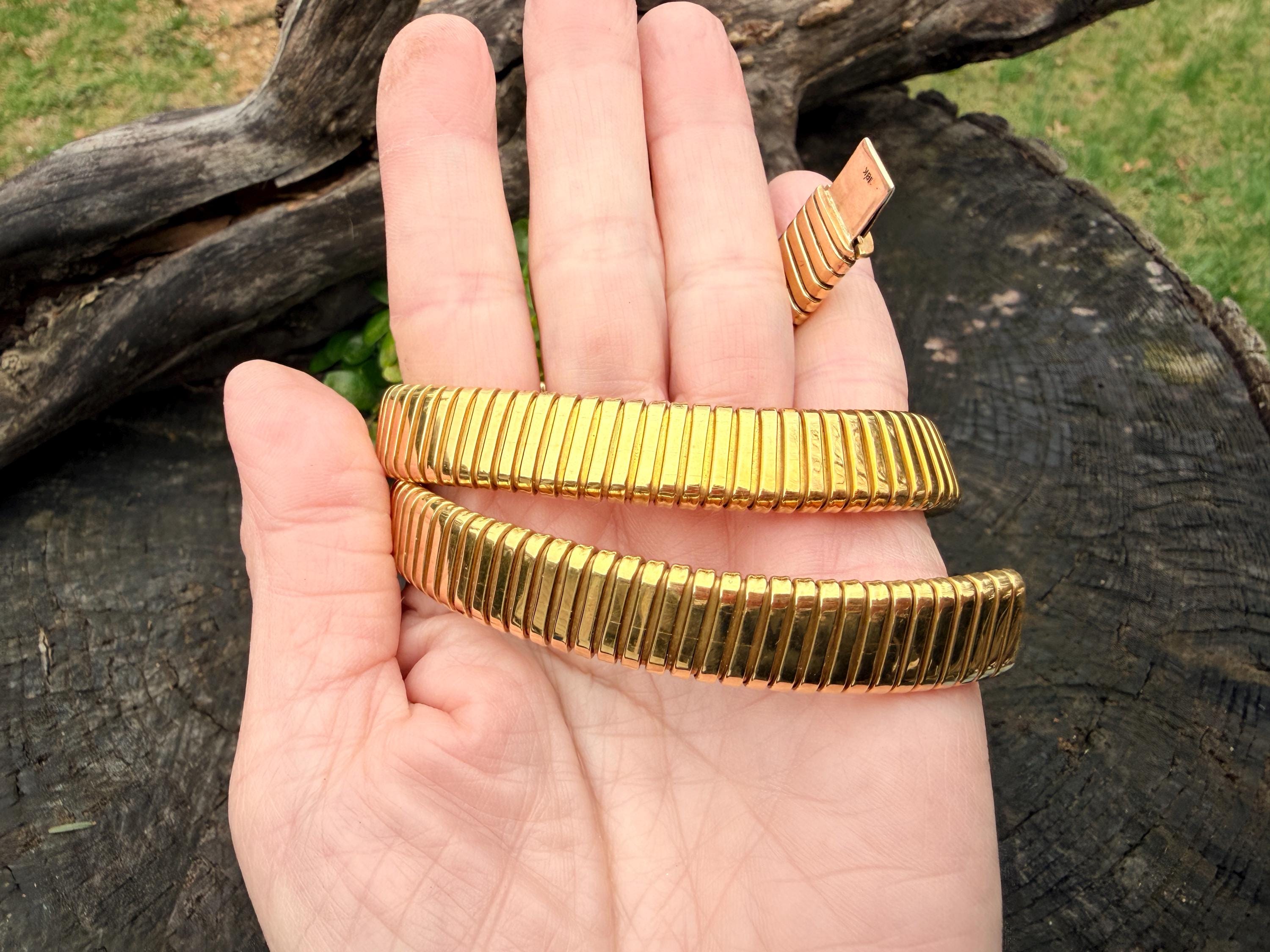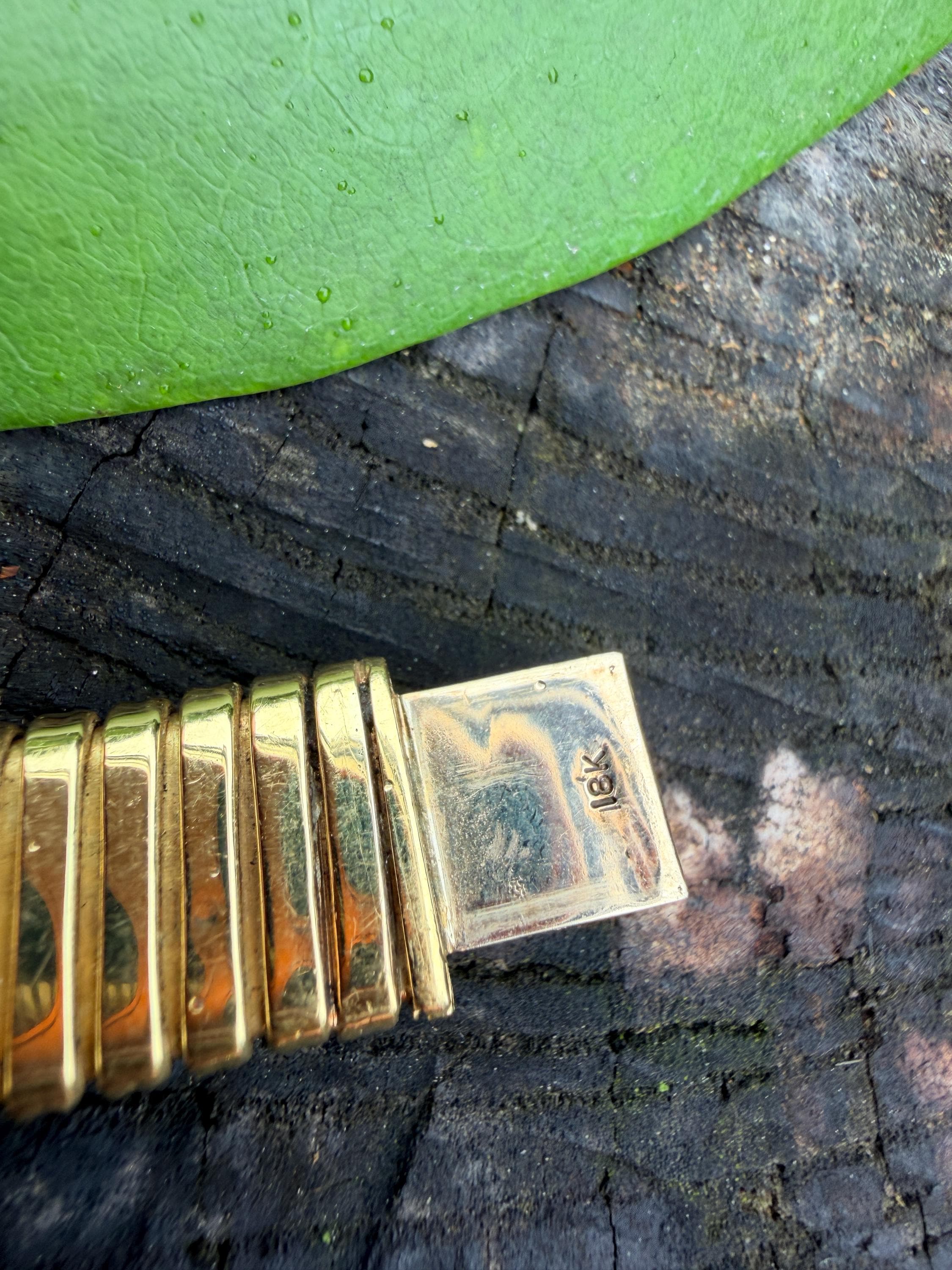 Slinky and swanky, this vintage gold wide snake chain choker is set in 18k yellow gold. This dramatic piece dates from the 1960’s. The luxuriously textured ribbed gold choker is a provocative beauty . The choker measures 16" long and 1/2" wide. It weighs 50.50 grams. It is marked 18k. Boldly Beautiful