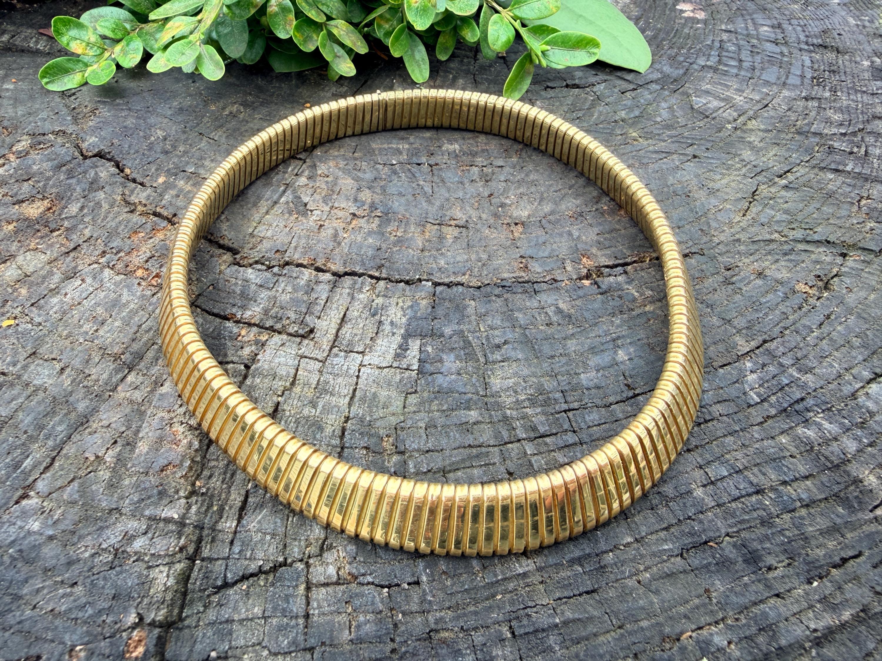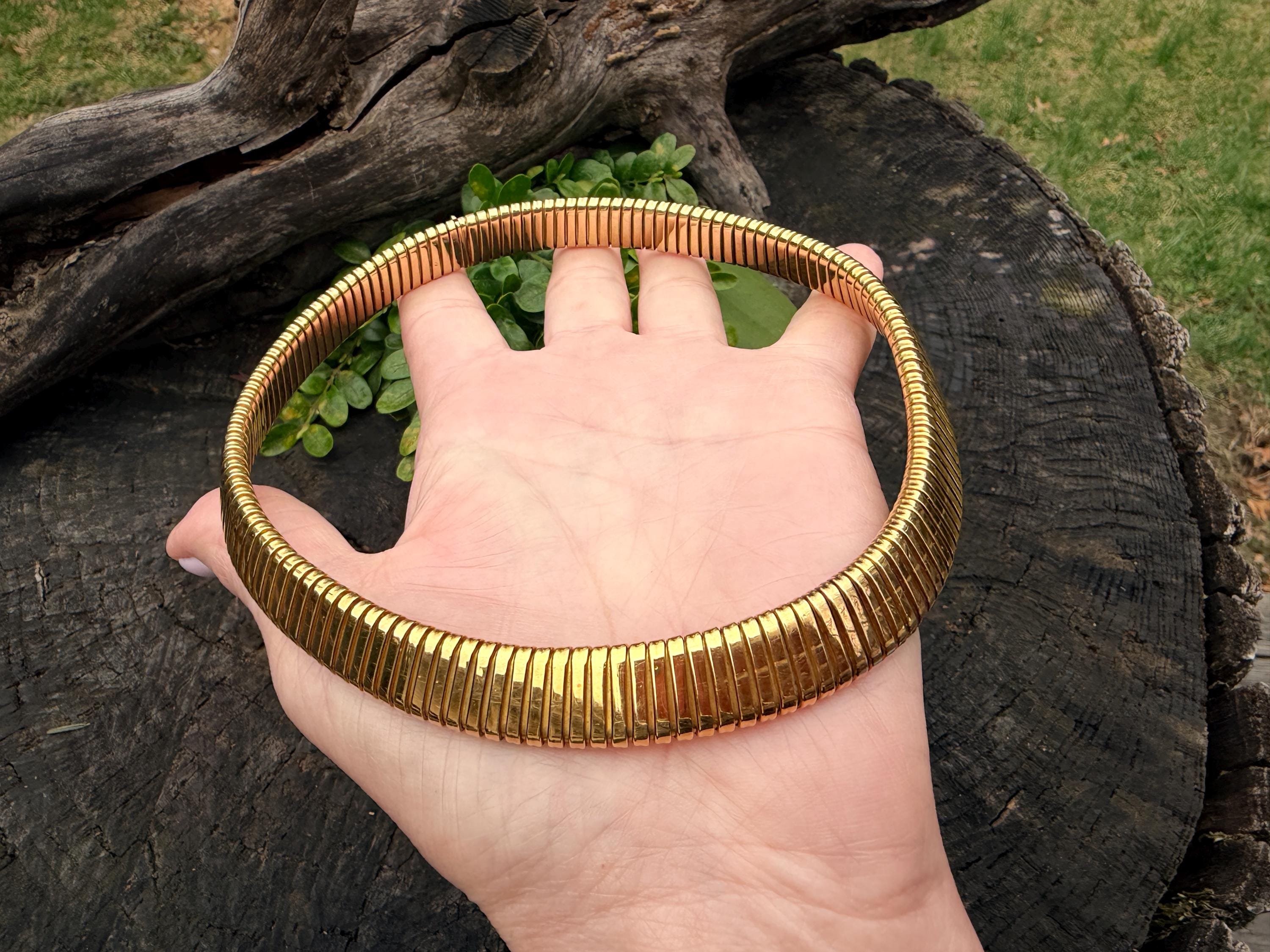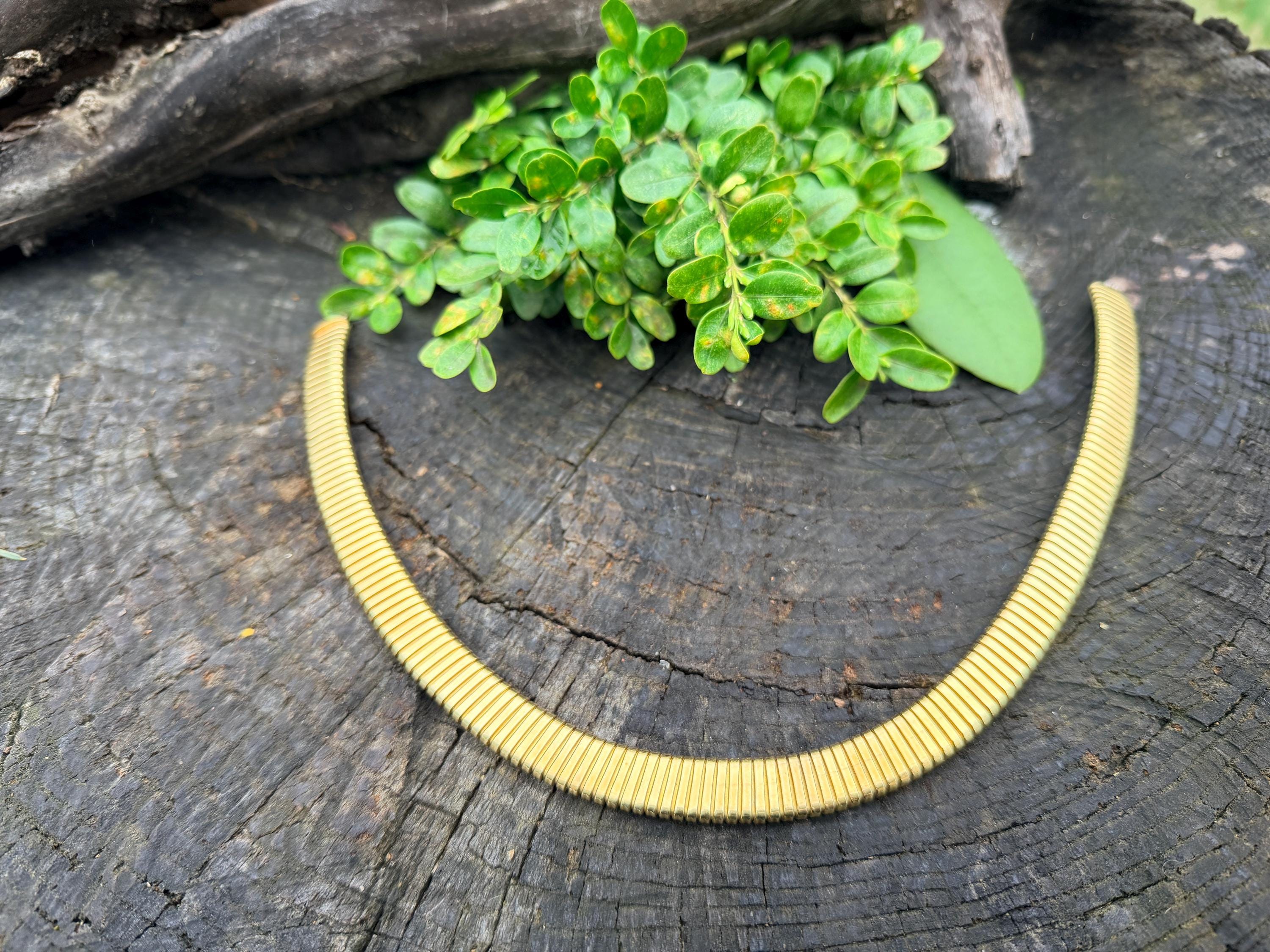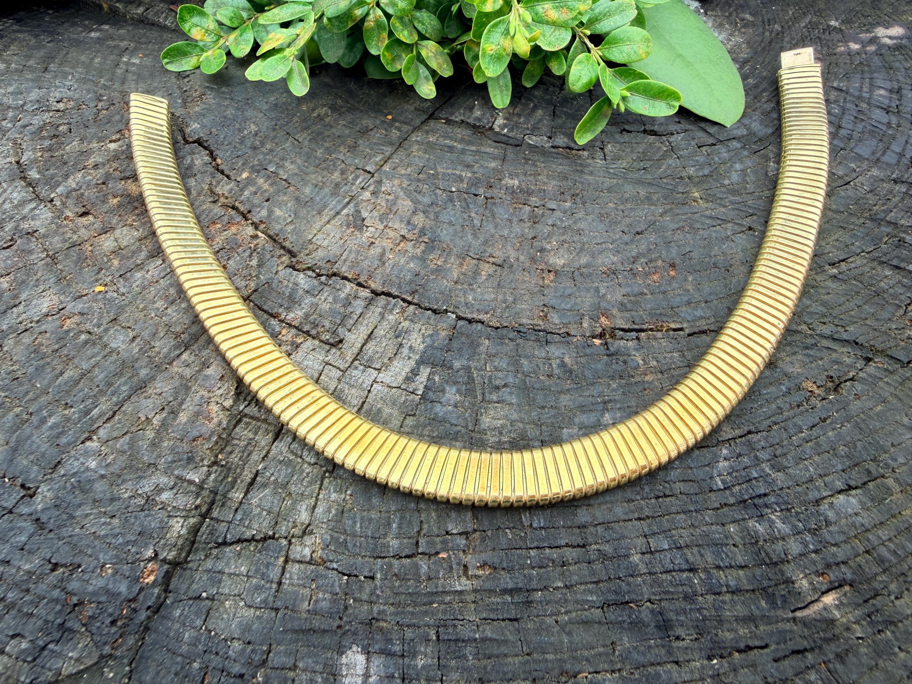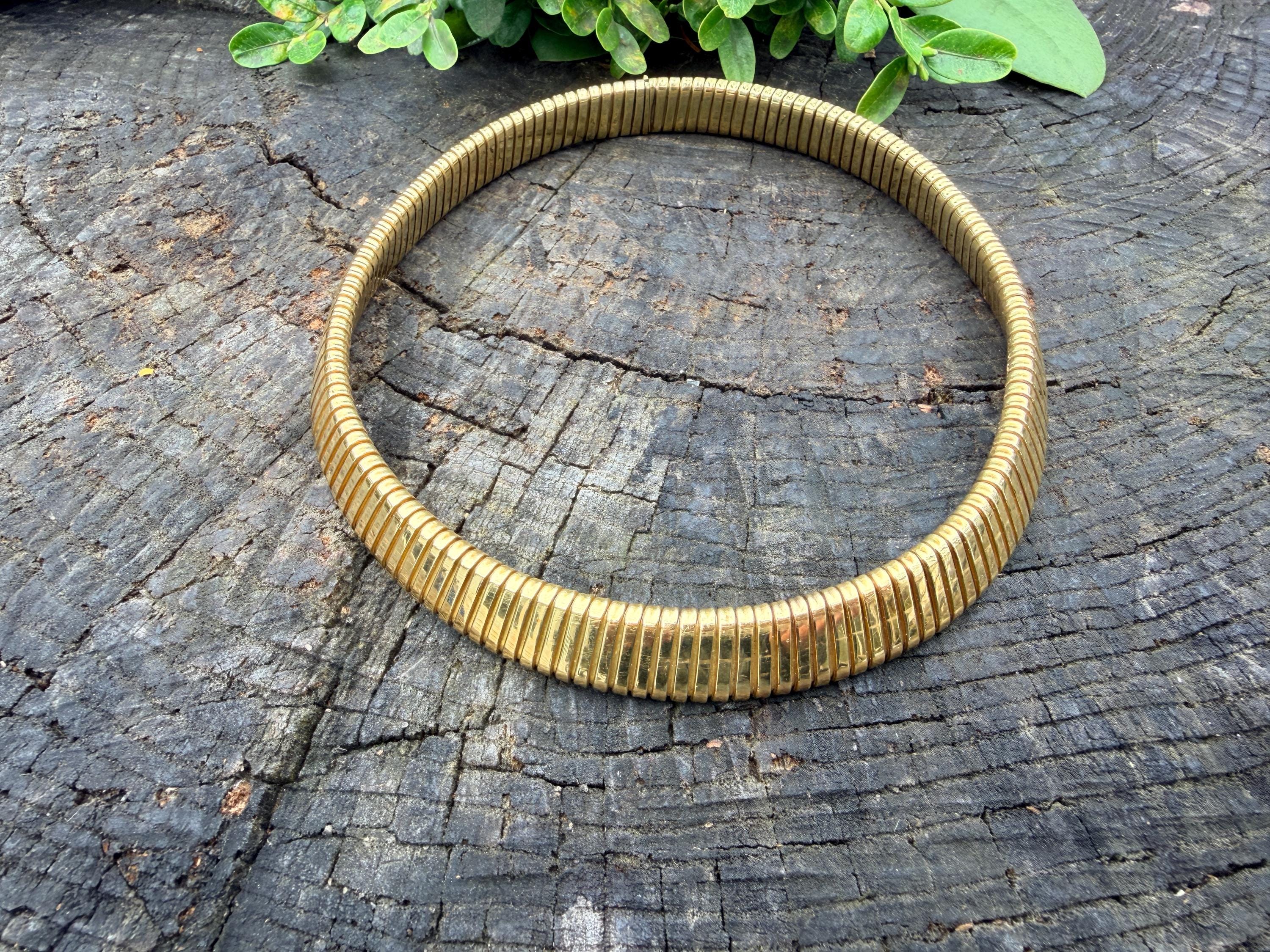 Slinky and swanky, this vintage gold wide snake chain choker is set in 18k yellow gold. This dramatic piece dates from the 1960’s. The luxuriously textured ribbed gold choker is a provocative beauty . The choker measures 16" long and 1/2" wide. It weighs 50.50 grams. It is marked 18k. Boldly Beautiful