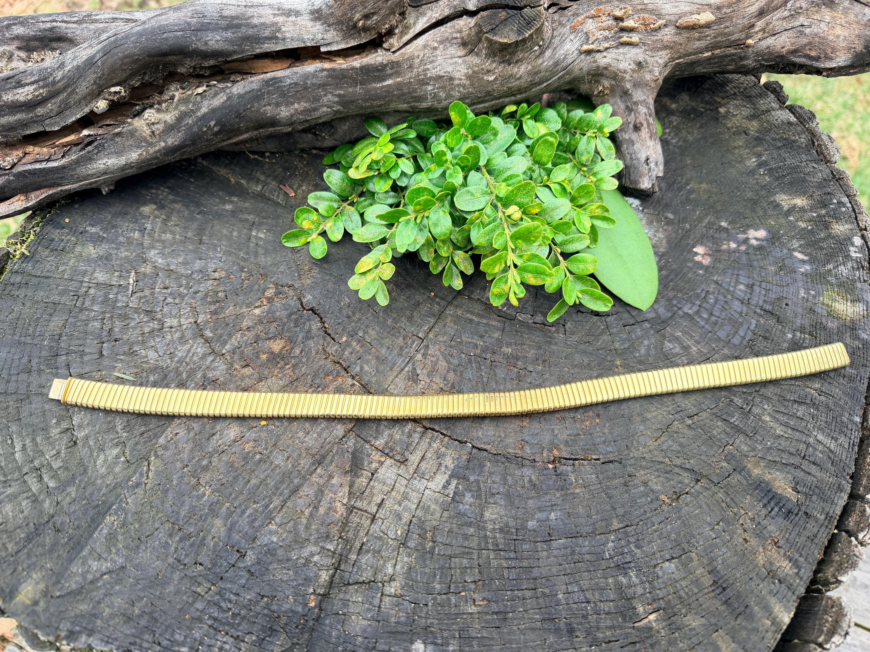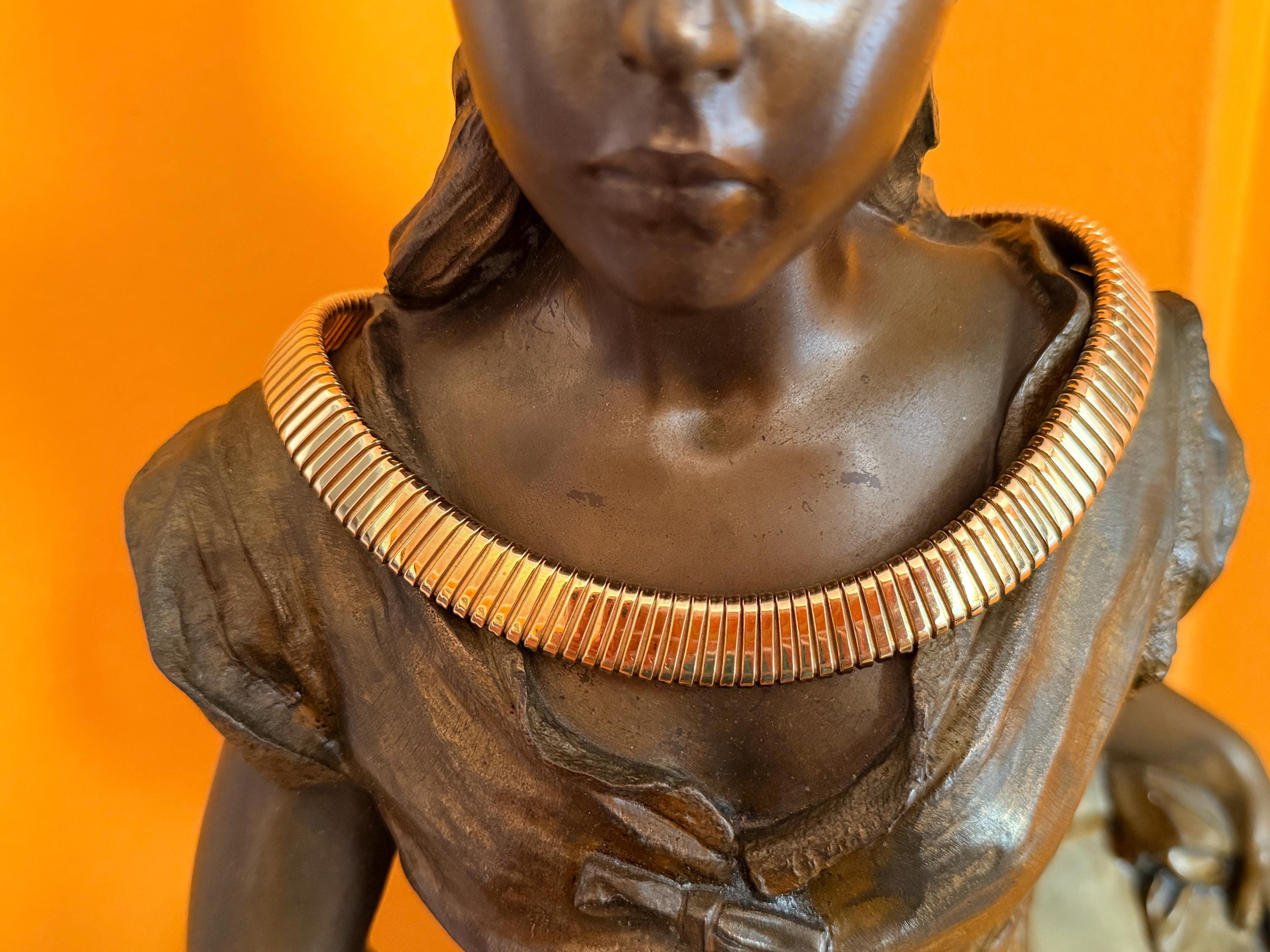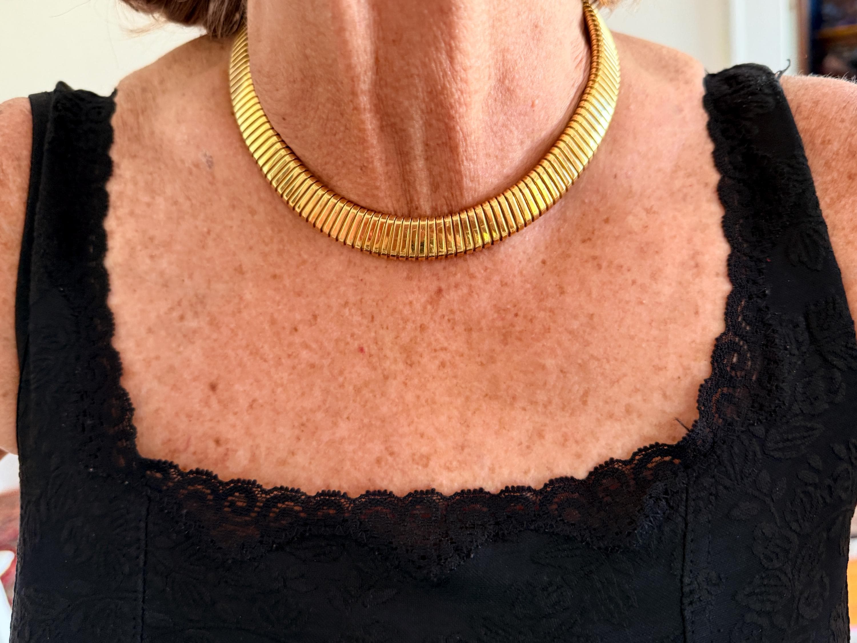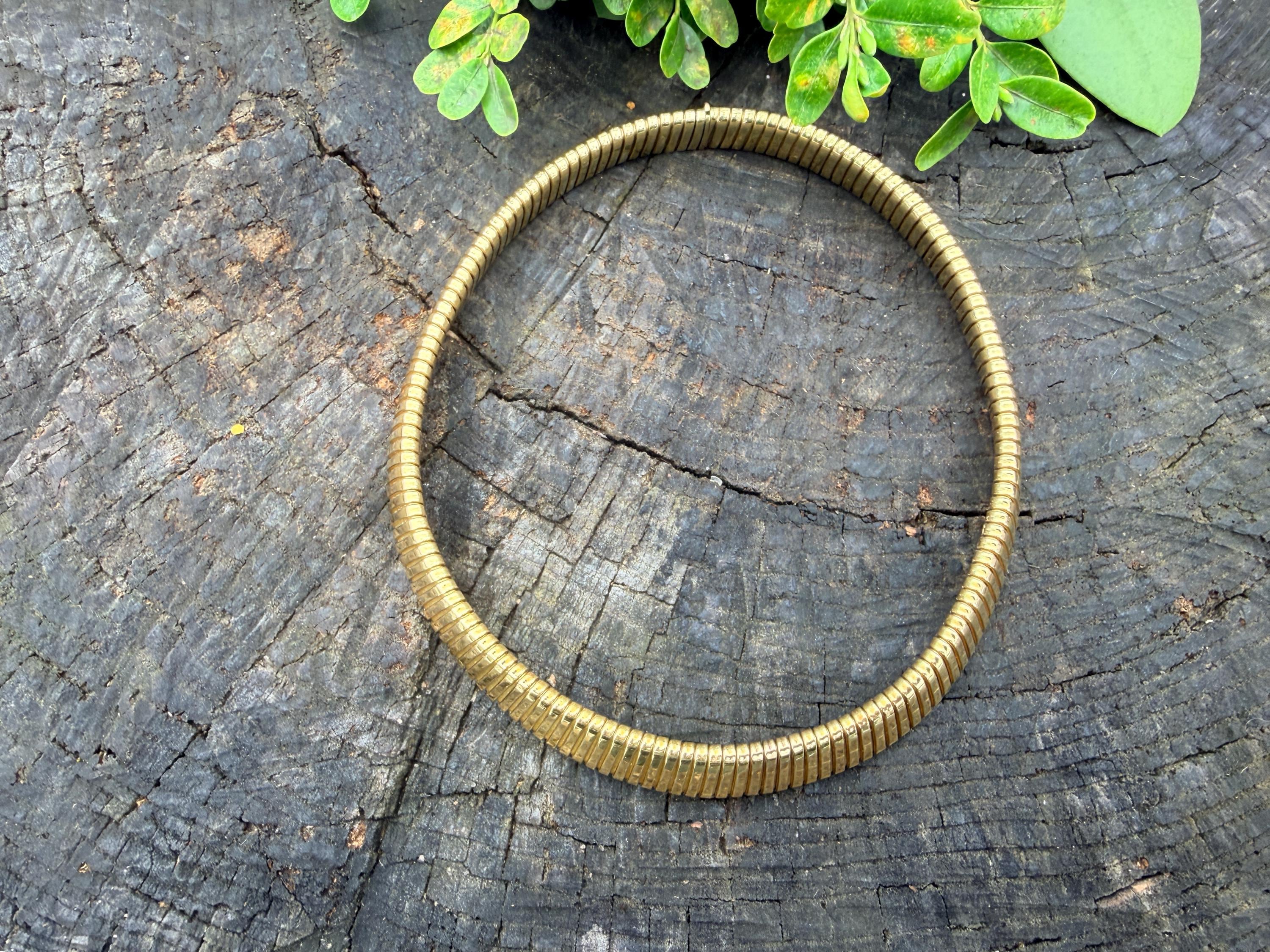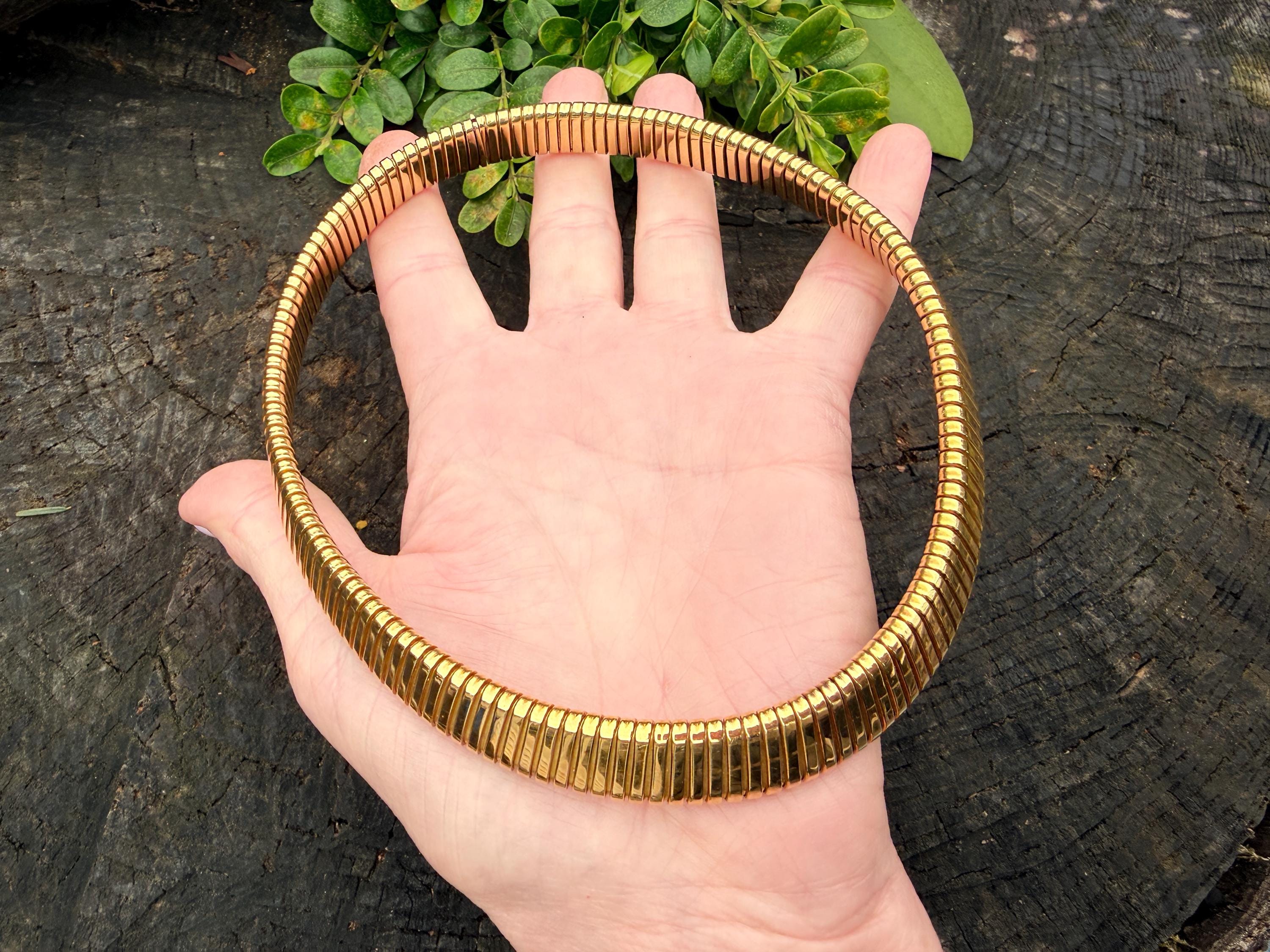 Slinky and swanky, this vintage gold wide snake chain choker is set in 18k yellow gold. This dramatic piece dates from the 1960’s. The luxuriously textured ribbed gold choker is a provocative beauty . The choker measures 16" long and 1/2" wide. It weighs 50.50 grams. It is marked 18k. Boldly Beautiful