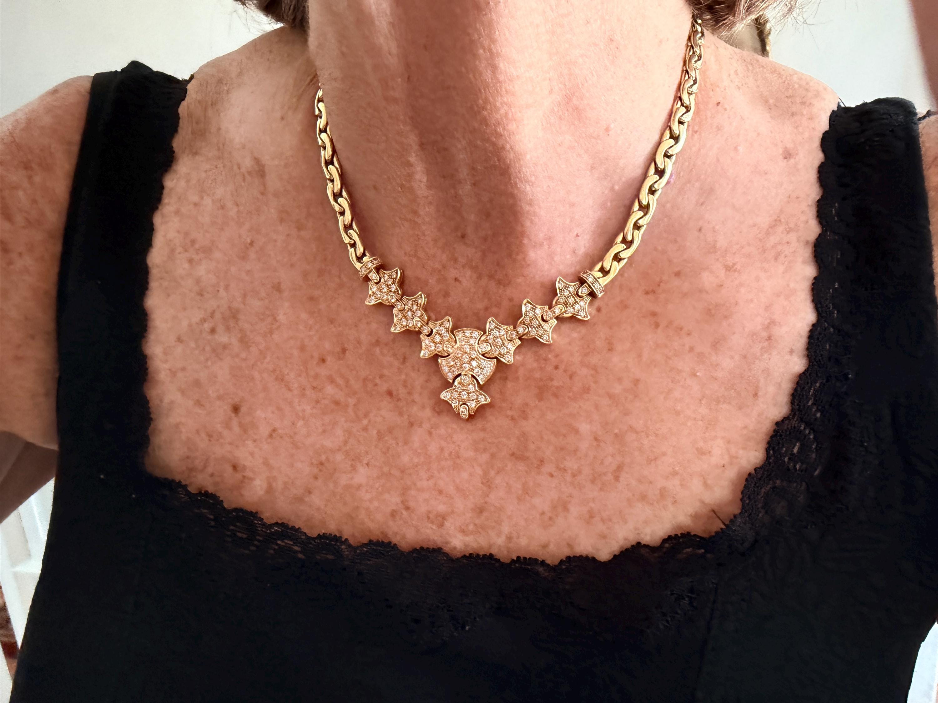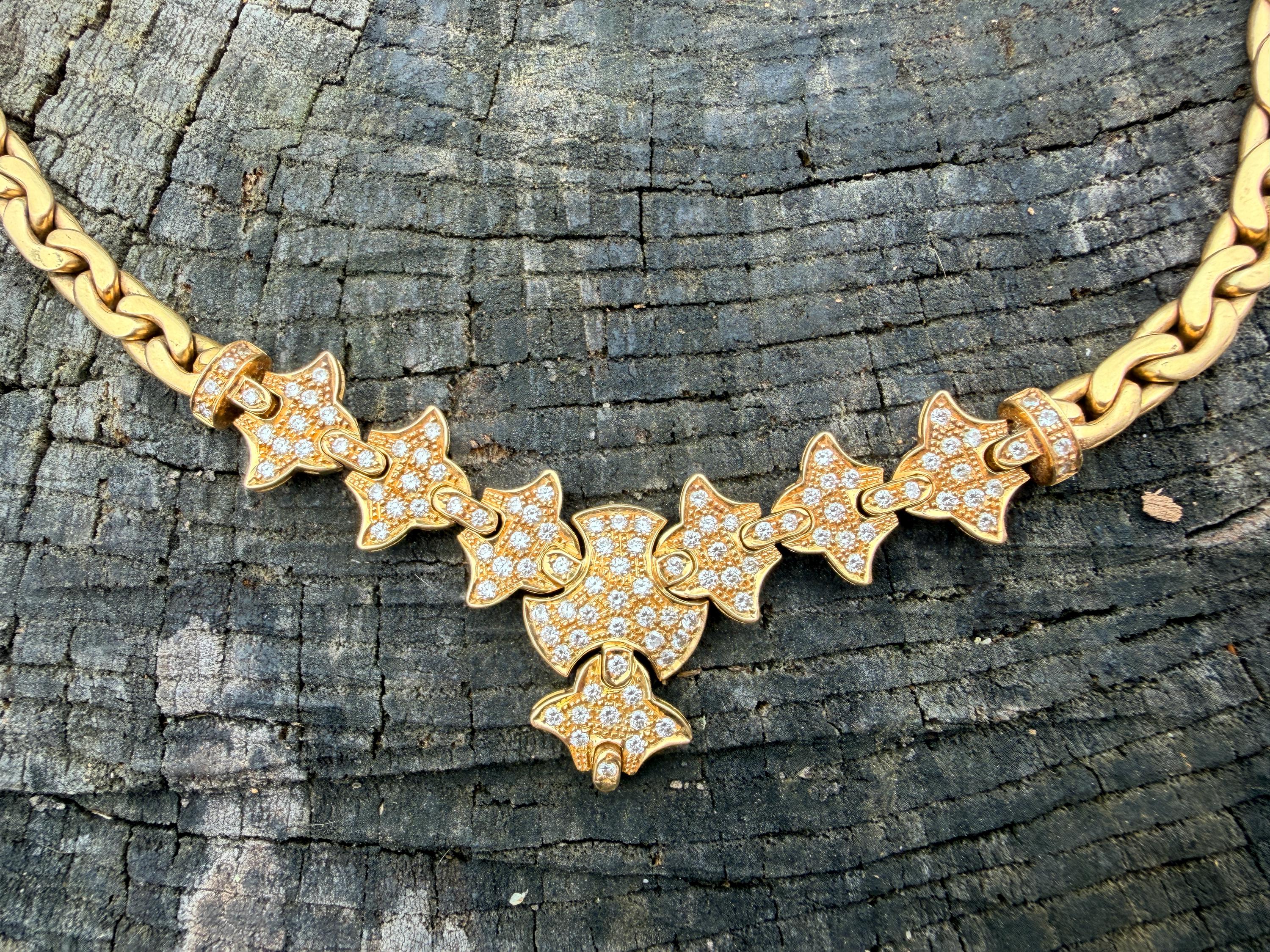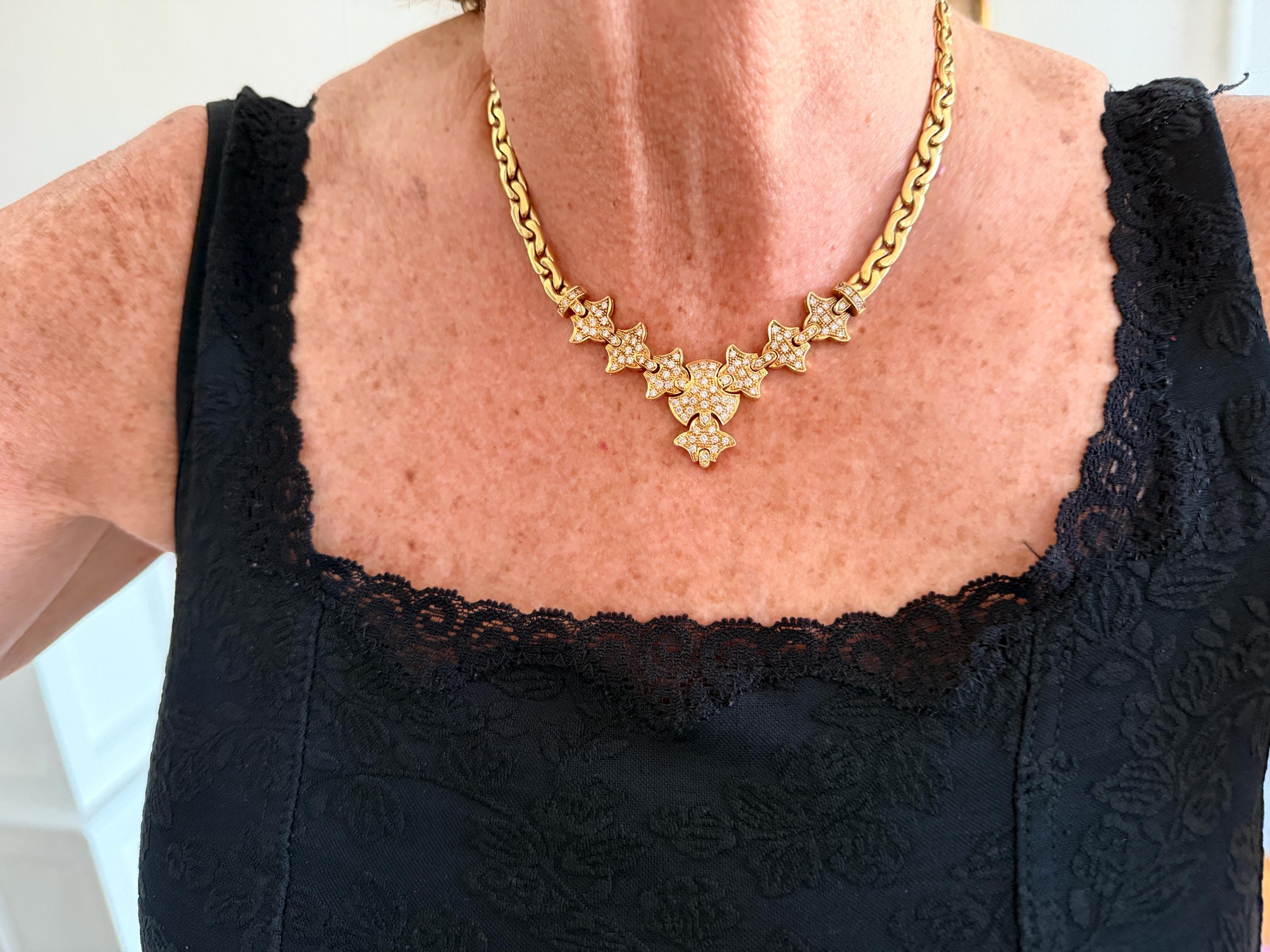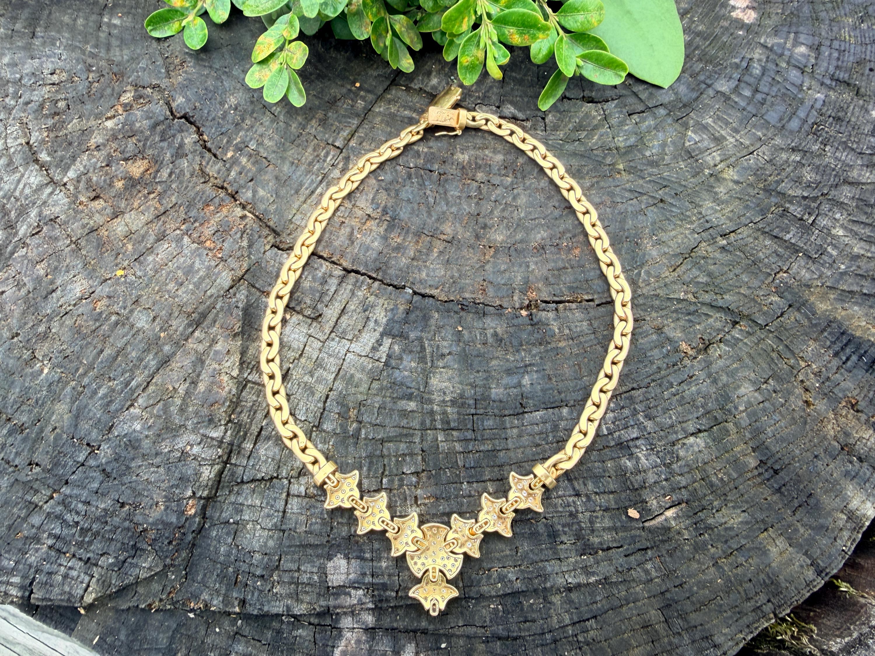 Set in 19k yellow gold, this attention grabbing Portuguese diamond necklace dates from the 1980’s. The "V" shaped diamond drop necklace is studded with glittering round diamonds all set within a stunning orange design. Holding it all together is a swervy, sexy thick gold chain that beautifully compliments the pattern. The total approx. weight of the diamonds are 1.75 ct. All diamonds are G in color and VS1 in clarity. Adding intrigue and making an impact is the purpose of this piece. The necklace weighs 76.03 grams. The necklace measures 16". The chain is 3/16". The drop pendant is 1" long and 1/2" wide. It is marked 800 (19k).