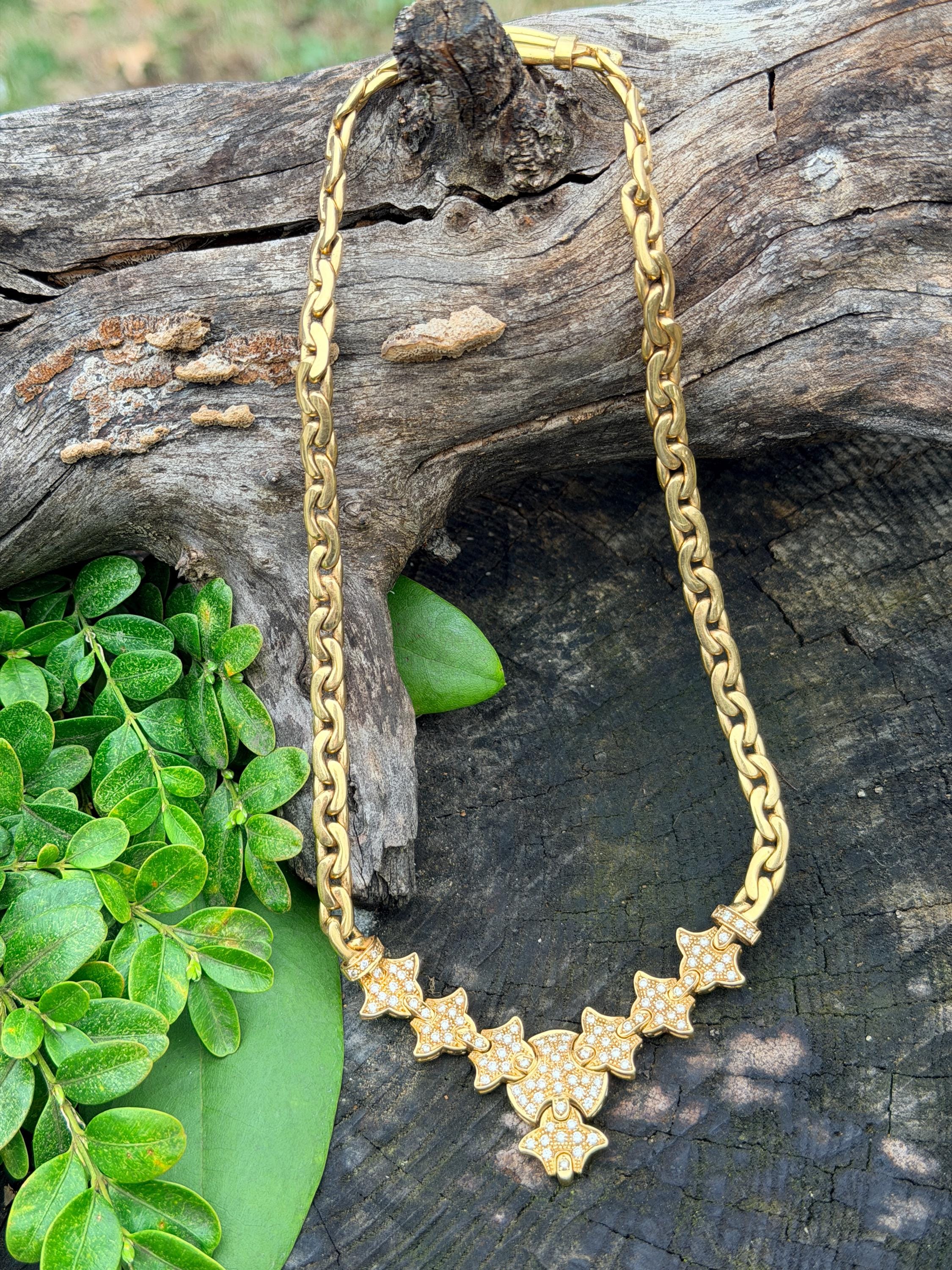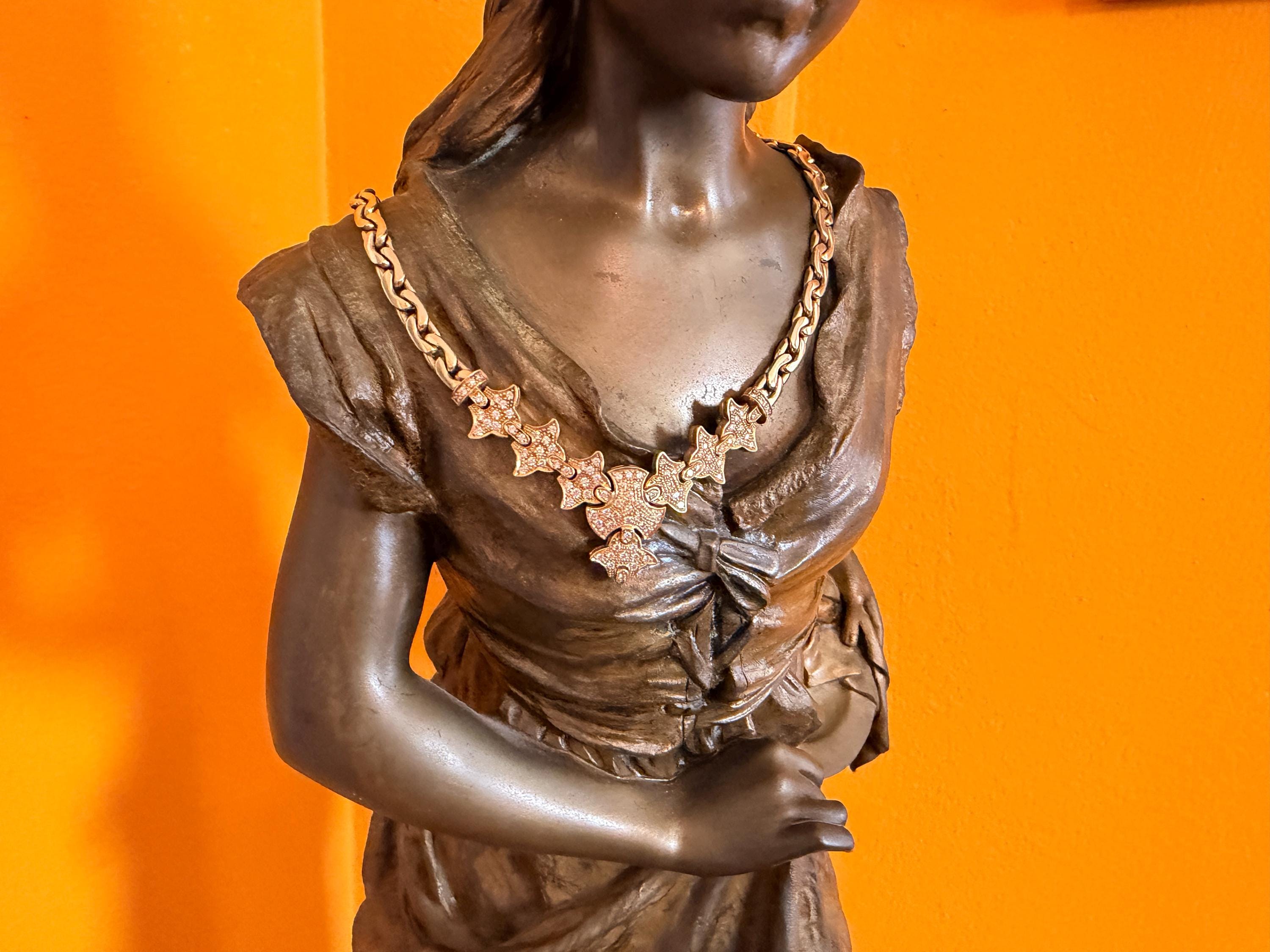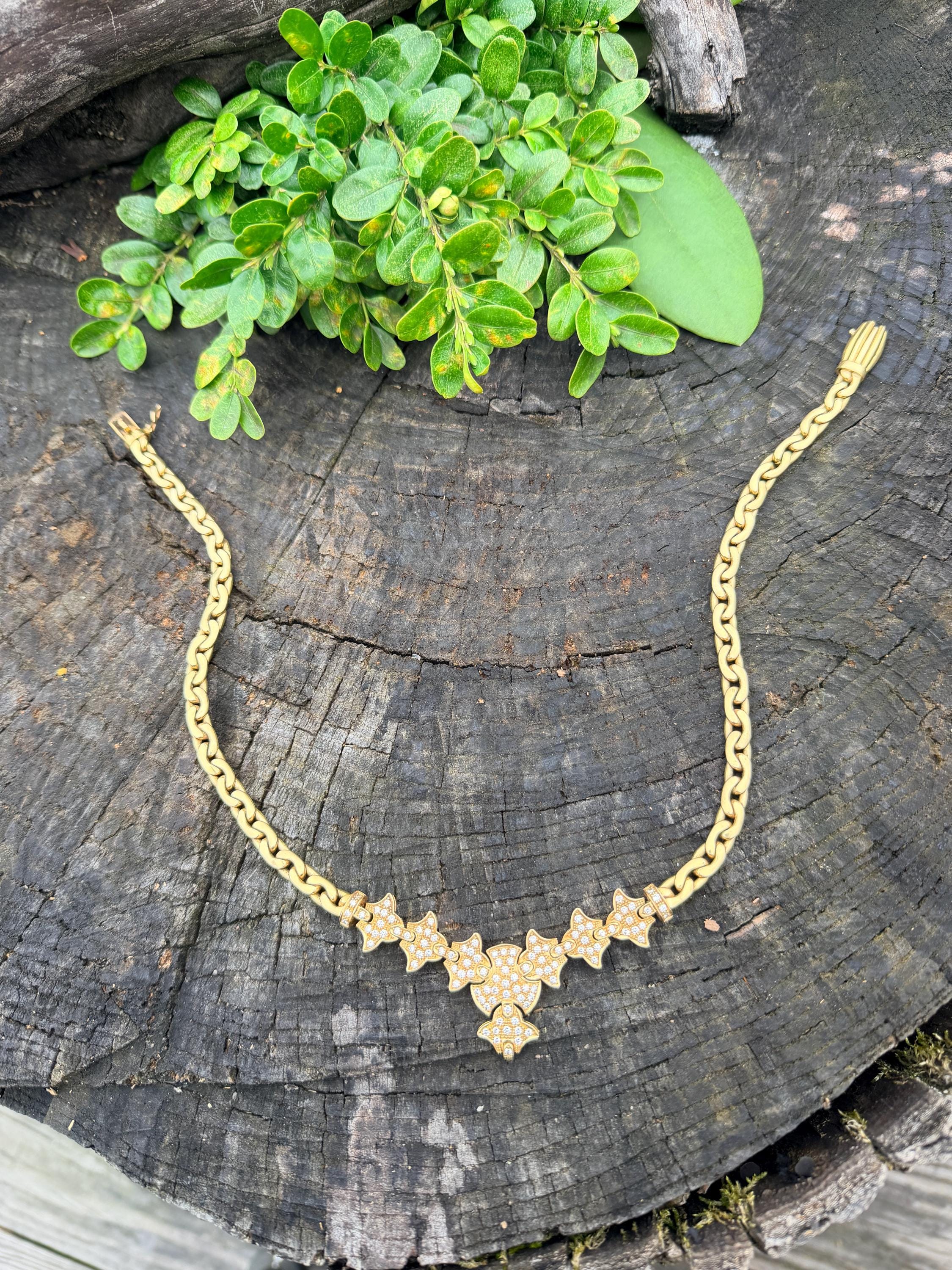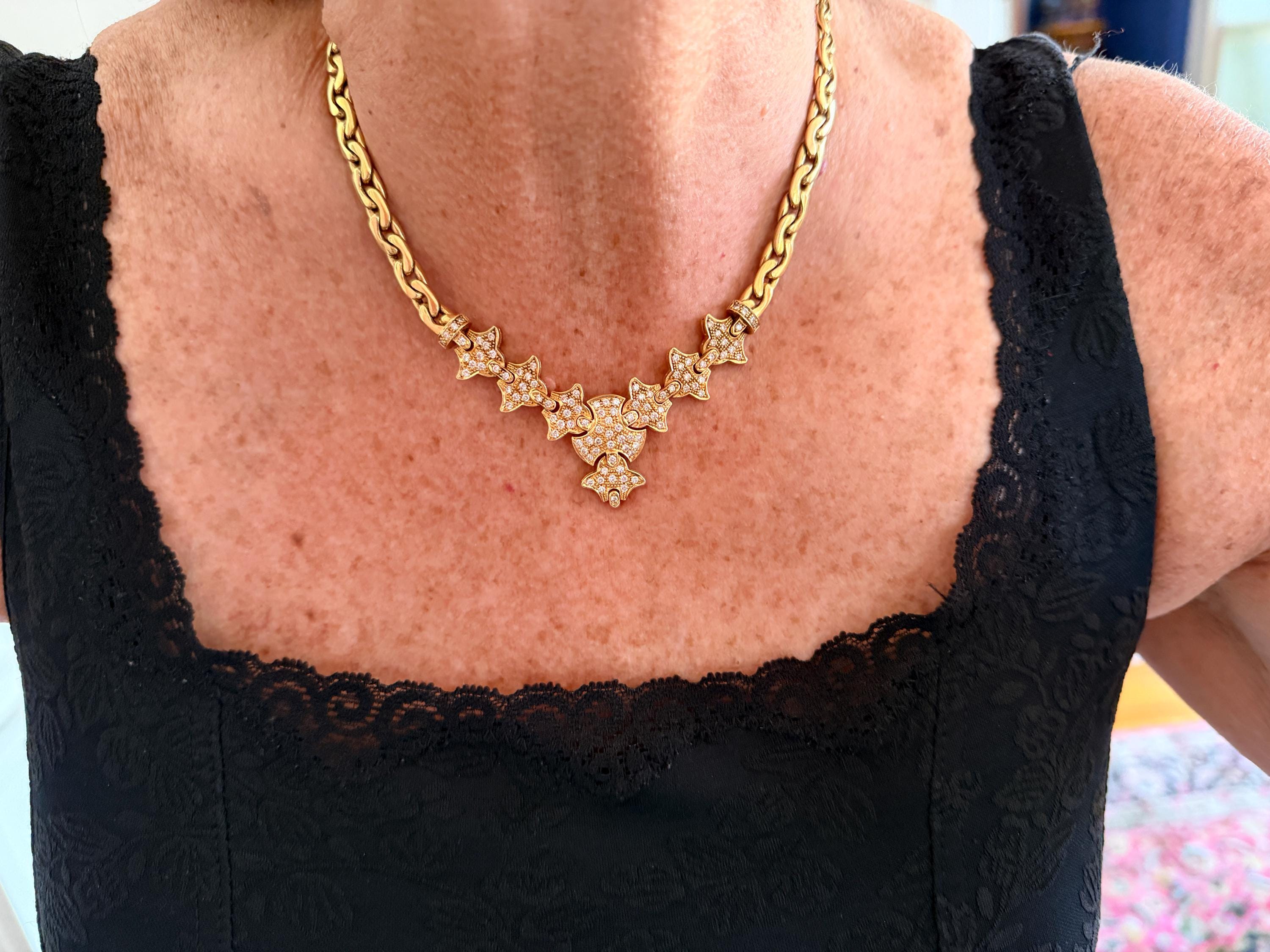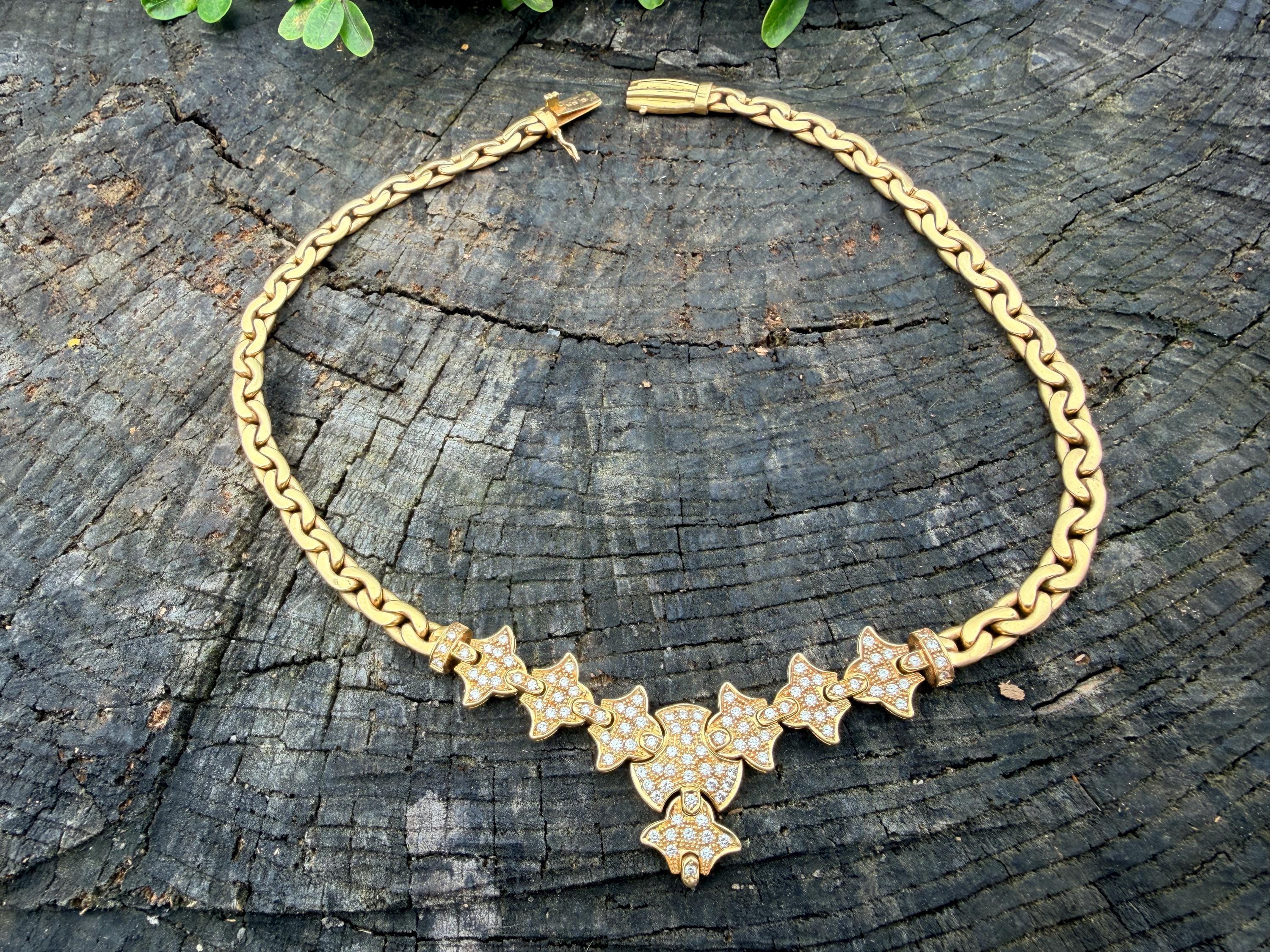 Set in 19k yellow gold, this attention grabbing Portuguese diamond necklace dates from the 1980’s. The "V" shaped diamond drop necklace is studded with glittering round diamonds all set within a stunning orange design. Holding it all together is a swervy, sexy thick gold chain that beautifully compliments the pattern. The total approx. weight of the diamonds are 1.75 ct. All diamonds are G in color and VS1 in clarity. Adding intrigue and making an impact is the purpose of this piece. The necklace weighs 76.03 grams. The necklace measures 16". The chain is 3/16". The drop pendant is 1" long and 1/2" wide. It is marked 800 (19k).