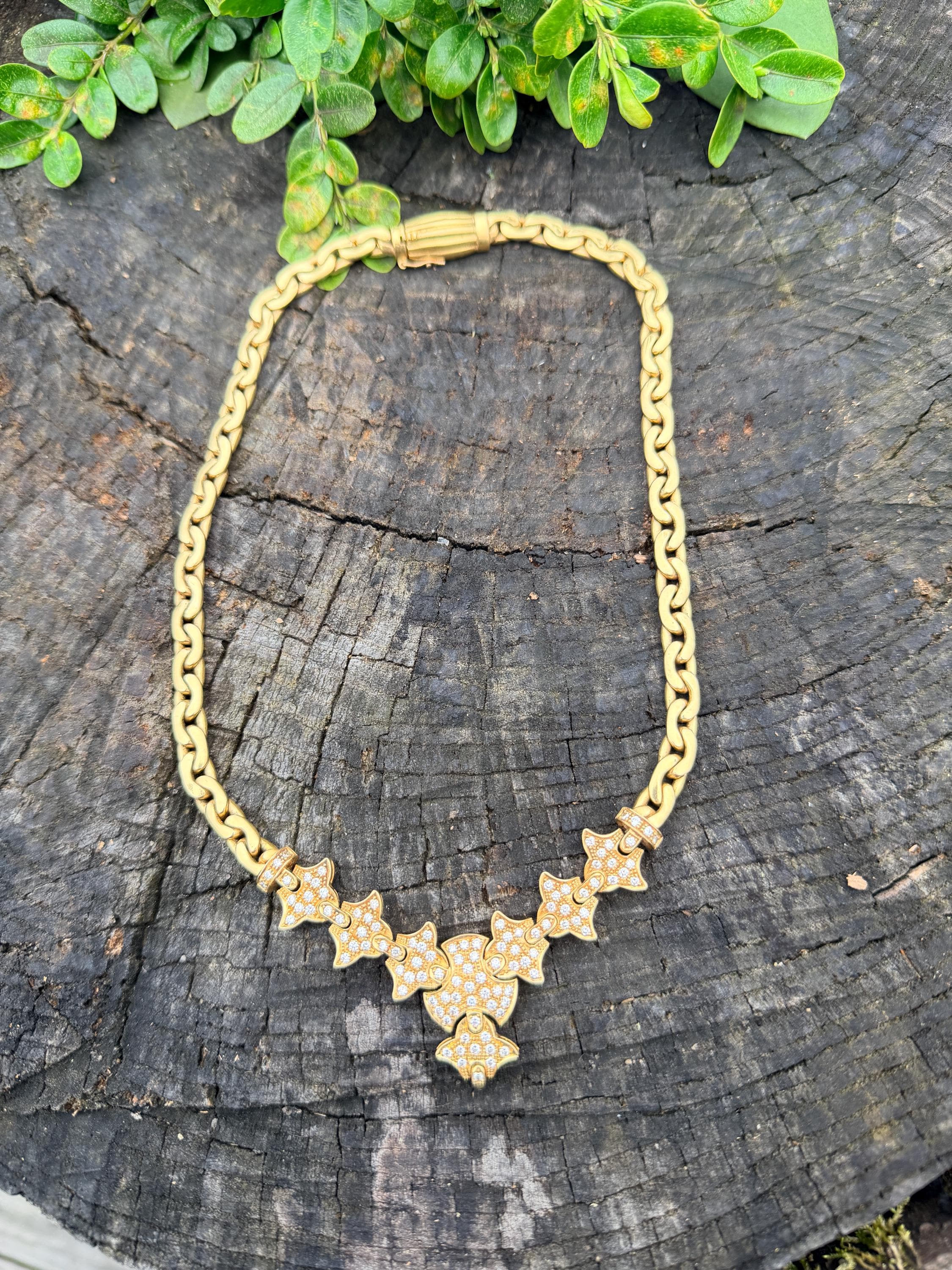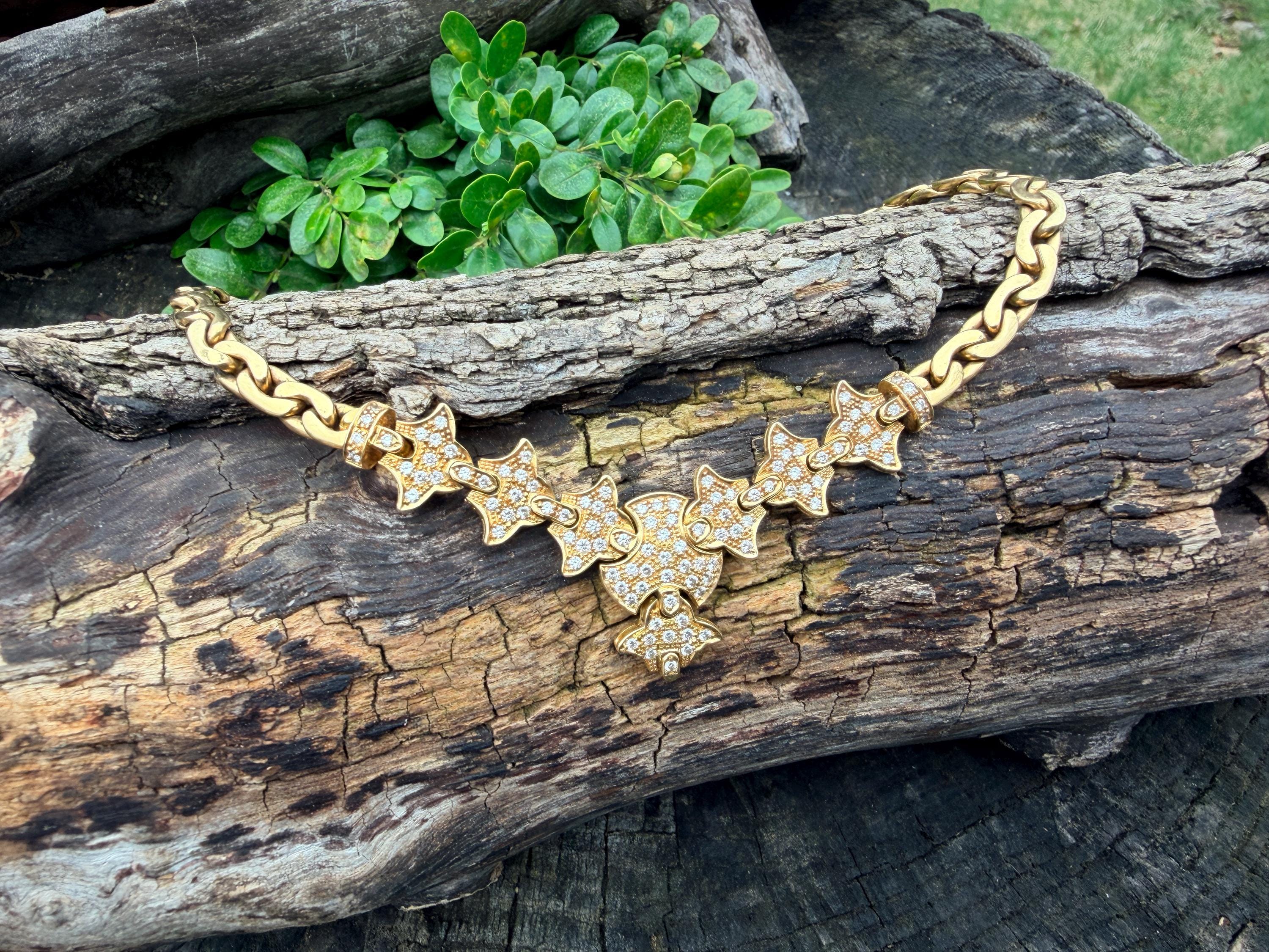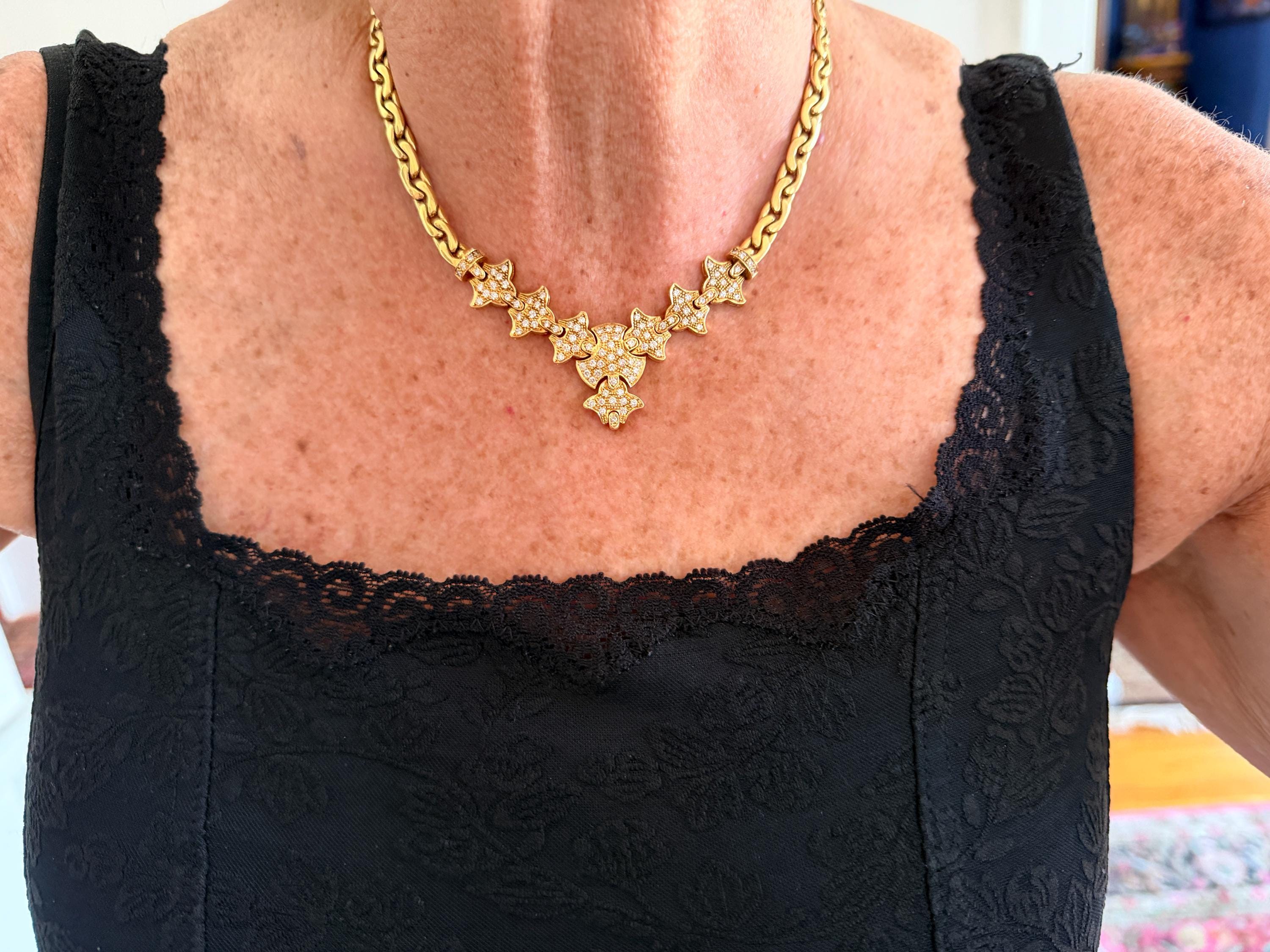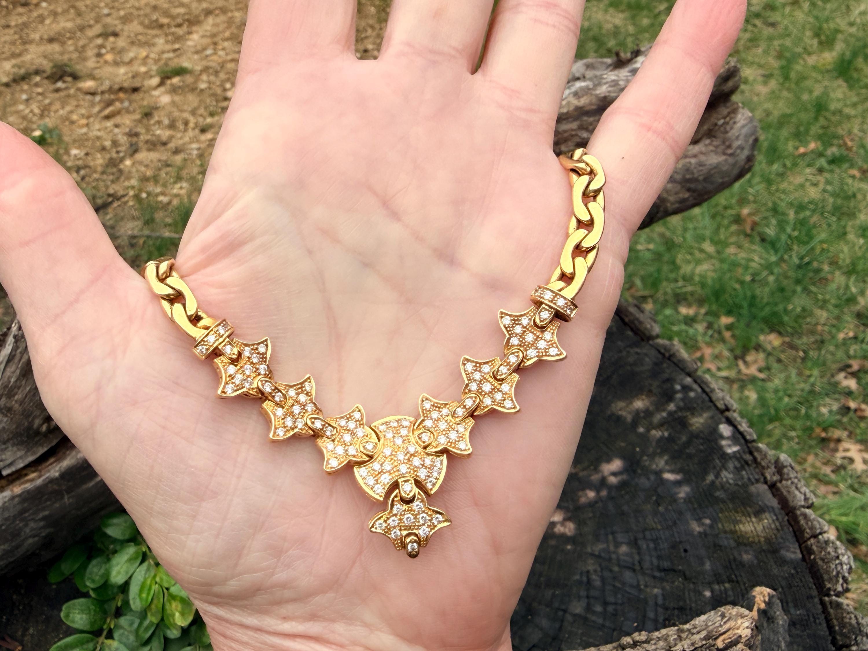 Set in 19k yellow gold, this attention grabbing Portuguese diamond necklace dates from the 1980’s. The "V" shaped diamond drop necklace is studded with glittering round diamonds all set within a stunning orange design. Holding it all together is a swervy, sexy thick gold chain that beautifully compliments the pattern. The total approx. weight of the diamonds are 1.75 ct. All diamonds are G in color and VS1 in clarity. Adding intrigue and making an impact is the purpose of this piece. The necklace weighs 76.03 grams. The necklace measures 16". The chain is 3/16". The drop pendant is 1" long and 1/2" wide. It is marked 800 (19k).