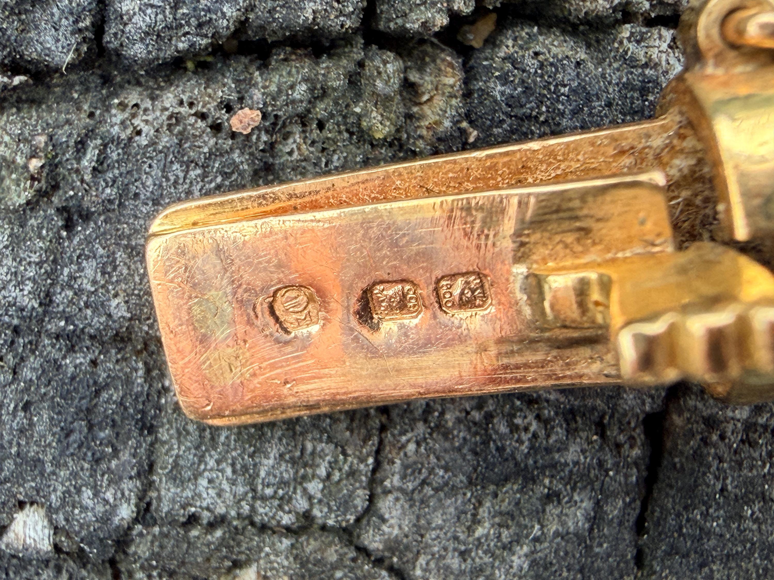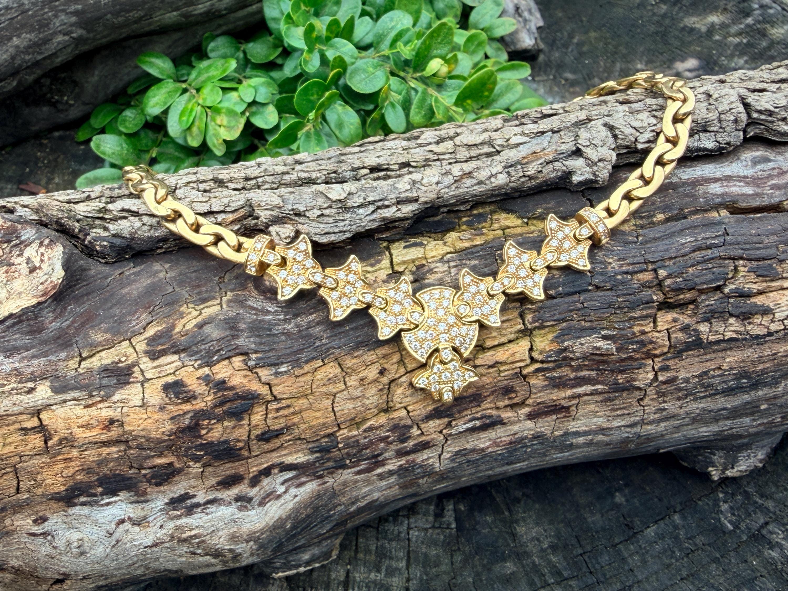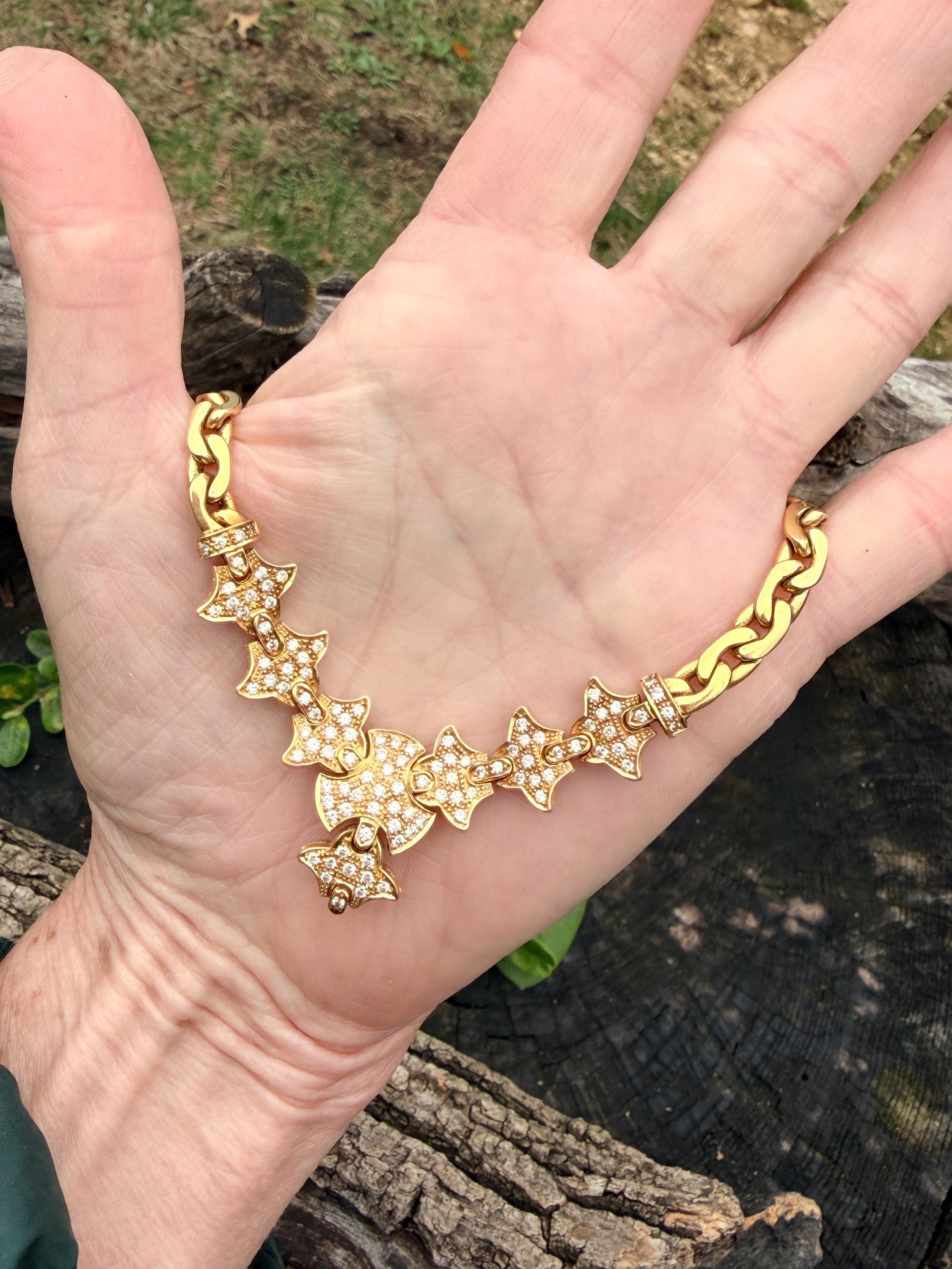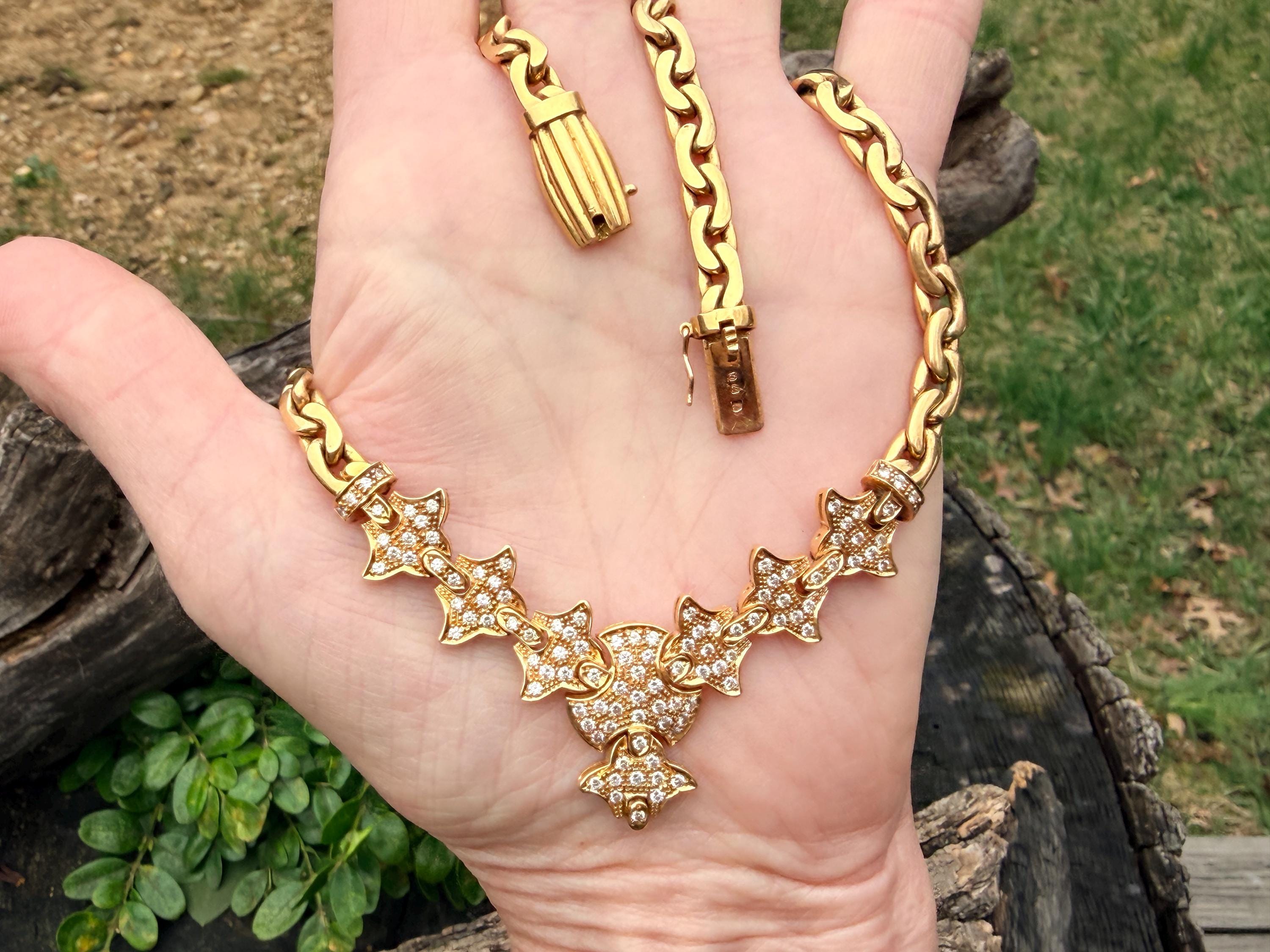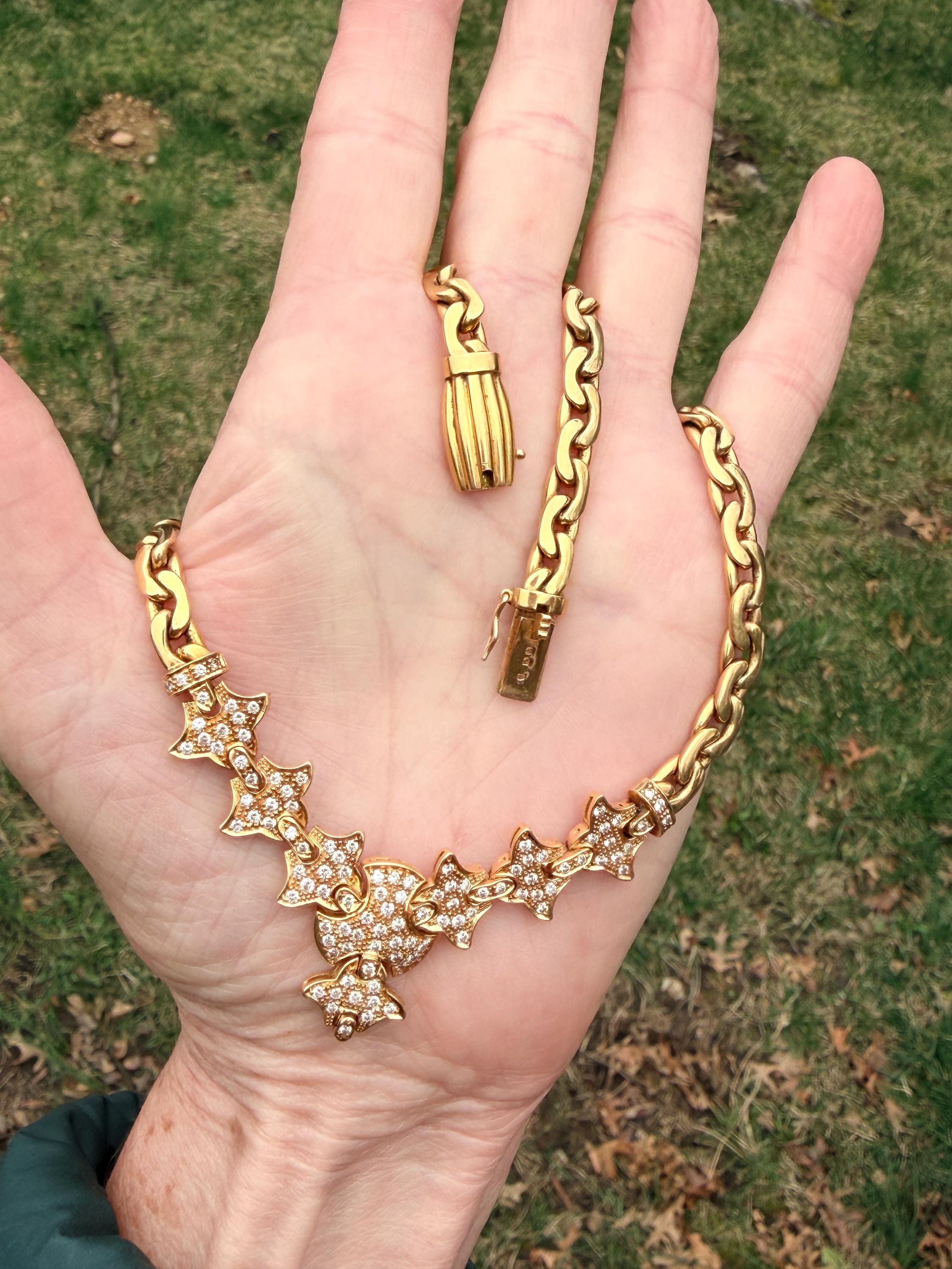 Set in 19k yellow gold, this attention grabbing Portuguese diamond necklace dates from the 1980’s. The "V" shaped diamond drop necklace is studded with glittering round diamonds all set within a stunning orange design. Holding it all together is a swervy, sexy thick gold chain that beautifully compliments the pattern. The total approx. weight of the diamonds are 1.75 ct. All diamonds are G in color and VS1 in clarity. Adding intrigue and making an impact is the purpose of this piece. The necklace weighs 76.03 grams. The necklace measures 16". The chain is 3/16". The drop pendant is 1" long and 1/2" wide. It is marked 800 (19k).