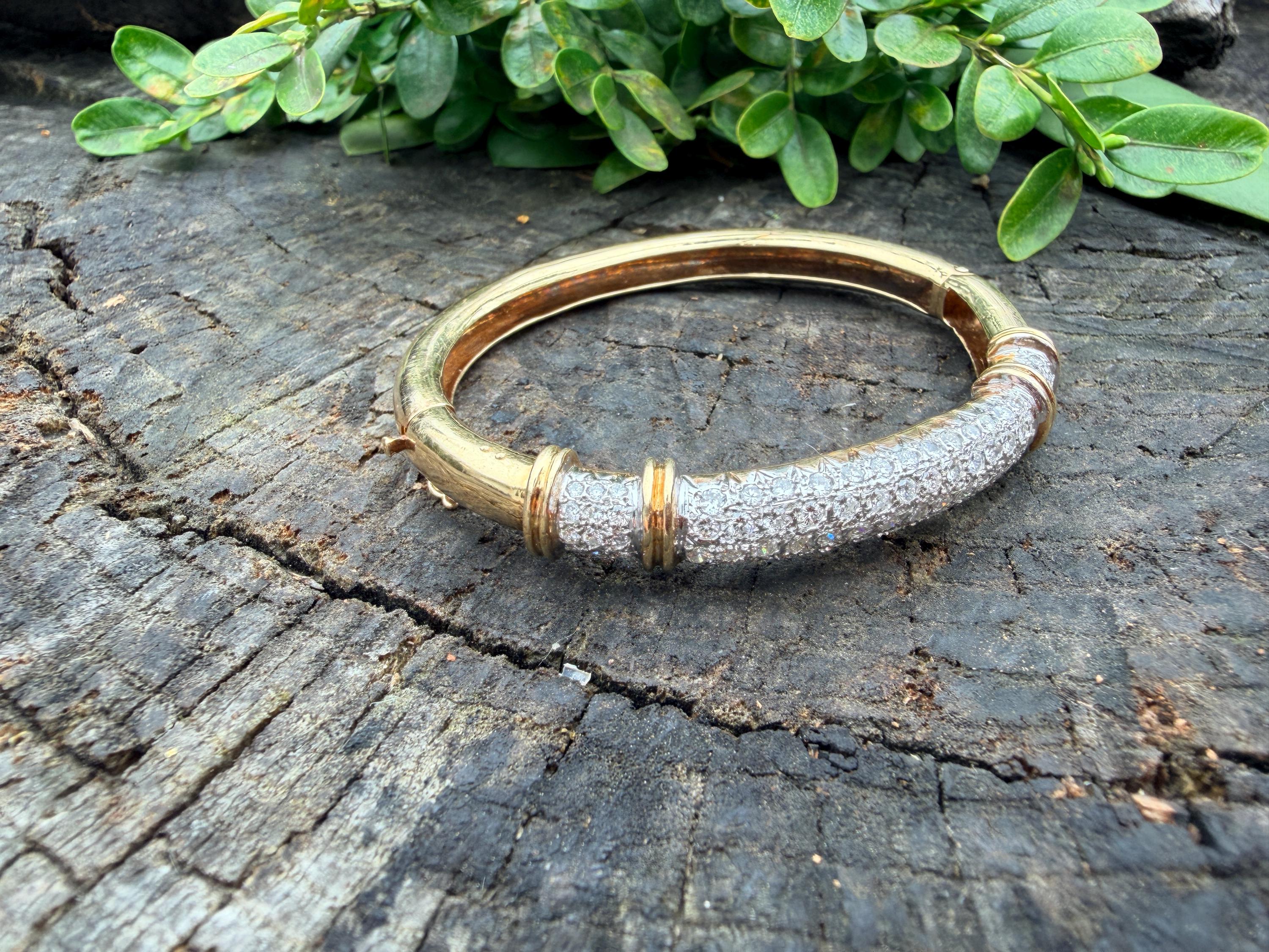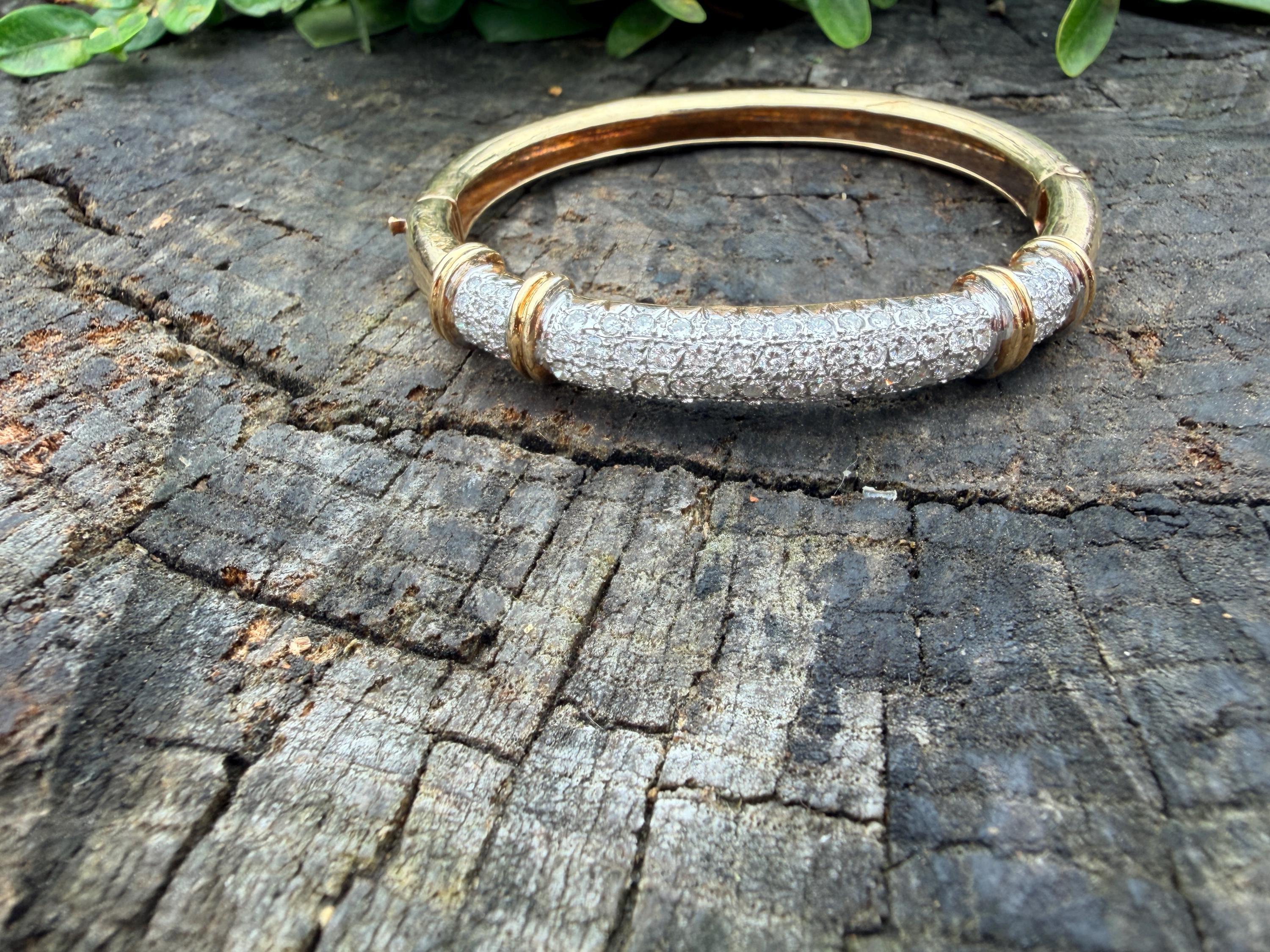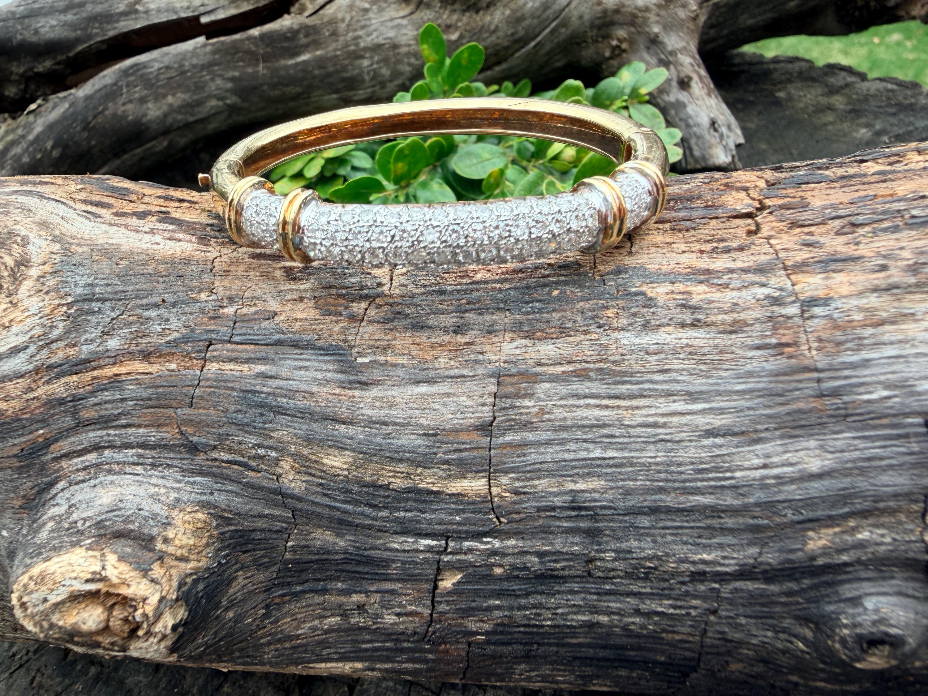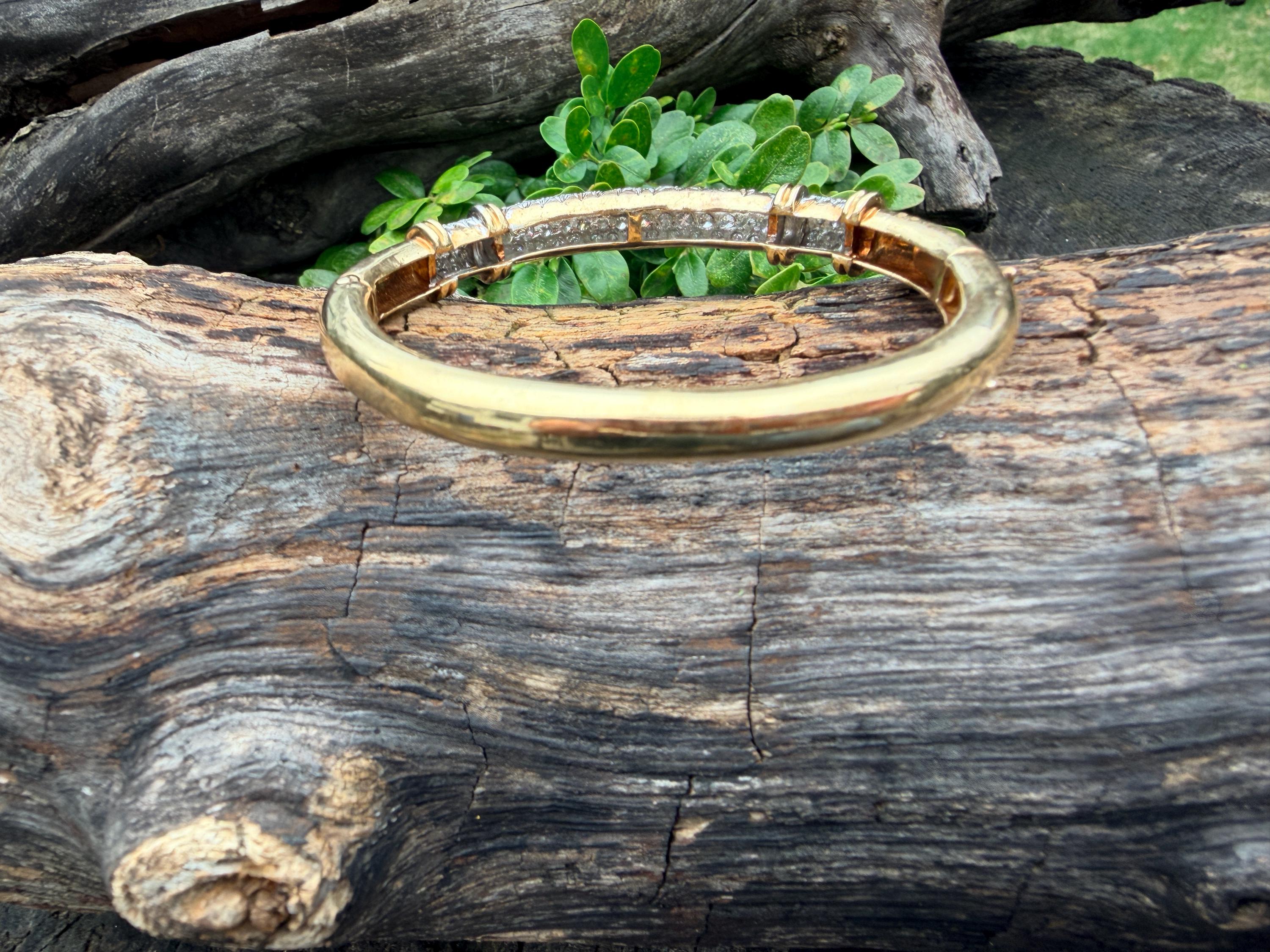 Set in 14k yellow gold this dazzler of a diamond bangle is spectacular. It dates from the 1970's. In a procession of glamour, set on top of a polished gold mounting, is the parade of round sparkling diamonds entwined in the bold gold. The round diamonds have a total approx. weight of 2.00 ct. The diamonds are G in color and VS2 in clarity. The diamonds are set in the gold bangle in a way that almost floats a top your wrist. A true testimonial for sizzling style. The bracelet weighs 21.67 grams. The inside circumference measures 6 ". The inside diameter measures 2 1/4". The bangle is 3/16" wide.