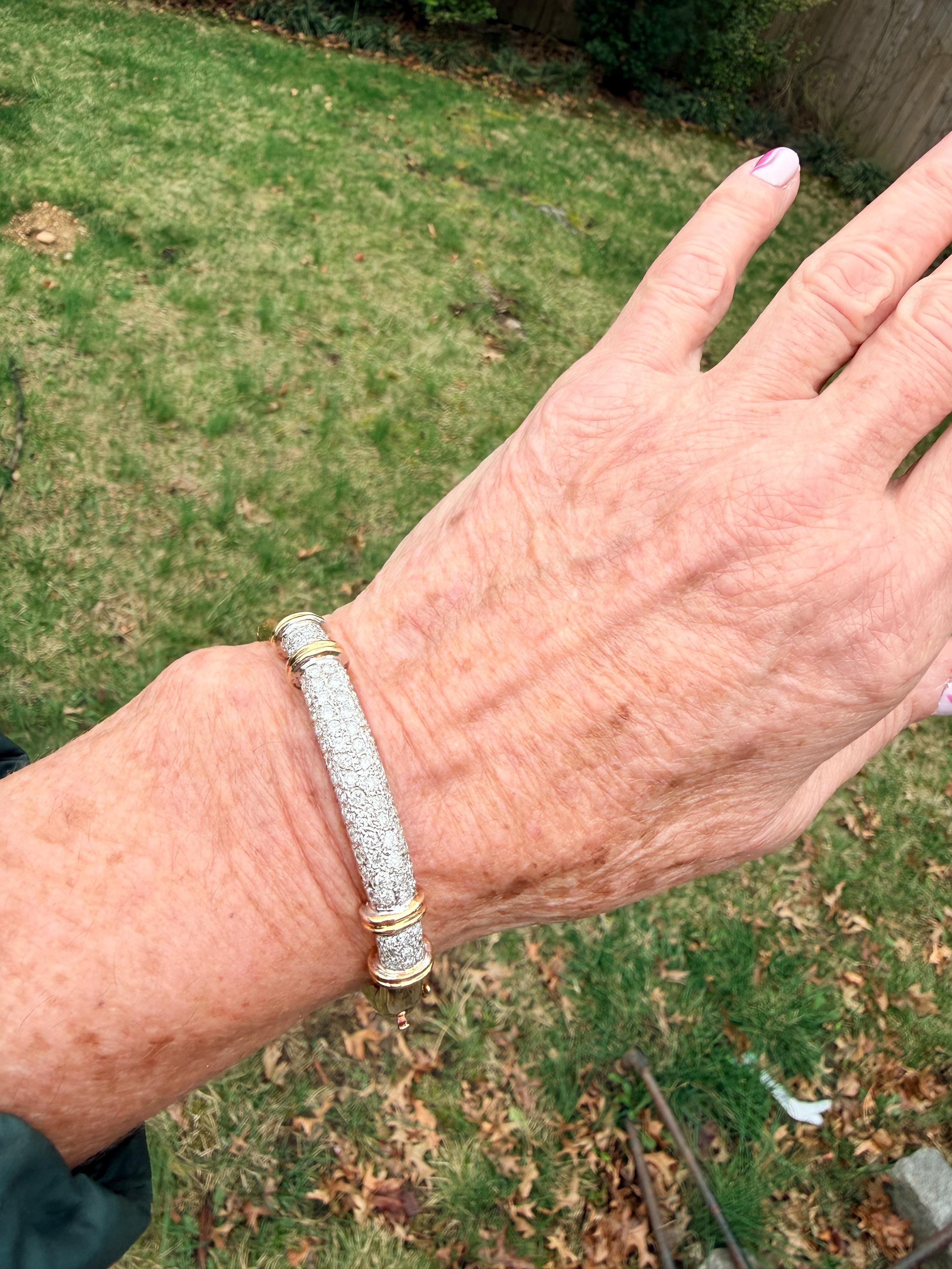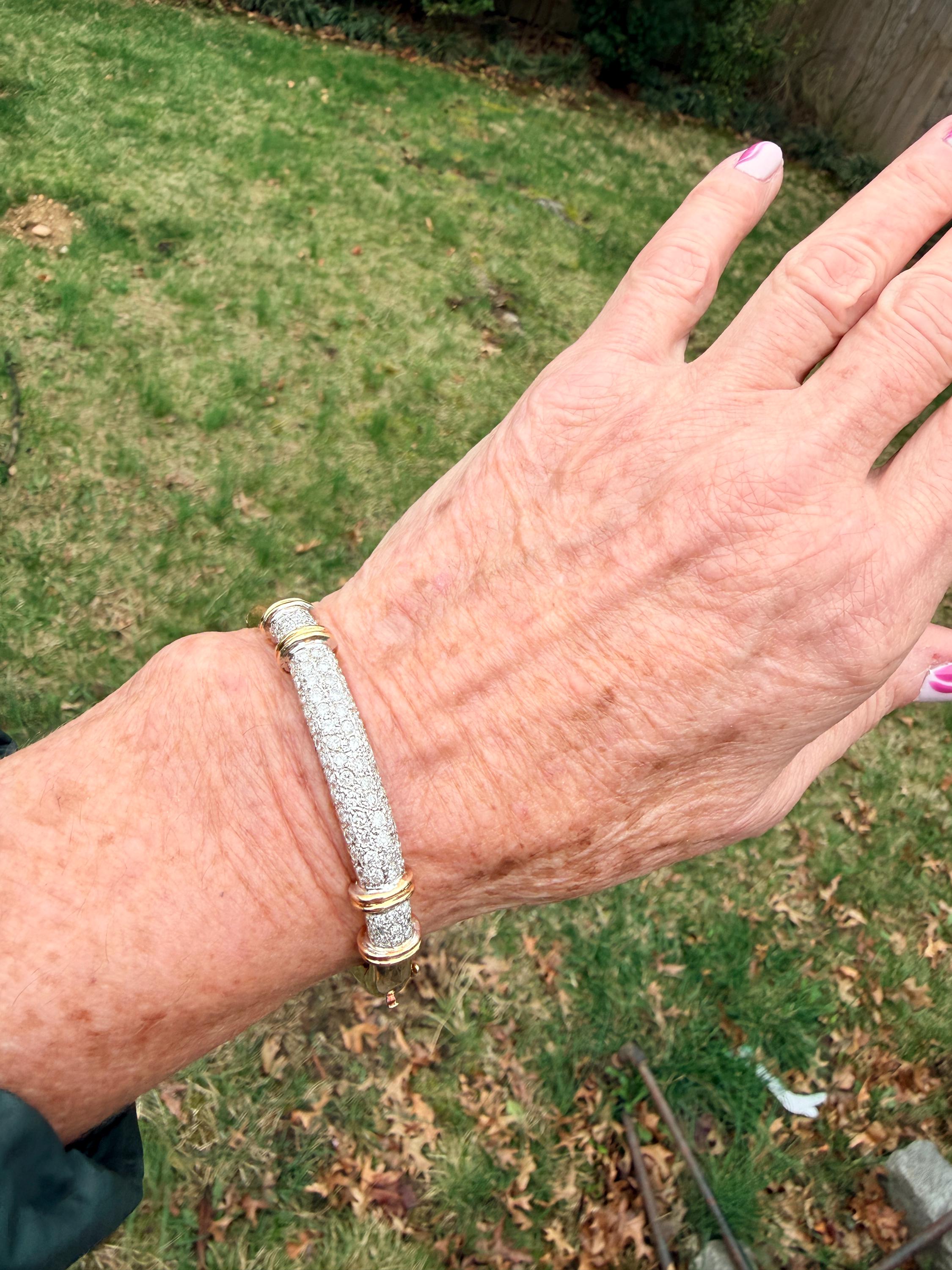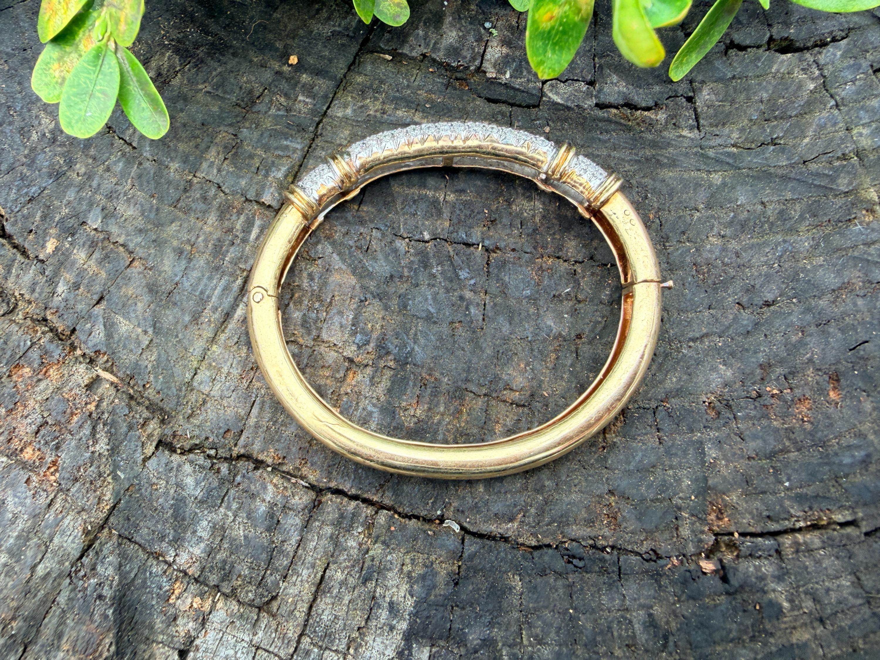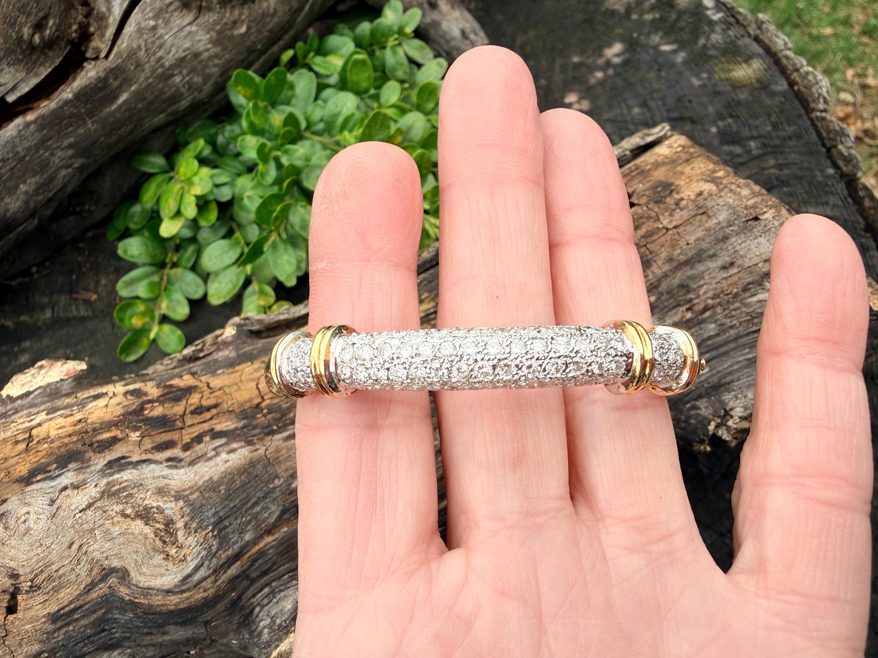 Set in 14k yellow gold this dazzler of a diamond bangle is spectacular. It dates from the 1970's. In a procession of glamour, set on top of a polished gold mounting, is the parade of round sparkling diamonds entwined in the bold gold. The round diamonds have a total approx. weight of 2.00 ct. The diamonds are G in color and VS2 in clarity. The diamonds are set in the gold bangle in a way that almost floats a top your wrist. A true testimonial for sizzling style. The bracelet weighs 21.67 grams. The inside circumference measures 6 ". The inside diameter measures 2 1/4". The bangle is 3/16" wide.