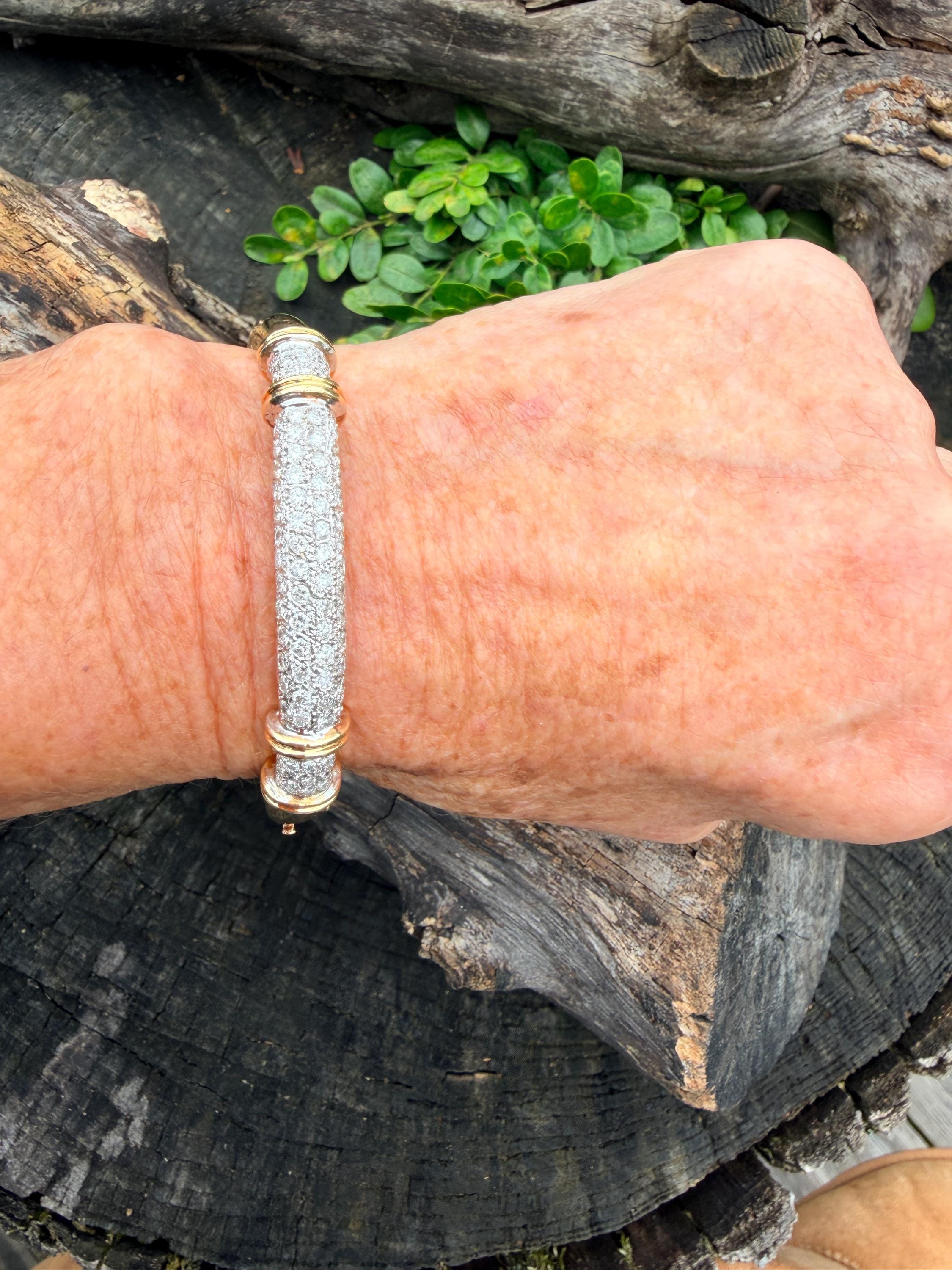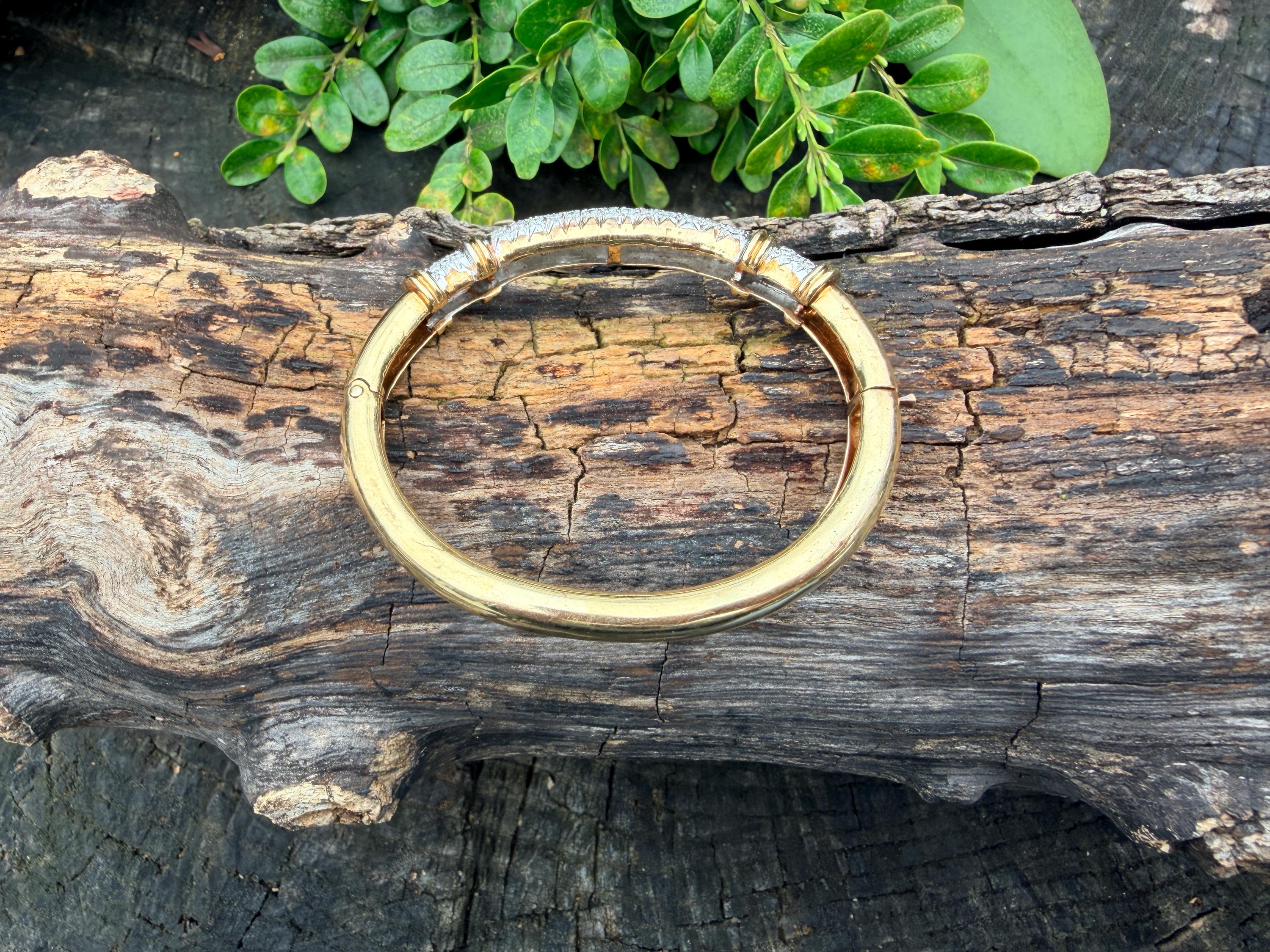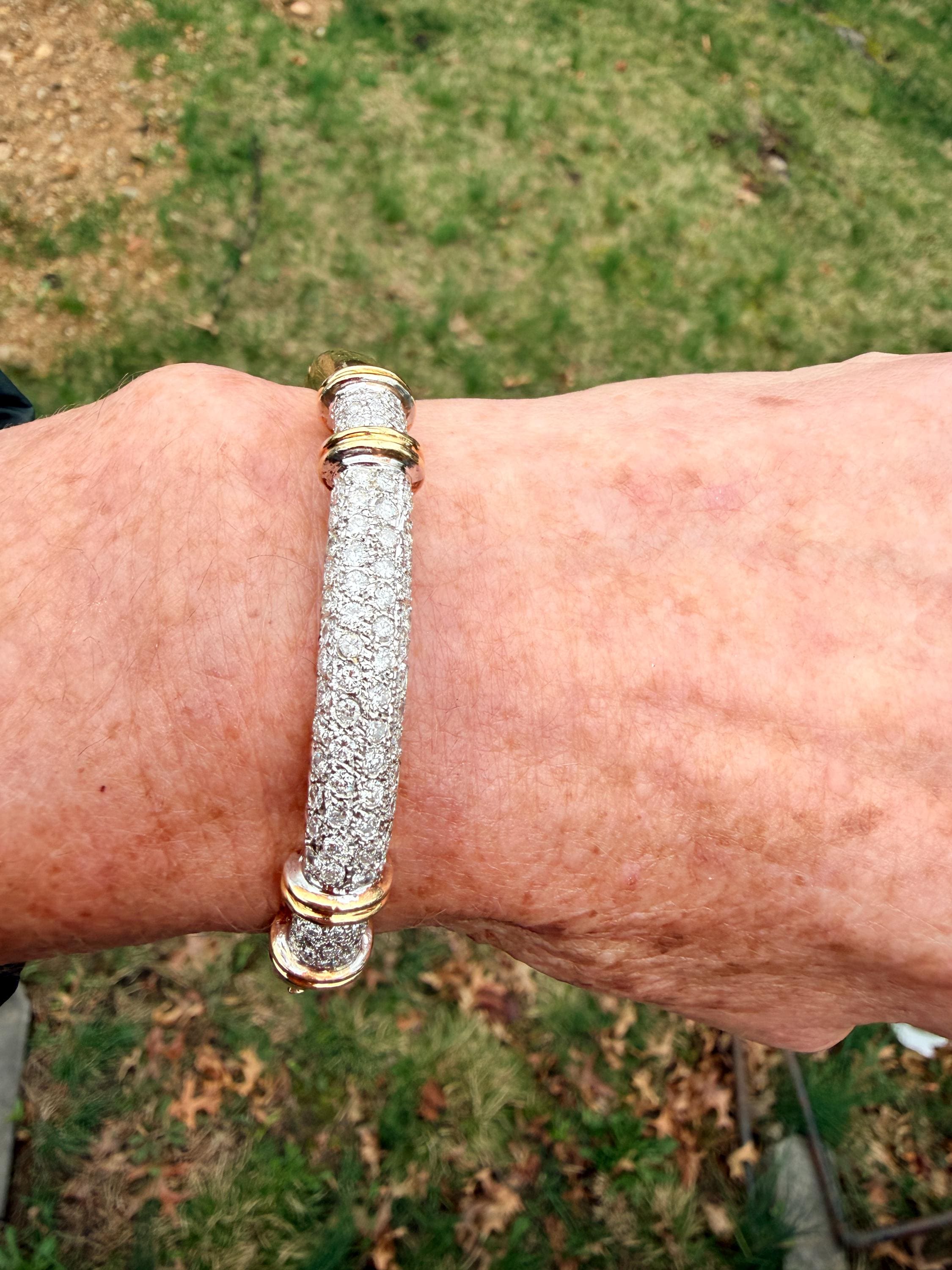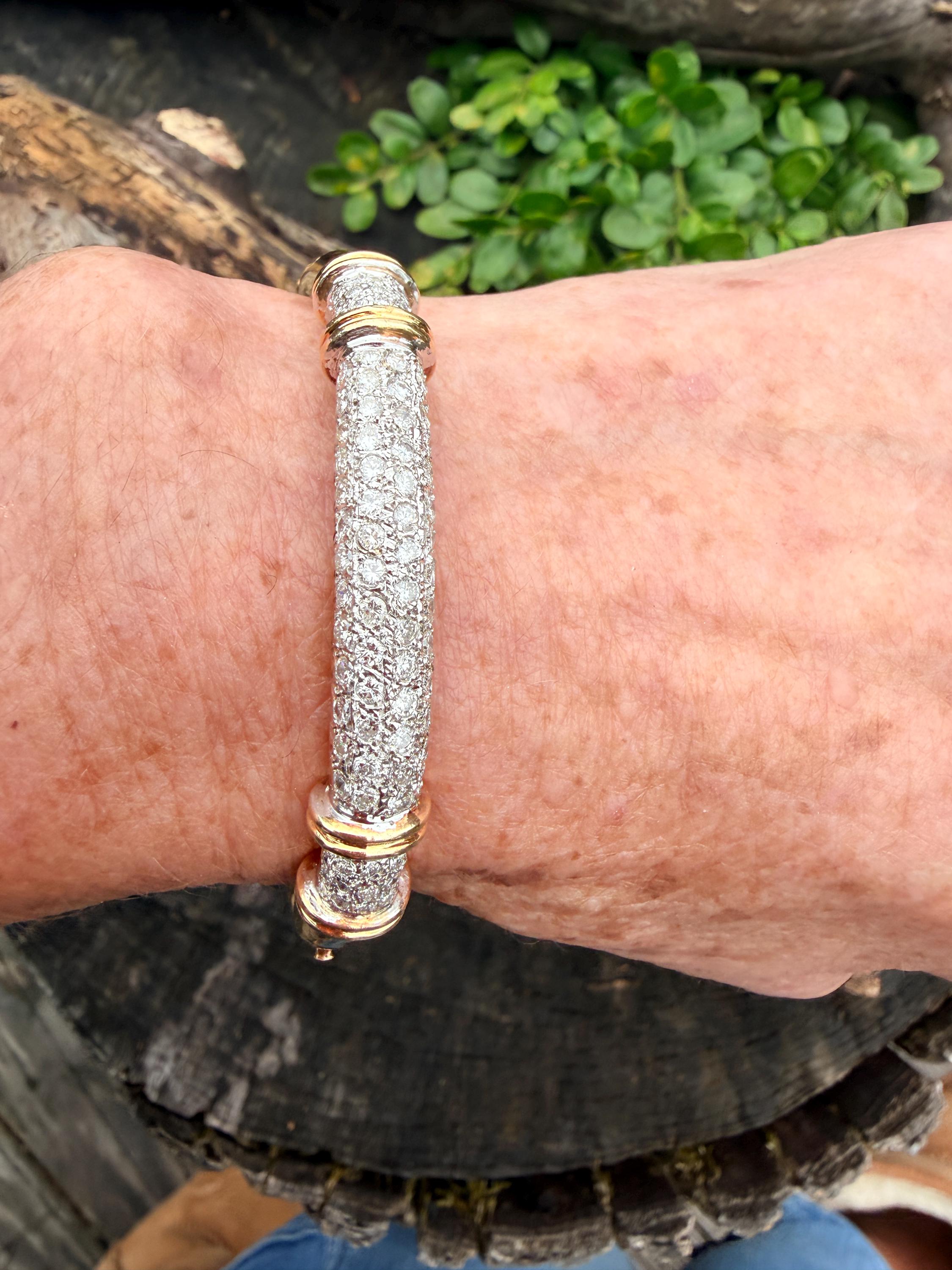 Set in 14k yellow gold this dazzler of a diamond bangle is spectacular. It dates from the 1970's. In a procession of glamour, set on top of a polished gold mounting, is the parade of round sparkling diamonds entwined in the bold gold. The round diamonds have a total approx. weight of 2.00 ct. The diamonds are G in color and VS2 in clarity. The diamonds are set in the gold bangle in a way that almost floats a top your wrist. A true testimonial for sizzling style. The bracelet weighs 21.67 grams. The inside circumference measures 6 ". The inside diameter measures 2 1/4". The bangle is 3/16" wide.