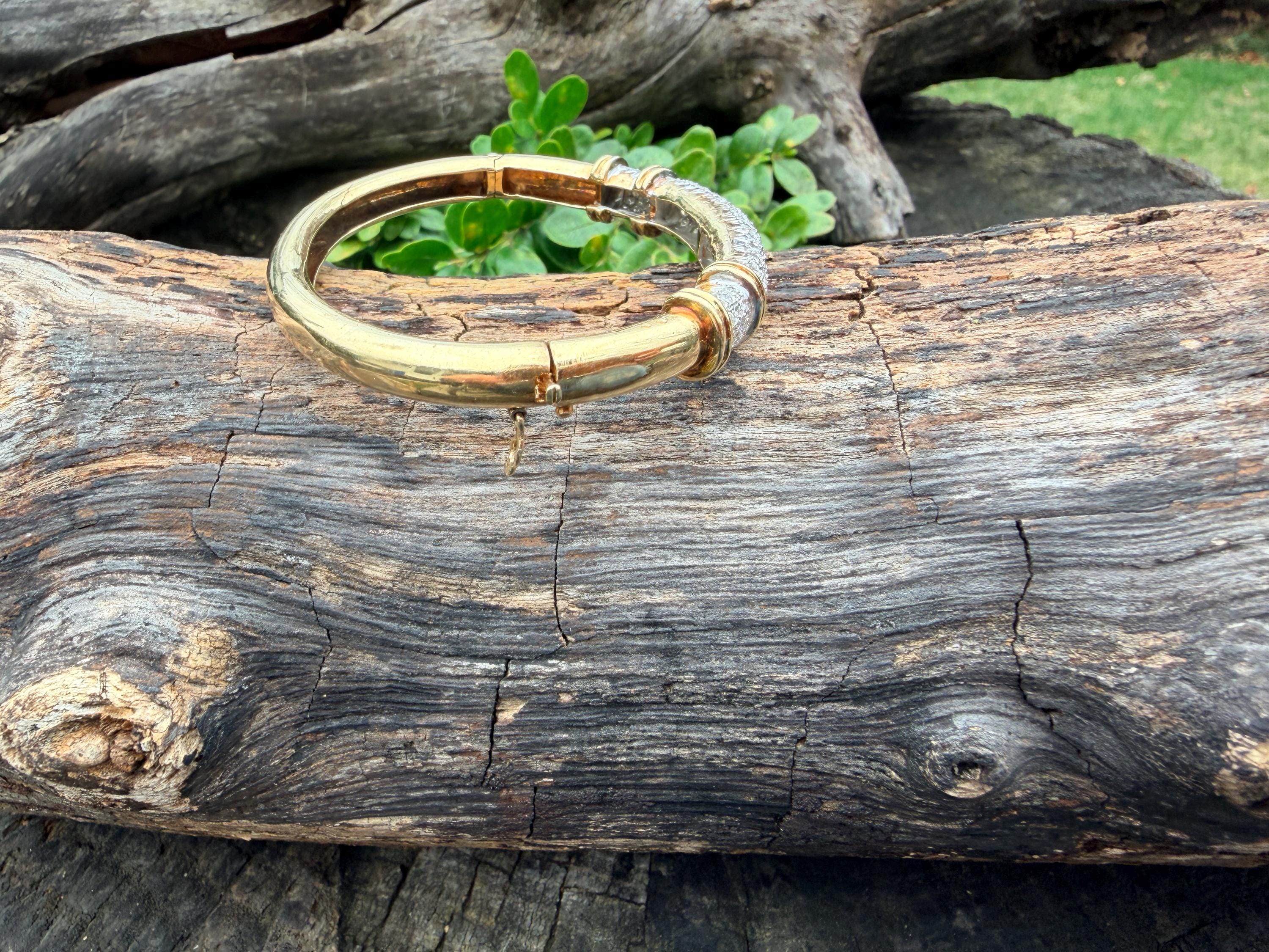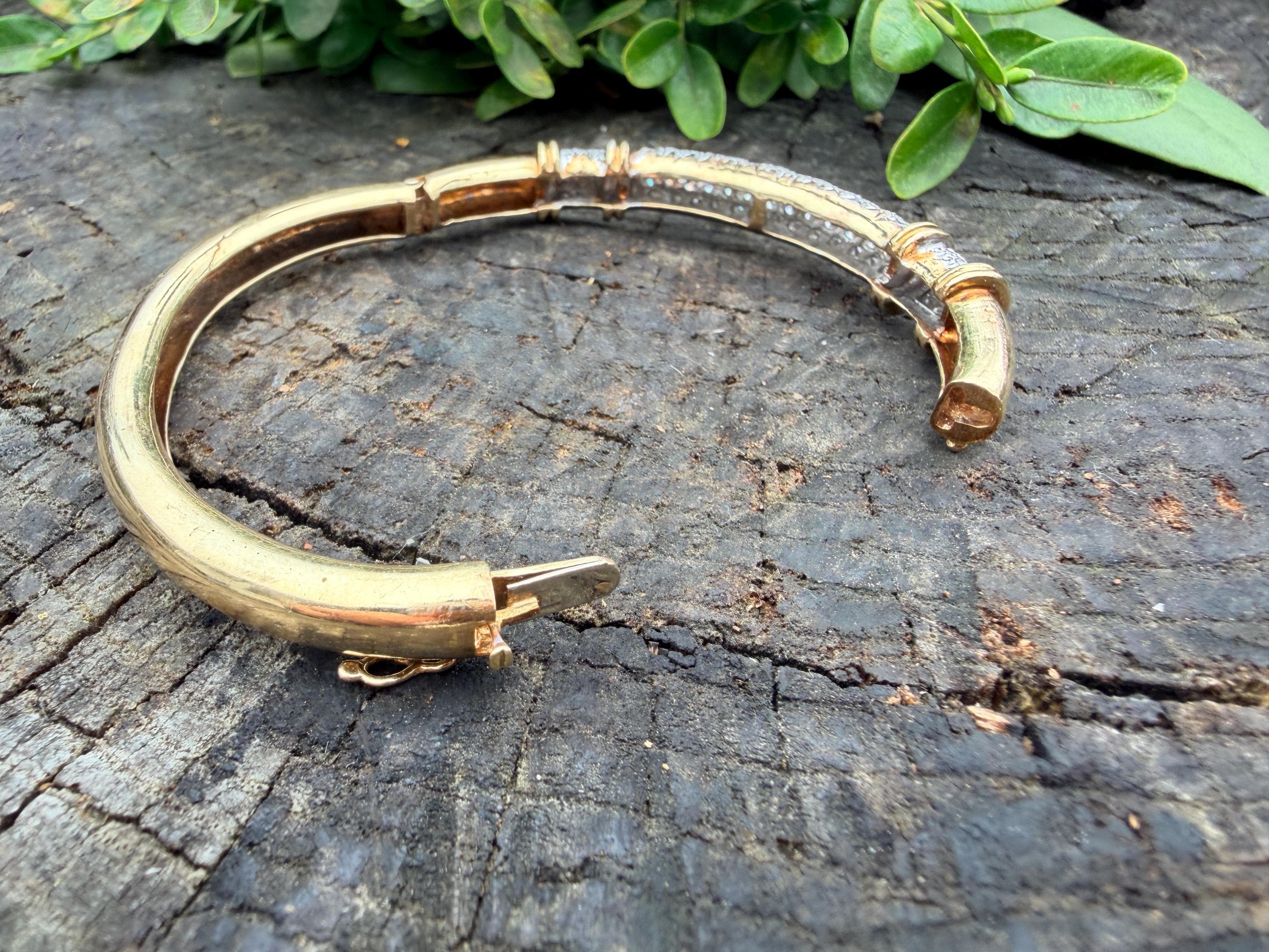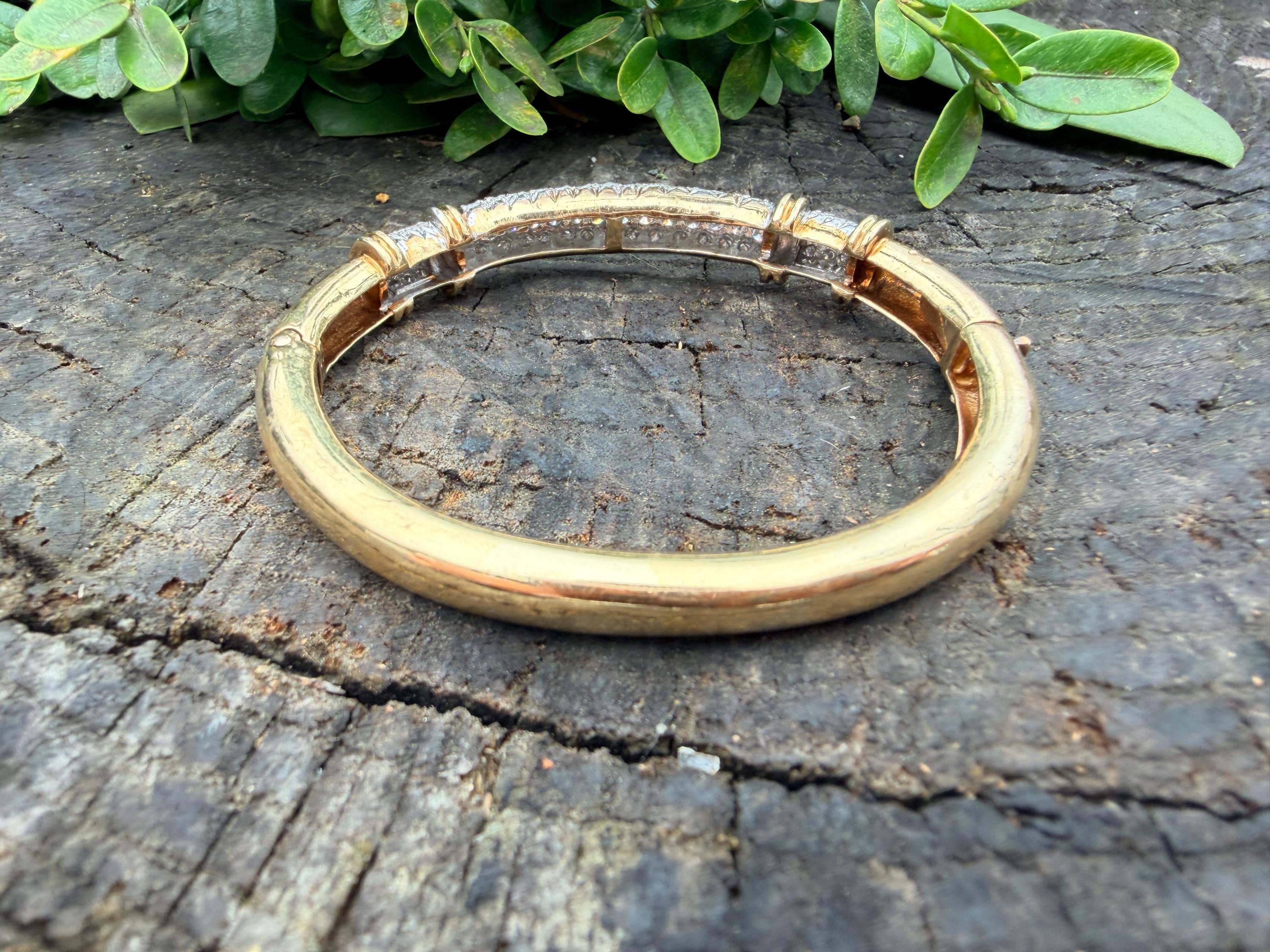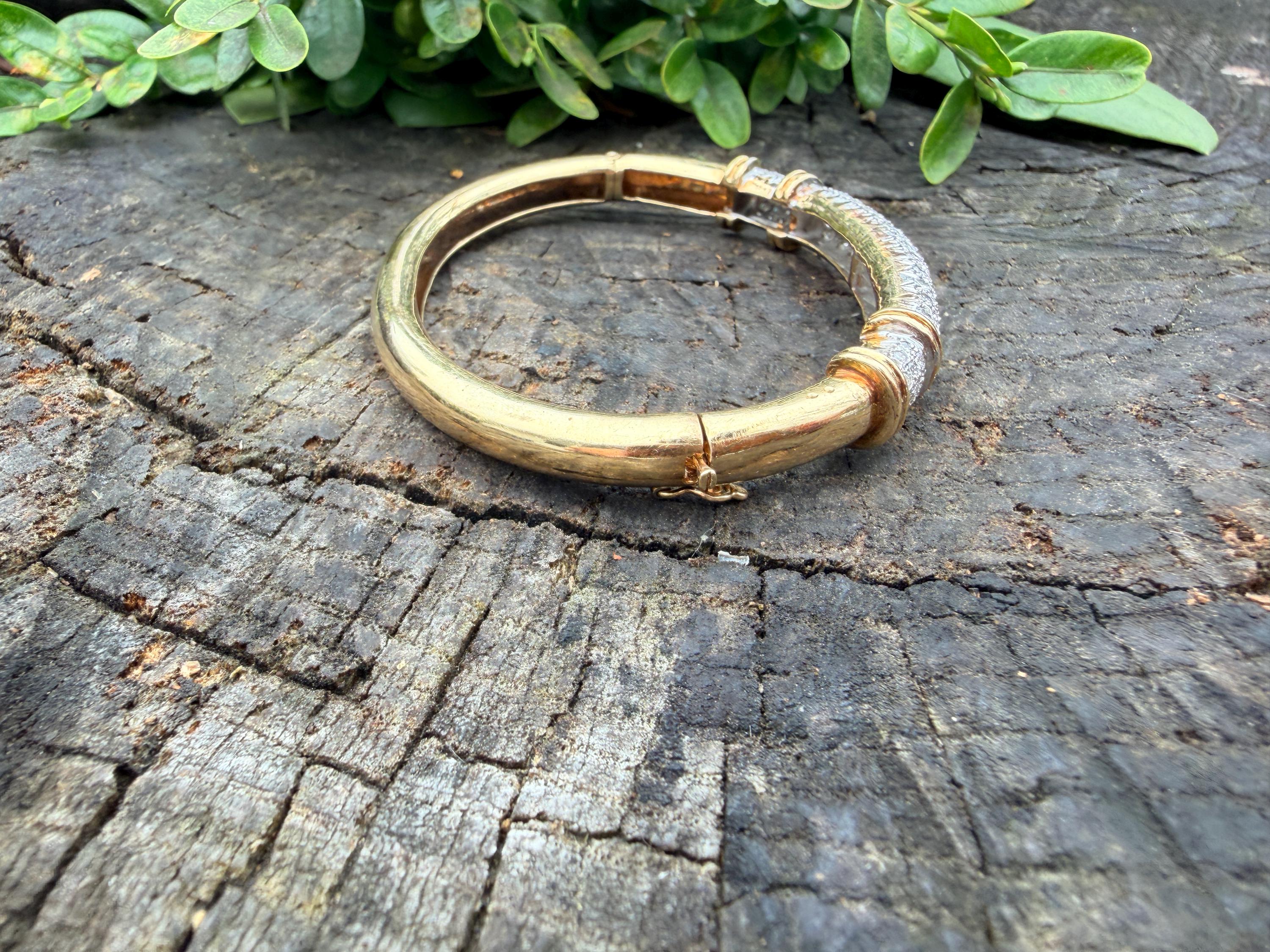 Set in 14k yellow gold this dazzler of a diamond bangle is spectacular. It dates from the 1970's. In a procession of glamour, set on top of a polished gold mounting, is the parade of round sparkling diamonds entwined in the bold gold. The round diamonds have a total approx. weight of 2.00 ct. The diamonds are G in color and VS2 in clarity. The diamonds are set in the gold bangle in a way that almost floats a top your wrist. A true testimonial for sizzling style. The bracelet weighs 21.67 grams. The inside circumference measures 6 ". The inside diameter measures 2 1/4". The bangle is 3/16" wide.