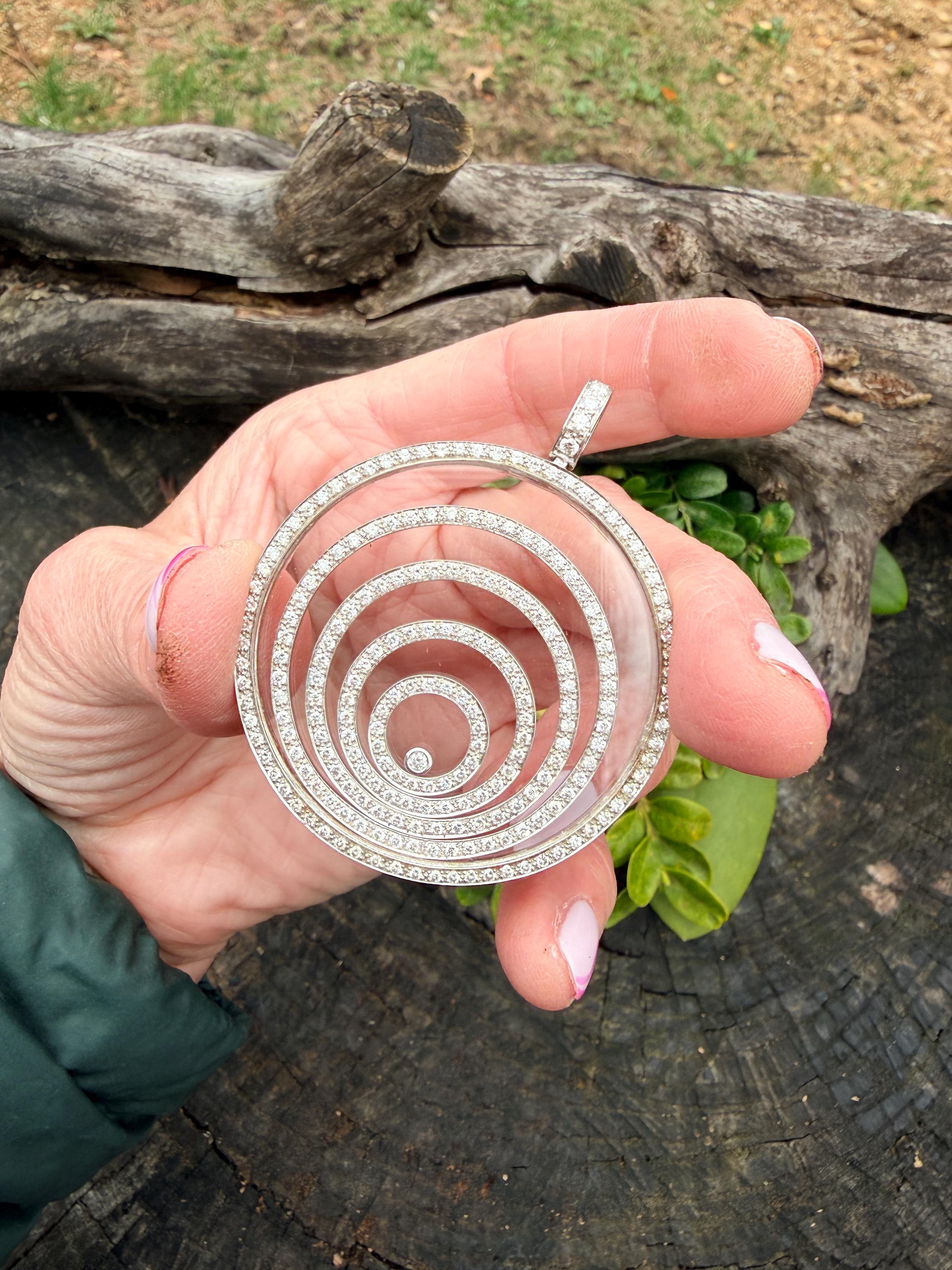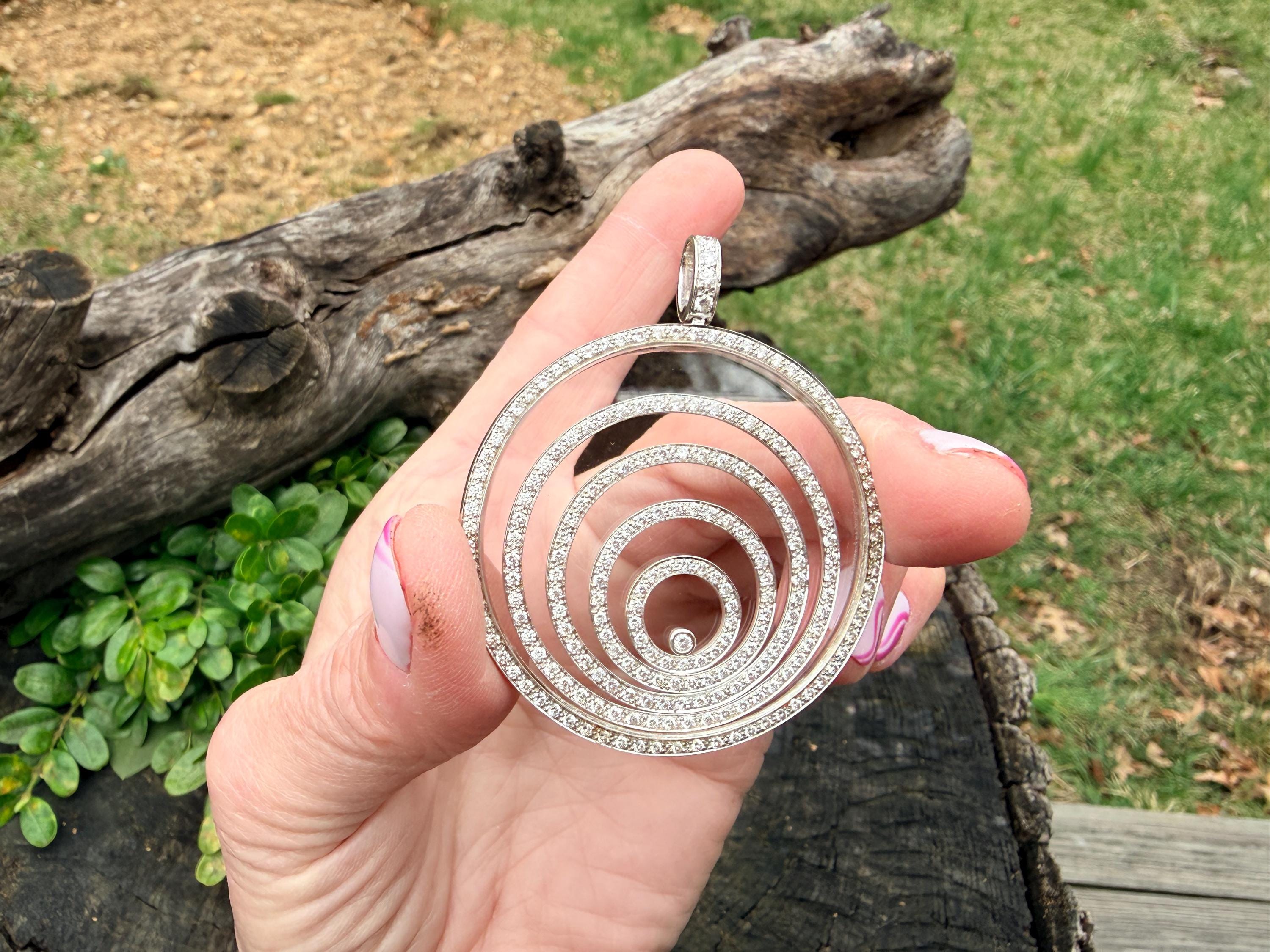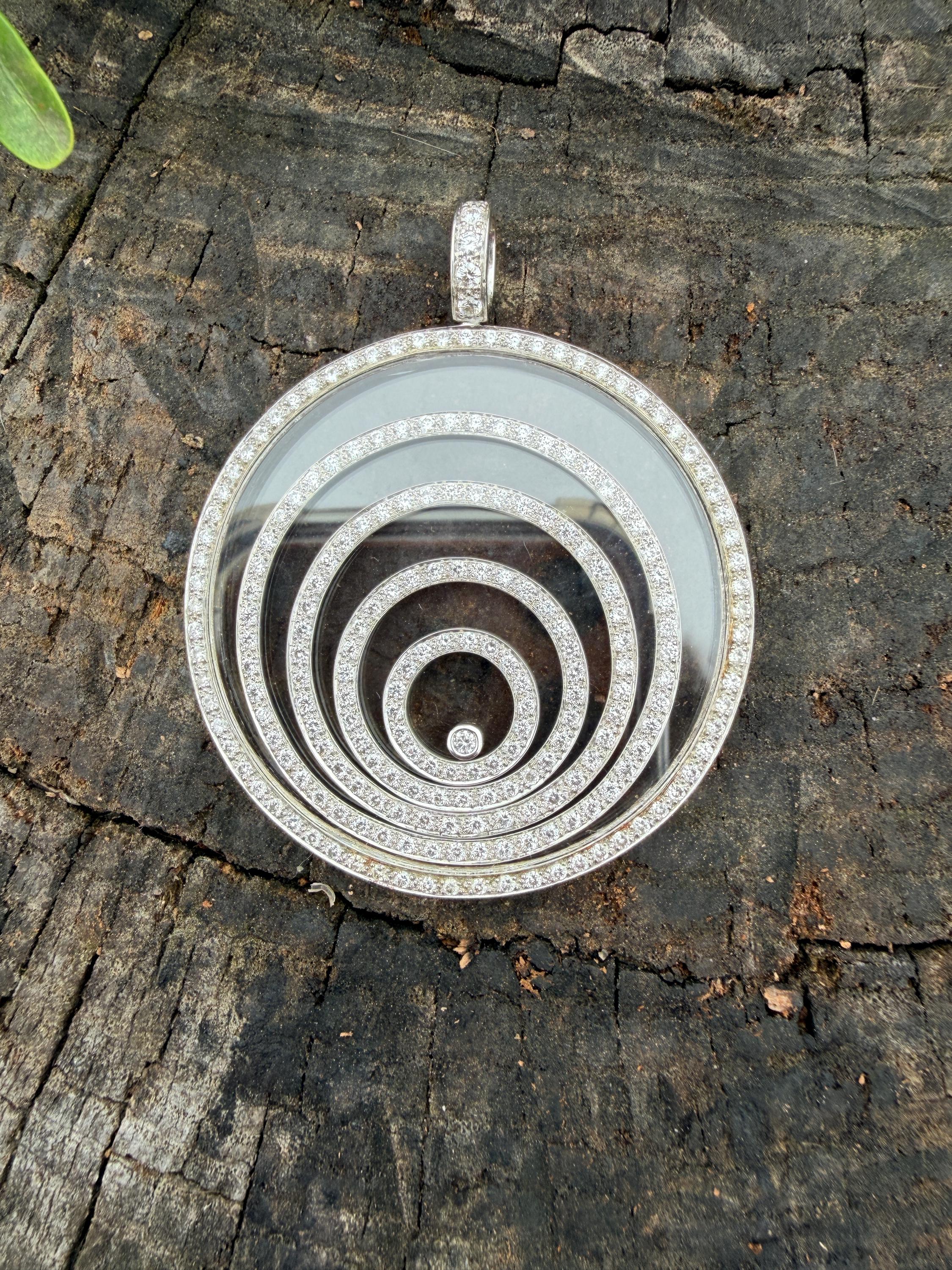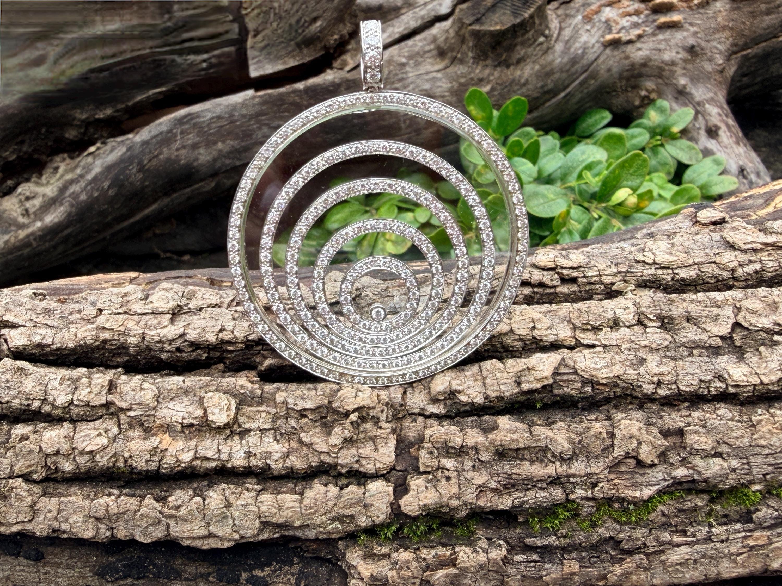 Set in 18k white gold this attention grabbing circular diamond disc pendant dates from the 1980’s. The fabulous multi layered circular shaped disc pendant has a geometric mod feel to it. Graduated, each large circle, fits inside the other to form a fluid, streamlined and sleek look. Each circular disc of gold is coated with the dazzle of round diamonds. The diamonds have a total approx. weight of 3.50 ct. The diamonds are H in color and VS2 in clarity. It exudes a magical effervescent vibe. Making an impact is the purpose of this piece. The pendant weighs 21.42 grams. The pendant measures 1 3/4". The bale is an additional 3/8". It is marked 750 (18k).