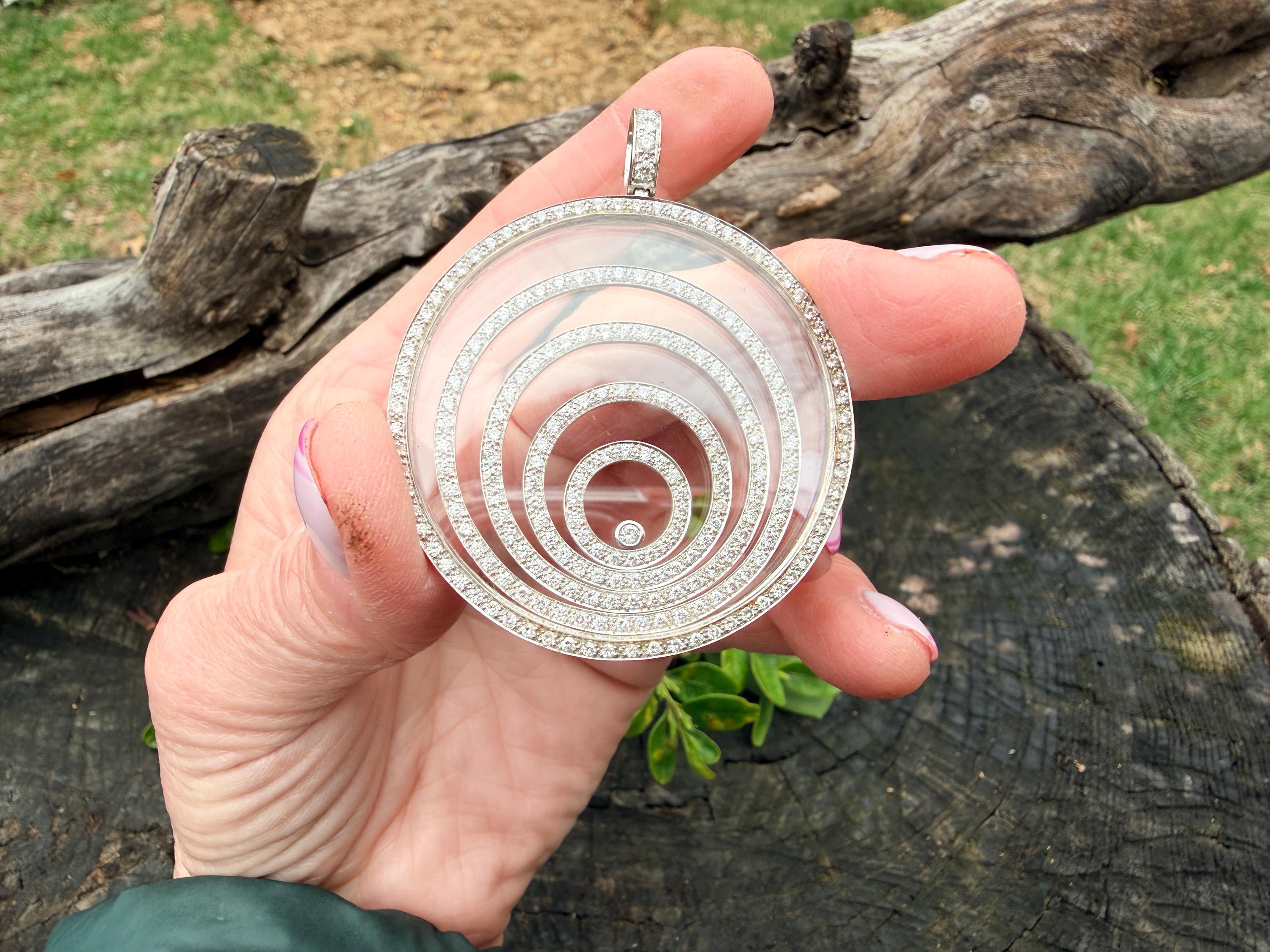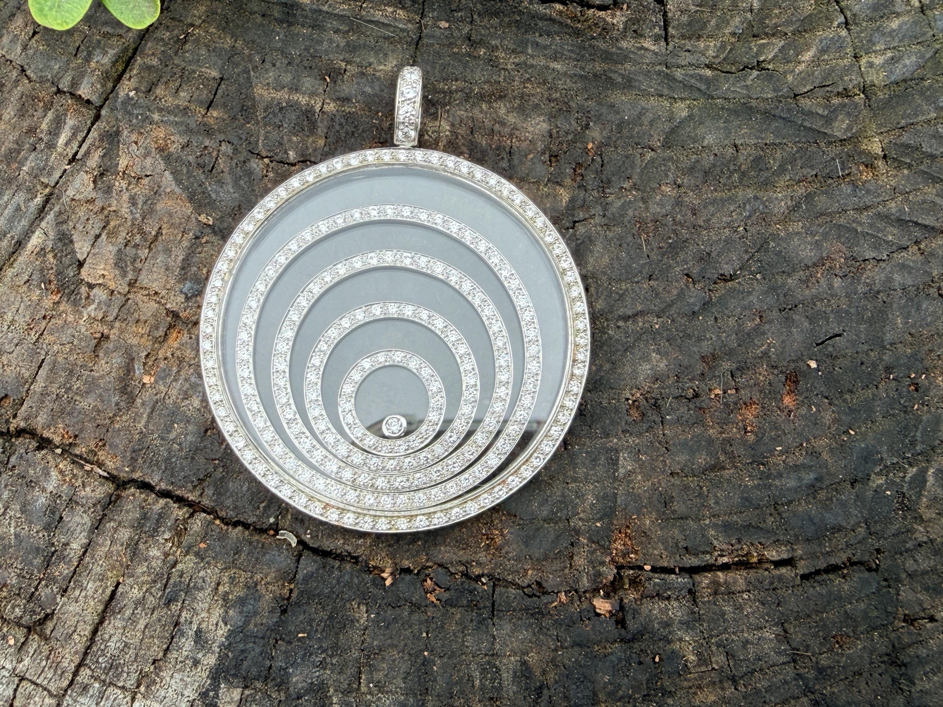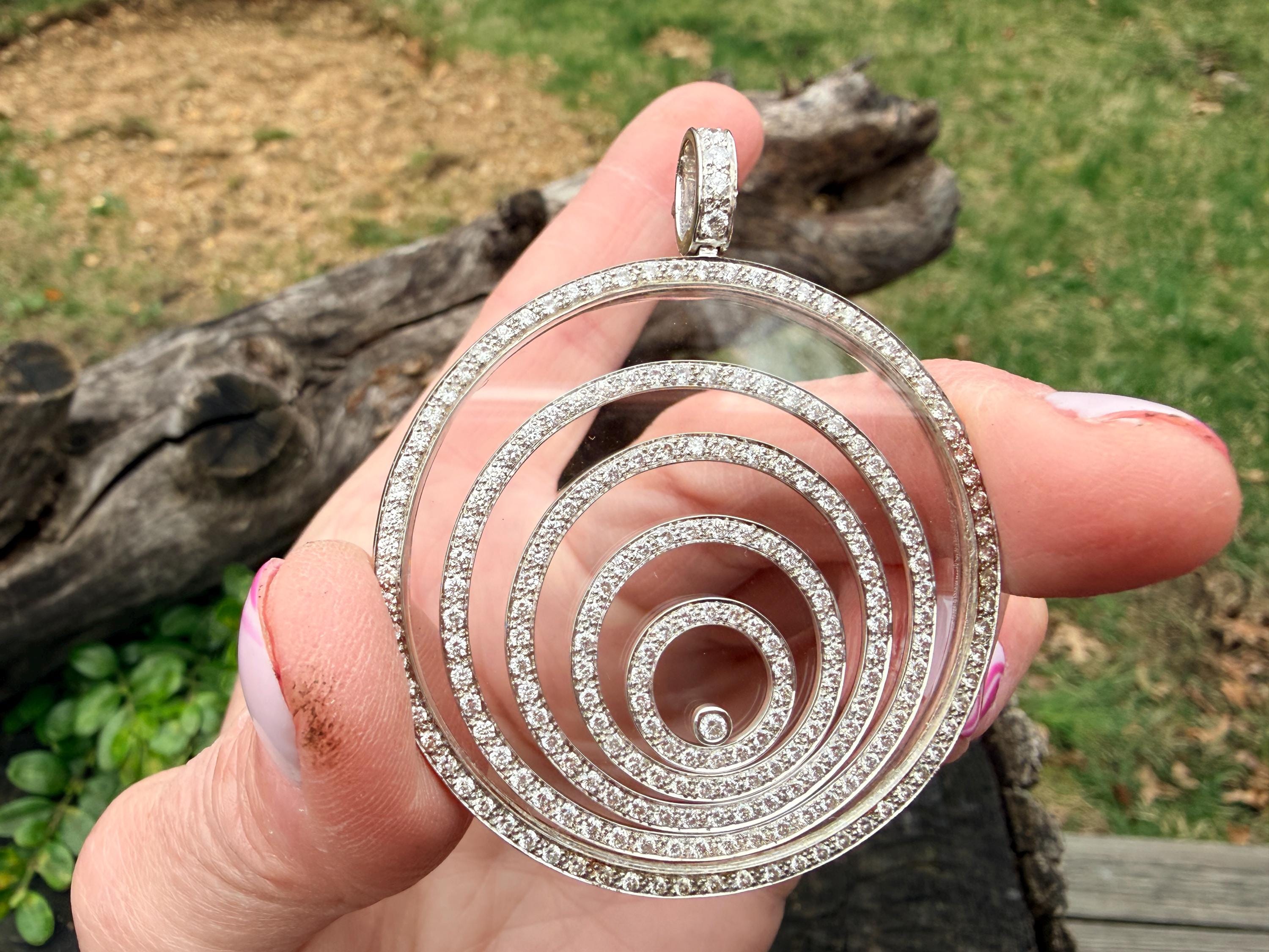 Set in 18k white gold this attention grabbing circular diamond disc pendant dates from the 1980’s. The fabulous multi layered circular shaped disc pendant has a geometric mod feel to it. Graduated, each large circle, fits inside the other to form a fluid, streamlined and sleek look. Each circular disc of gold is coated with the dazzle of round diamonds. The diamonds have a total approx. weight of 3.50 ct. The diamonds are H in color and VS2 in clarity. It exudes a magical effervescent vibe. Making an impact is the purpose of this piece. The pendant weighs 21.42 grams. The pendant measures 1 3/4". The bale is an additional 3/8". It is marked 750 (18k).