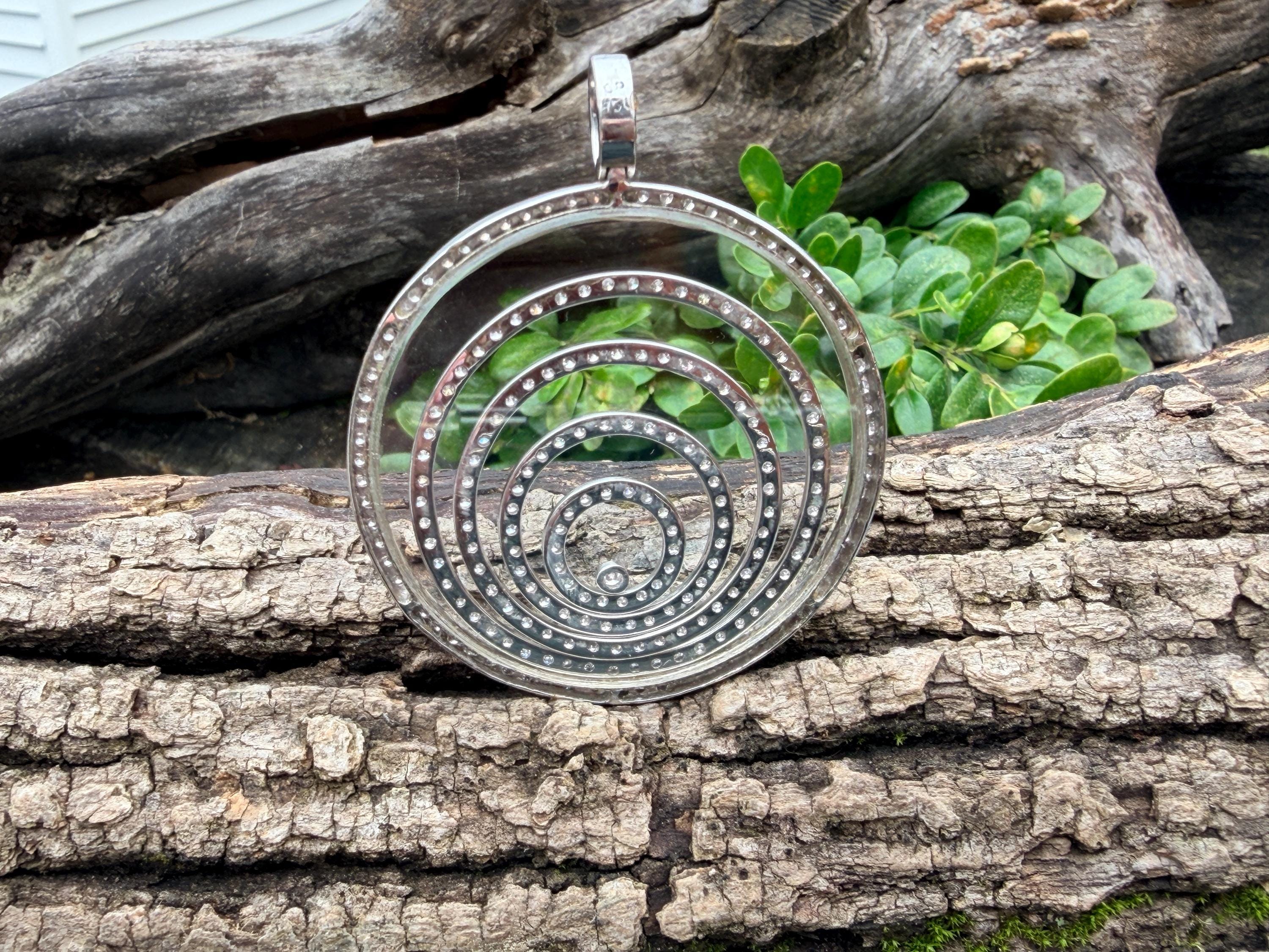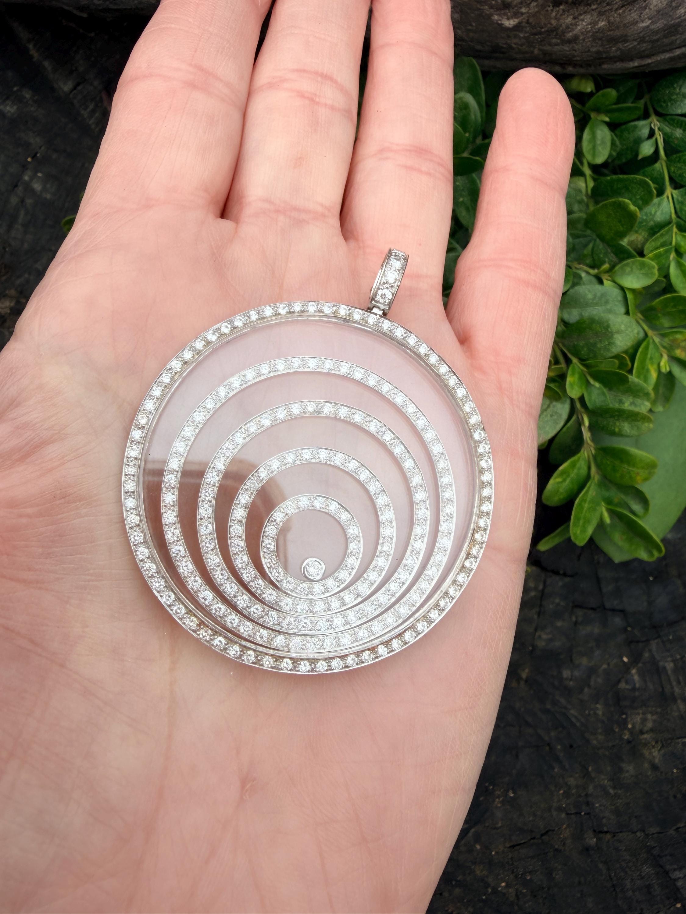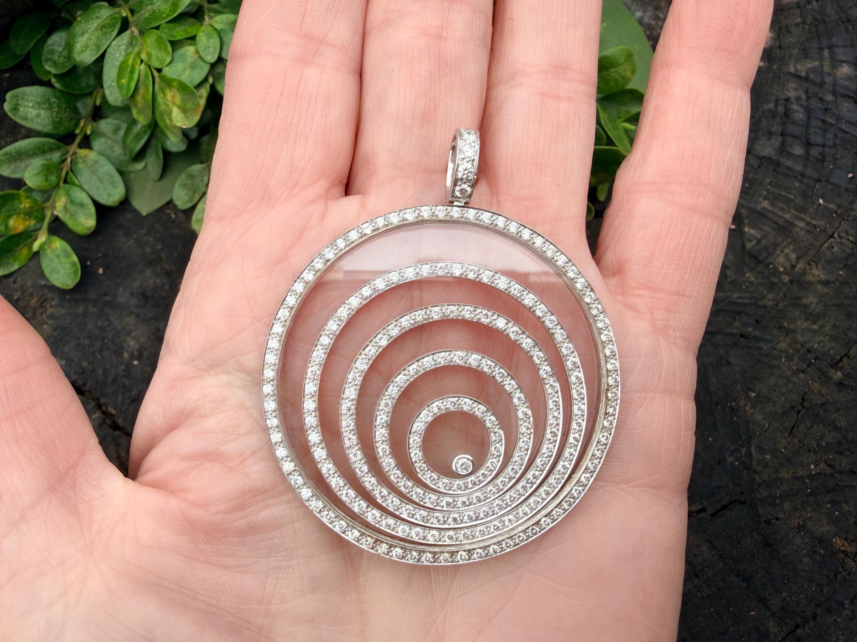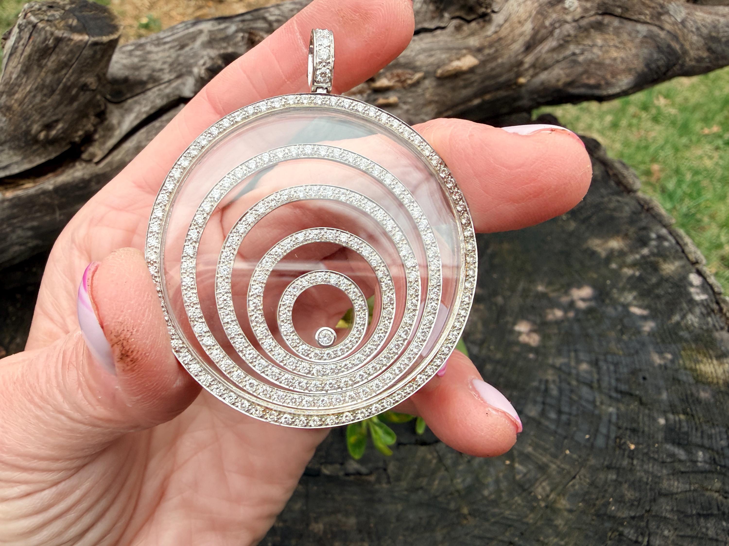 Set in 18k white gold this attention grabbing circular diamond disc pendant dates from the 1980’s. The fabulous multi layered circular shaped disc pendant has a geometric mod feel to it. Graduated, each large circle, fits inside the other to form a fluid, streamlined and sleek look. Each circular disc of gold is coated with the dazzle of round diamonds. The diamonds have a total approx. weight of 3.50 ct. The diamonds are H in color and VS2 in clarity. It exudes a magical effervescent vibe. Making an impact is the purpose of this piece. The pendant weighs 21.42 grams. The pendant measures 1 3/4". The bale is an additional 3/8". It is marked 750 (18k).