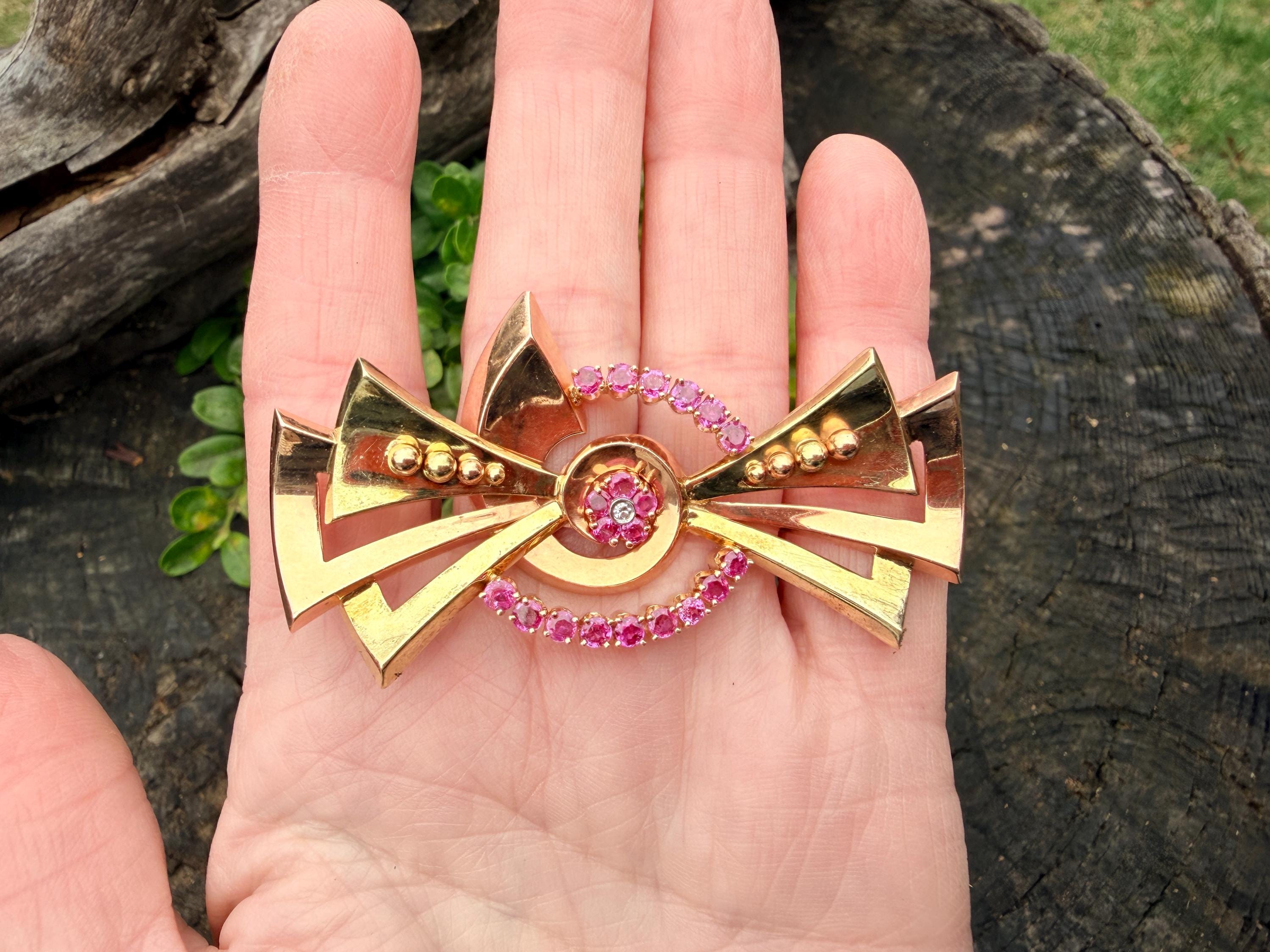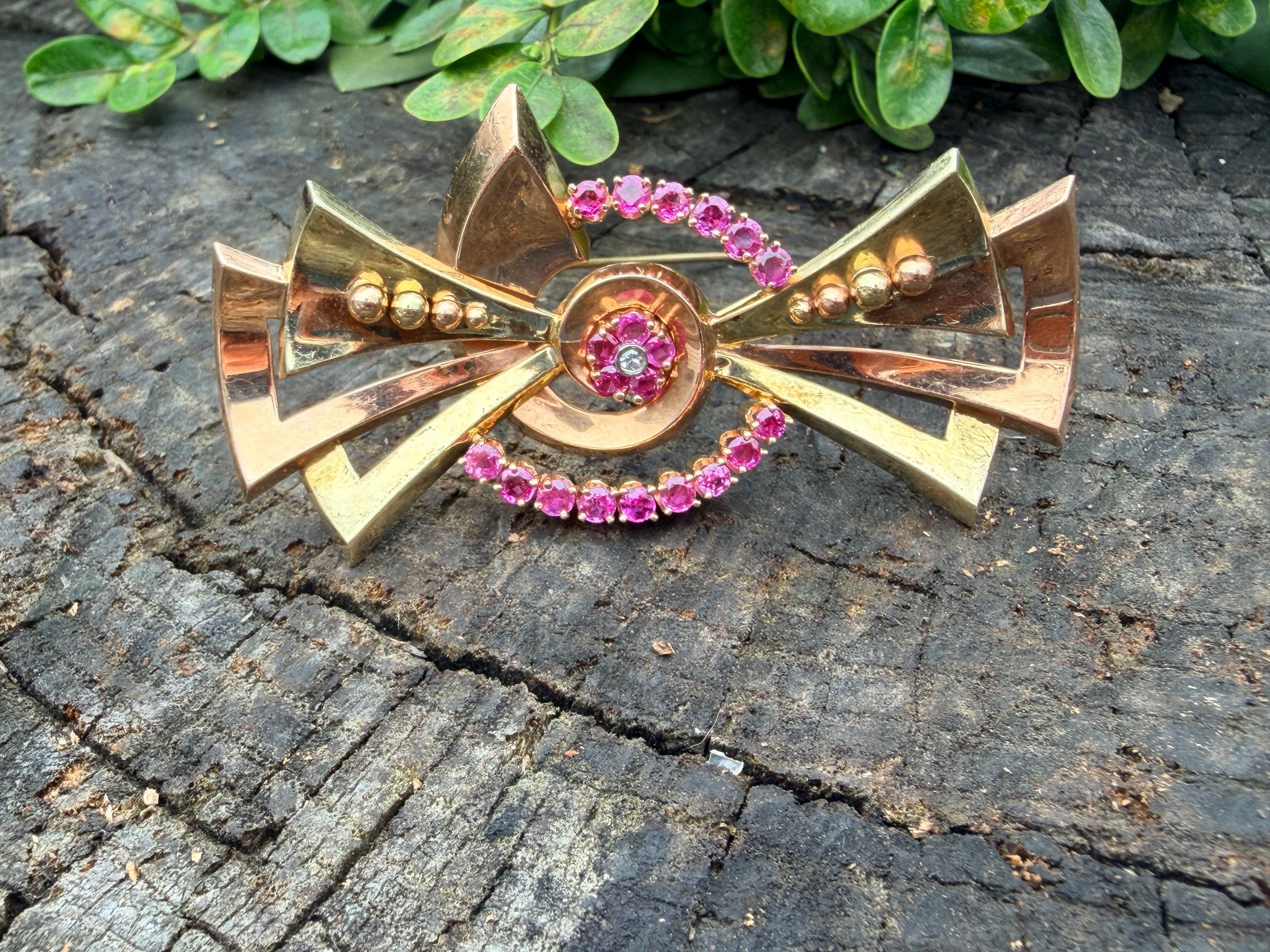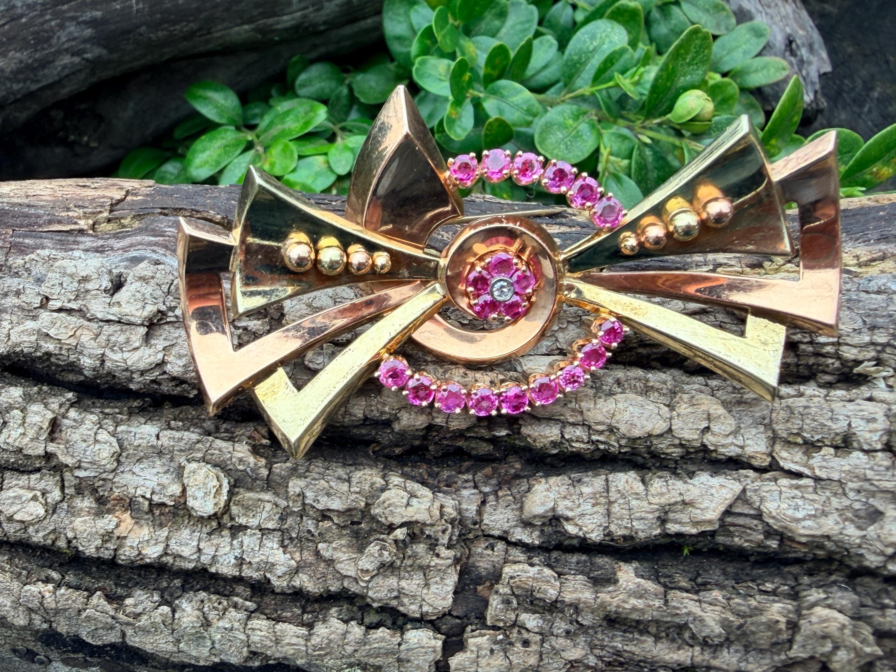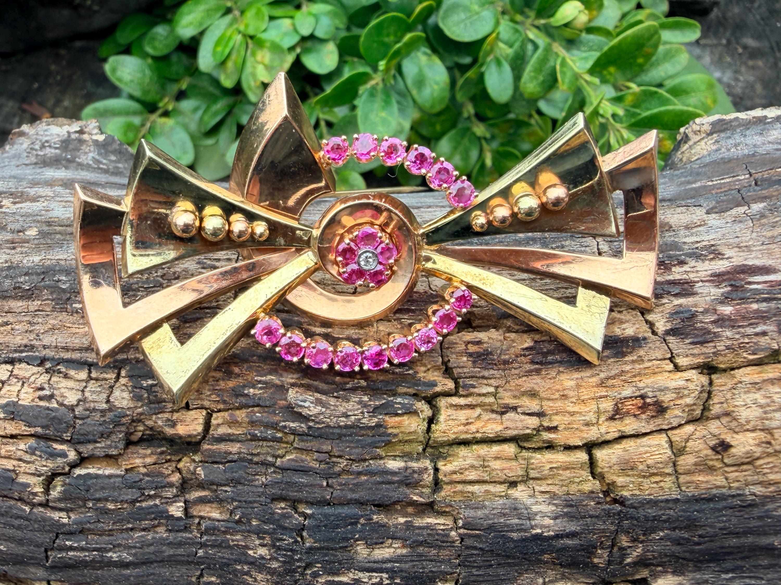 This enchanting retro bow pin dates from the 1940’s. It is set in 14k yellow gold. The bow is creatively designed with flowing, curvy lines and bead work on the bows. The center holds a circle of round red rubies accented with a diamond. The rubies have a total approx. weight of 2.00 ct. The diamond has an approx. weight of .03 ct. a A piece of bewitching glamour. The brooch measures 2 5/8” long x 1 1/8” wide. It weighs 19.71 grams. It is marked 14k.