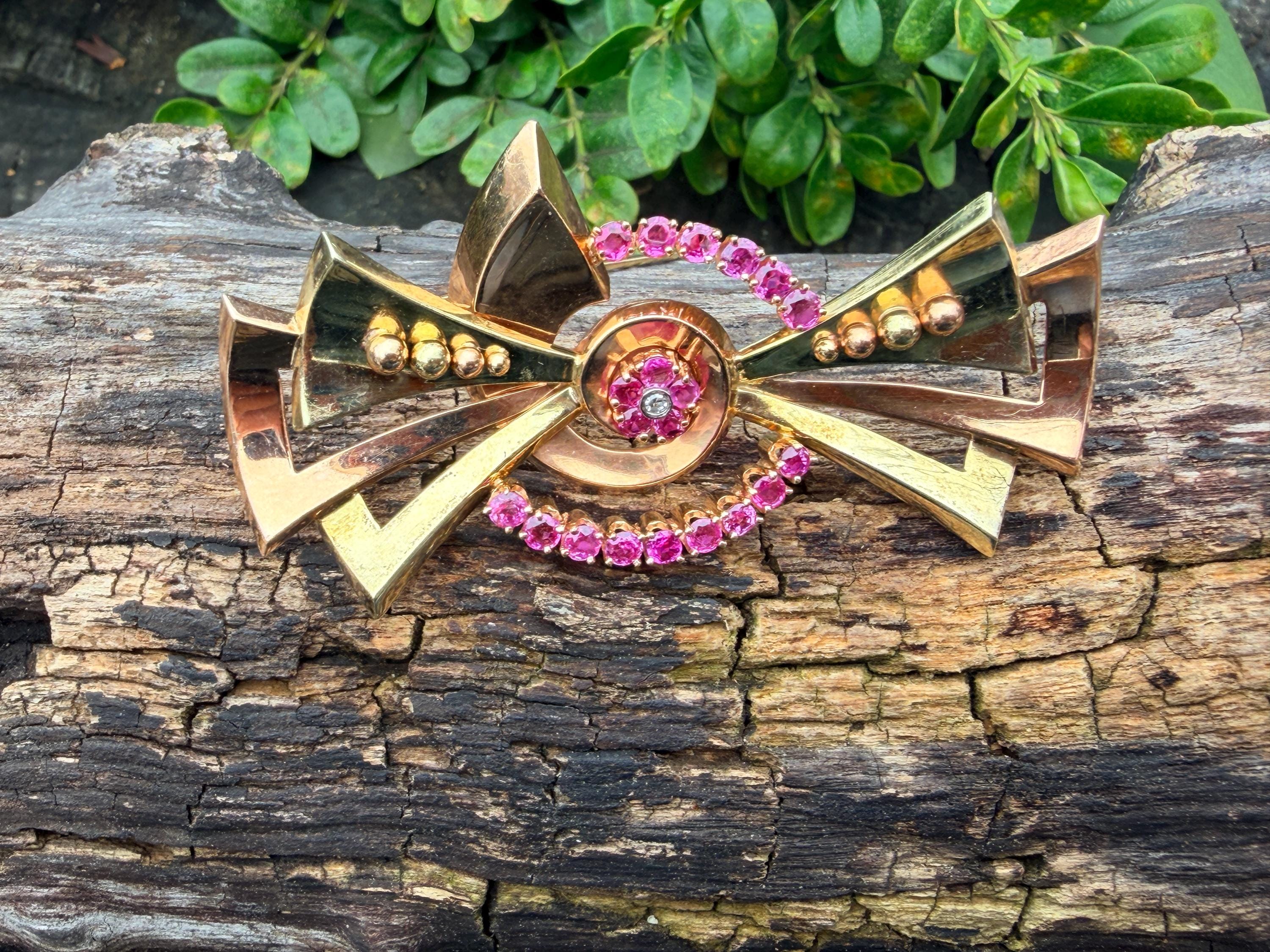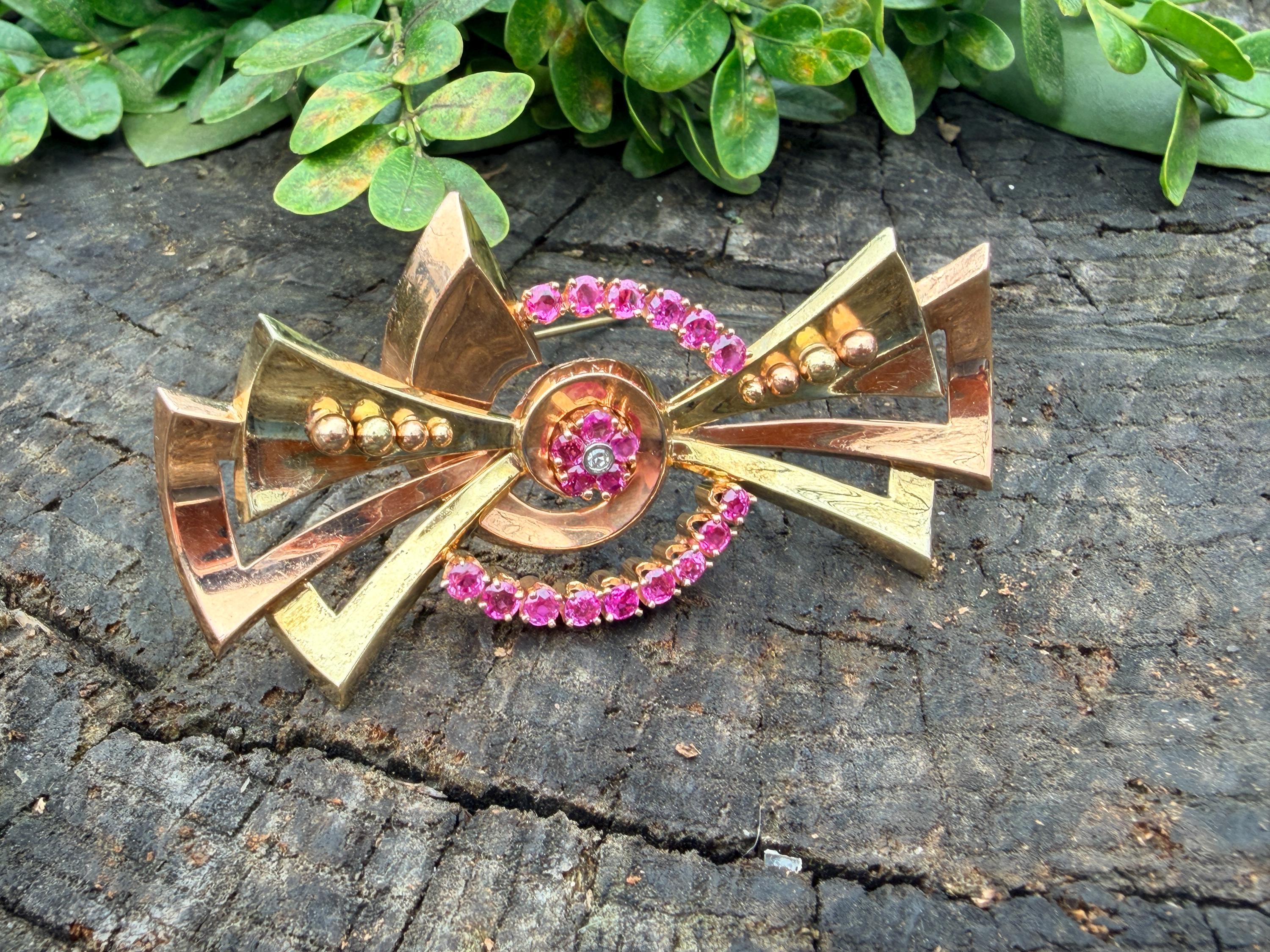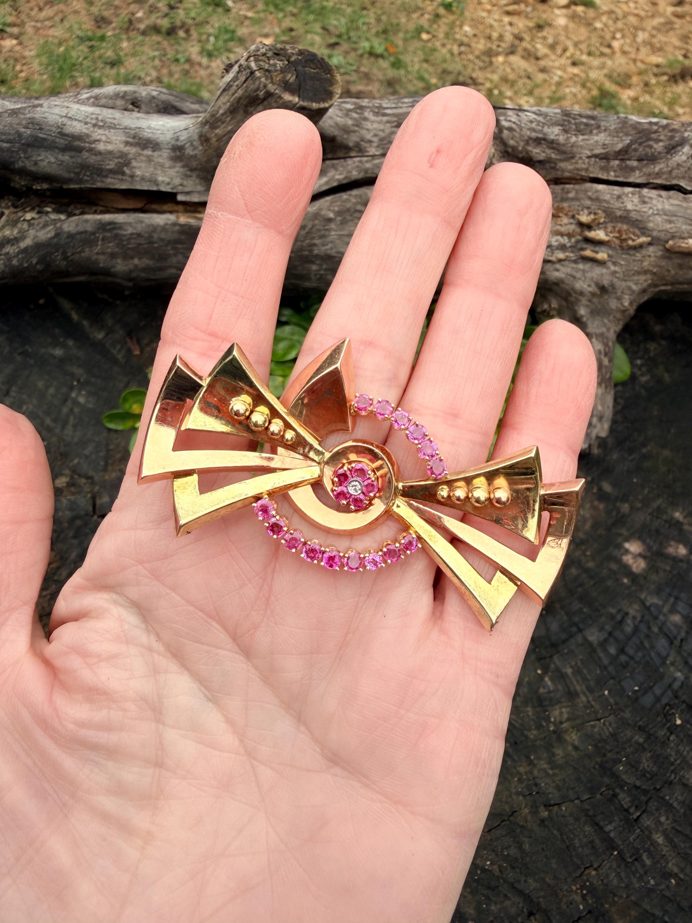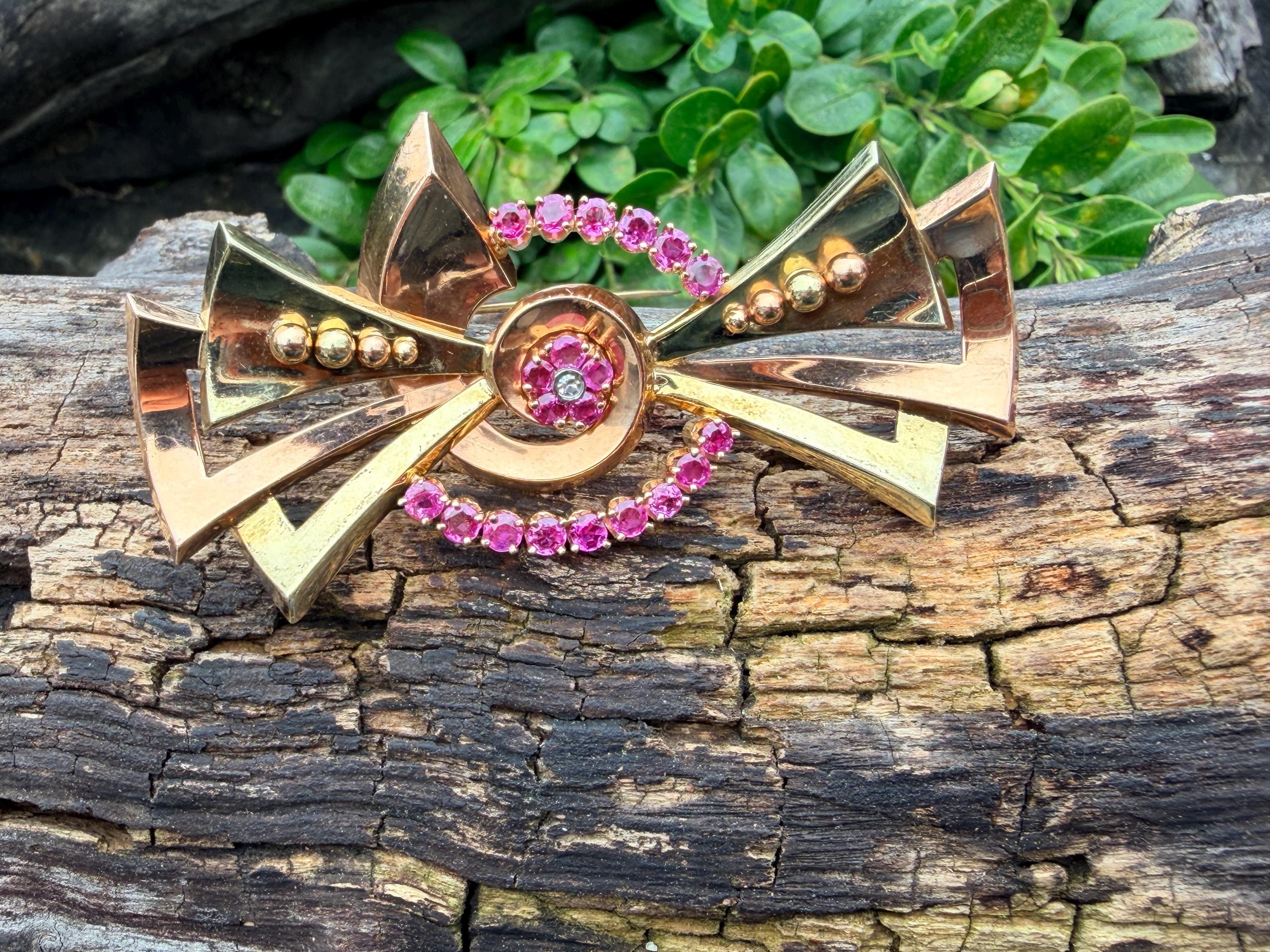 This enchanting retro bow pin dates from the 1940’s. It is set in 14k yellow gold. The bow is creatively designed with flowing, curvy lines and bead work on the bows. The center holds a circle of round red rubies accented with a diamond. The rubies have a total approx. weight of 2.00 ct. The diamond has an approx. weight of .03 ct. a A piece of bewitching glamour. The brooch measures 2 5/8” long x 1 1/8” wide. It weighs 19.71 grams. It is marked 14k.