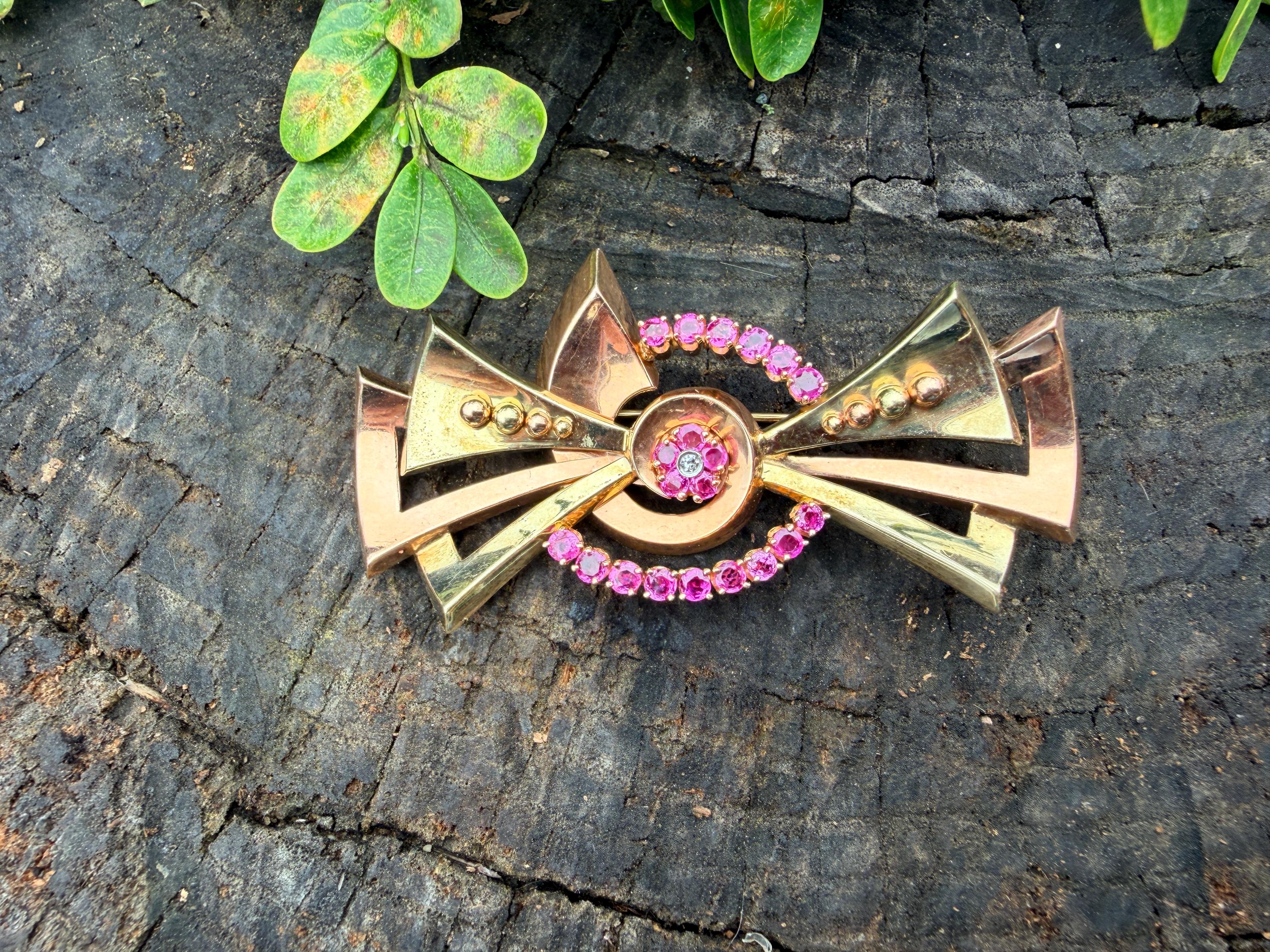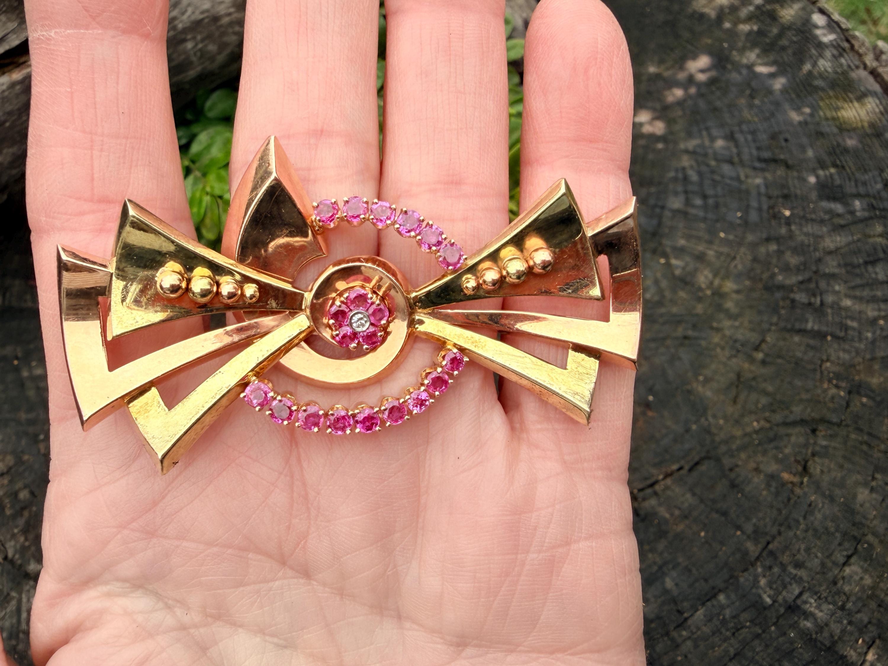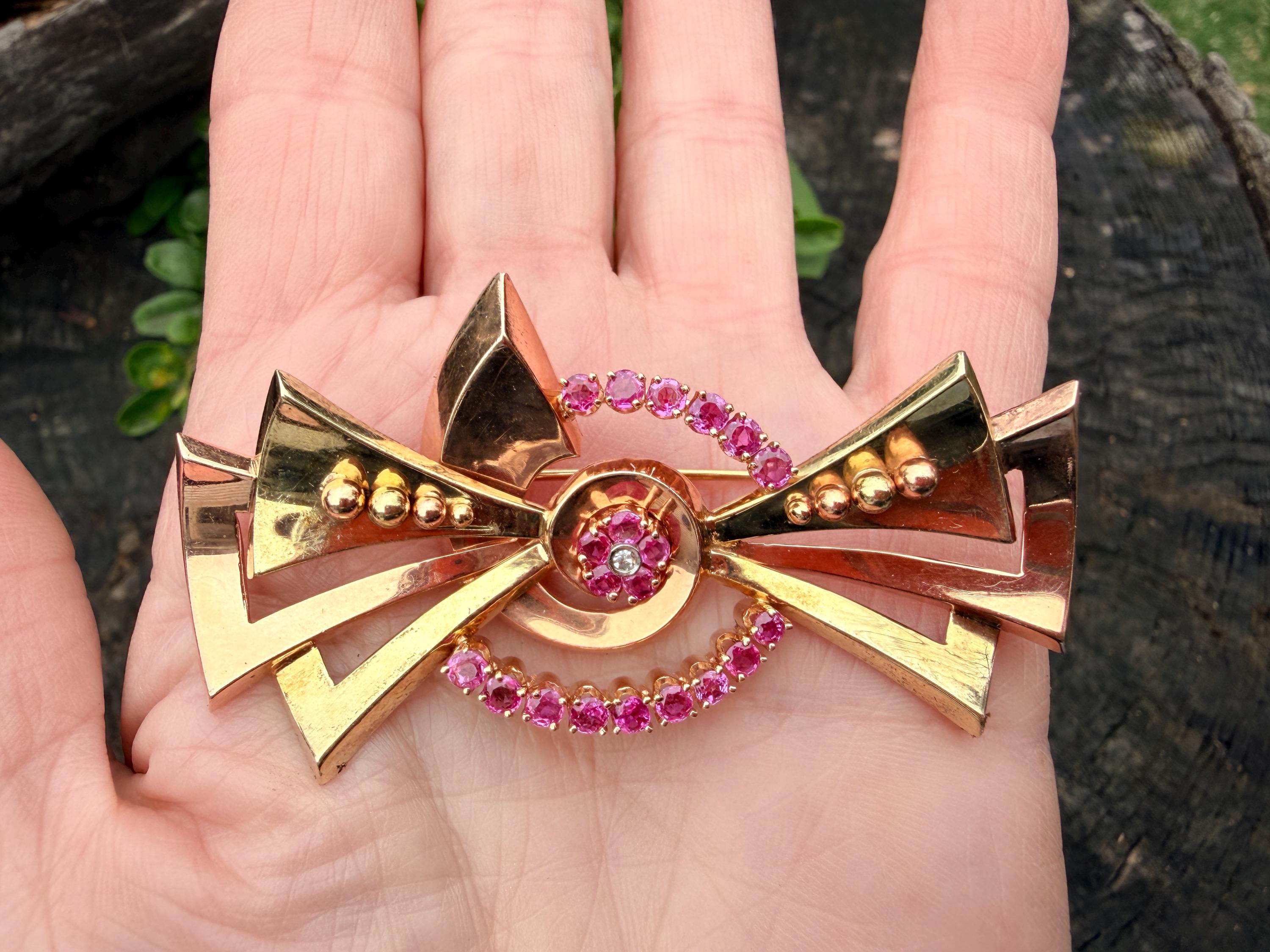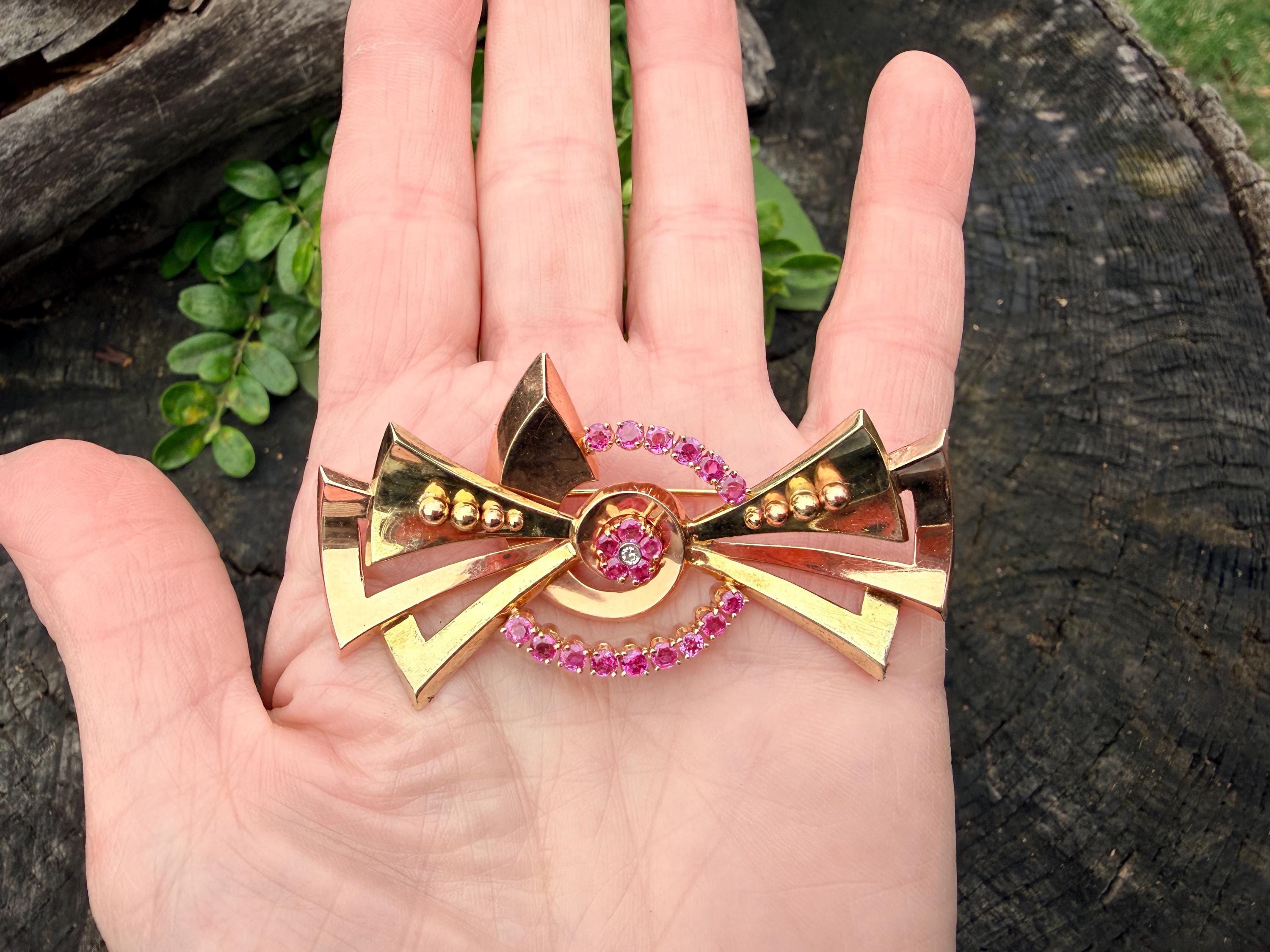 This enchanting retro bow pin dates from the 1940’s. It is set in 14k yellow gold. The bow is creatively designed with flowing, curvy lines and bead work on the bows. The center holds a circle of round red rubies accented with a diamond. The rubies have a total approx. weight of 2.00 ct. The diamond has an approx. weight of .03 ct. a A piece of bewitching glamour. The brooch measures 2 5/8” long x 1 1/8” wide. It weighs 19.71 grams. It is marked 14k.