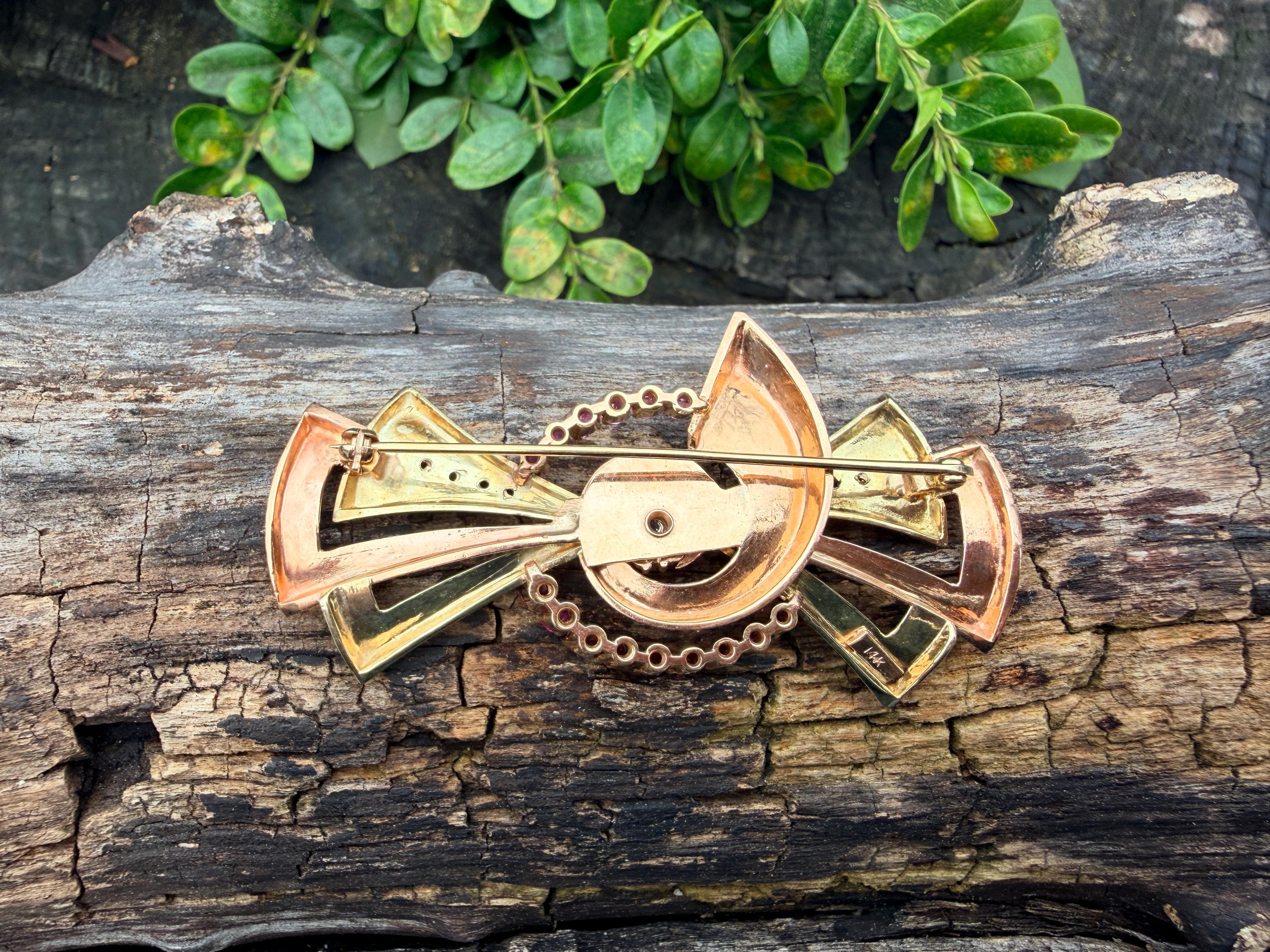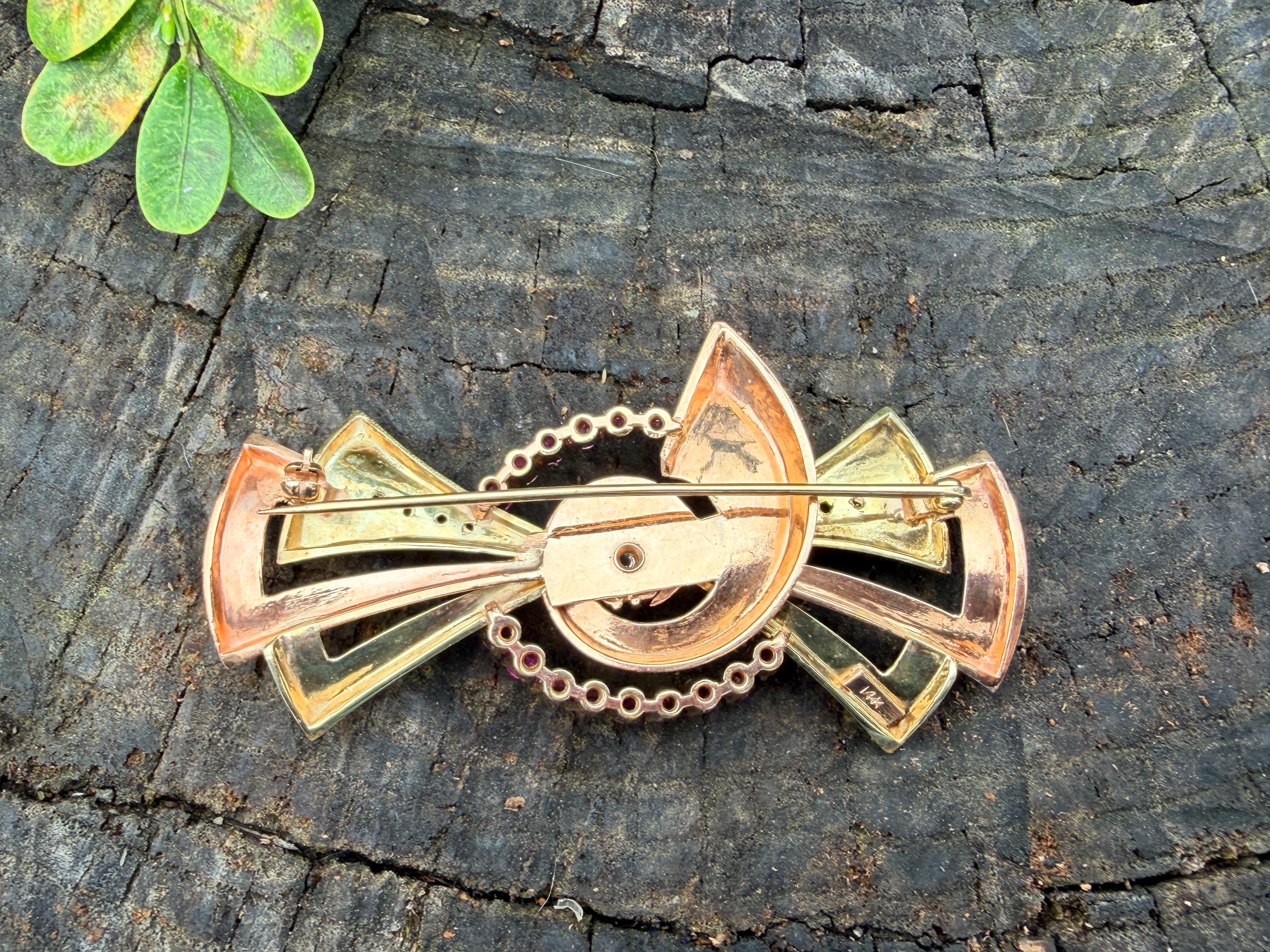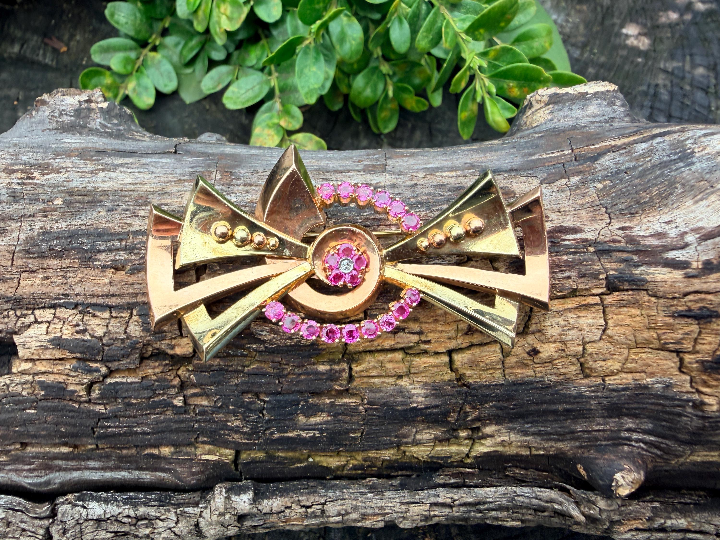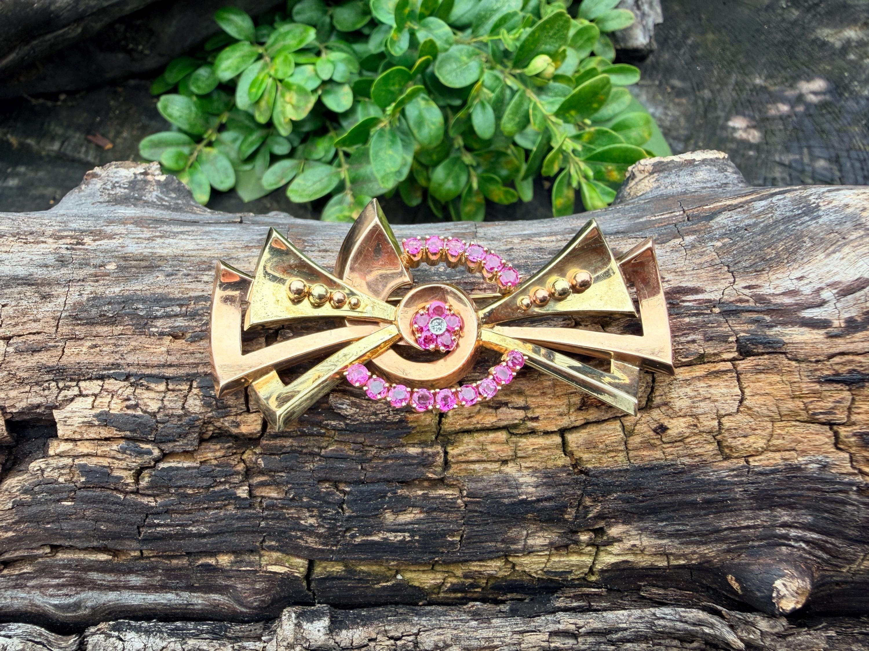This enchanting retro bow pin dates from the 1940’s. It is set in 14k yellow gold. The bow is creatively designed with flowing, curvy lines and bead work on the bows. The center holds a circle of round red rubies accented with a diamond. The rubies have a total approx. weight of 2.00 ct. The diamond has an approx. weight of .03 ct. a A piece of bewitching glamour. The brooch measures 2 5/8” long x 1 1/8” wide. It weighs 19.71 grams. It is marked 14k.