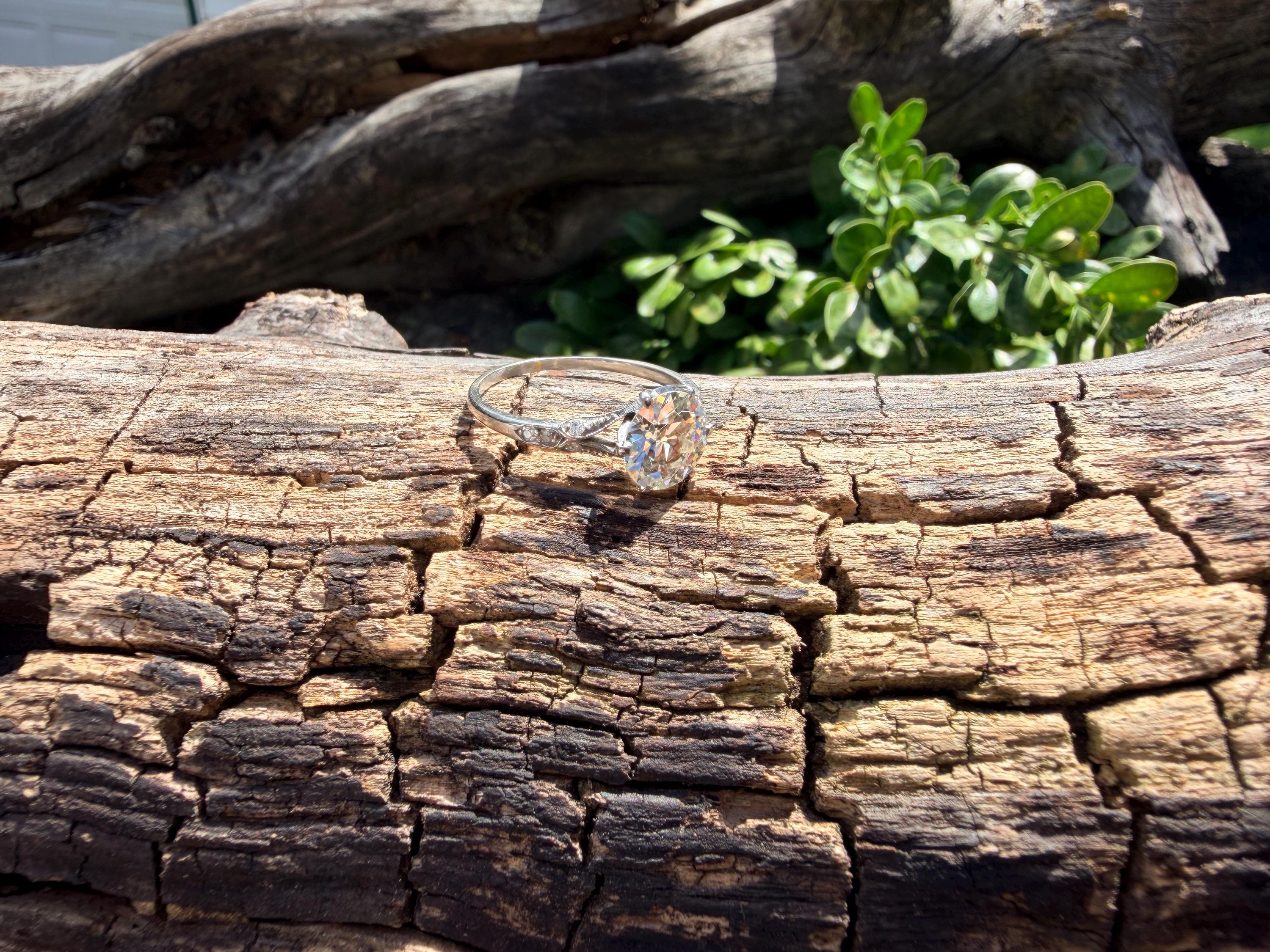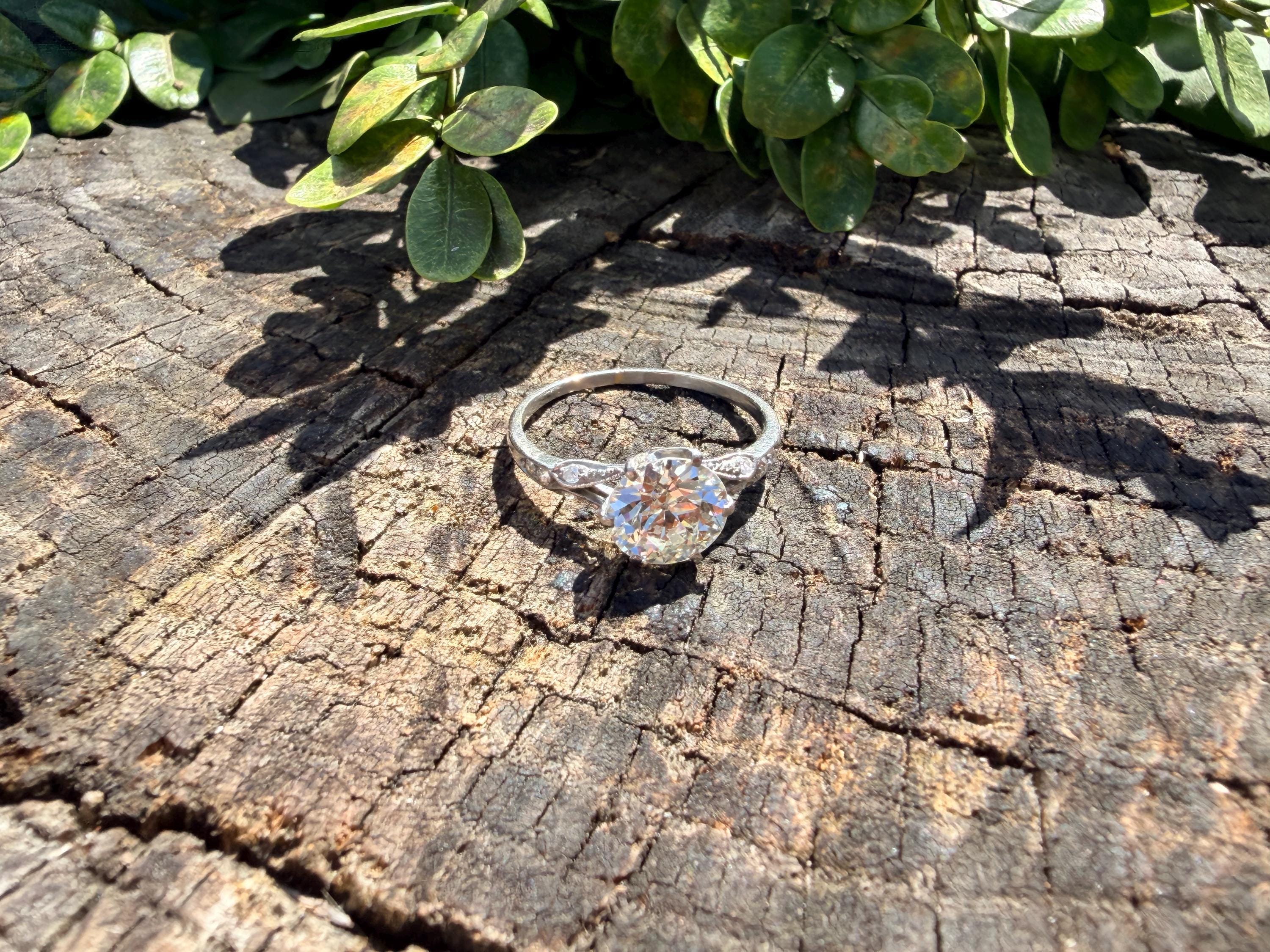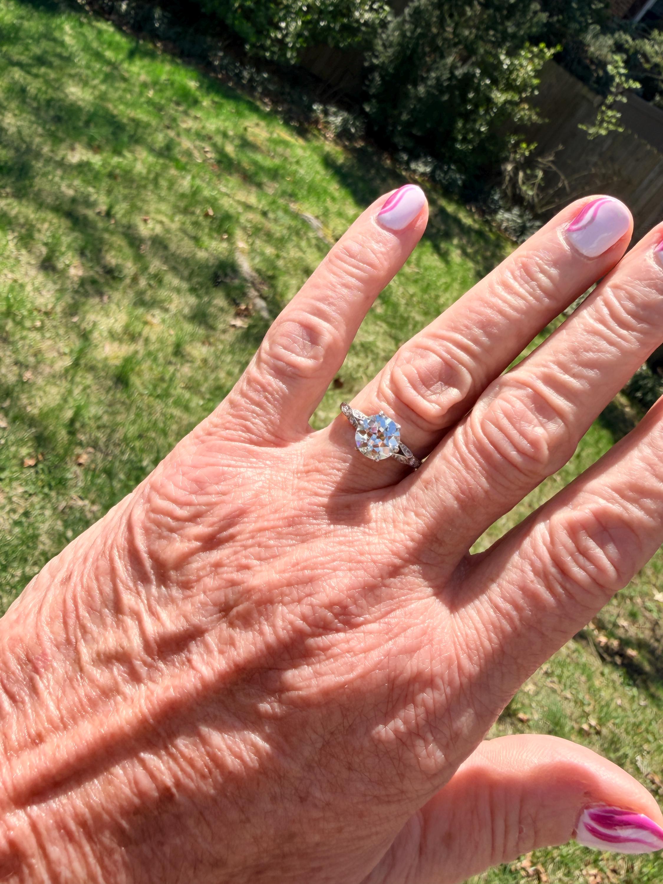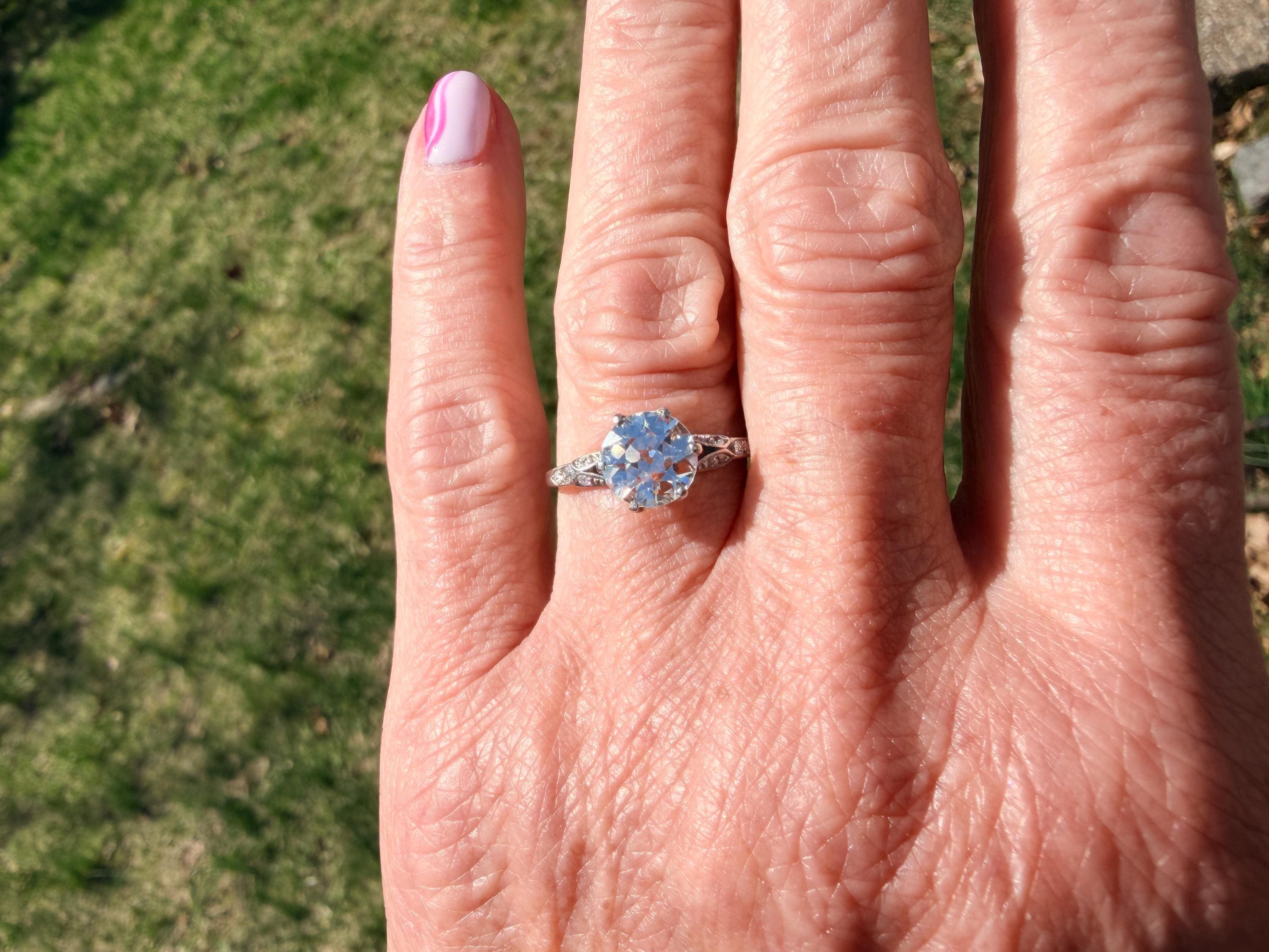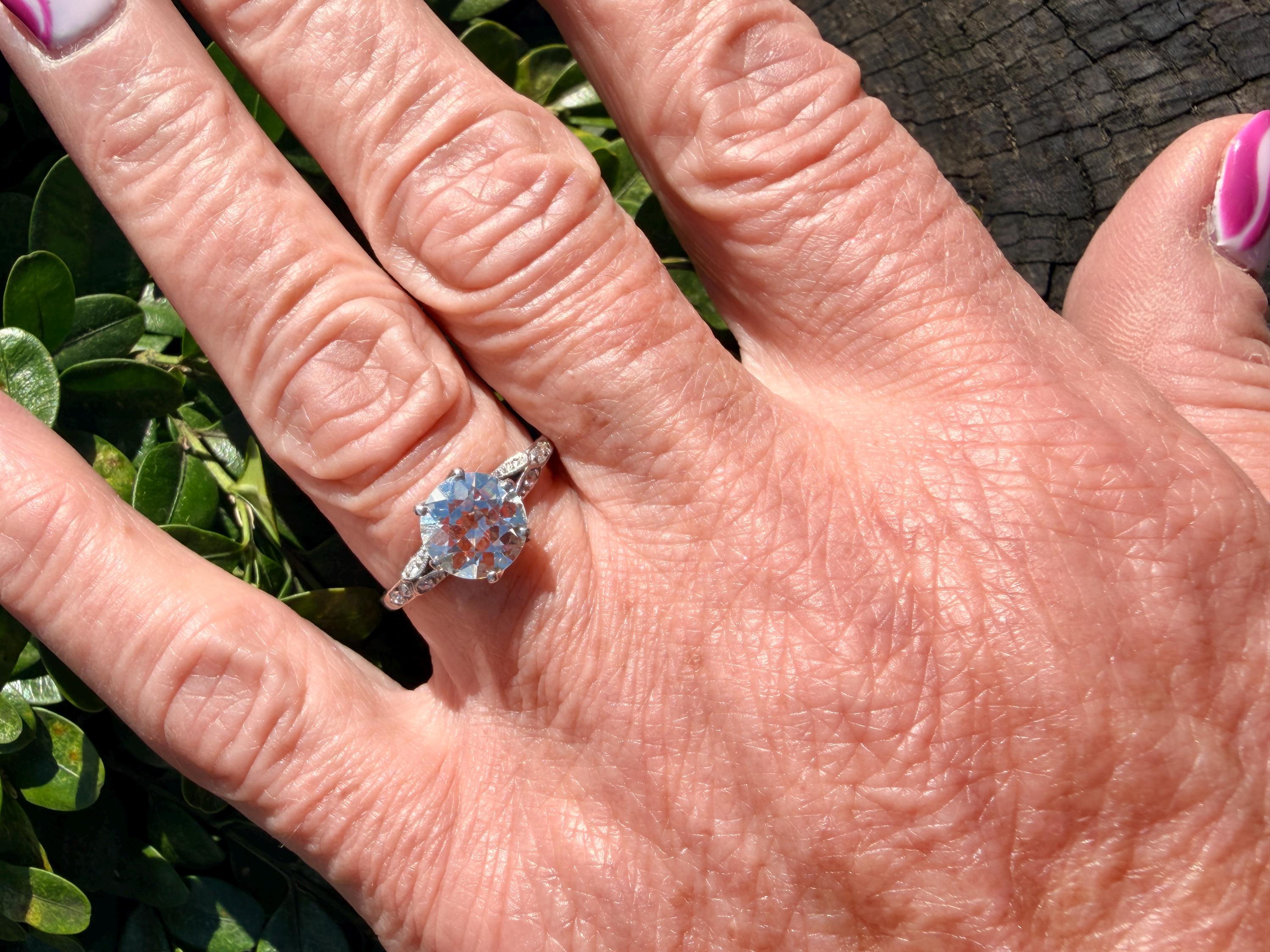 This striking platinum art deco engagement ring dates from the 1920s. It holds a center old European cut diamond with an approx. weight of 1.85 ct. The diamond is an G color and VS2 clarity. The shoulders hold 4 accent diamonds on either side giving the entire ring a romanticized aura. Presence, panache and pizzazz that packs a punch on your finger. It is currently a size 7 3/4. It sits 1/8" off the finger.