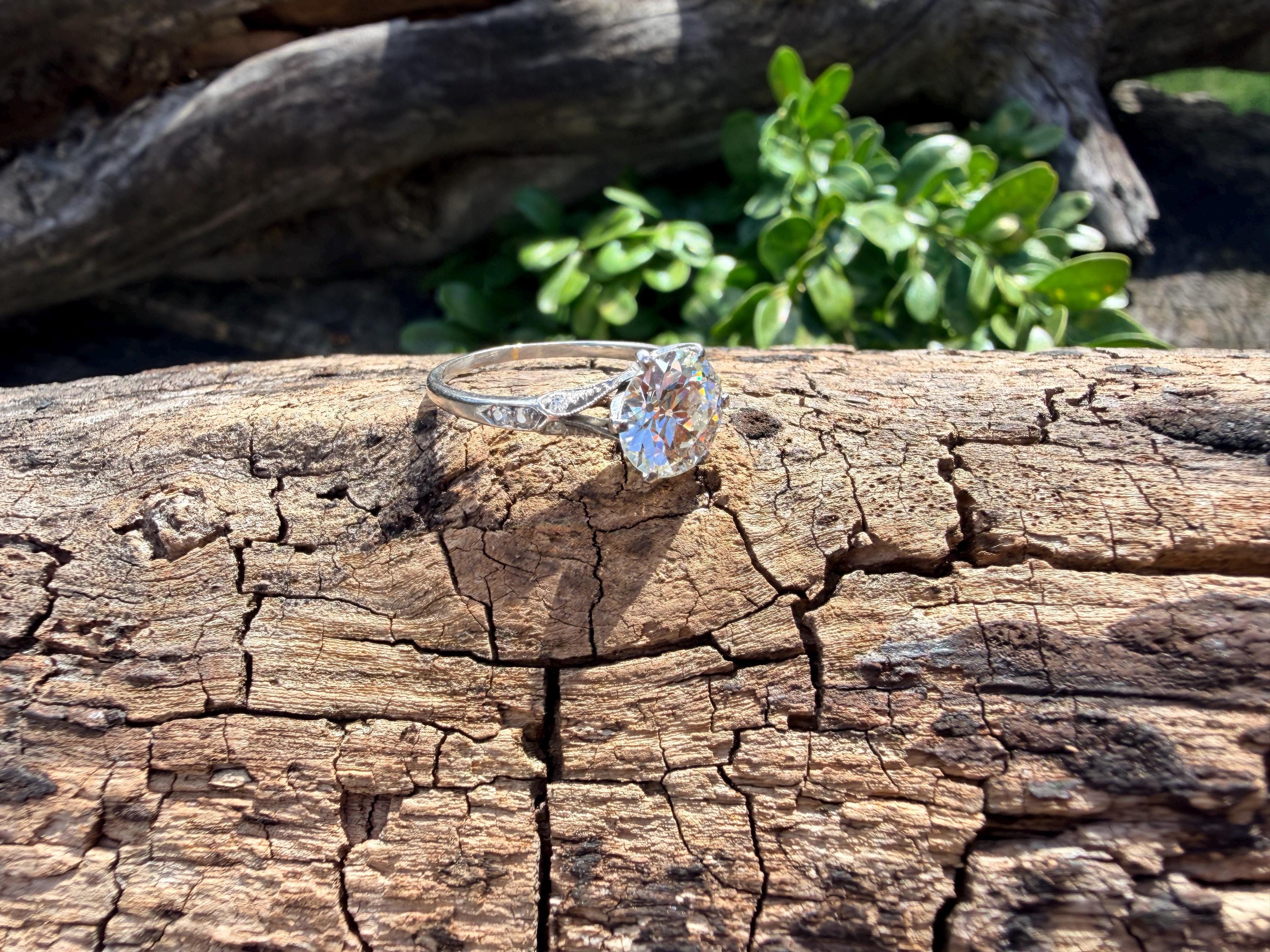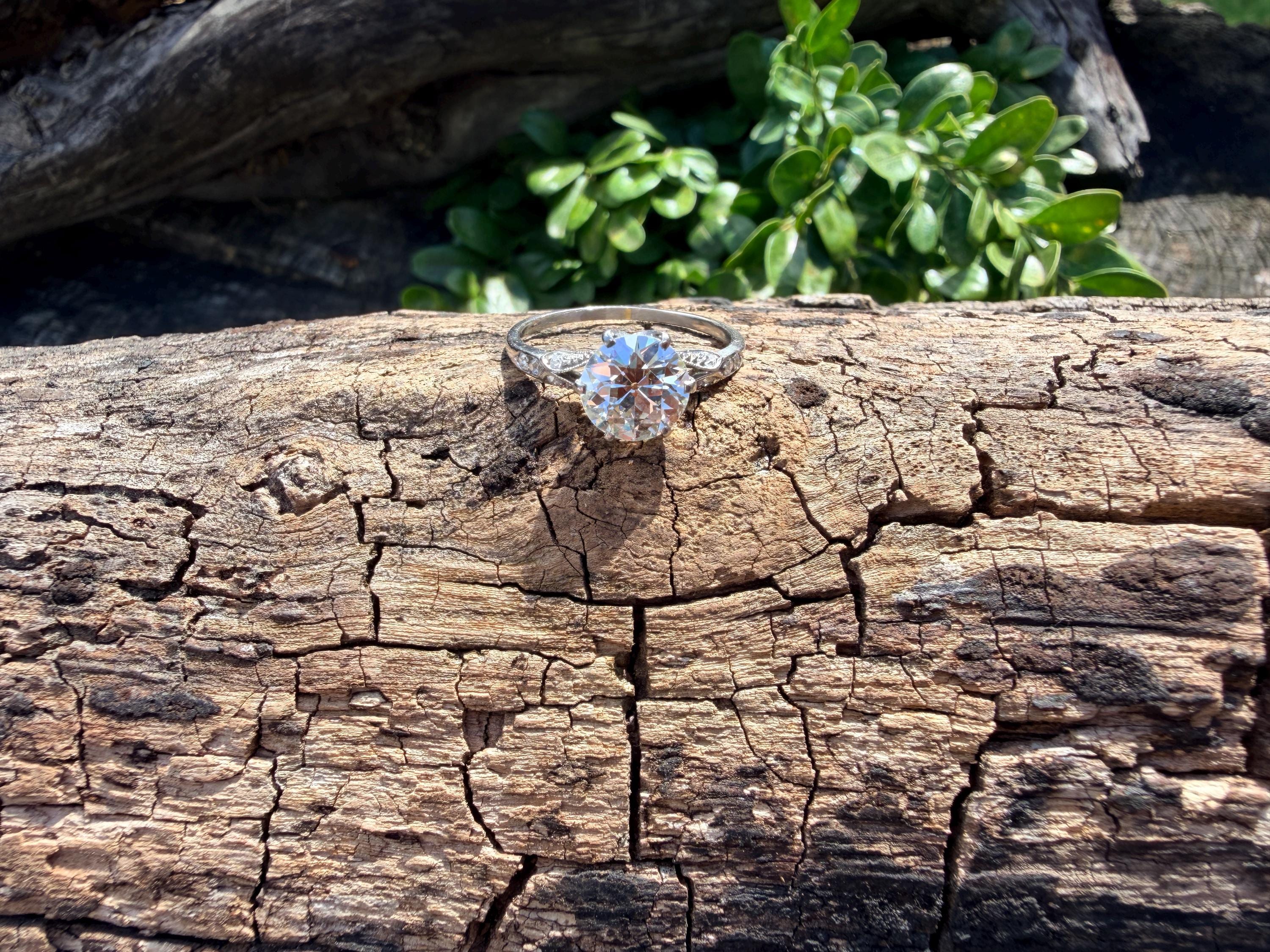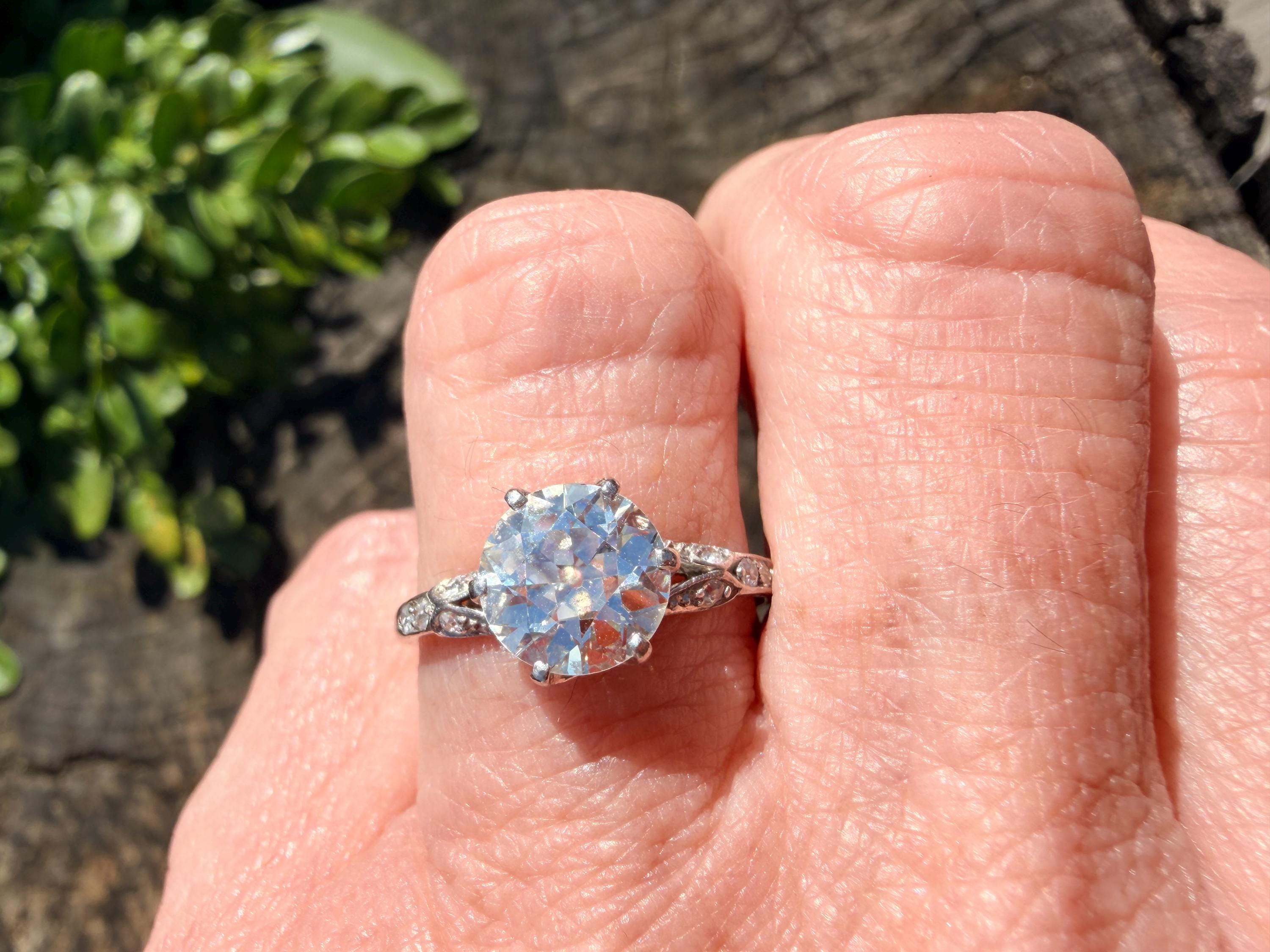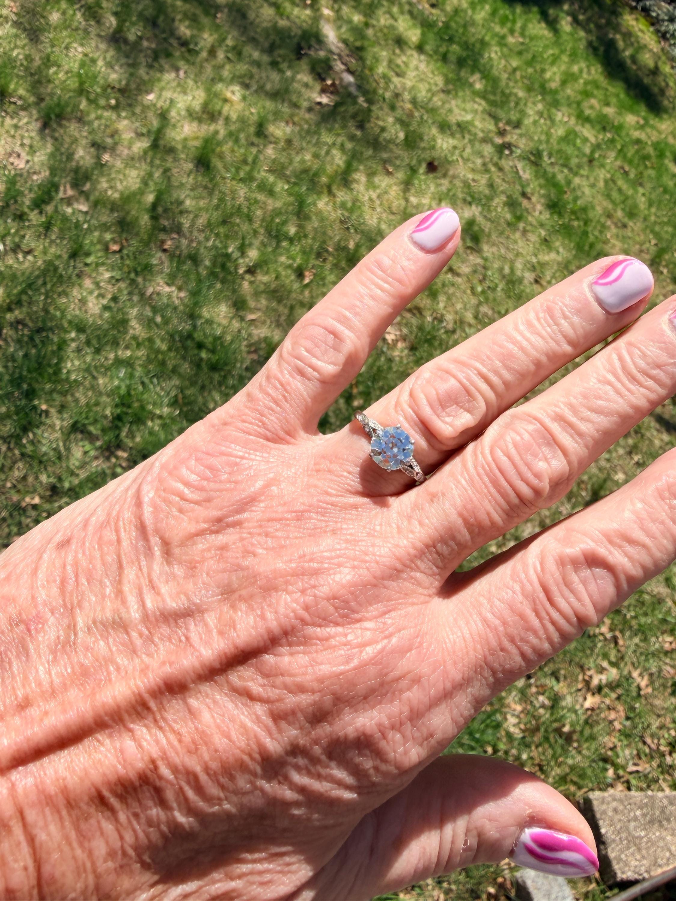 This striking platinum art deco engagement ring dates from the 1920s. It holds a center old European cut diamond with an approx. weight of 1.85 ct. The diamond is an G color and VS2 clarity. The shoulders hold 4 accent diamonds on either side giving the entire ring a romanticized aura. Presence, panache and pizzazz that packs a punch on your finger. It is currently a size 7 3/4. It sits 1/8" off the finger.