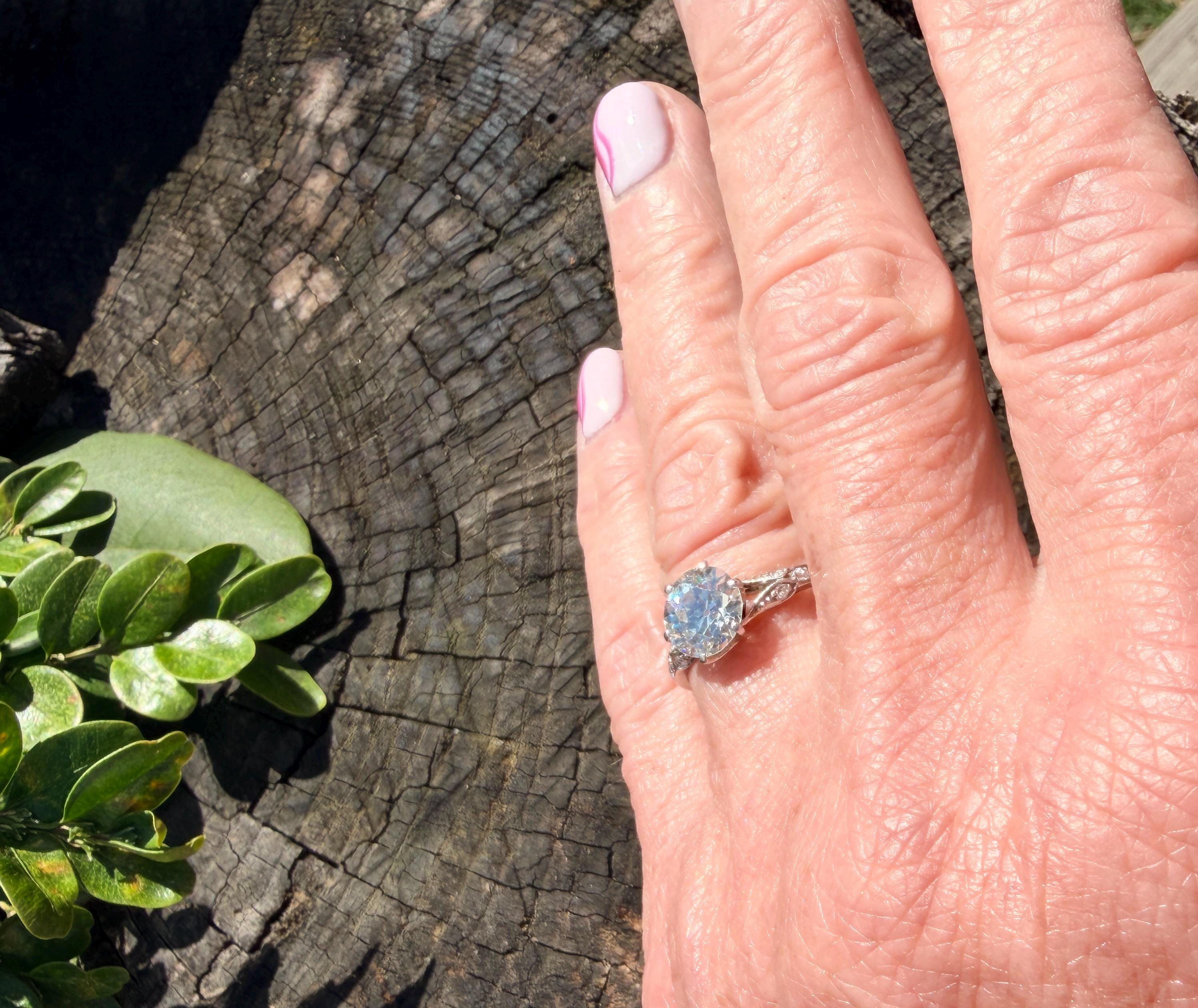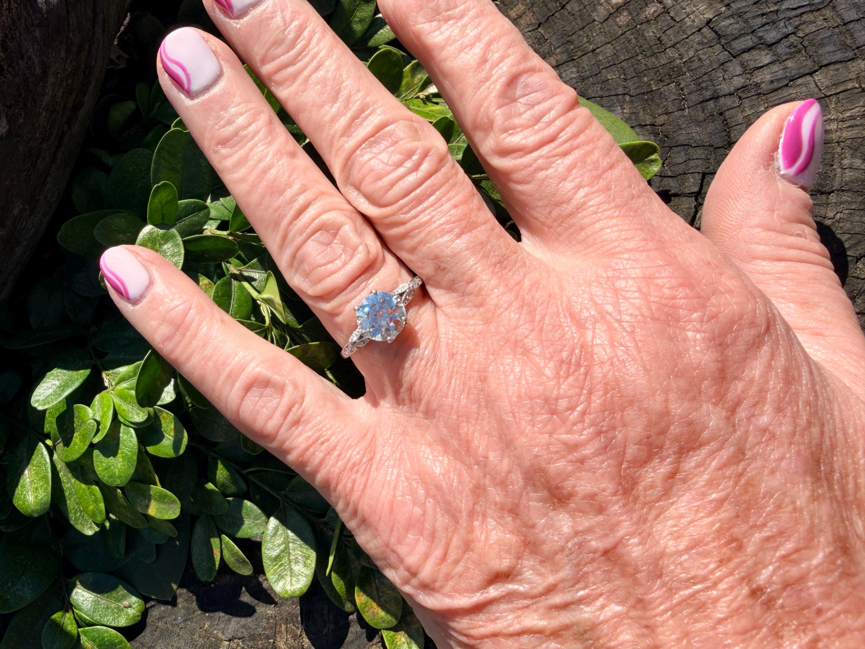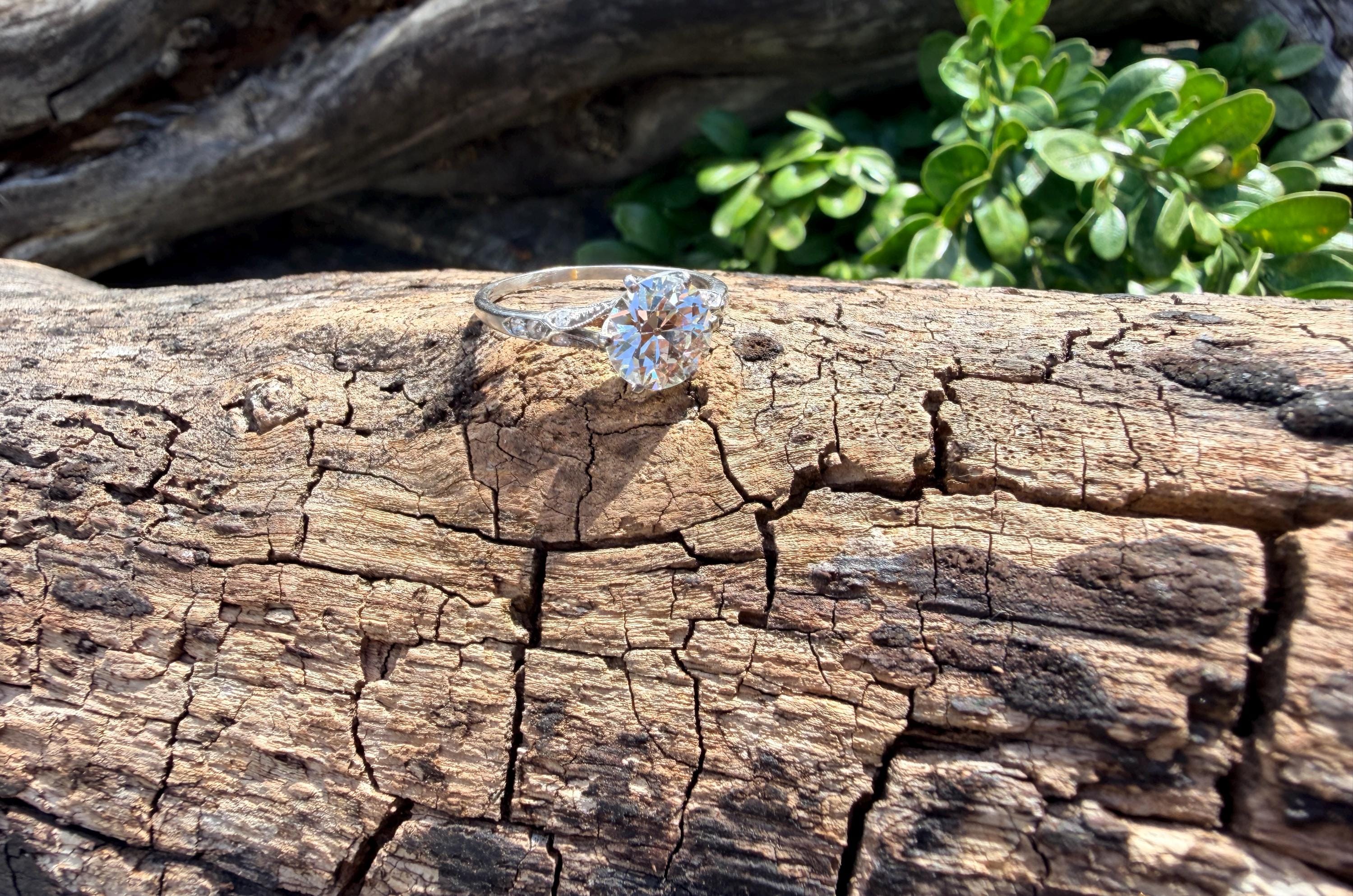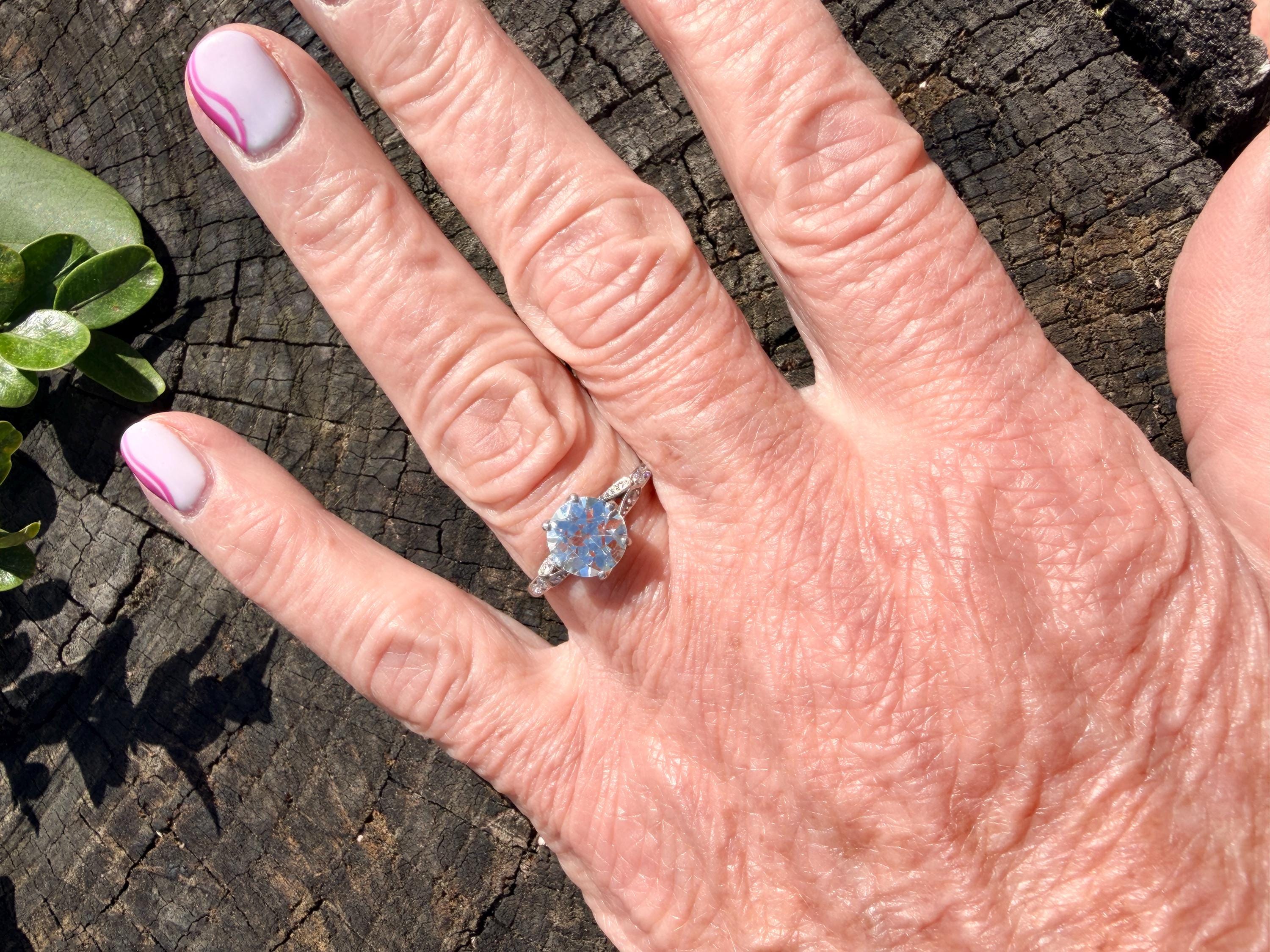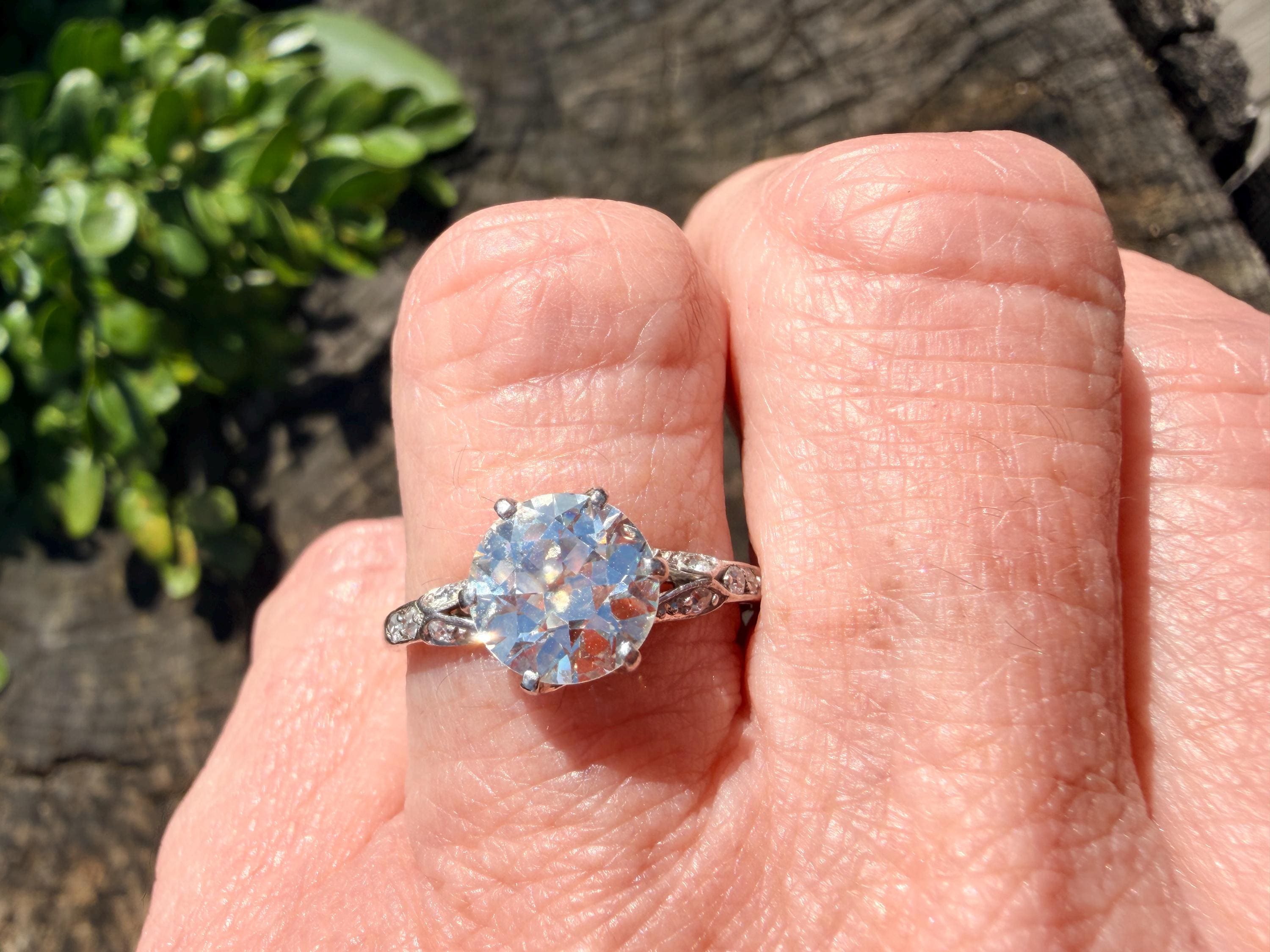 This striking platinum art deco engagement ring dates from the 1920s. It holds a center old European cut diamond with an approx. weight of 1.85 ct. The diamond is an G color and VS2 clarity. The shoulders hold 4 accent diamonds on either side giving the entire ring a romanticized aura. Presence, panache and pizzazz that packs a punch on your finger. It is currently a size 7 3/4. It sits 1/8" off the finger.