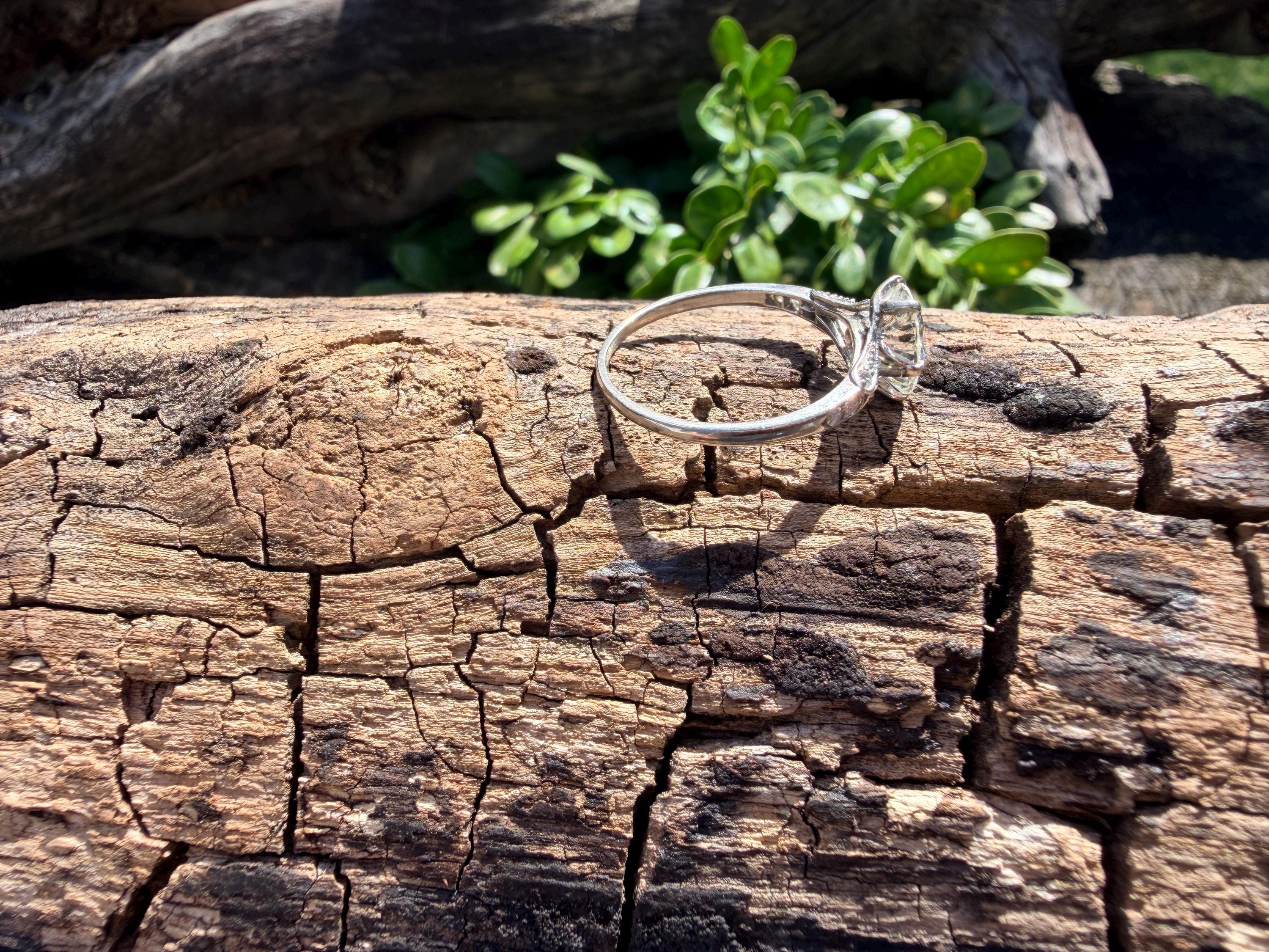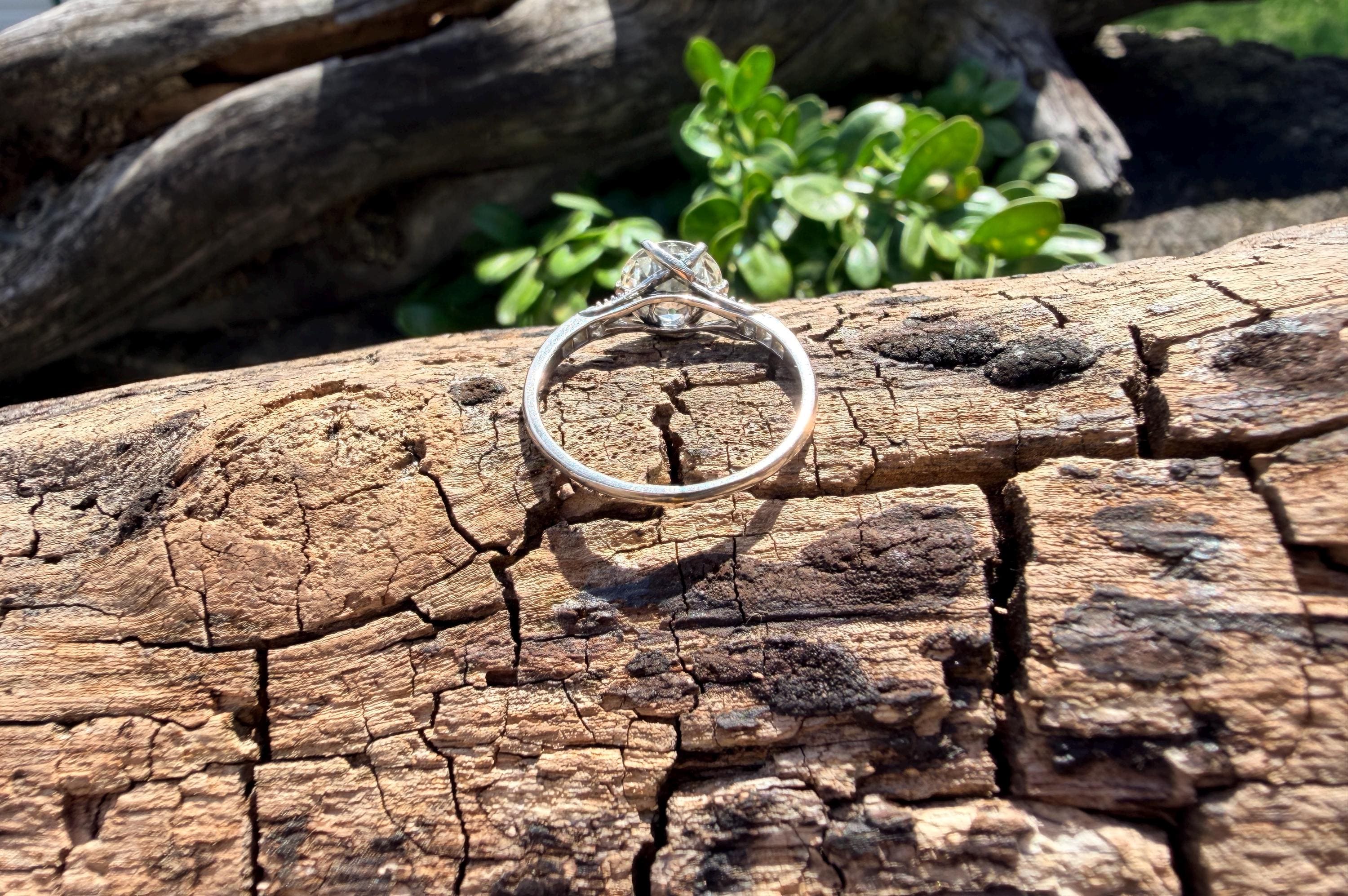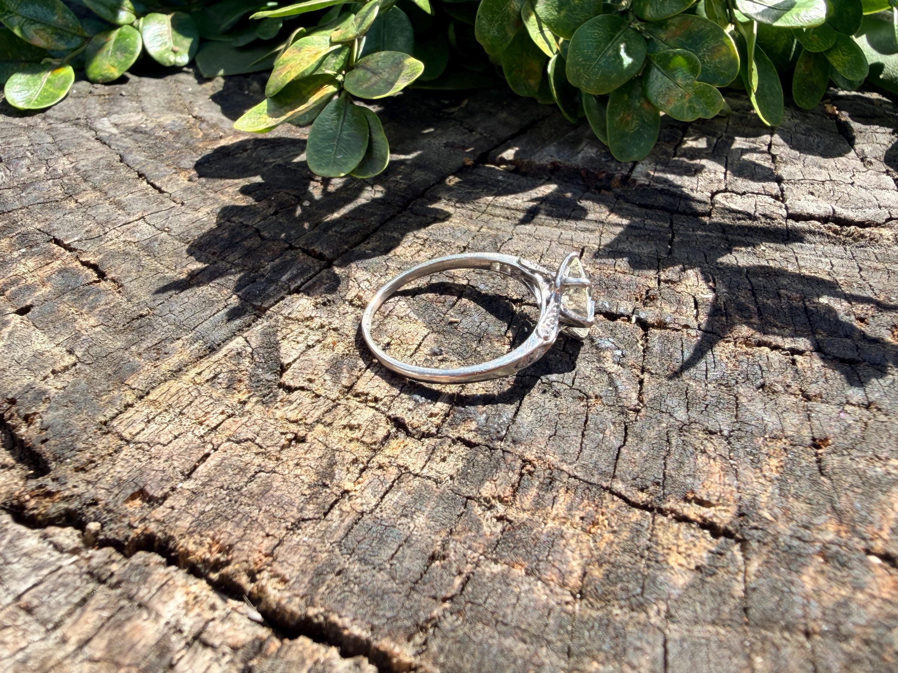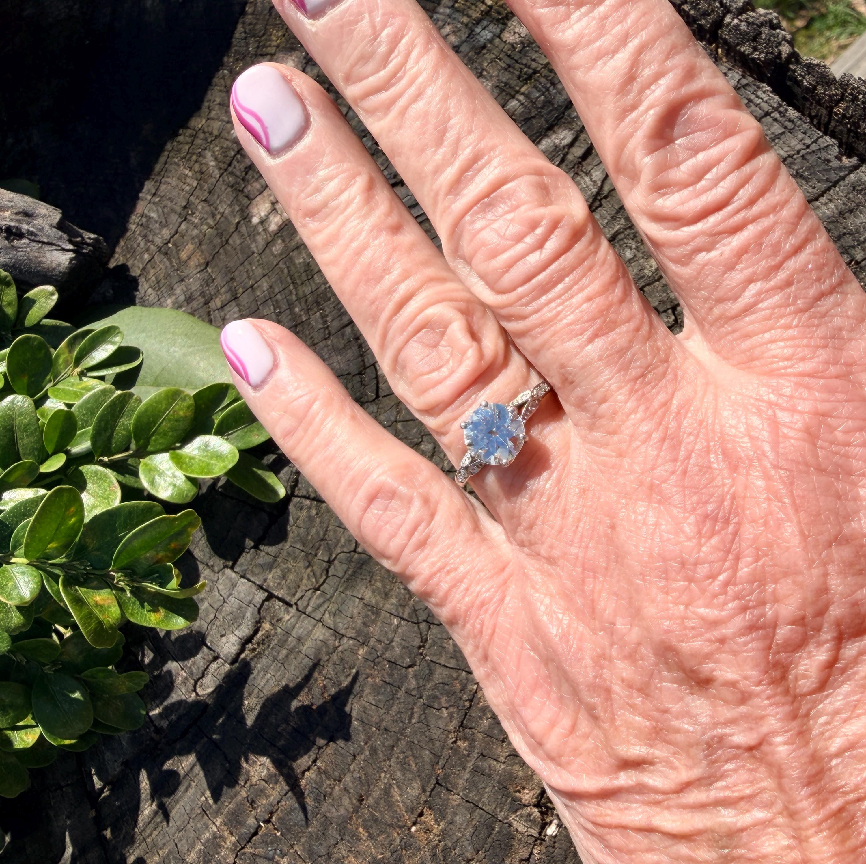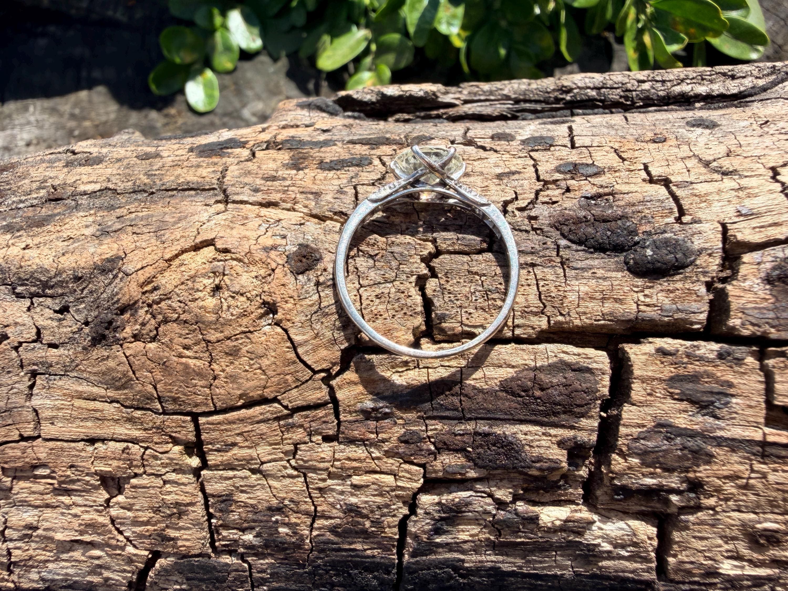 This striking platinum art deco engagement ring dates from the 1920s. It holds a center old European cut diamond with an approx. weight of 1.85 ct. The diamond is an G color and VS2 clarity. The shoulders hold 4 accent diamonds on either side giving the entire ring a romanticized aura. Presence, panache and pizzazz that packs a punch on your finger. It is currently a size 7 3/4. It sits 1/8" off the finger.
