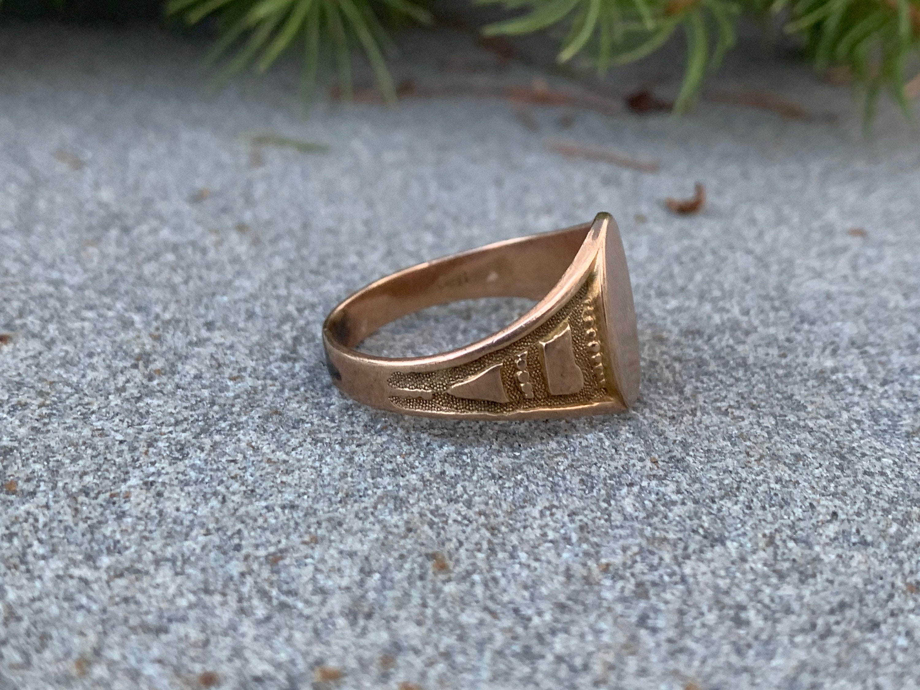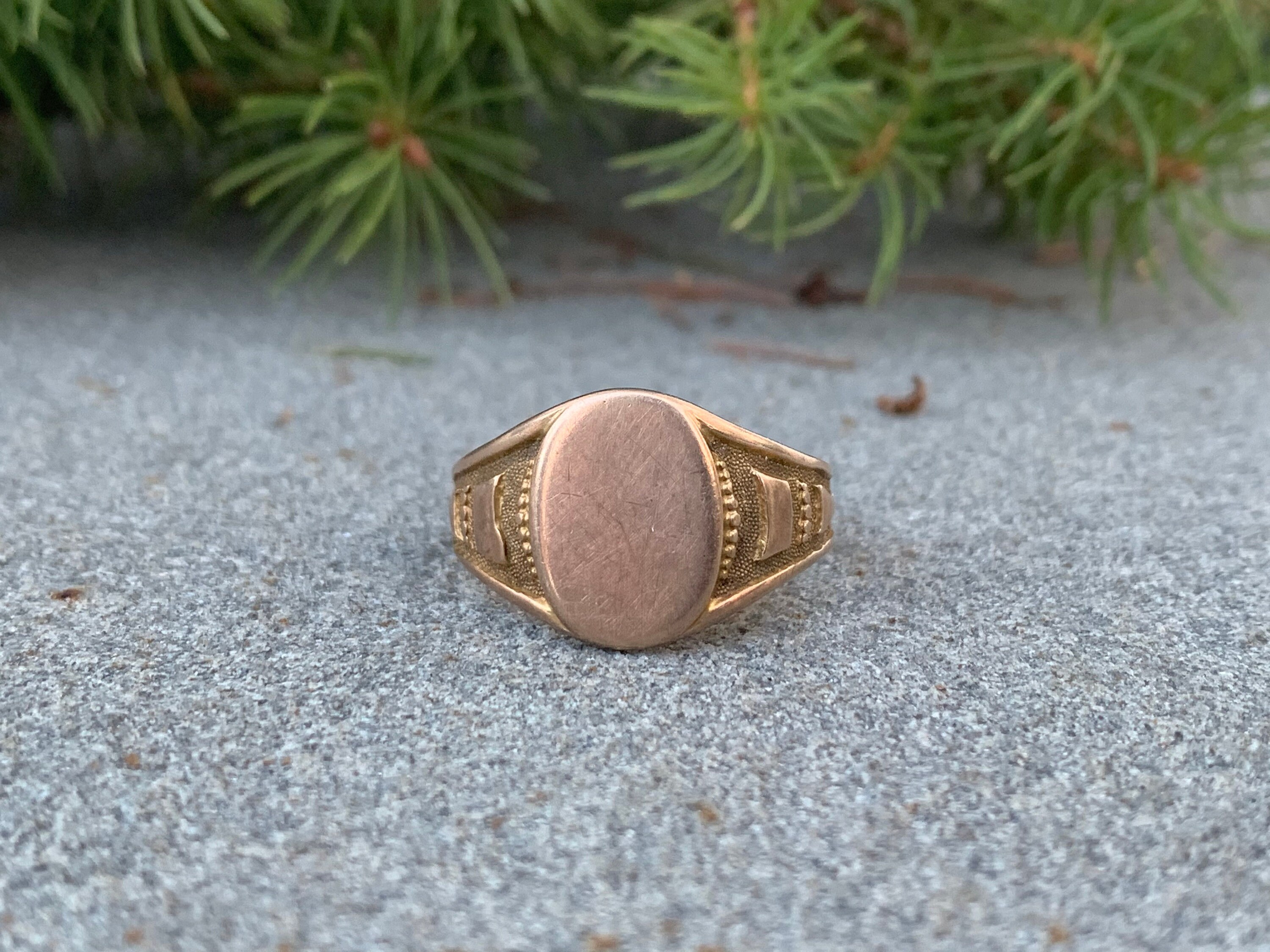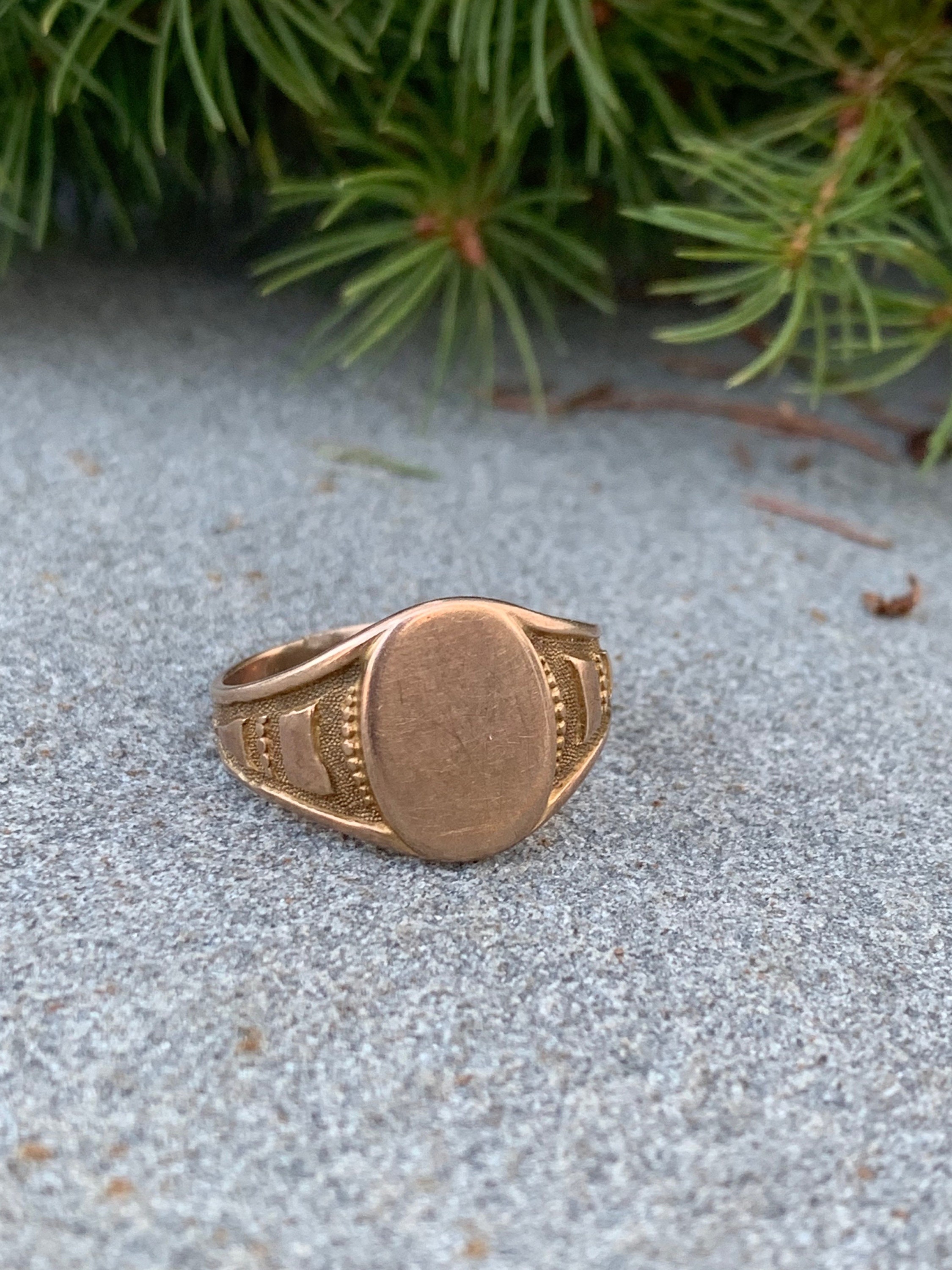 This distinctive Victorian signet ring is set in 10k yellow gold. It dates from the 1800s. The center oval shaped signet creates a quiet powerfulness. The sides are beautifully and boldly scrolled in a lyrical design. Will fit a size 10 finger. It weighs 5.48 grams. The top measures 3/8" x 3/4".